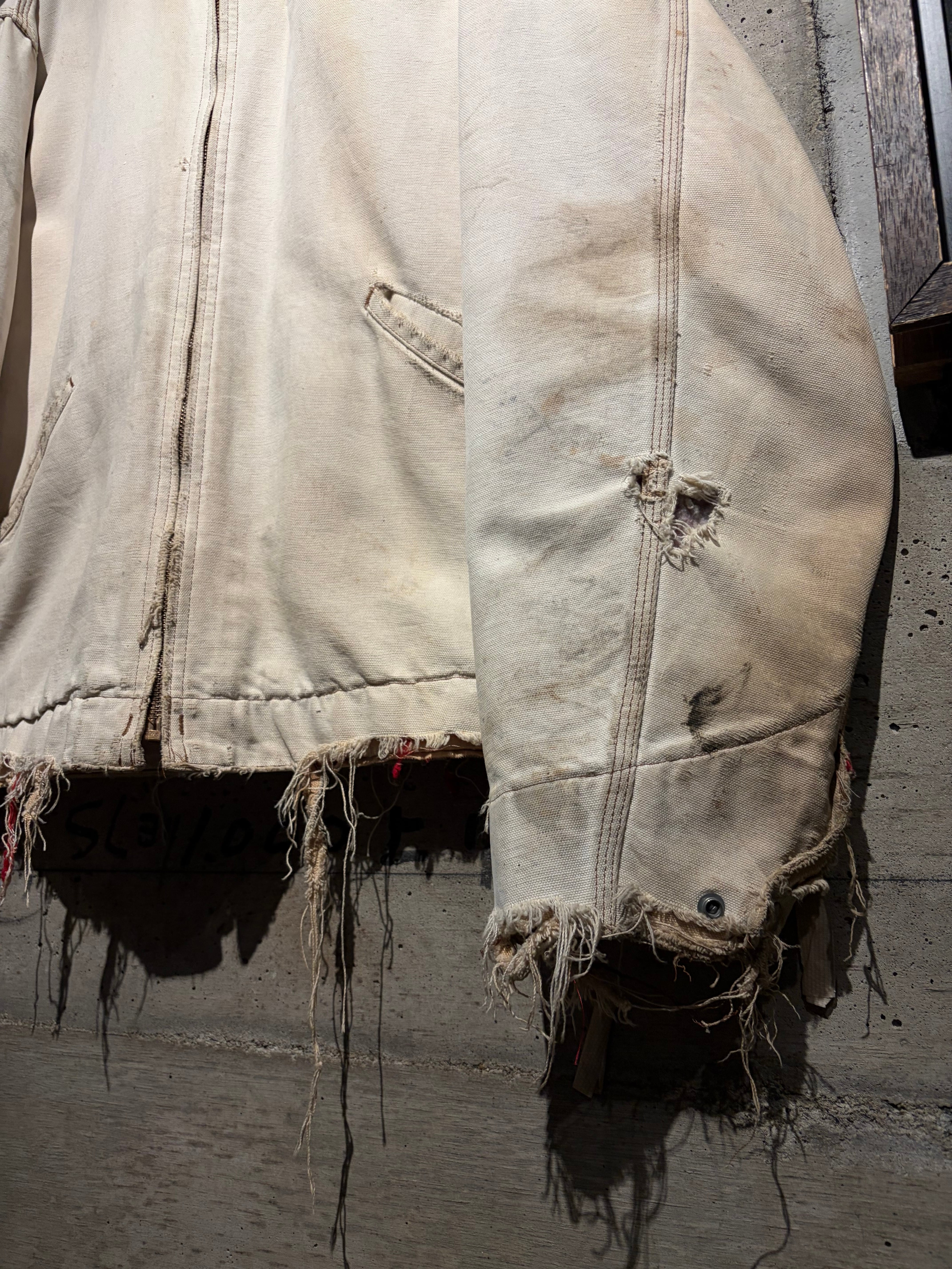 フロントのジップ仕様、ハンドウォーマーポケット、ショートレングスのデトロイトらしい洗練されたルックスに、袖や裾のほつれといったボロの表情が加わる事で、1点モノとしての存在感を見せています。