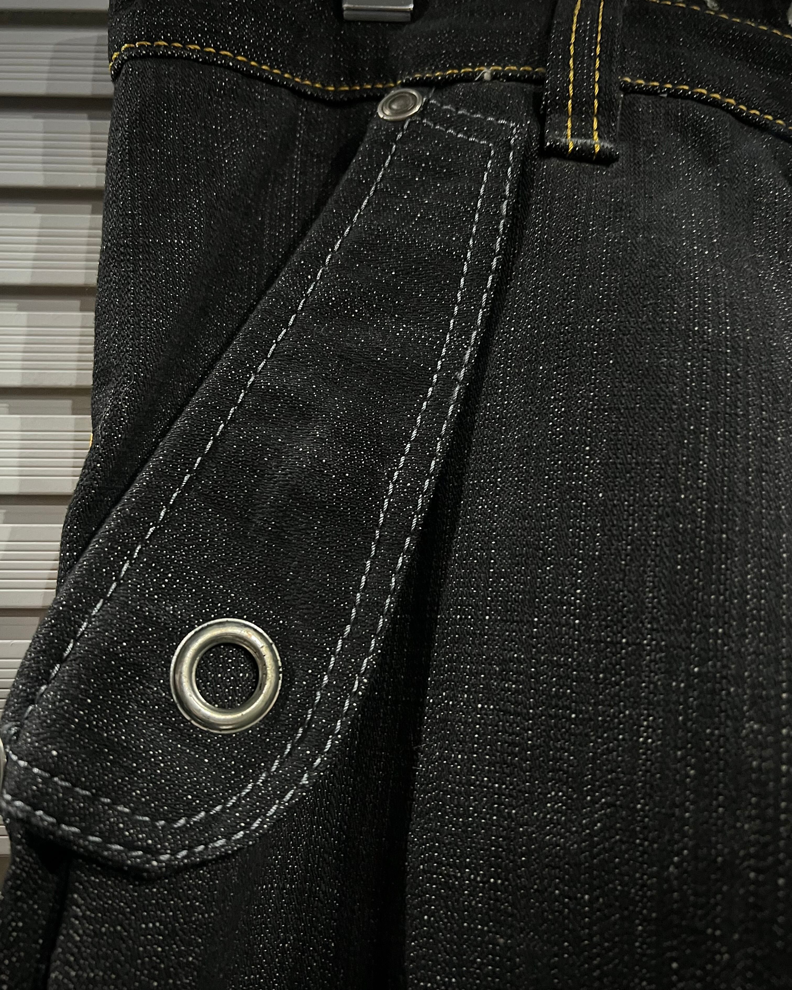 ベースにはタフさを感じるブラックデニムを採用し、程よいオンス感と張りのある質感が特徴。深みのあるブラックに、随所で走るステッチワークが立体感を生み、単色ながら奥行きのある表情に仕上がっています。