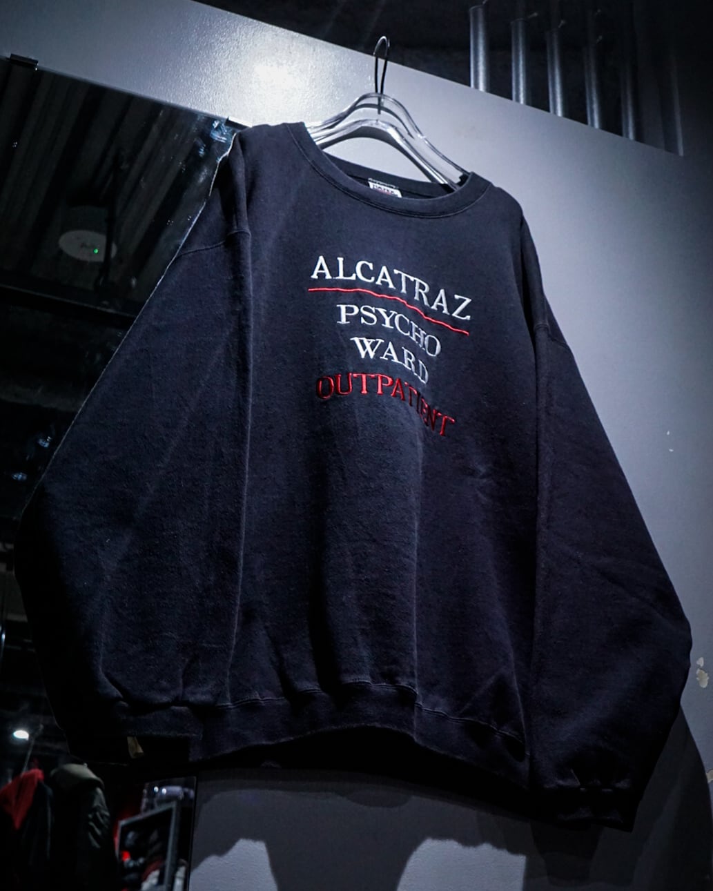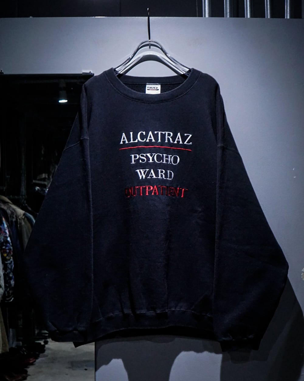 刺繍には「ALCATRAZ / PSYCHO WARD / OUTPATIENT」=「アルカトラズ精神病棟の外来患者」という、皮肉とブラックユーモアを感じさせるワードを配置。ホワイトとレッドの糸使いによる立体感のある刺繍で、奥行きと重みを演出しています。