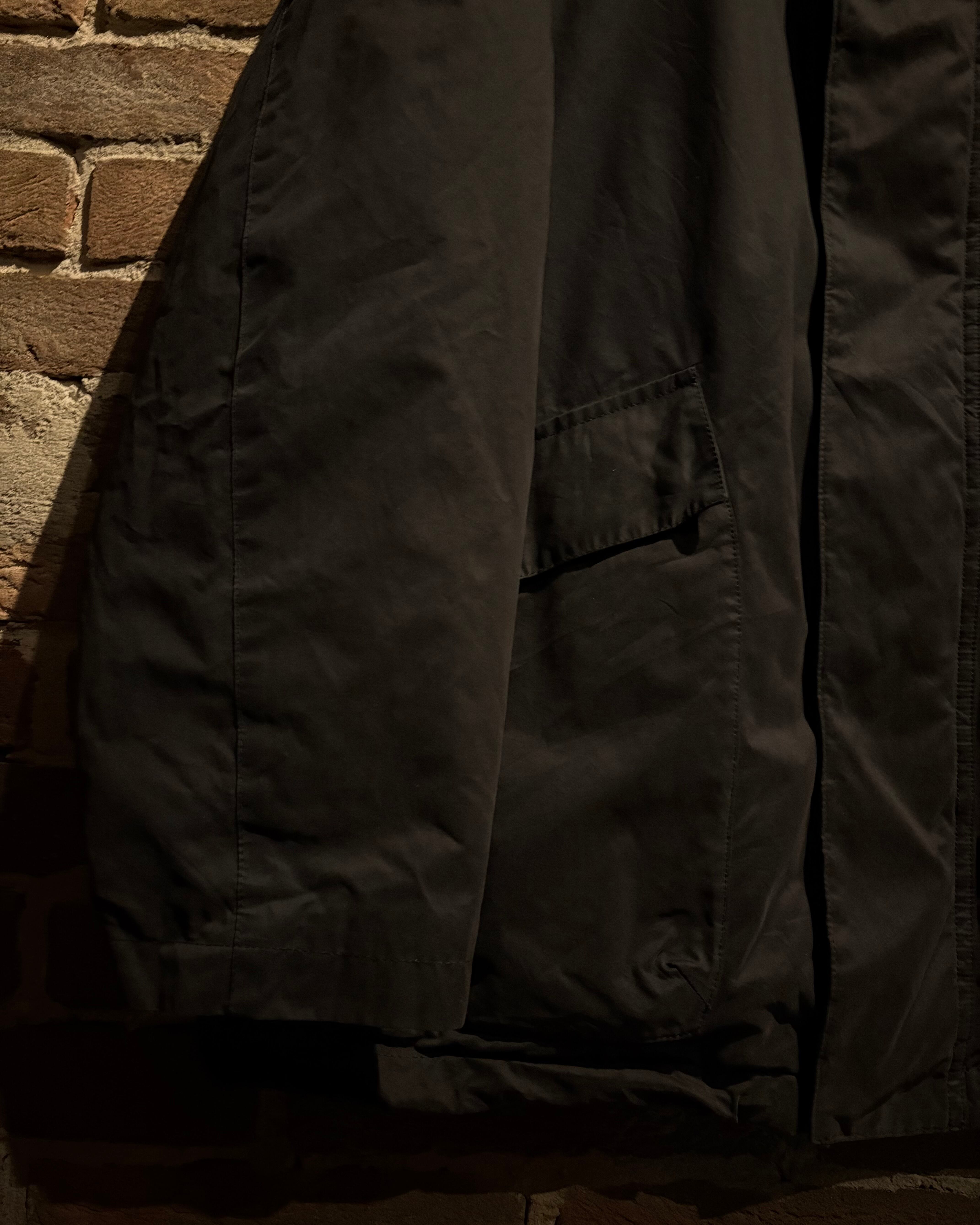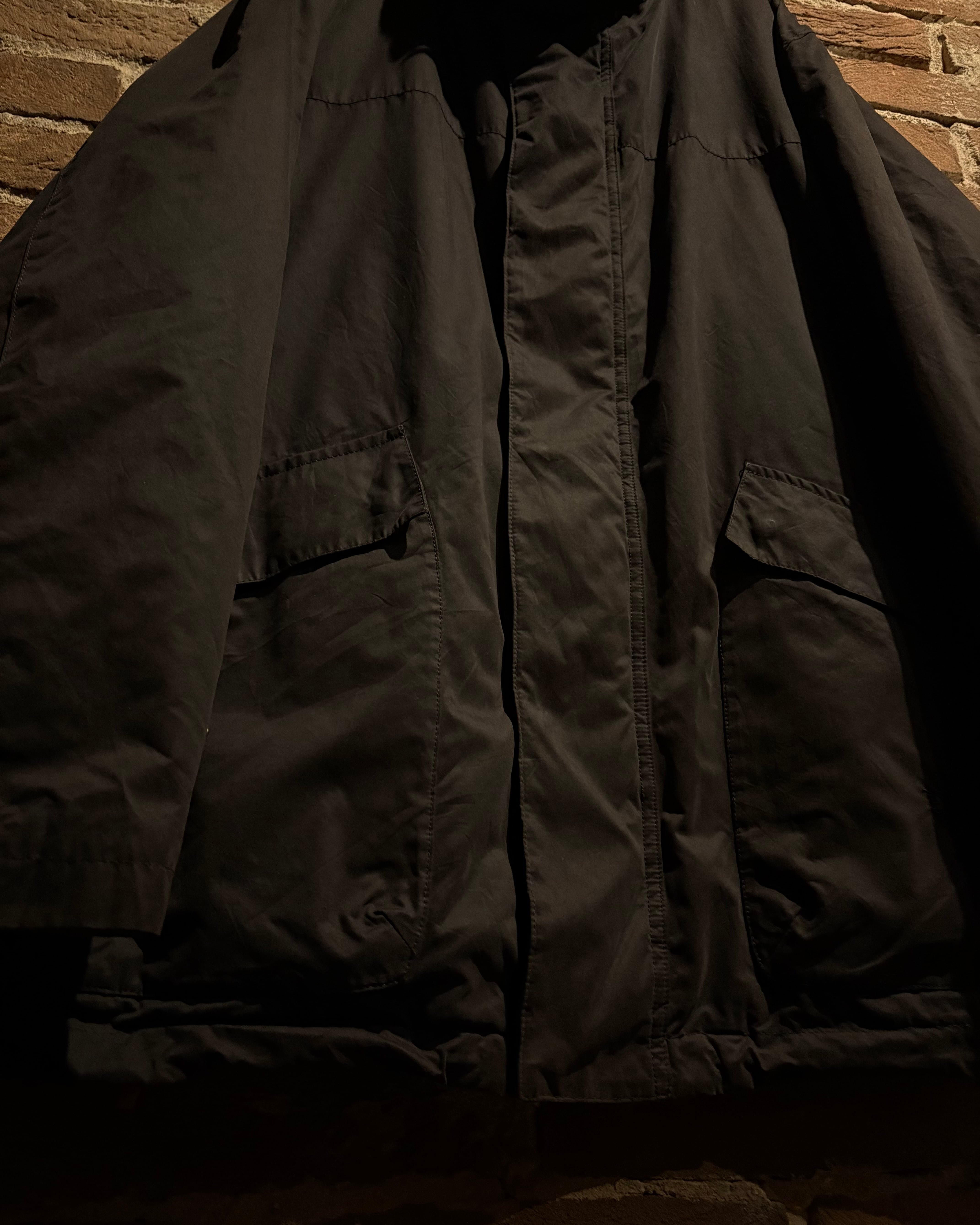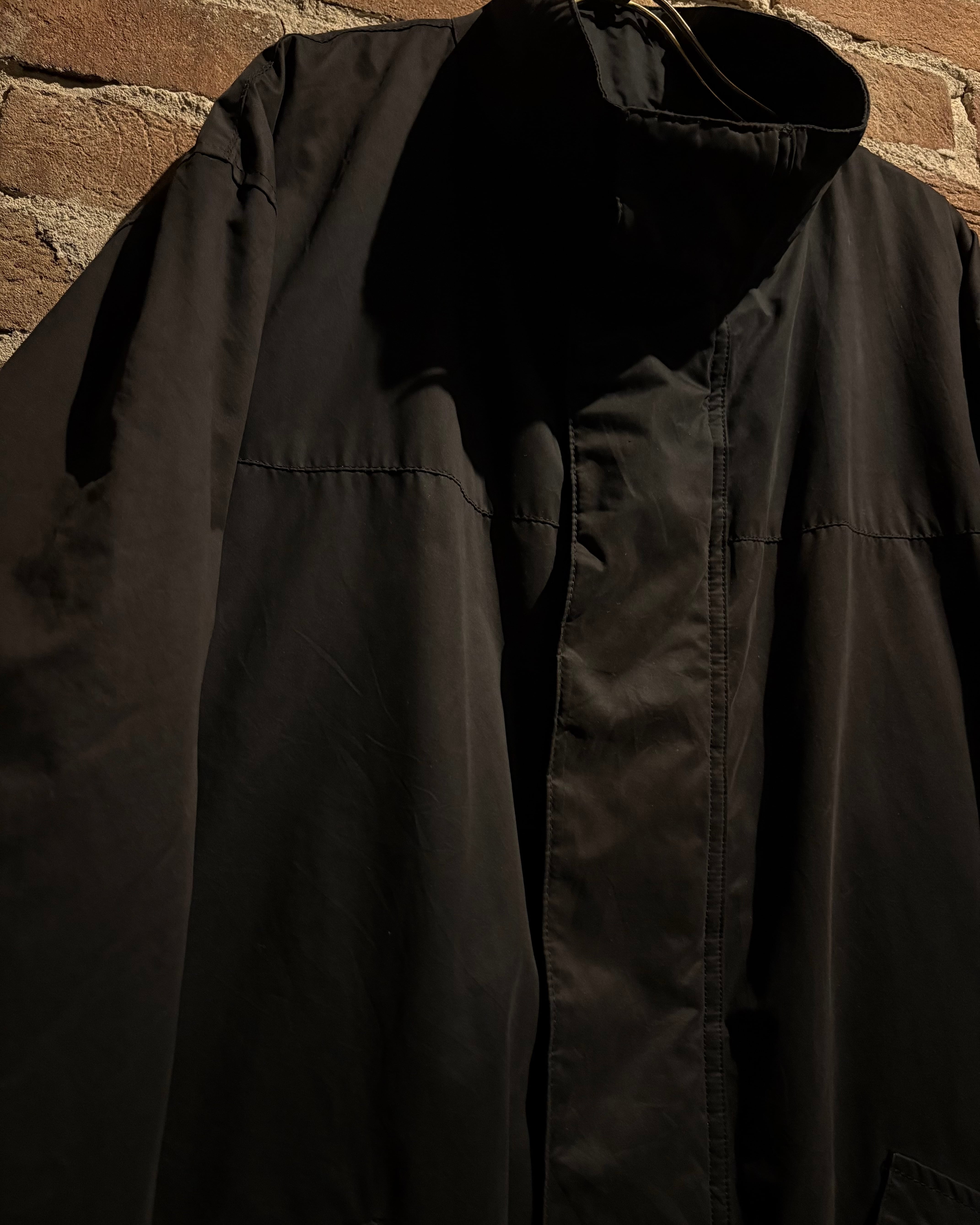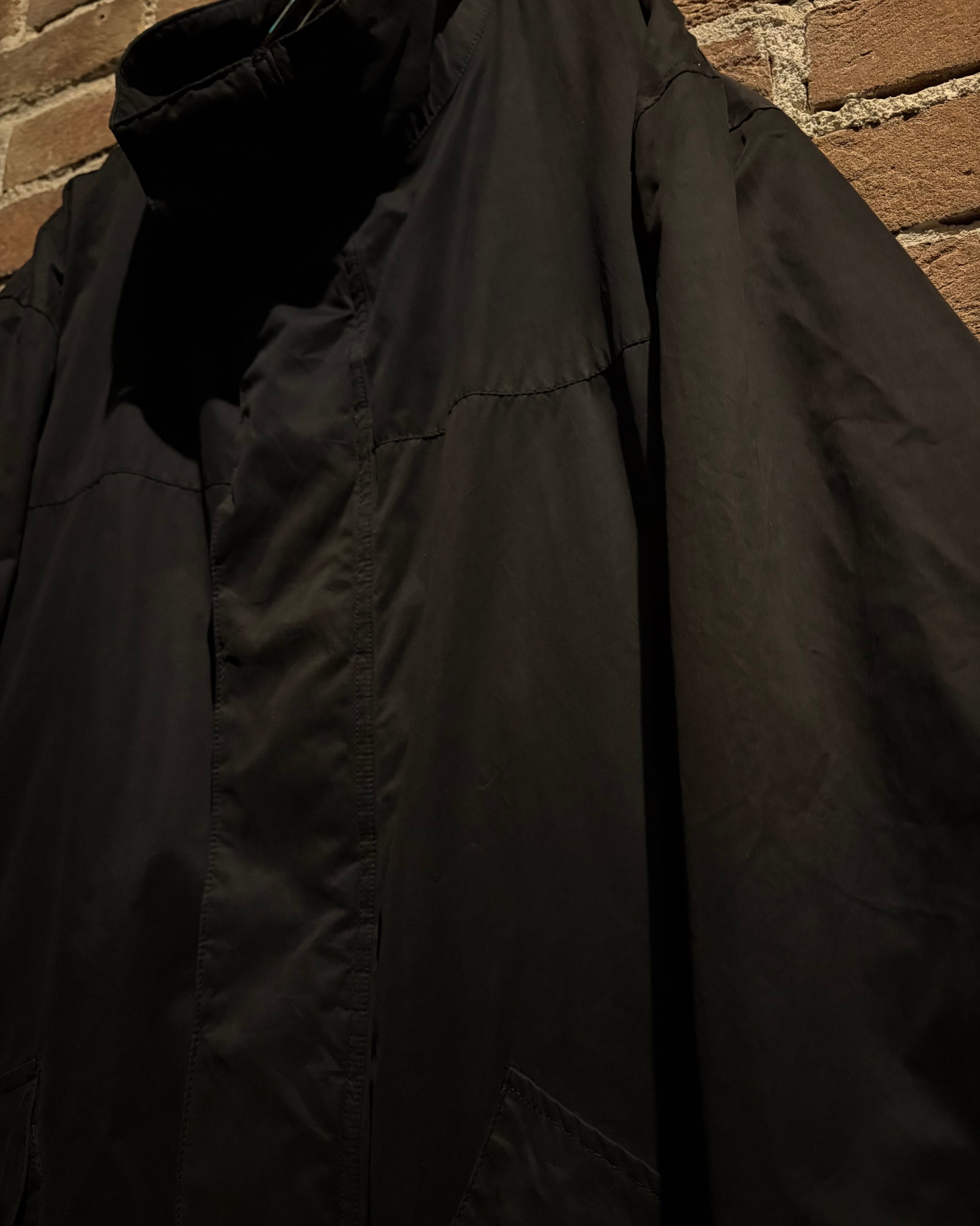 首元はスタンドカラー仕様となっており、ジップを上まで閉めた際の立体的なシルエットが非常に美しく、顔周りをシャープに演出。フロントは比翼仕立てで、ジップやスナップを隠すことでクリーンな印象に仕上げられています。ジップトップにはブランド刻印入りのパーツを採用し、さりげない主張も抜かりありません。