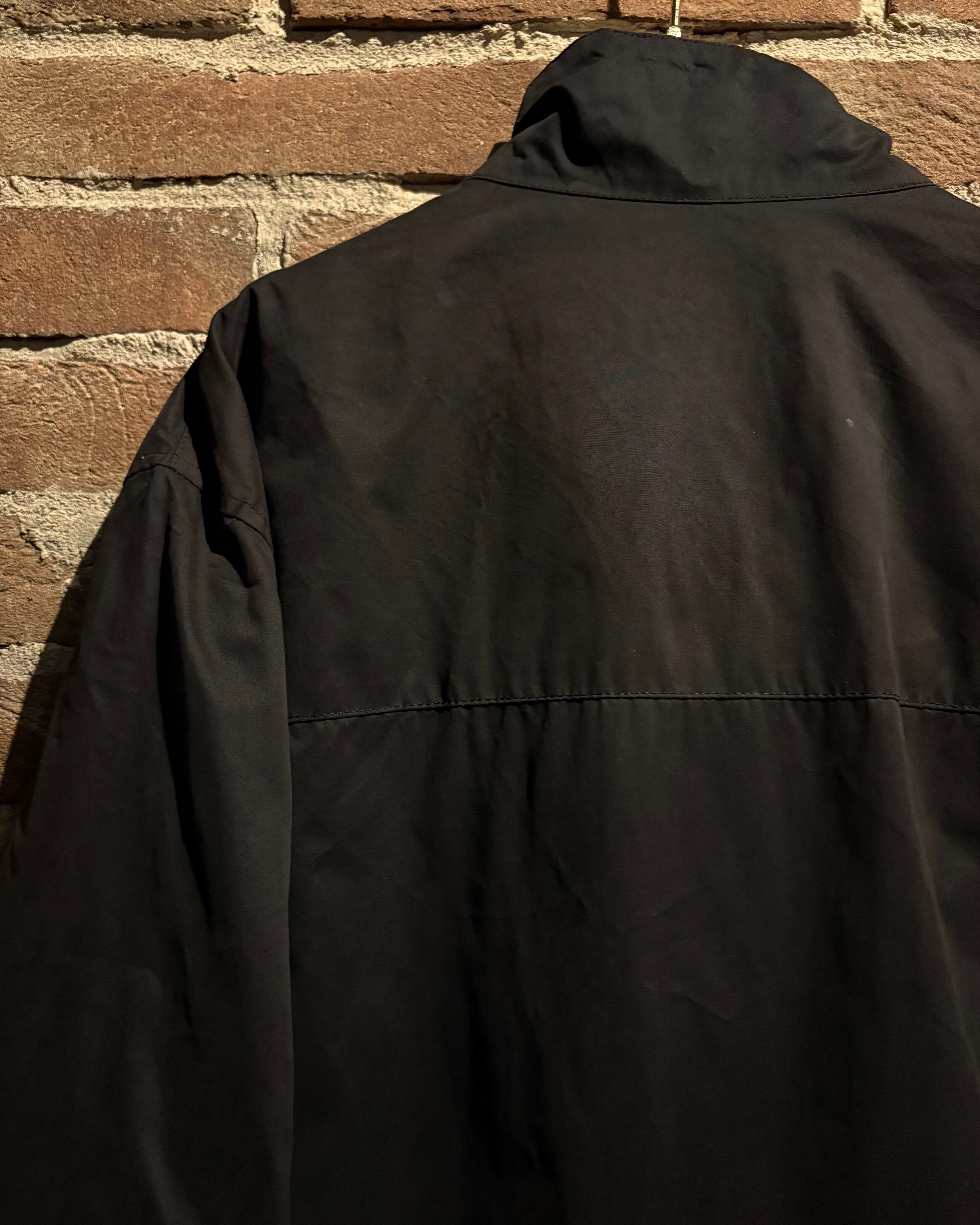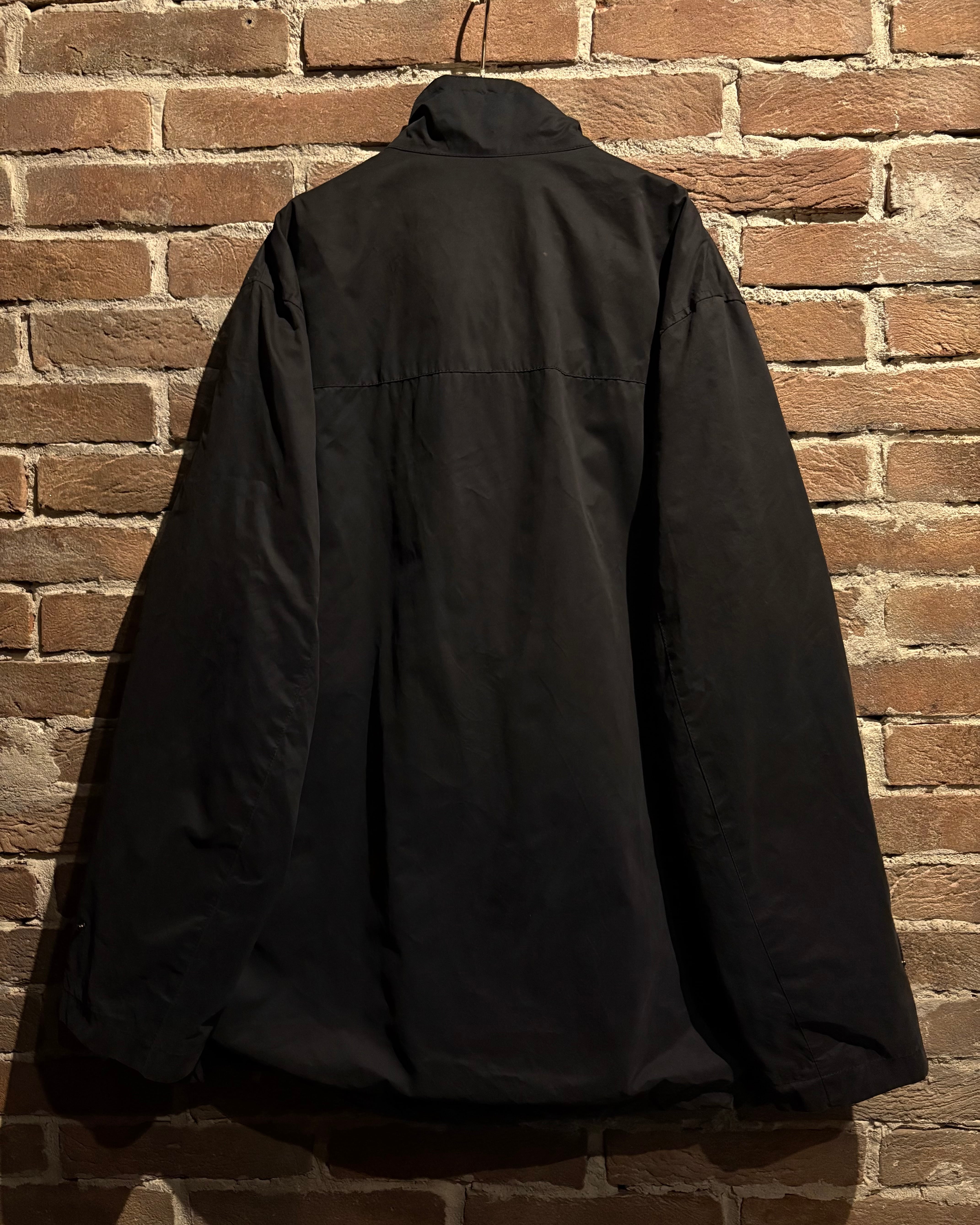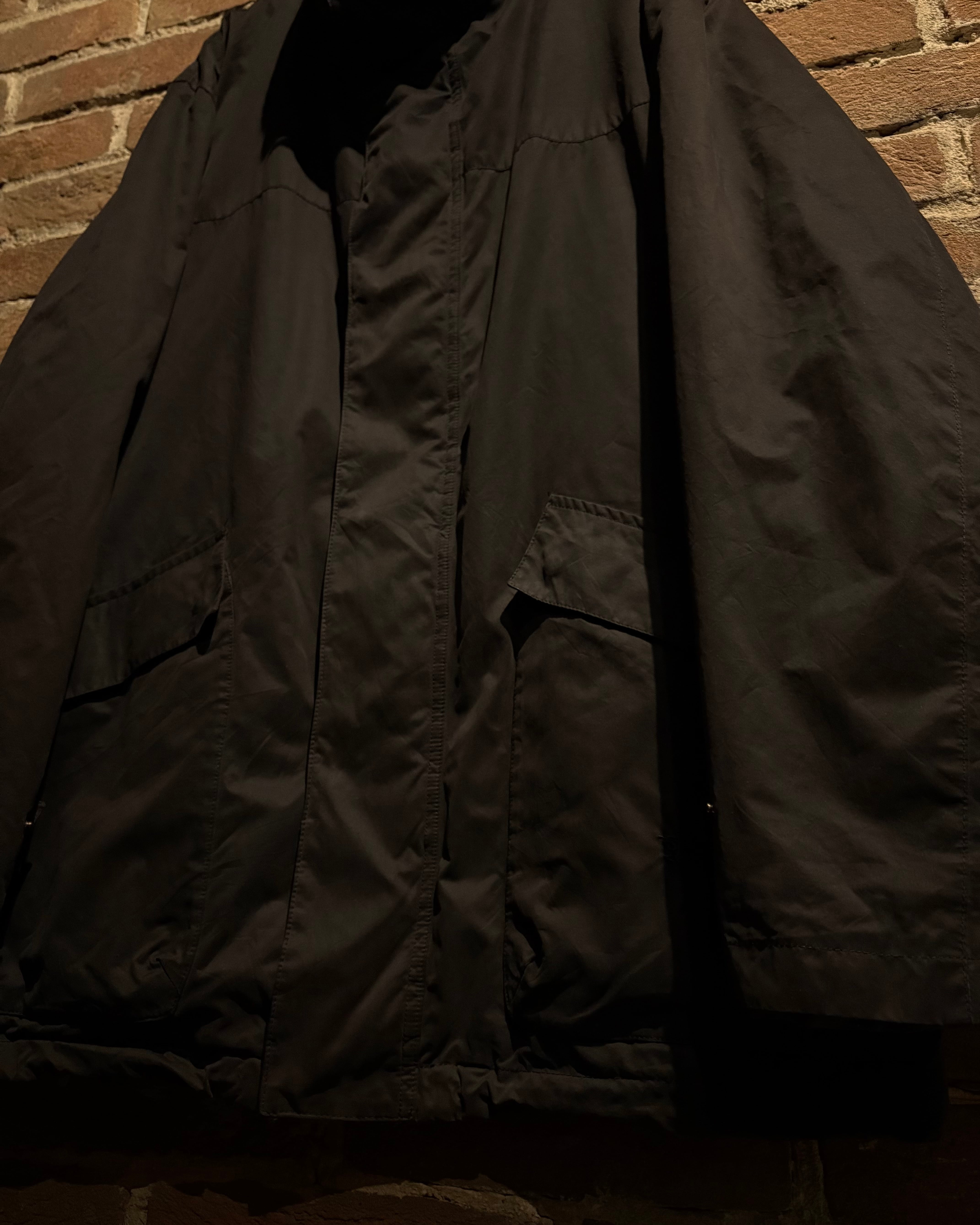 首元はスタンドカラー仕様となっており、ジップを上まで閉めた際の立体的なシルエットが非常に美しく、顔周りをシャープに演出。フロントは比翼仕立てで、ジップやスナップを隠すことでクリーンな印象に仕上げられています。ジップトップにはブランド刻印入りのパーツを採用し、さりげない主張も抜かりありません。