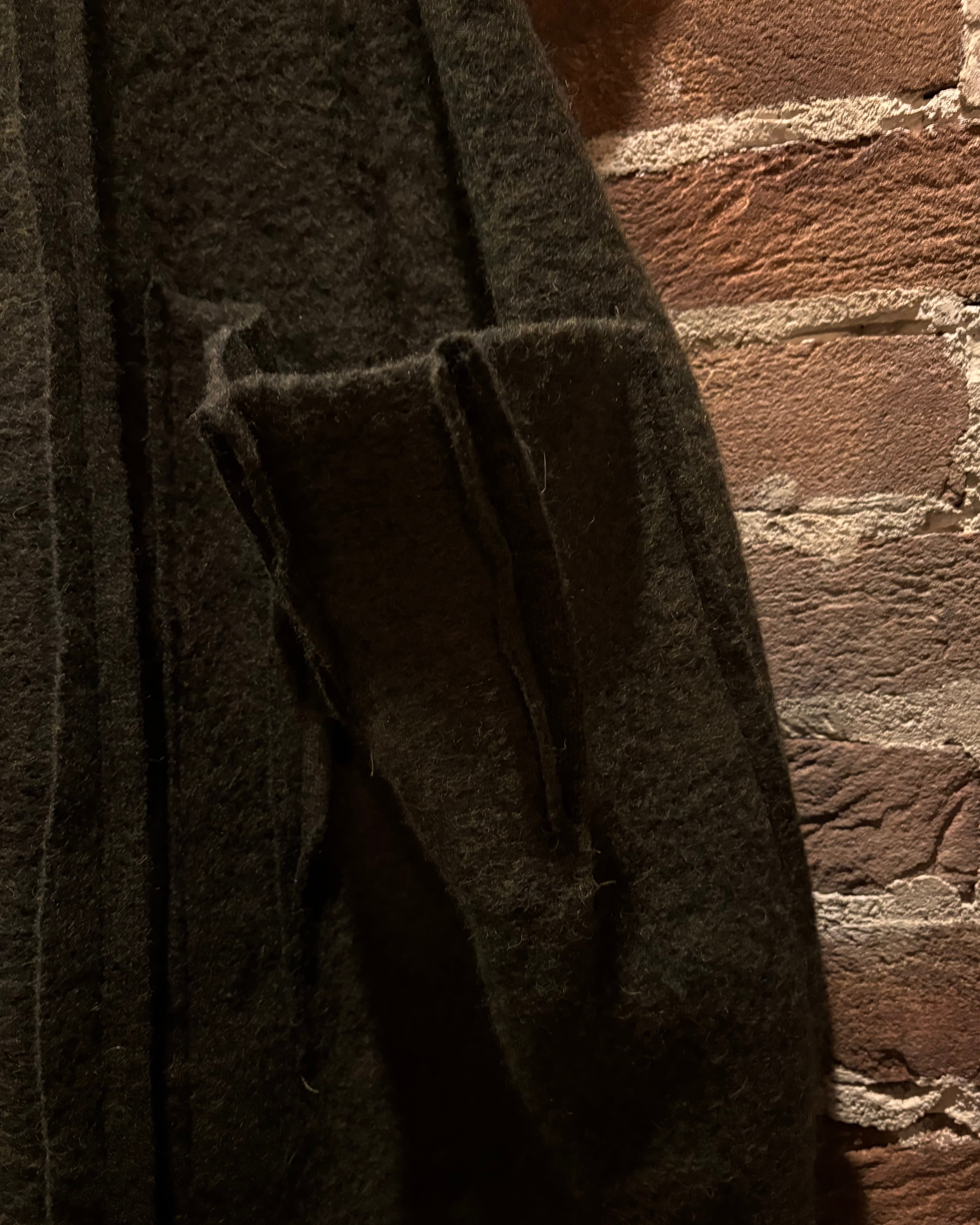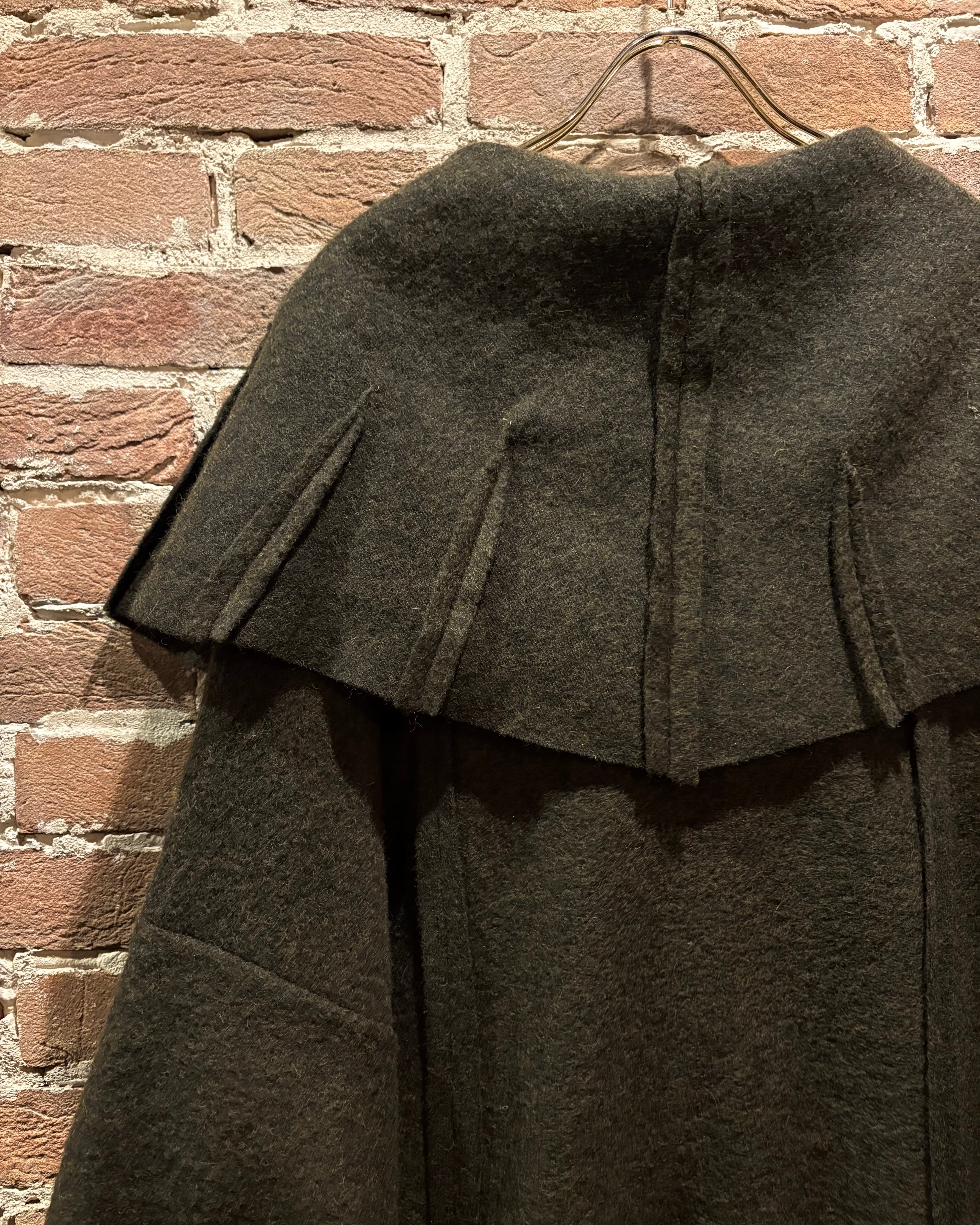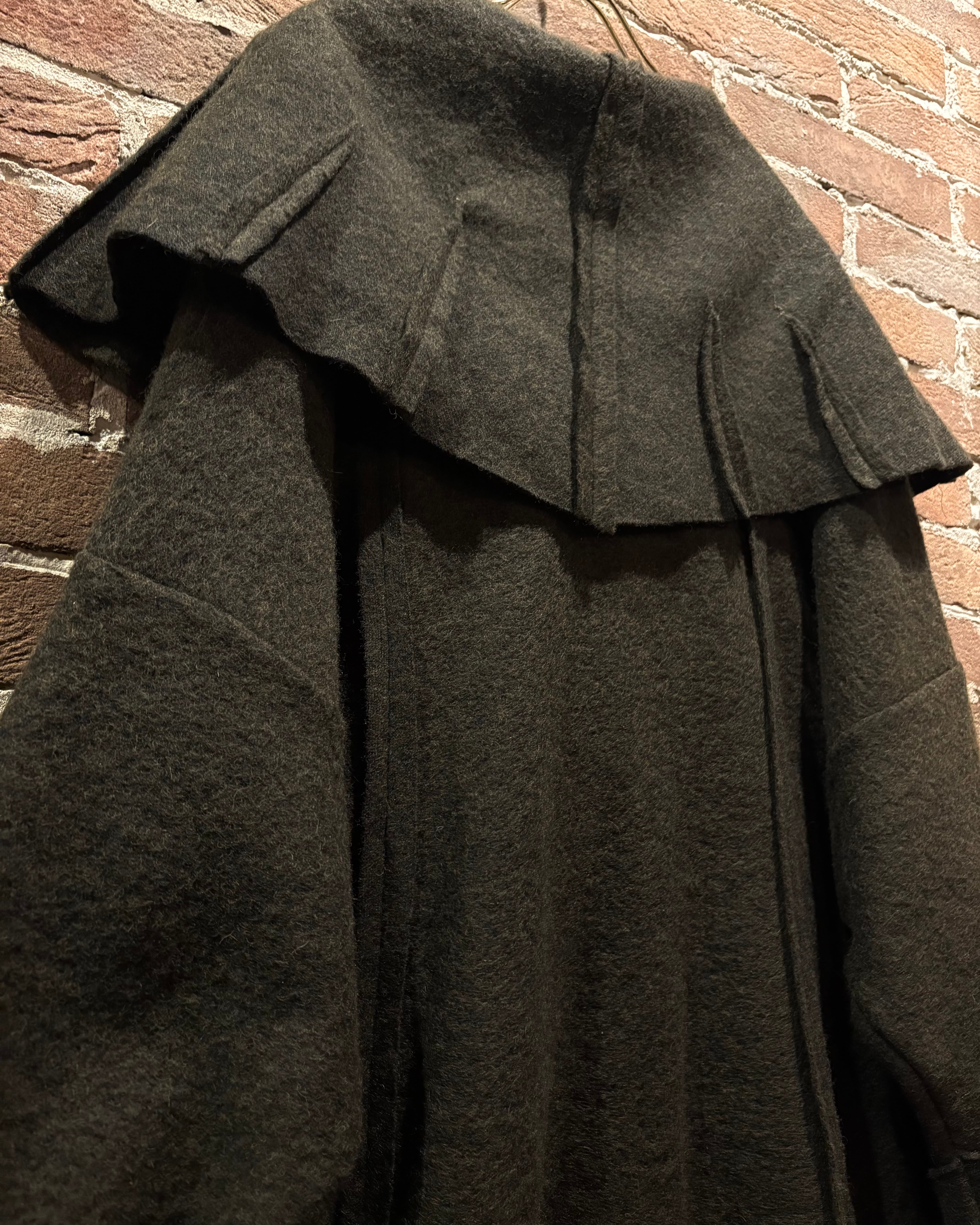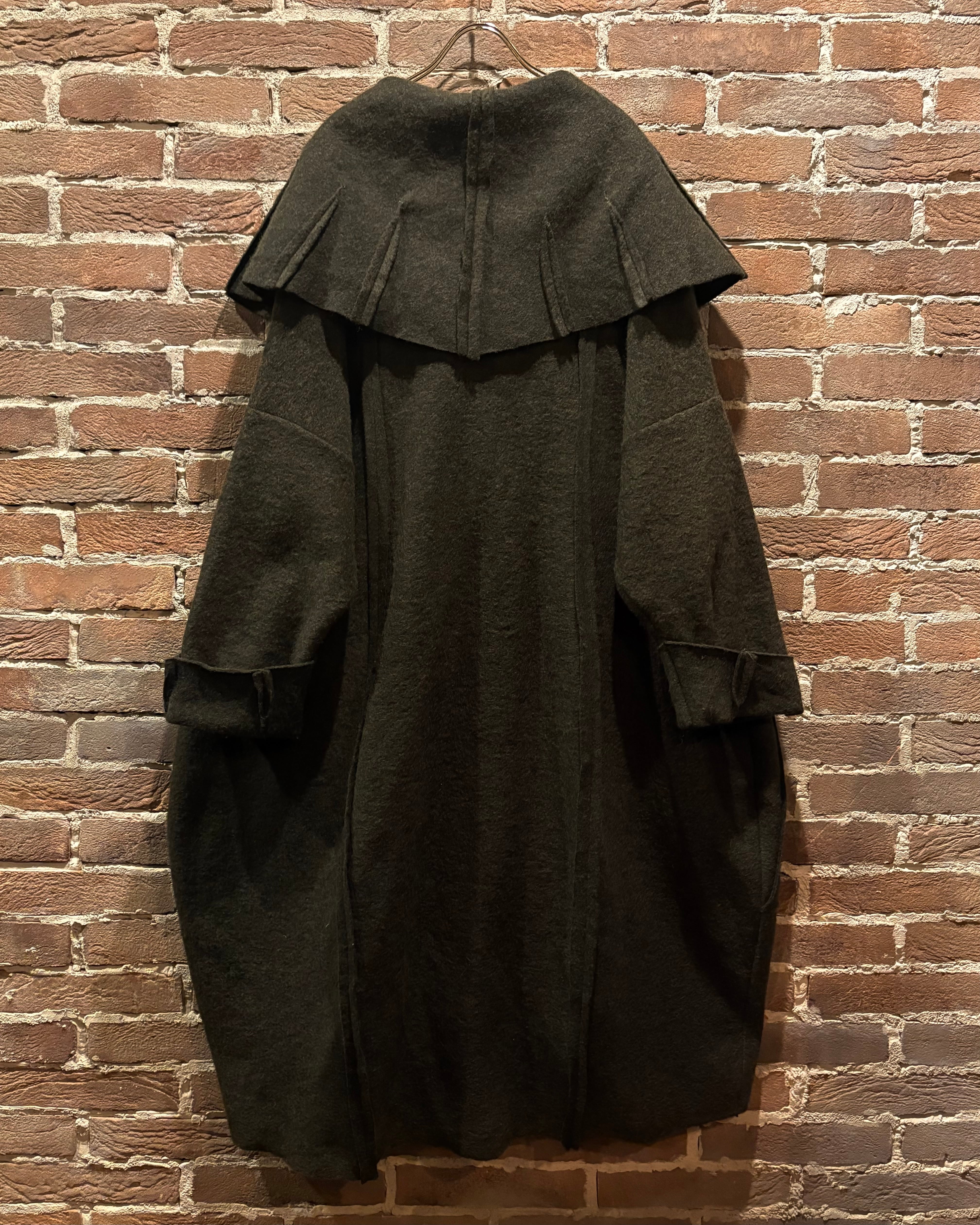 最大の特徴は、首元から肩にかけて大胆にデザインされた大きなショールカラー。シームを外側に出したインサイドアウトの立体感もあり、シンプルながら存在感抜群ですね。