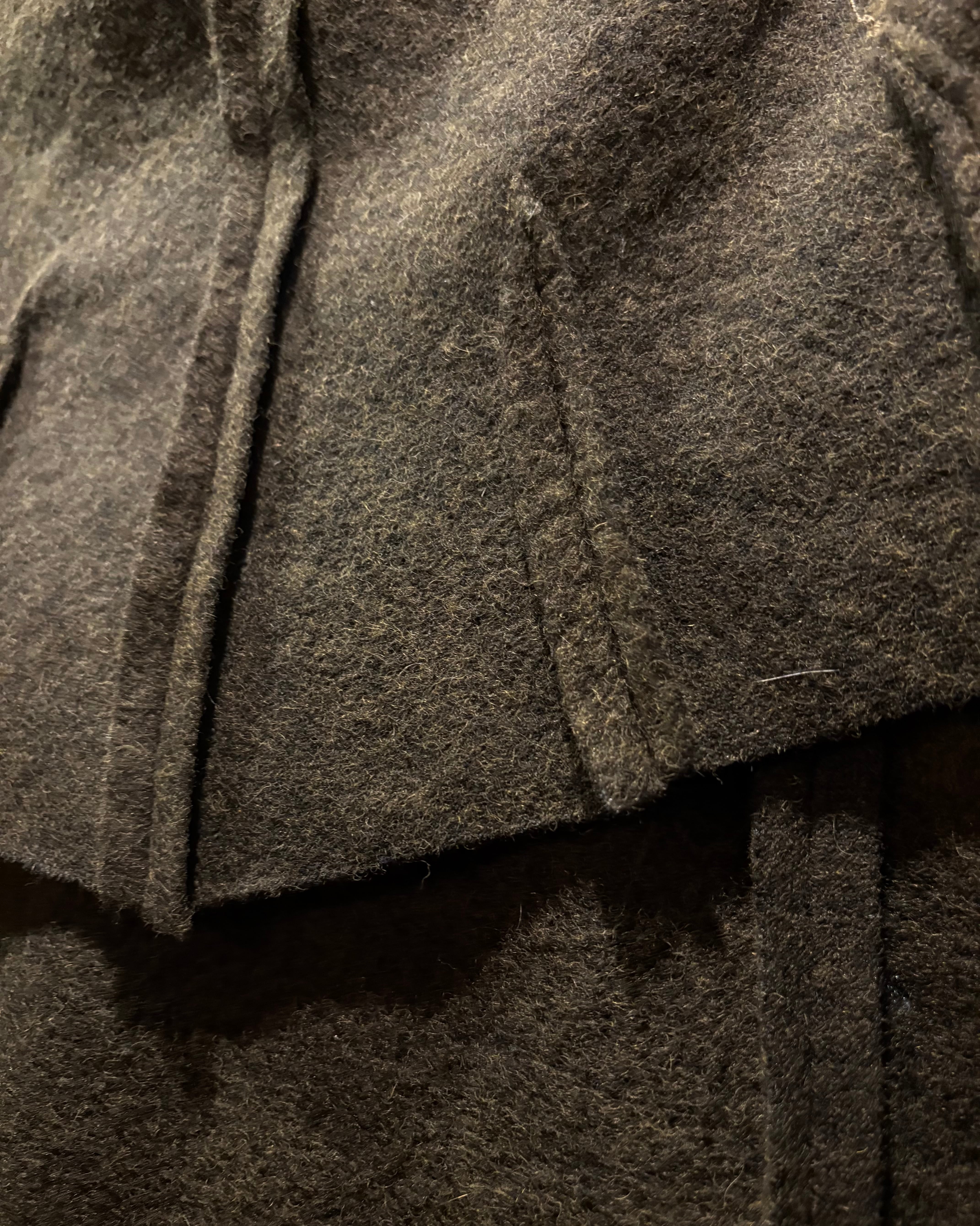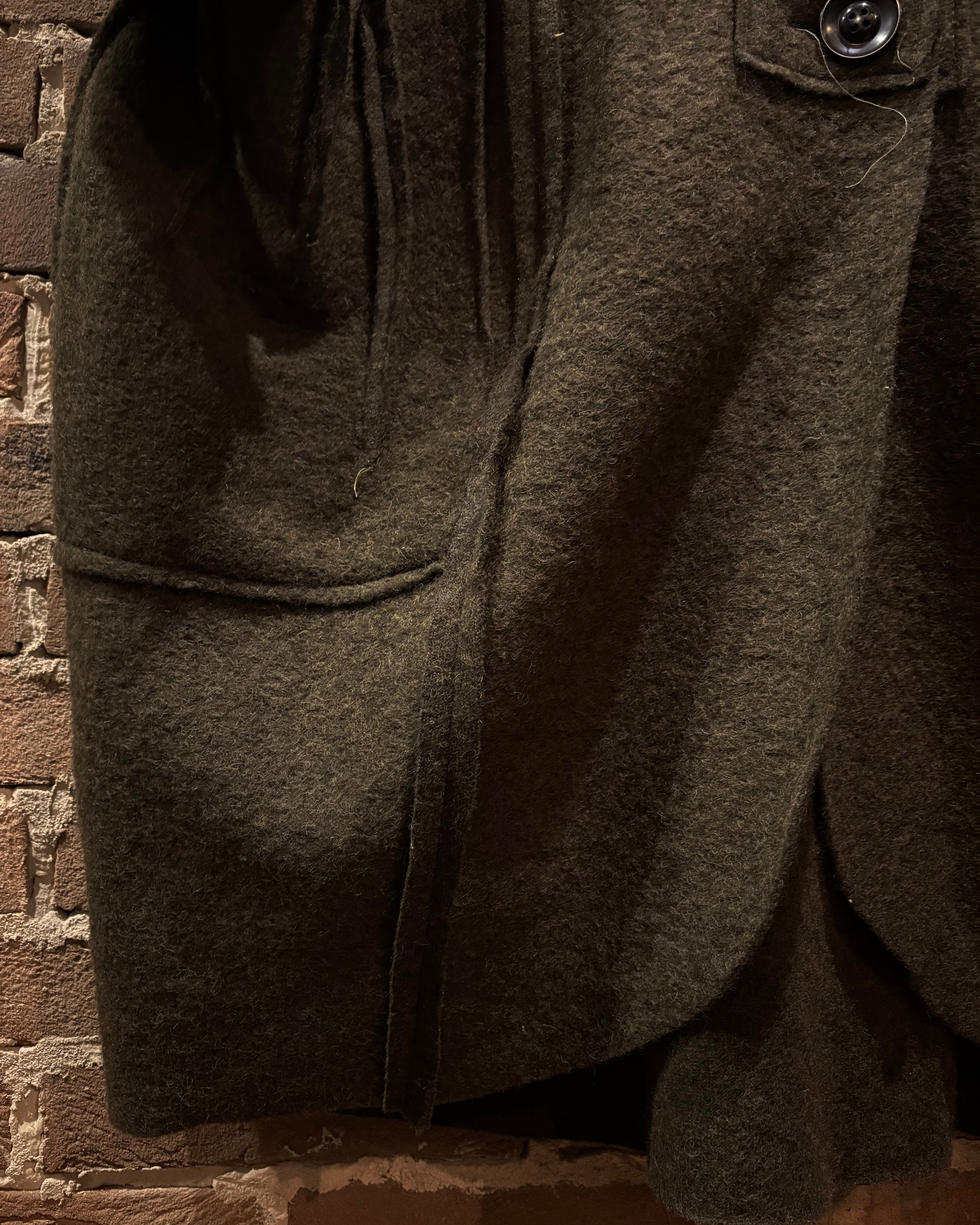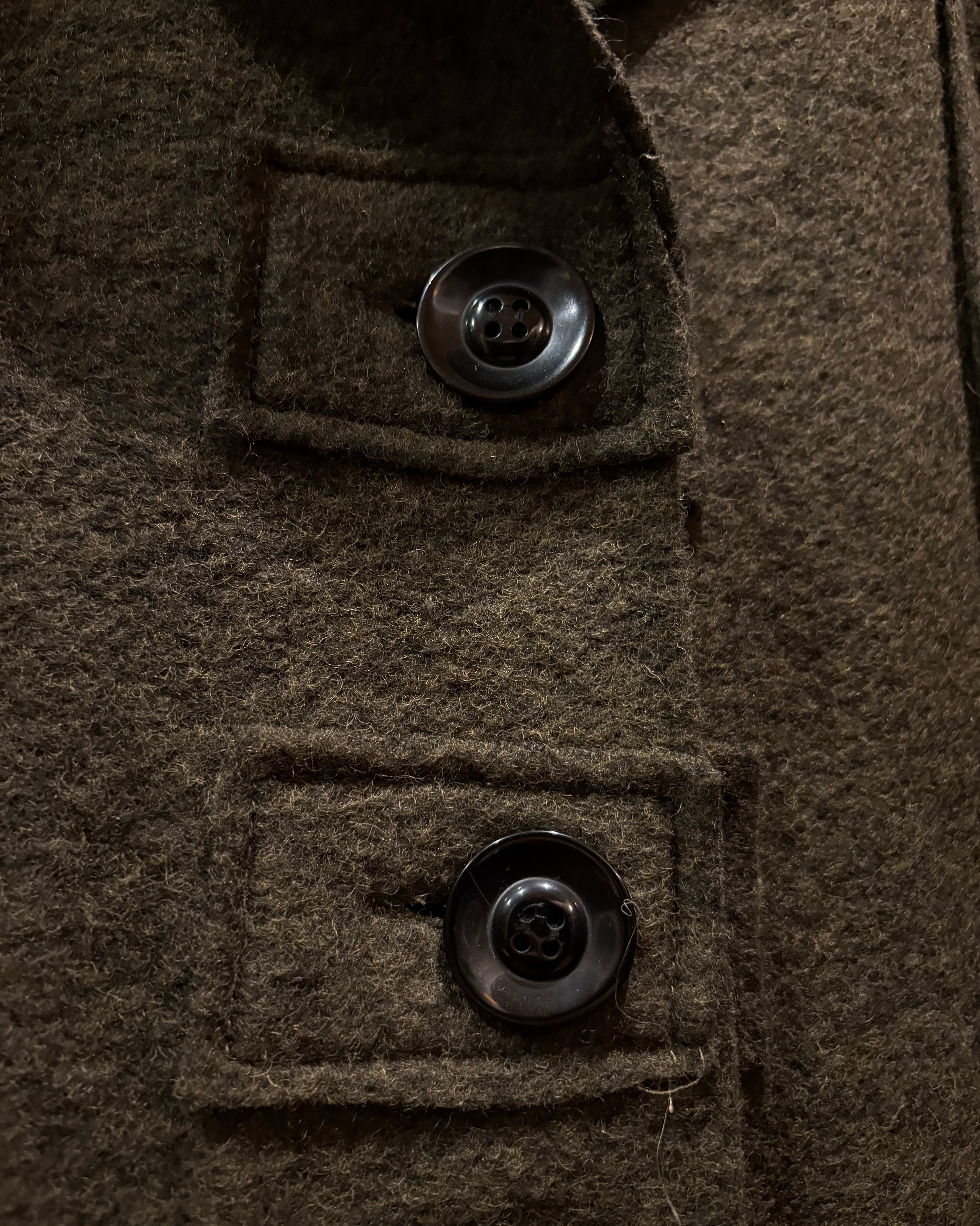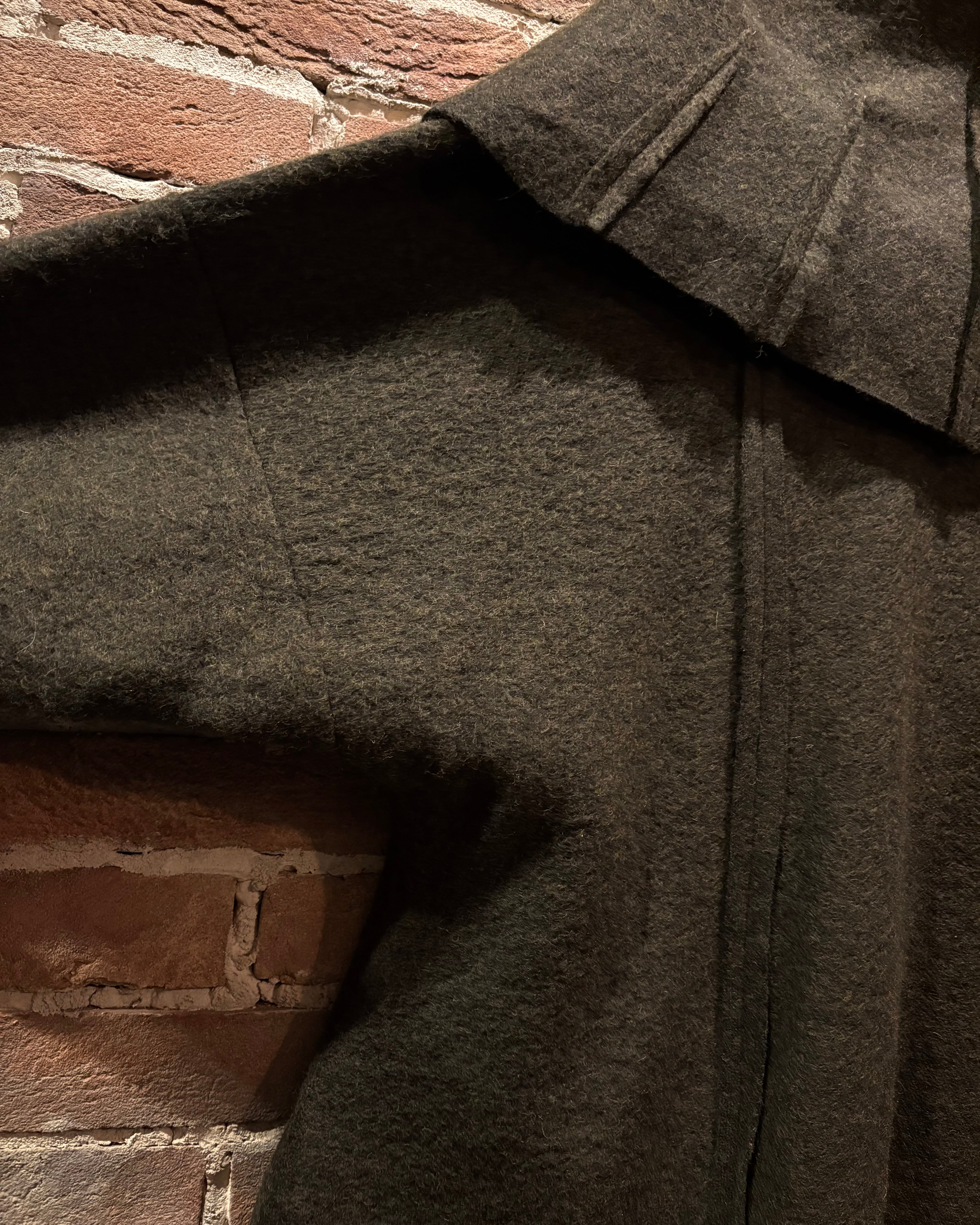 起毛感のあるウール素材ならではの奥行きある表情と、ダークオリーブの落ち着いたカラーリングが相まった、非常にムードのある1着。
