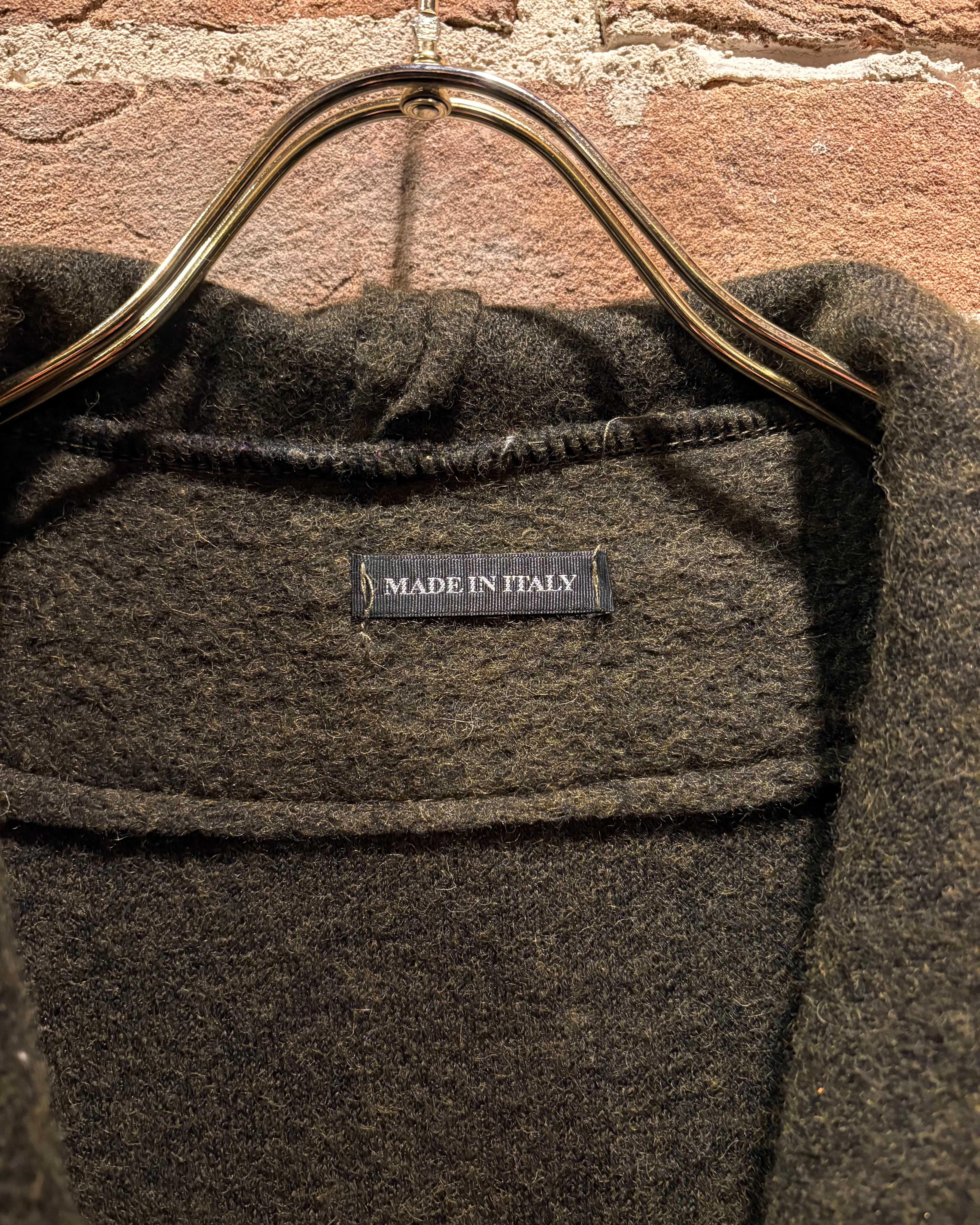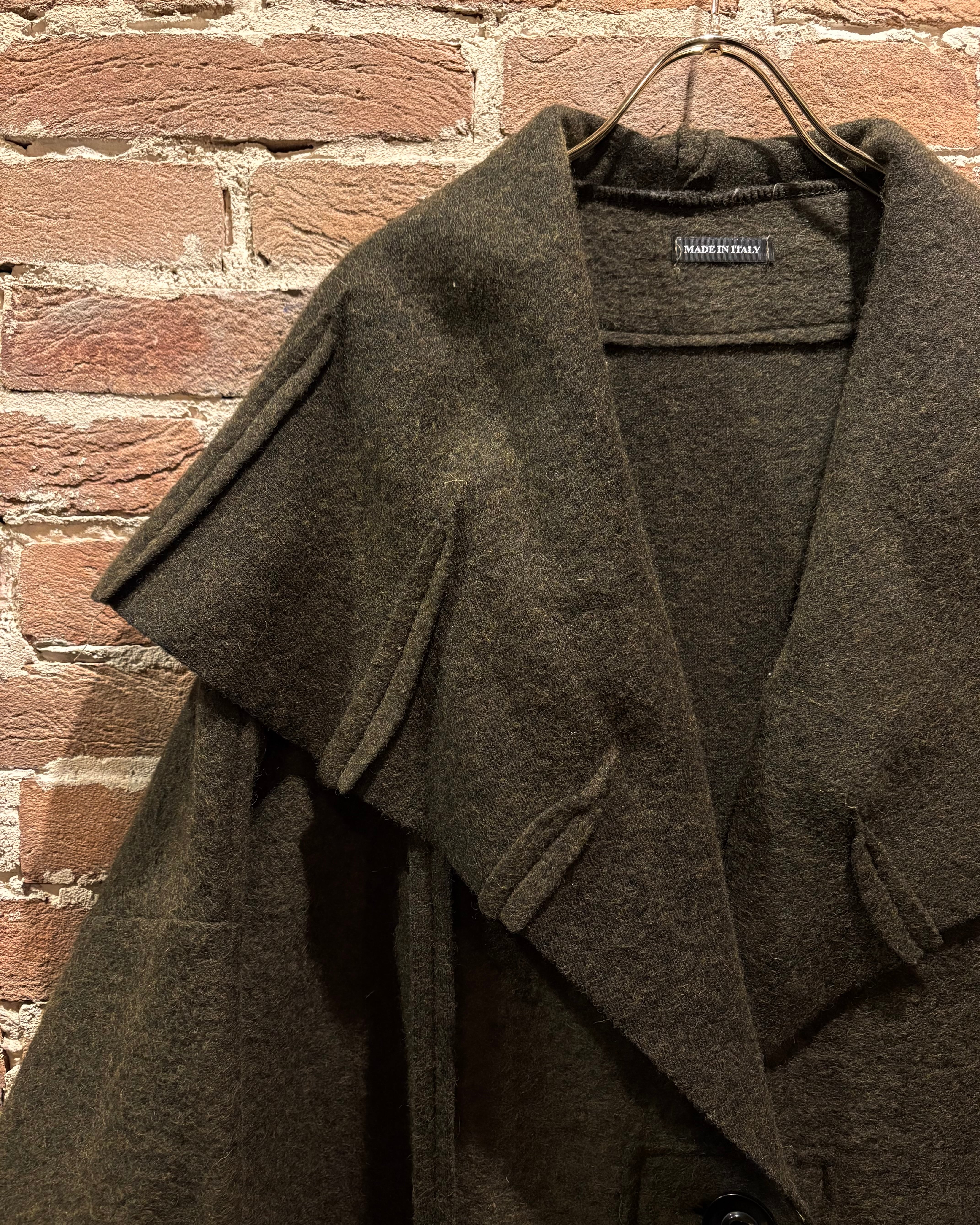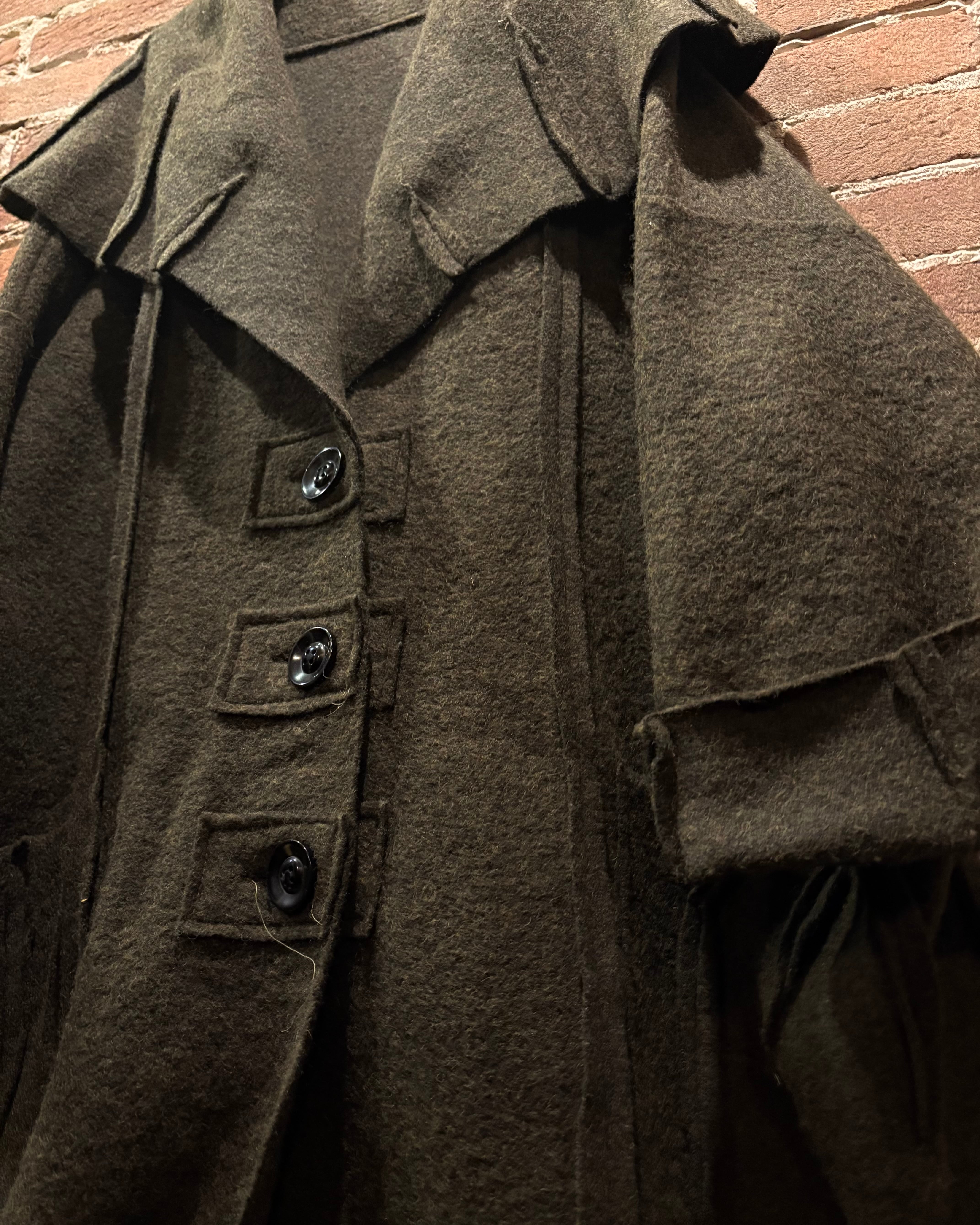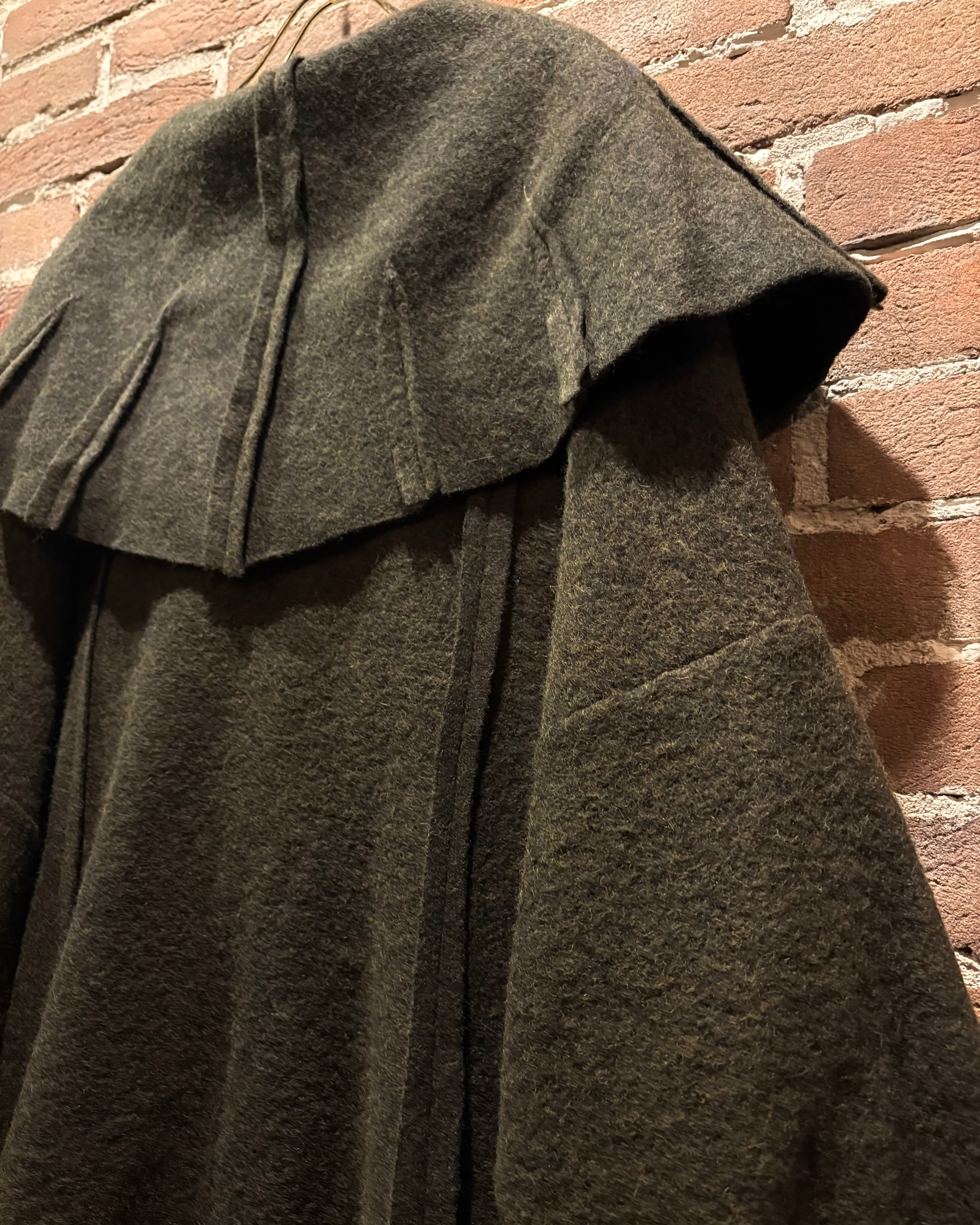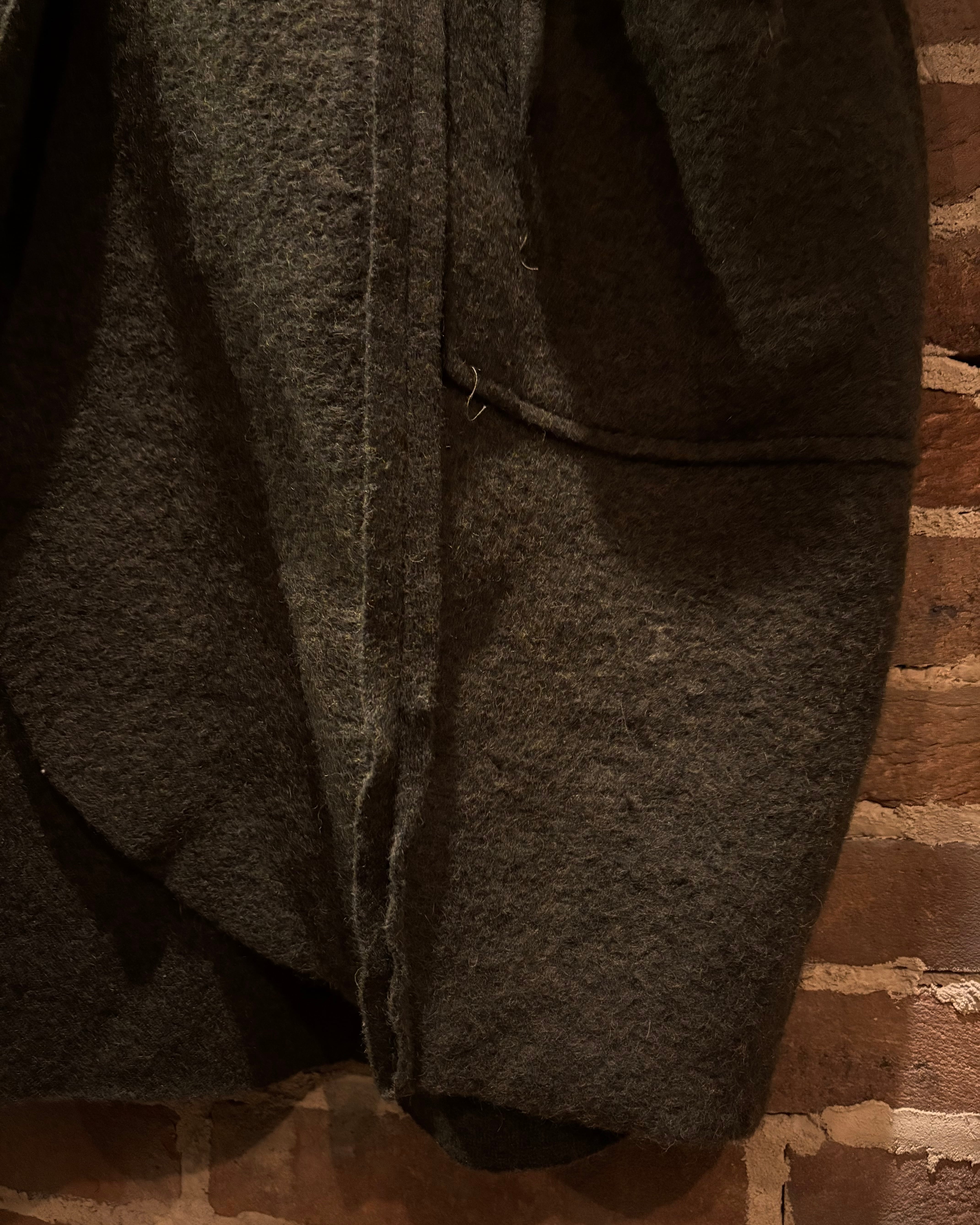 起毛感のあるウール素材ならではの奥行きある表情と、ダークオリーブの落ち着いたカラーリングが相まった、非常にムードのある1着。