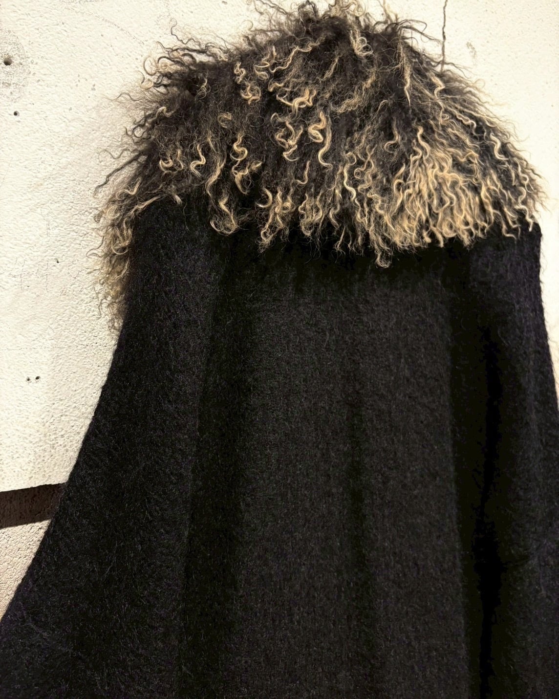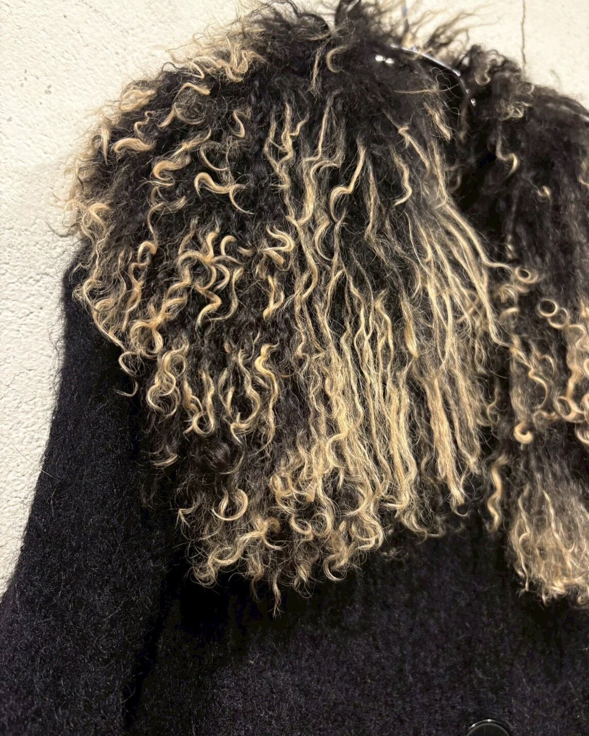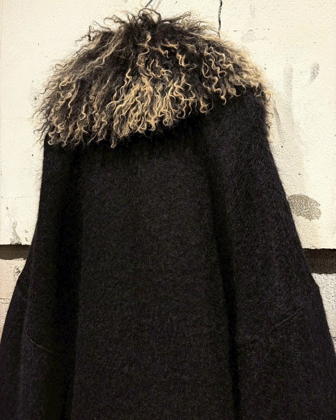 最大の特徴は、襟にあしらわれたフェイクファー。くるっとした毛足の表情と、ブラック×ベージュのミックスカラーが奥行きを演出し、顔まわりに圧倒的な存在感をプラス。