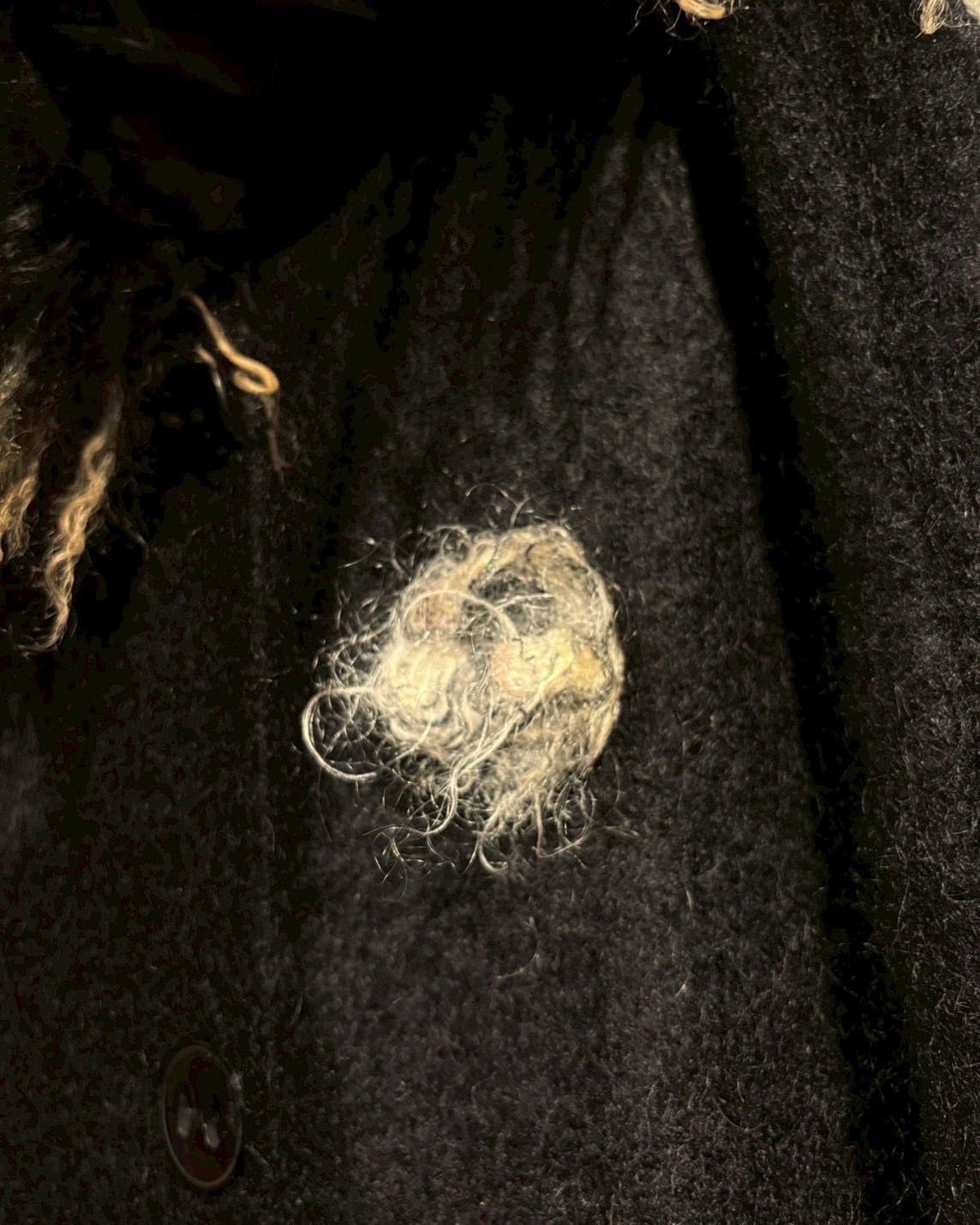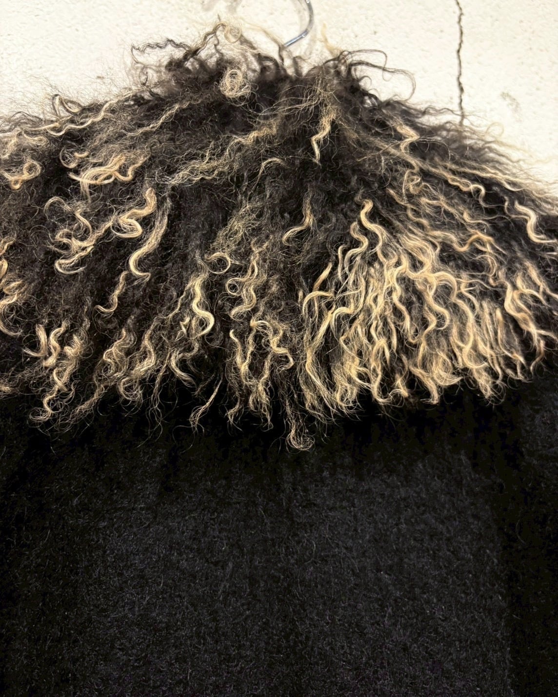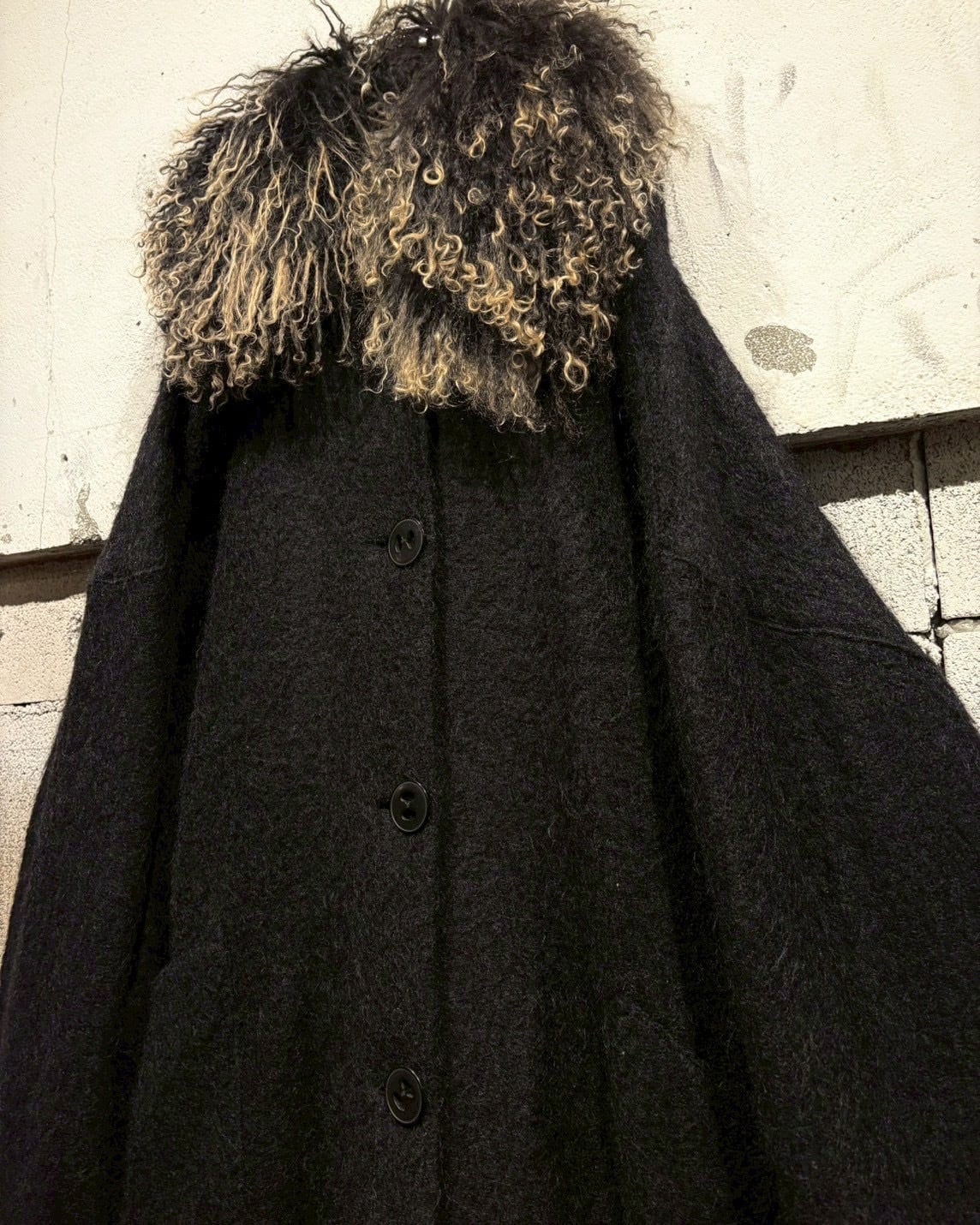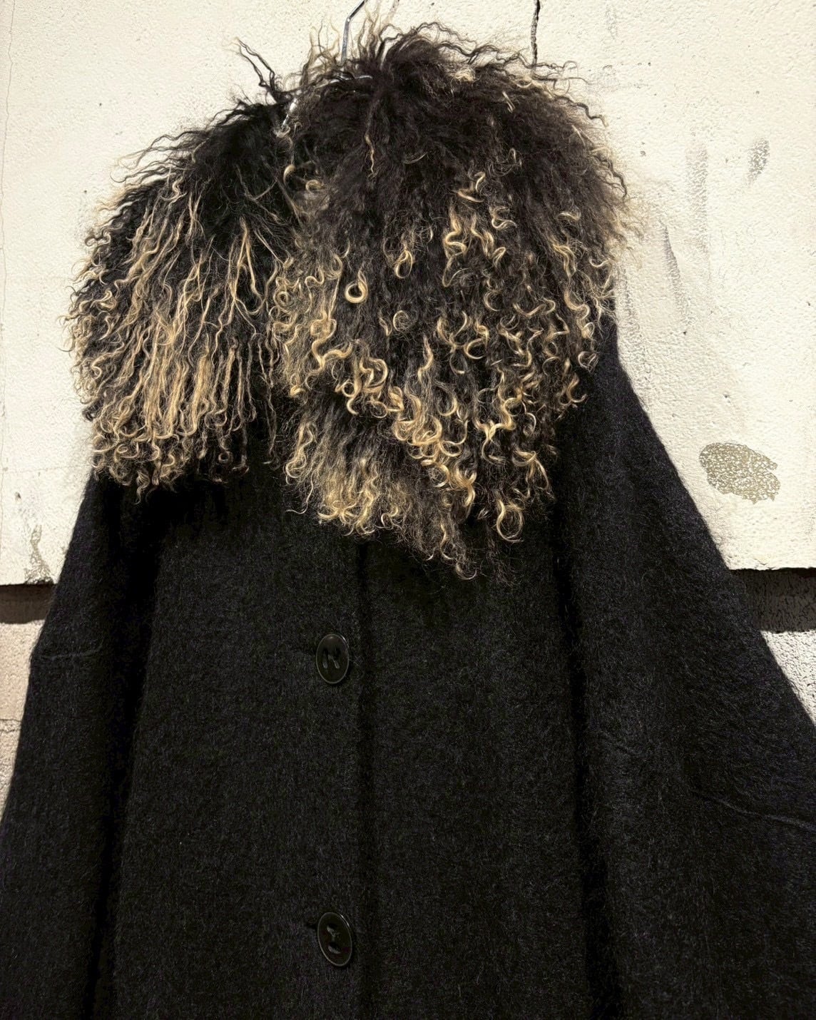 最大の特徴は、襟にあしらわれたフェイクファー。くるっとした毛足の表情と、ブラック×ベージュのミックスカラーが奥行きを演出し、顔まわりに圧倒的な存在感をプラス。