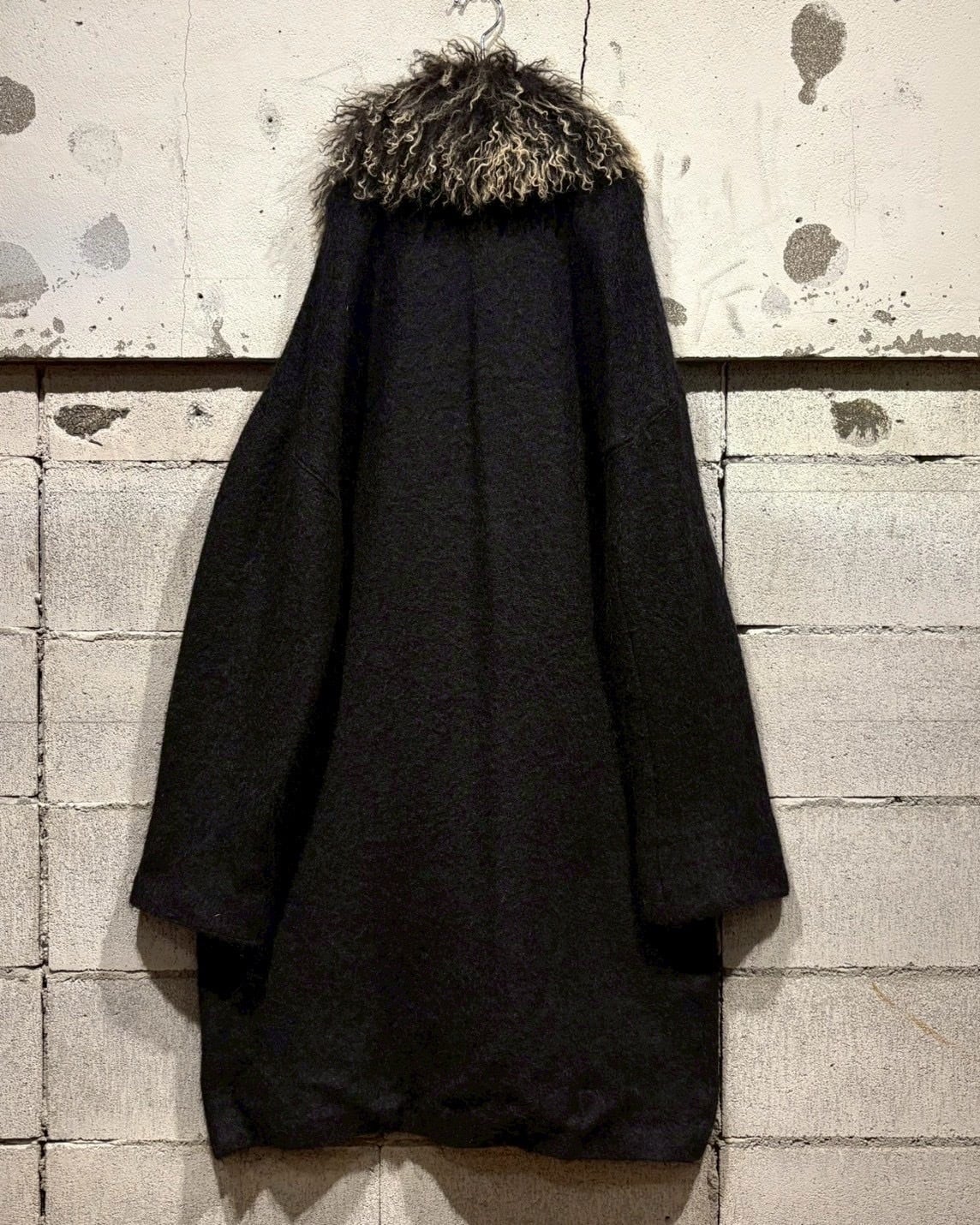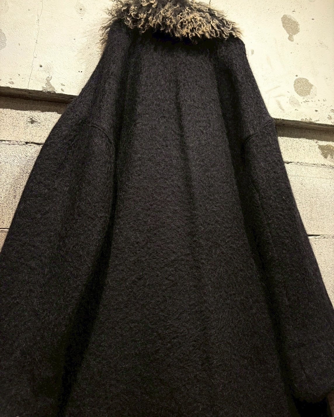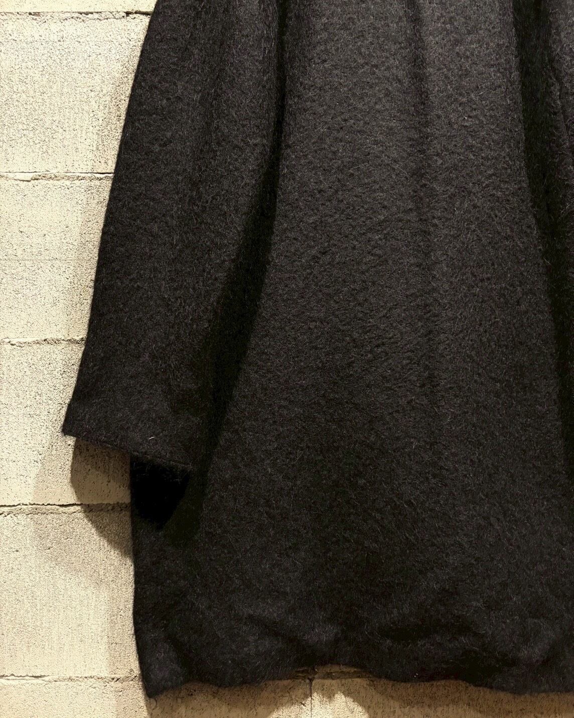 ボディにはしっかりとしたウール素材を採用。程よい厚みと起毛感があり、着用時に自然な落ち感とドレープを生み出します。ロング丈ながら重たくなりすぎず、縦のラインが美しく出るシルエットが印象的です。