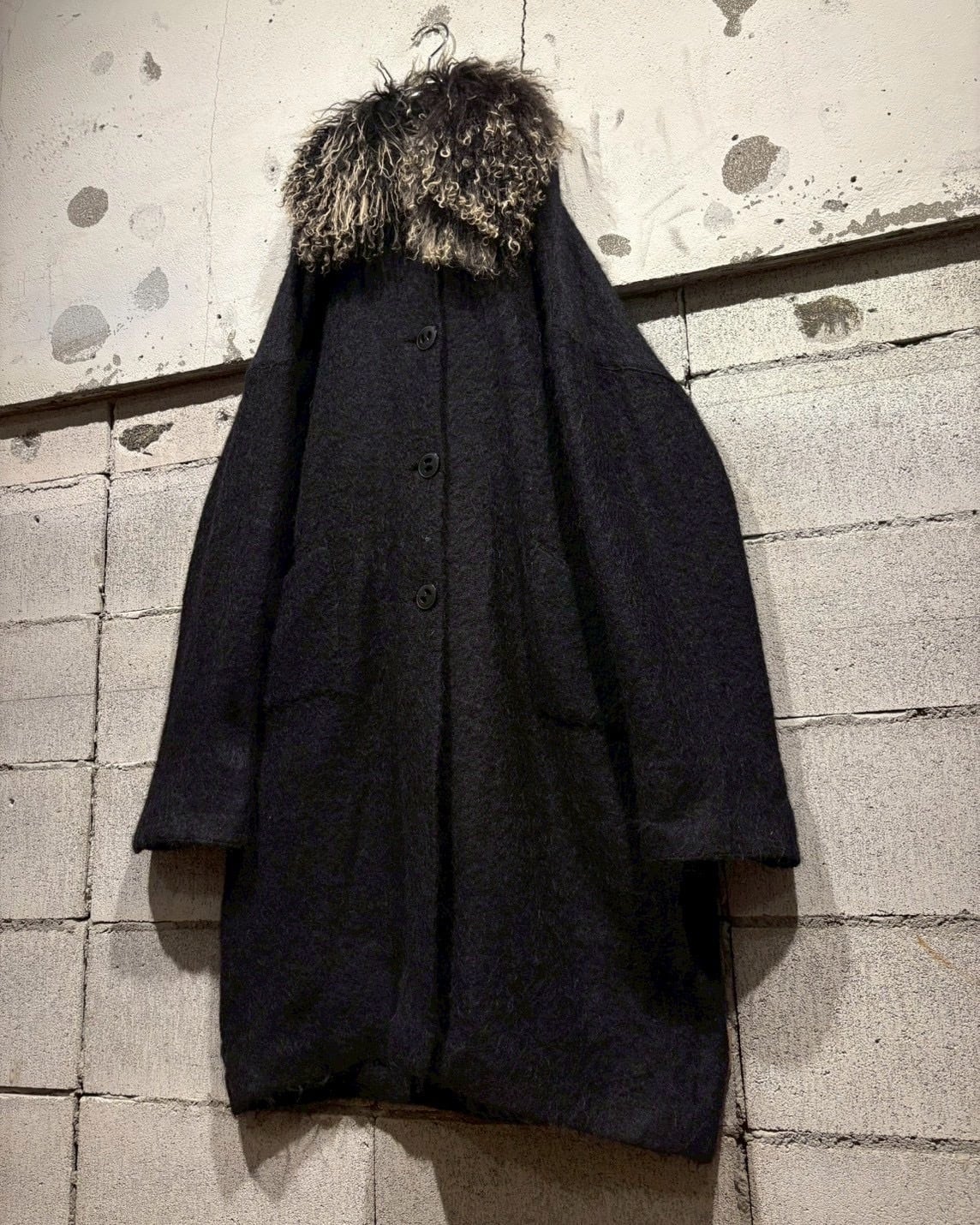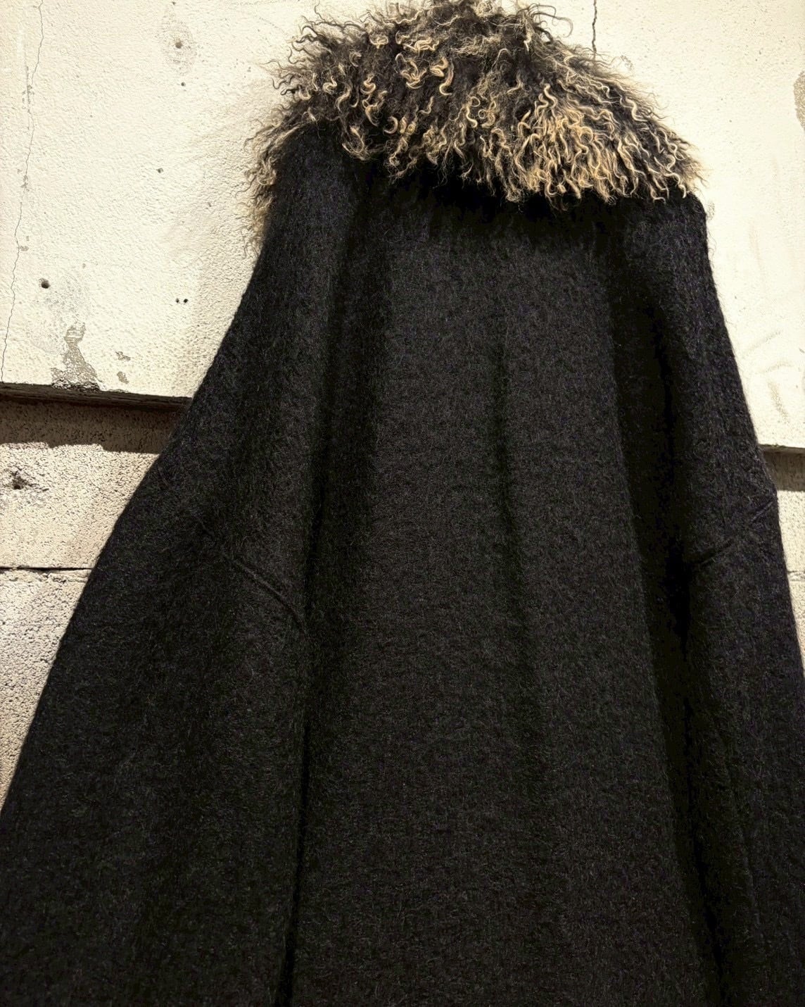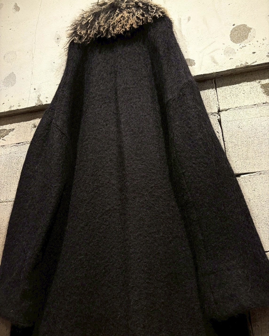 ボディにはしっかりとしたウール素材を採用。程よい厚みと起毛感があり、着用時に自然な落ち感とドレープを生み出します。ロング丈ながら重たくなりすぎず、縦のラインが美しく出るシルエットが印象的です。
