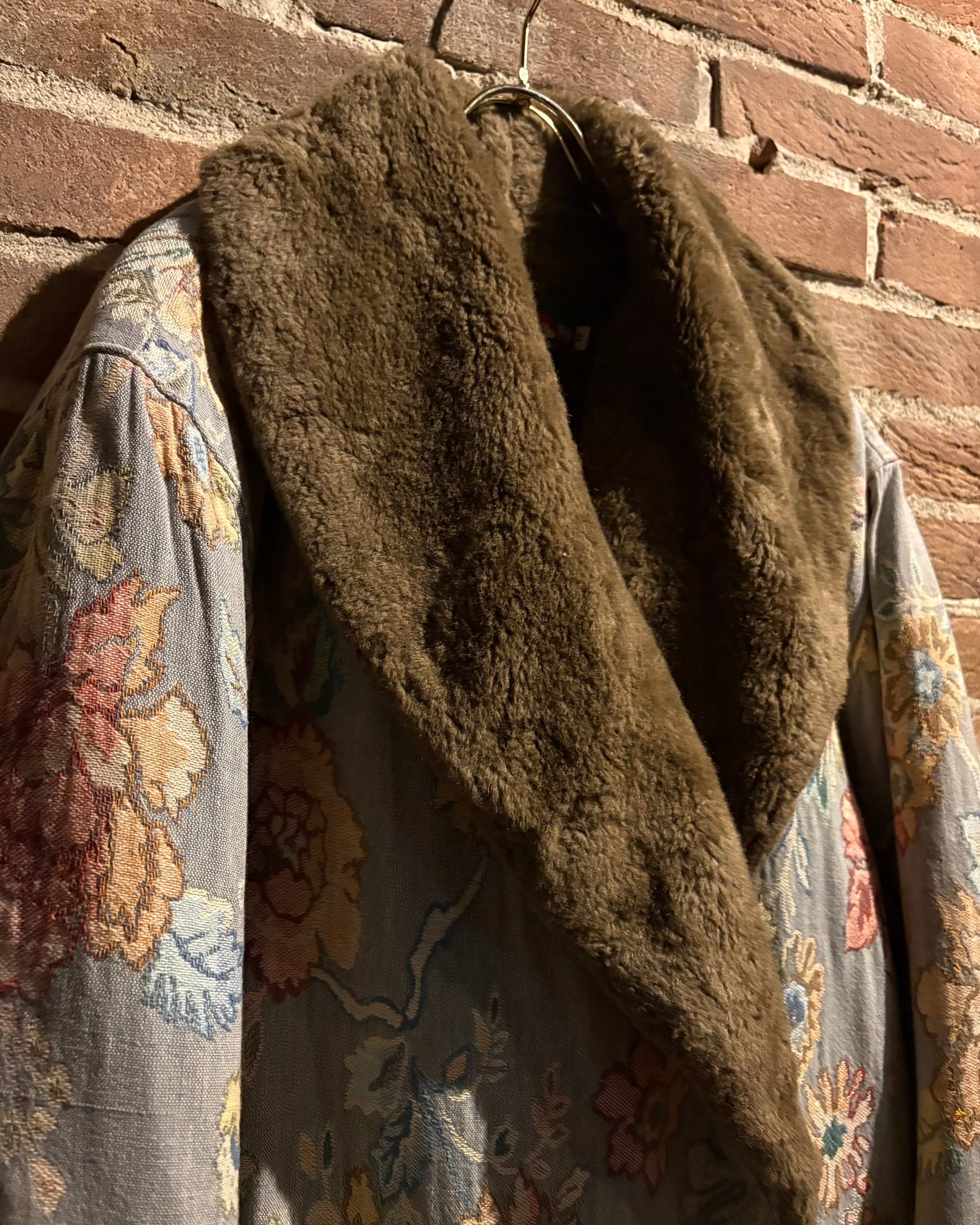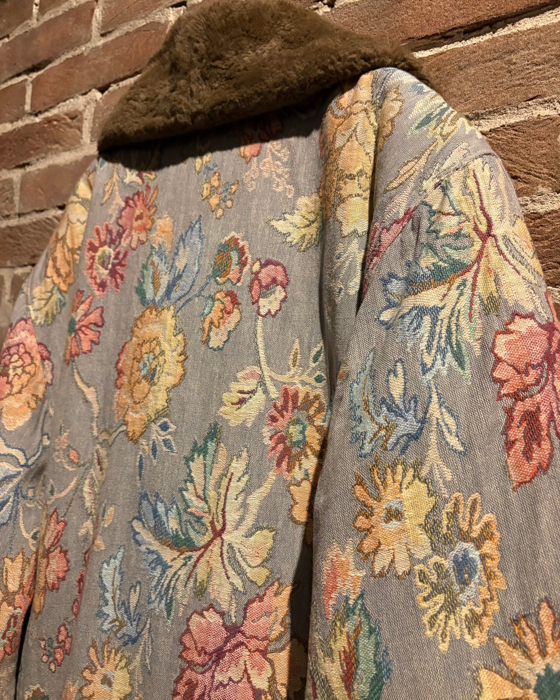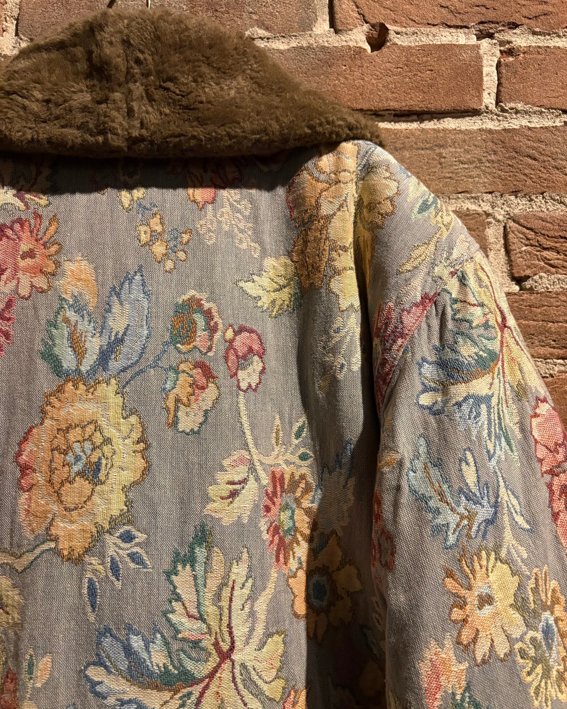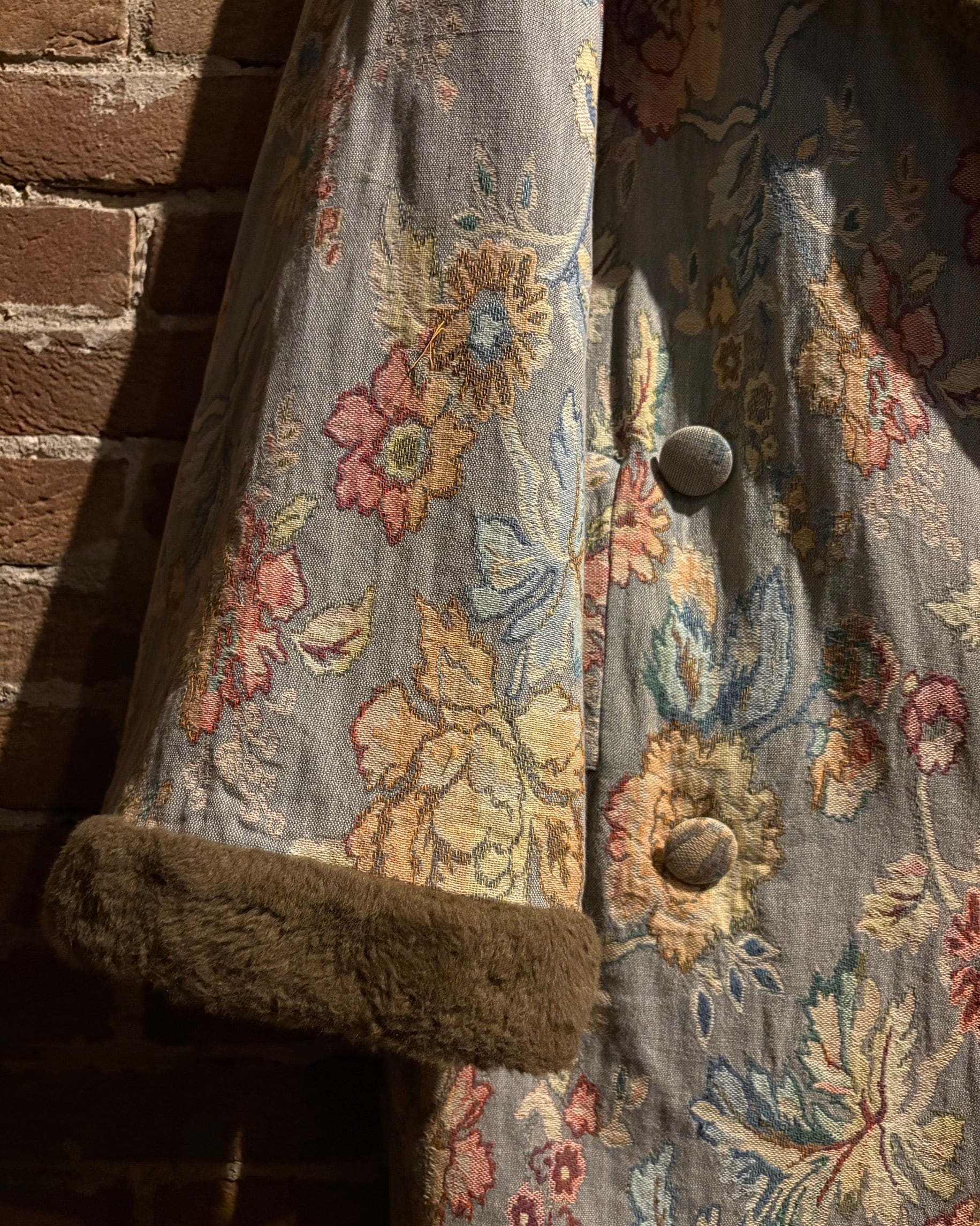 花柄ゴブランの奥行きある表情と、重厚感のあるフェイクファーの襟が印象的なコート。