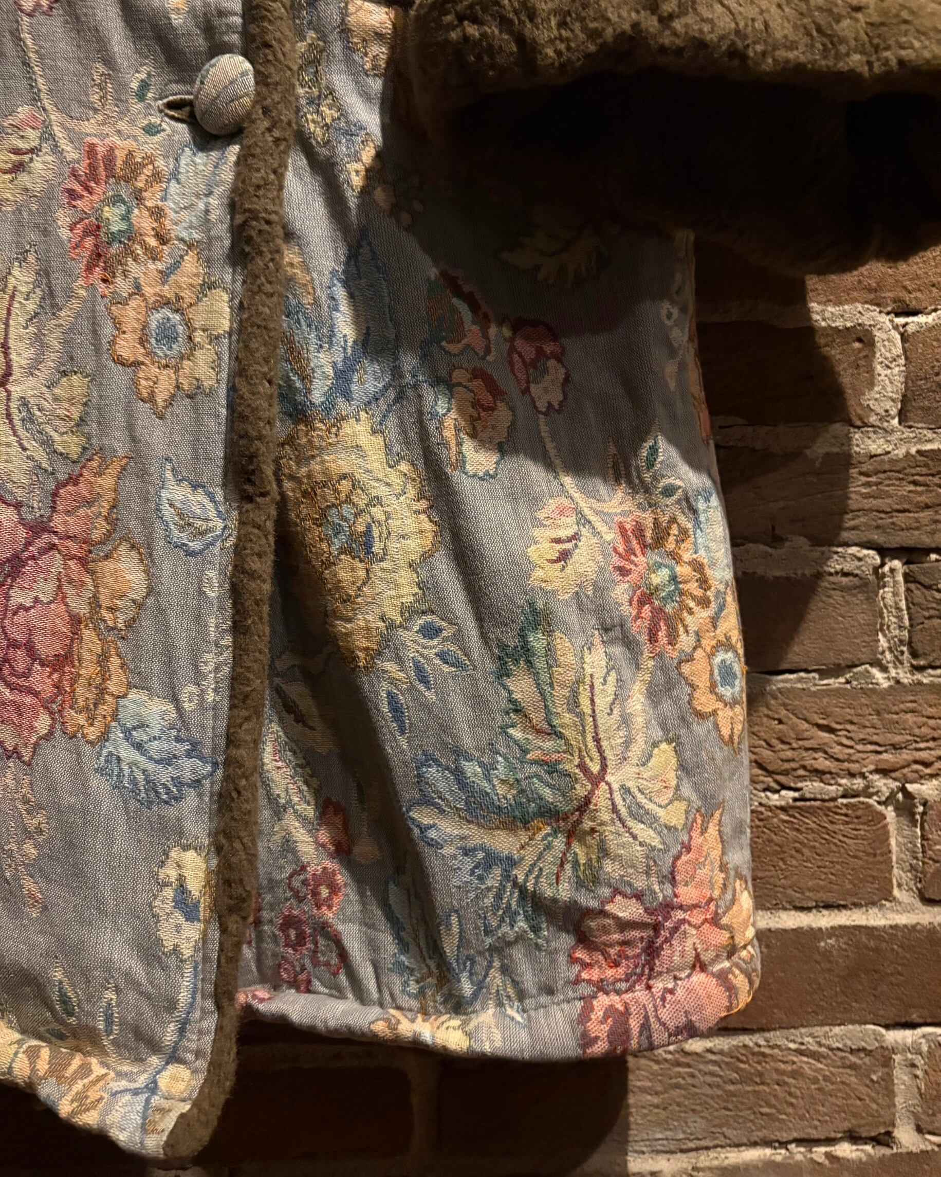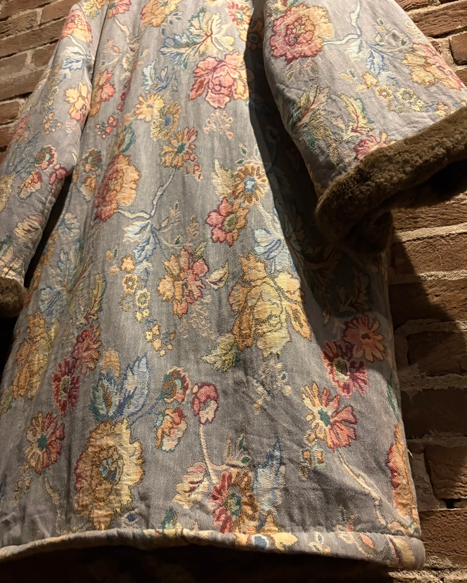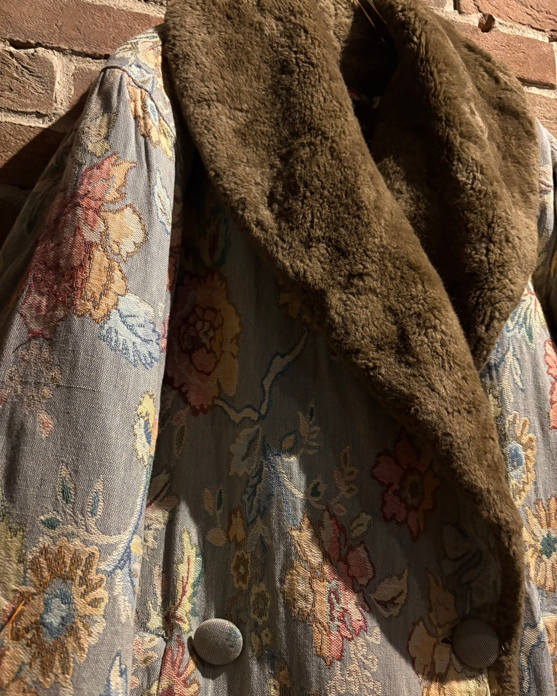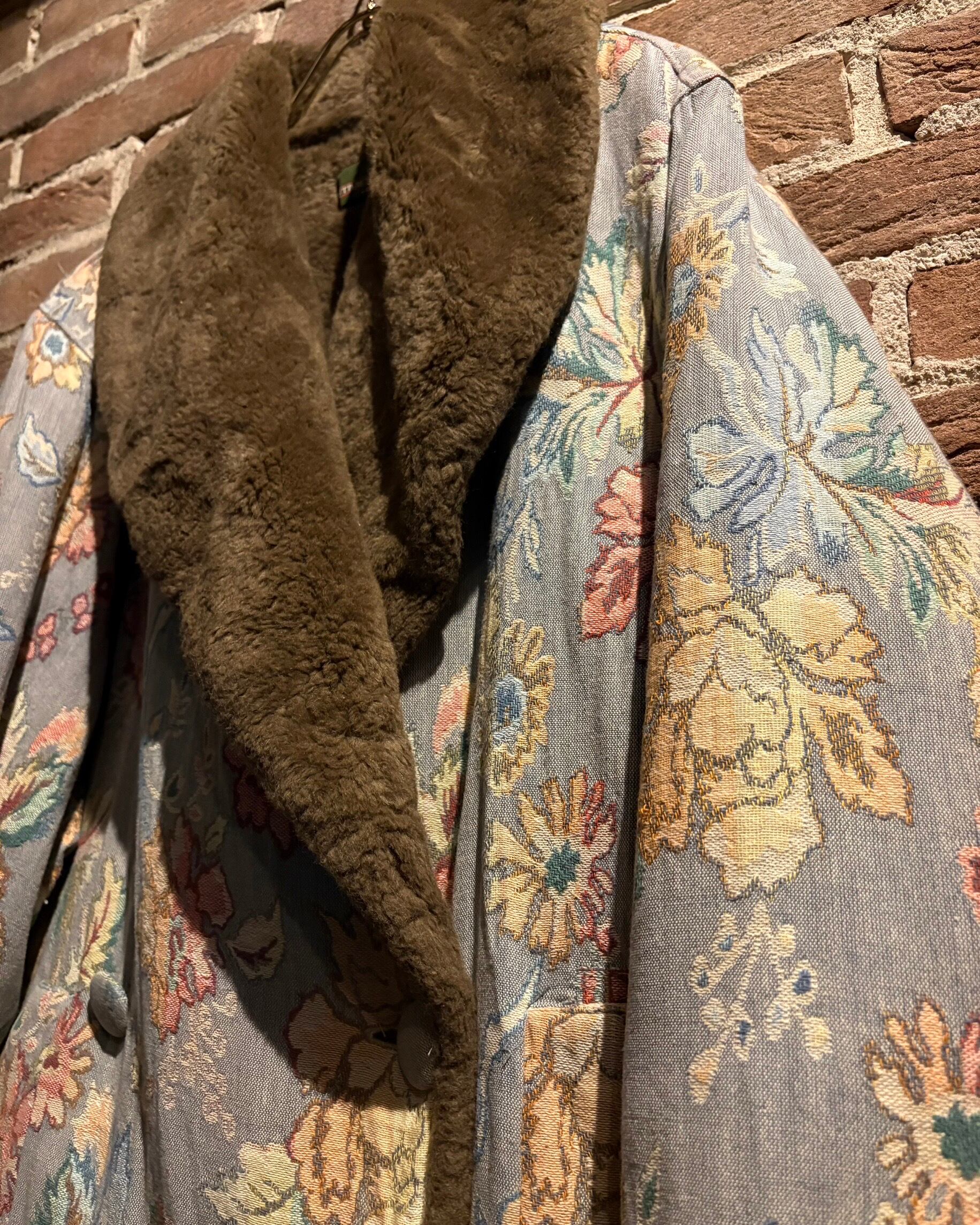 花柄ゴブランの奥行きある表情と、重厚感のあるフェイクファーの襟が印象的なコート。