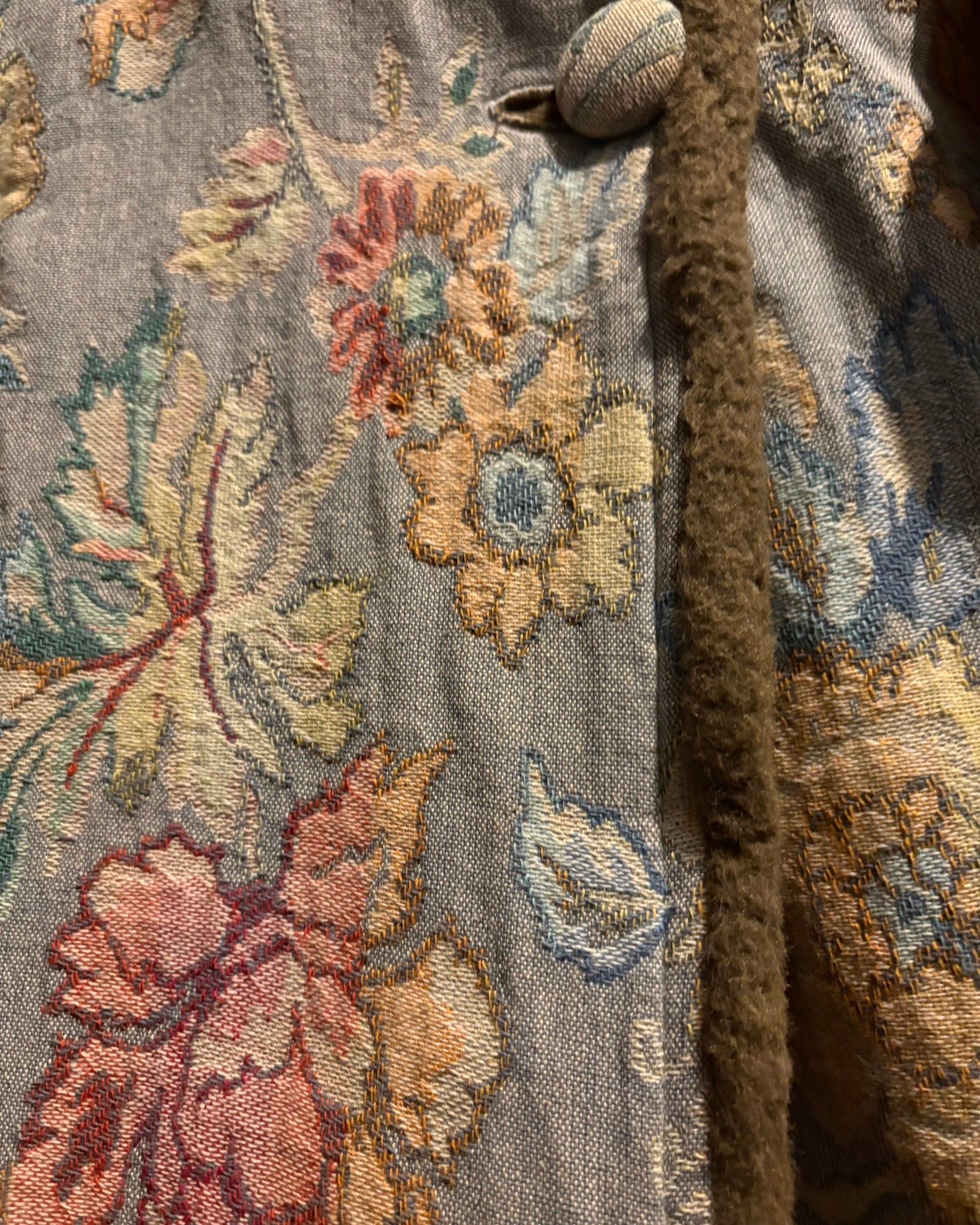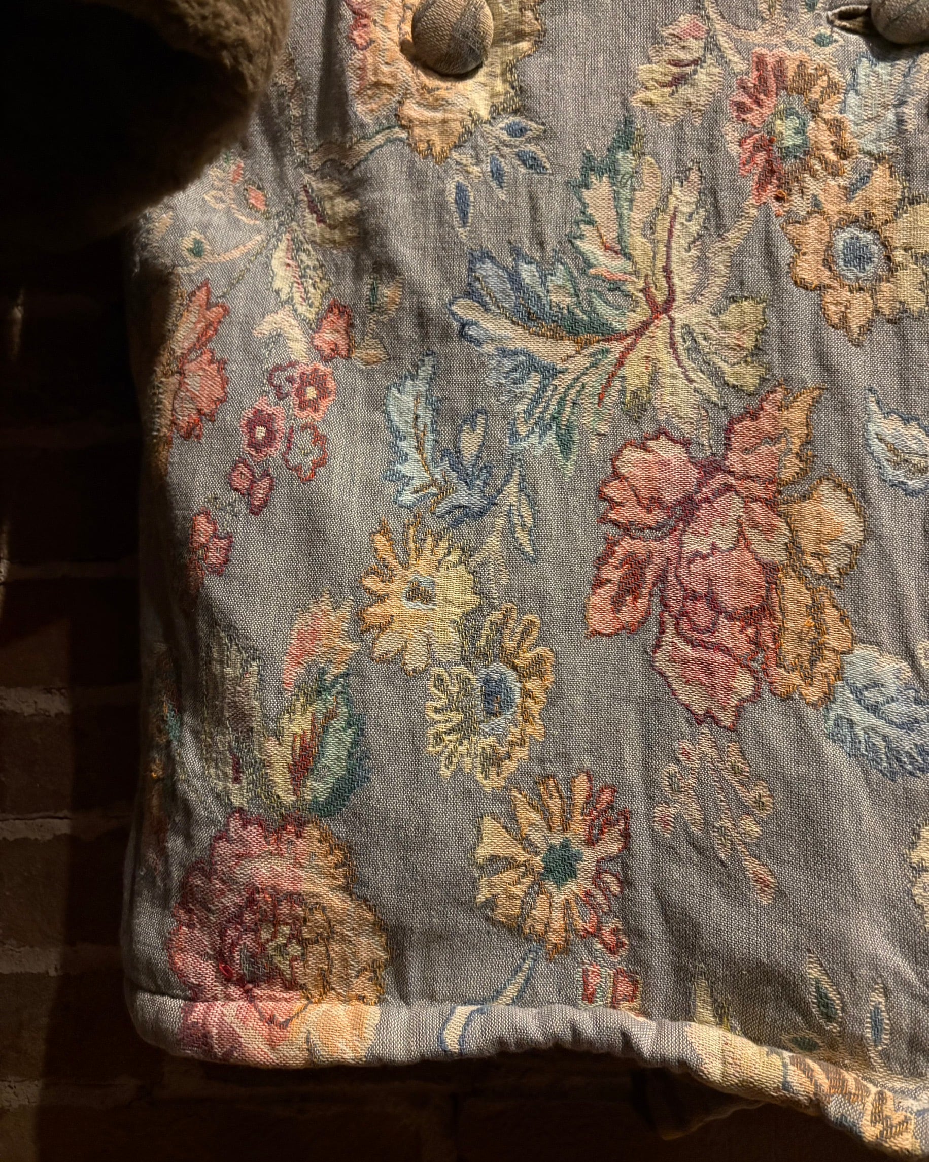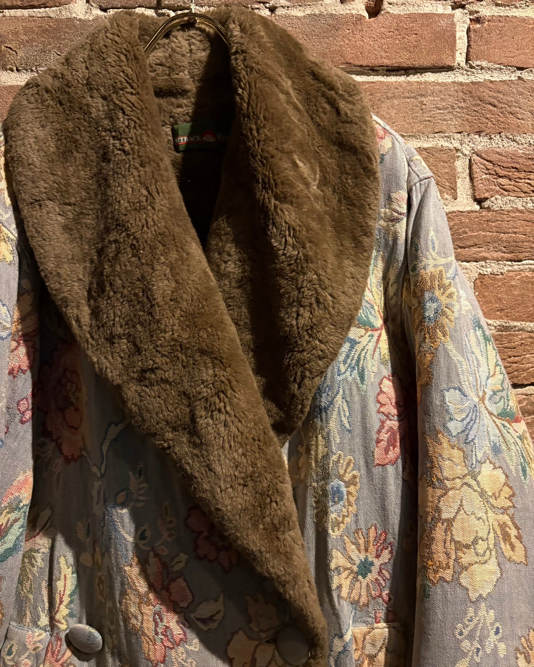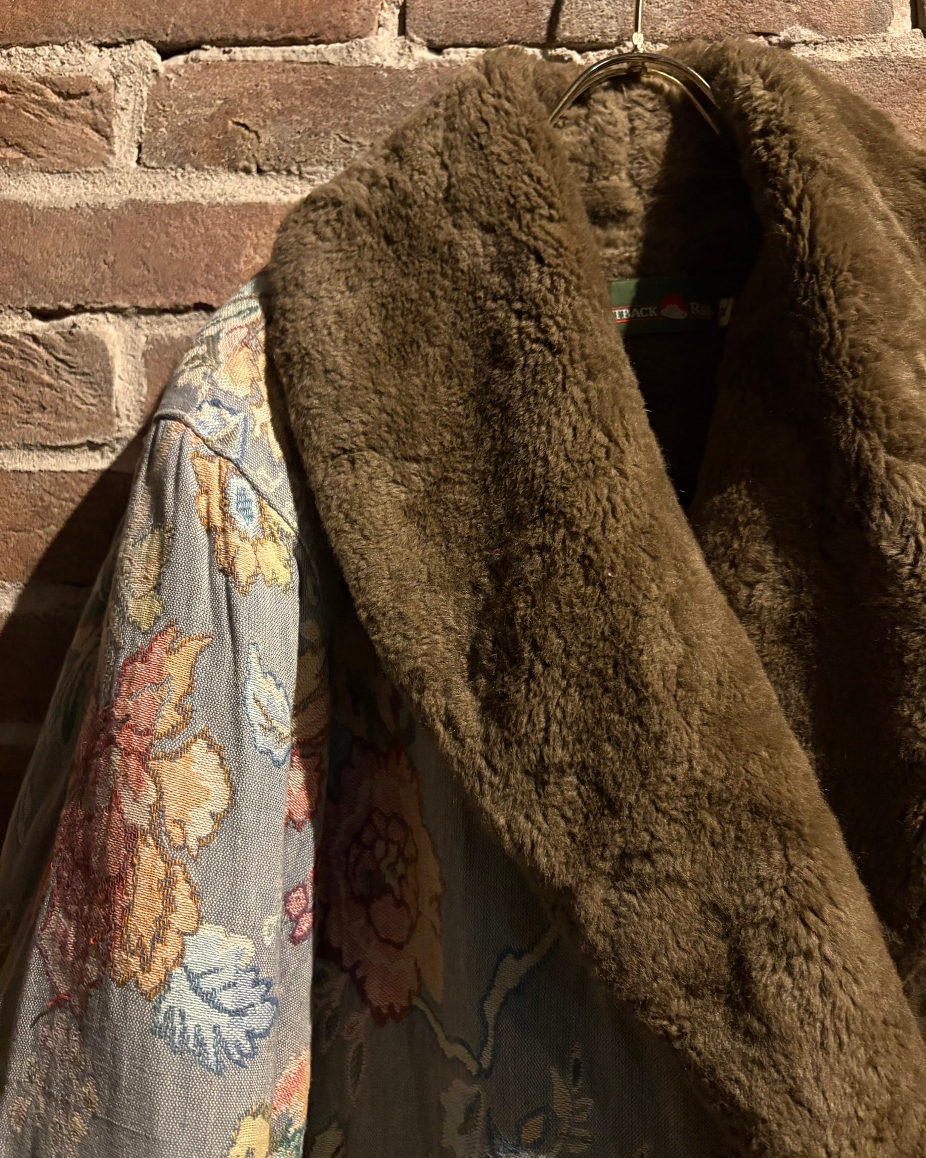 花柄ゴブランの奥行きある表情と、重厚感のあるフェイクファーの襟が印象的なコート。