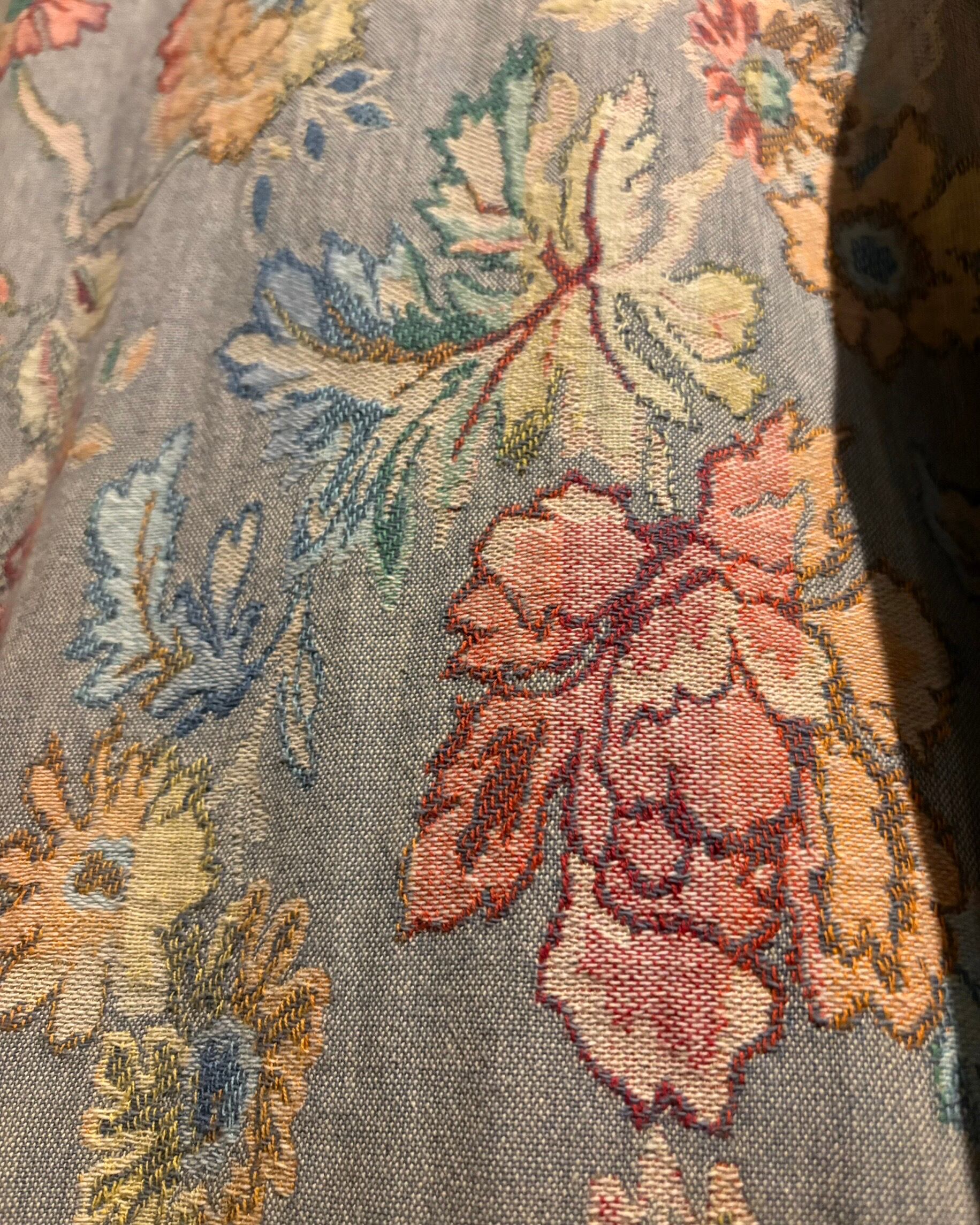 織りで表現されたフラワーパターンのゴブランファブリックをベースに、プリントでは出せない立体感と色の重なりを実現。くすみがかったブルーグレーを基調に、多色使いの花柄が全面に広がる、非常にムードのある仕上がりです。