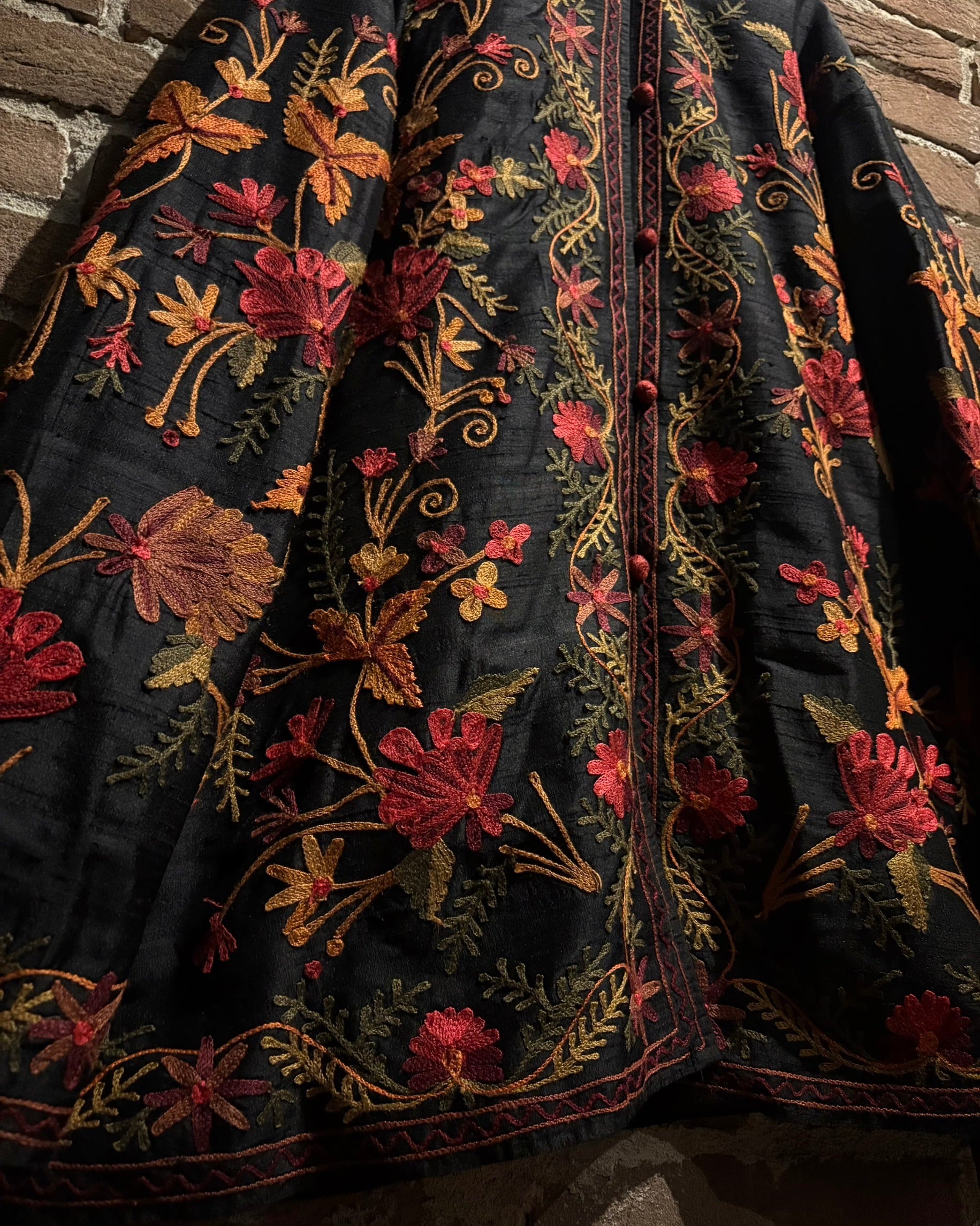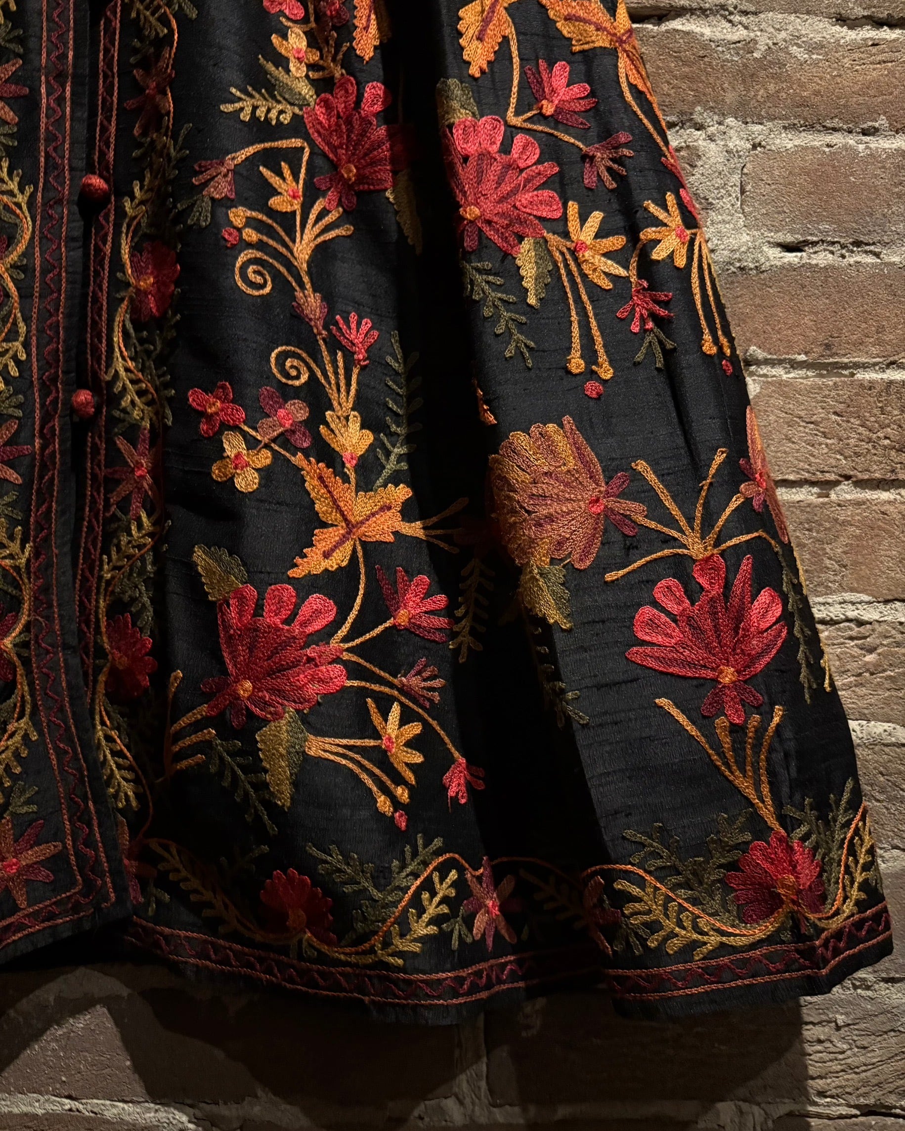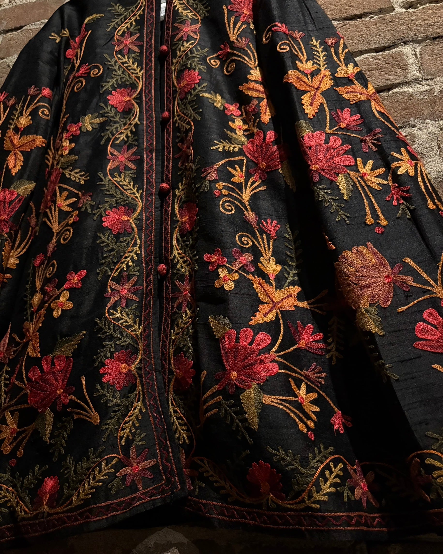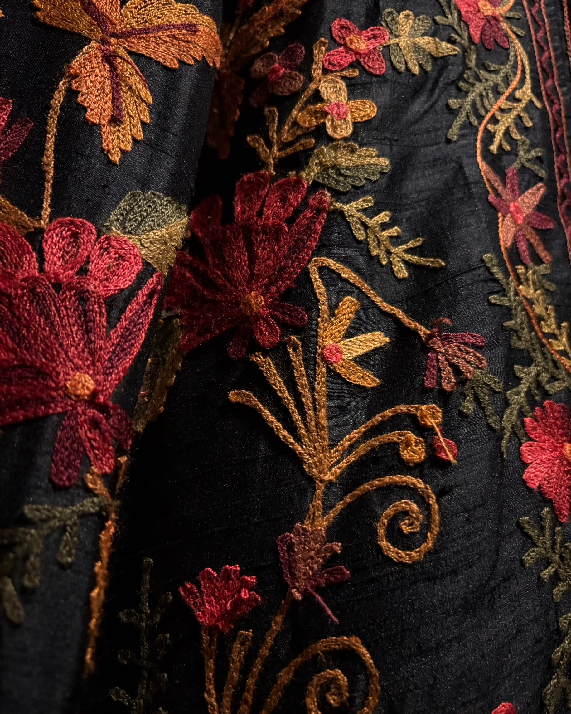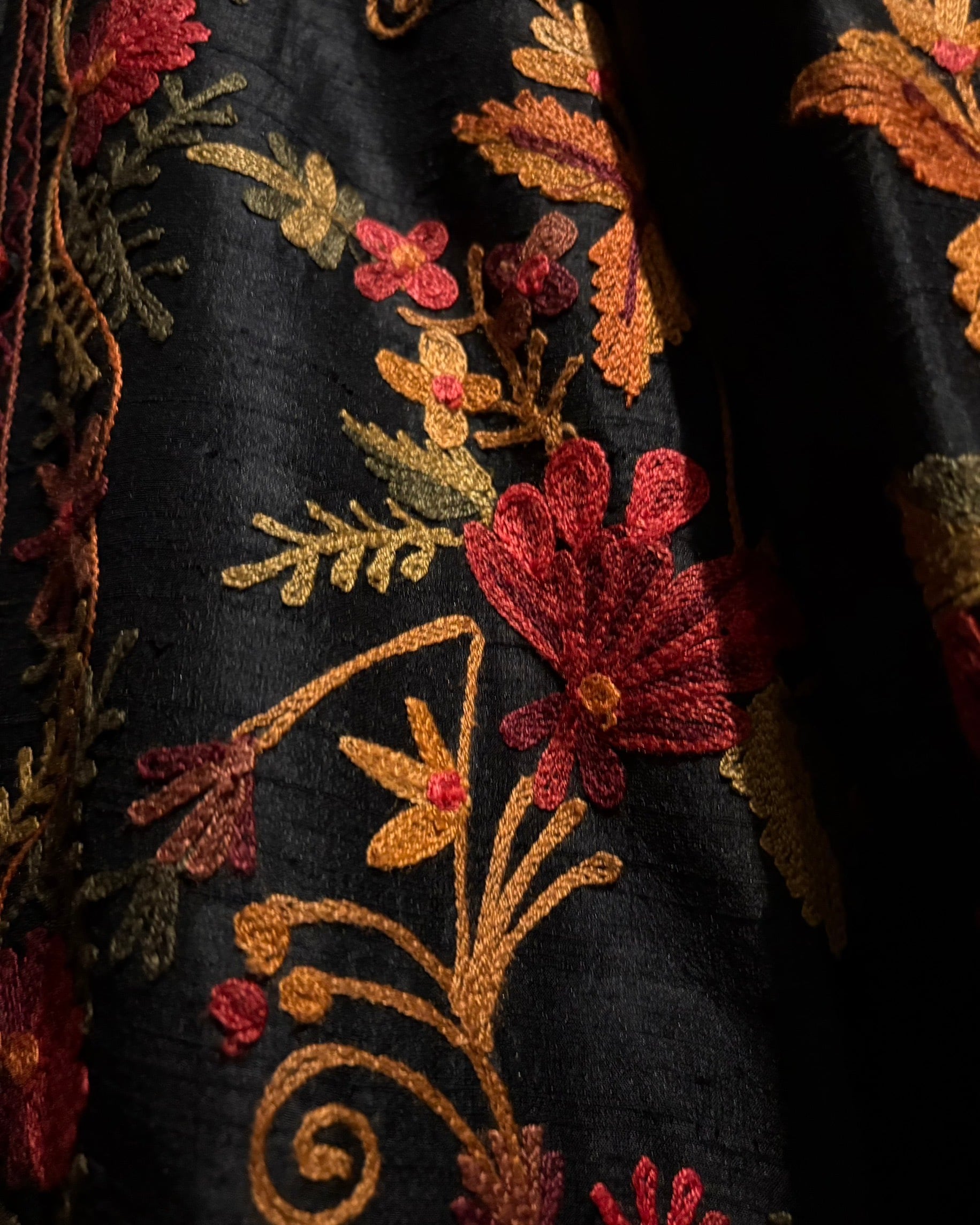 ボディにはシルク100%のファブリックを採用。ほんのりとした艶と軽やかさを備え、ブラックベースに映えるレッド、オレンジ、オリーブを中心とした多色使いの花刺繍が、全体に奥行きと華やかさを与えています。