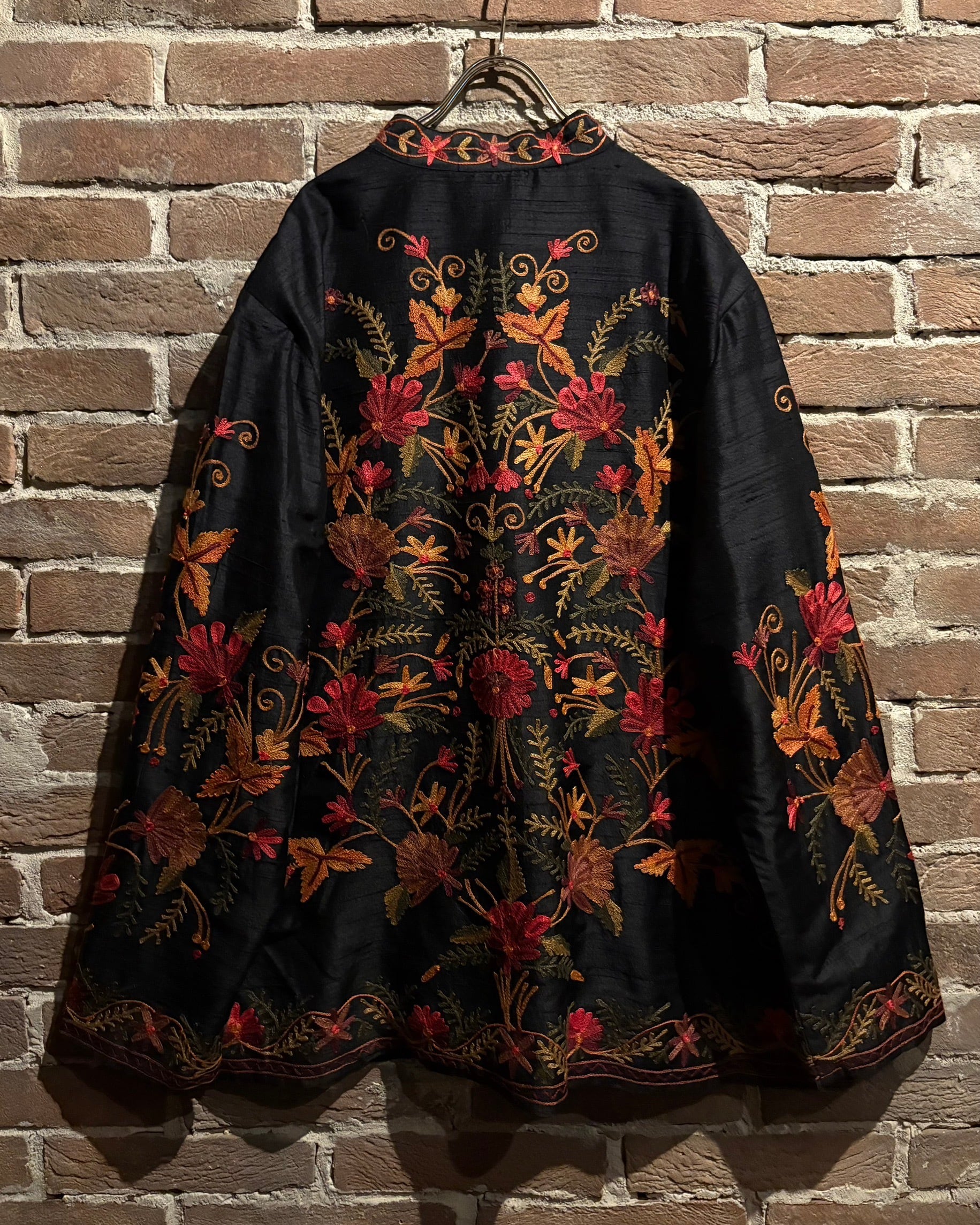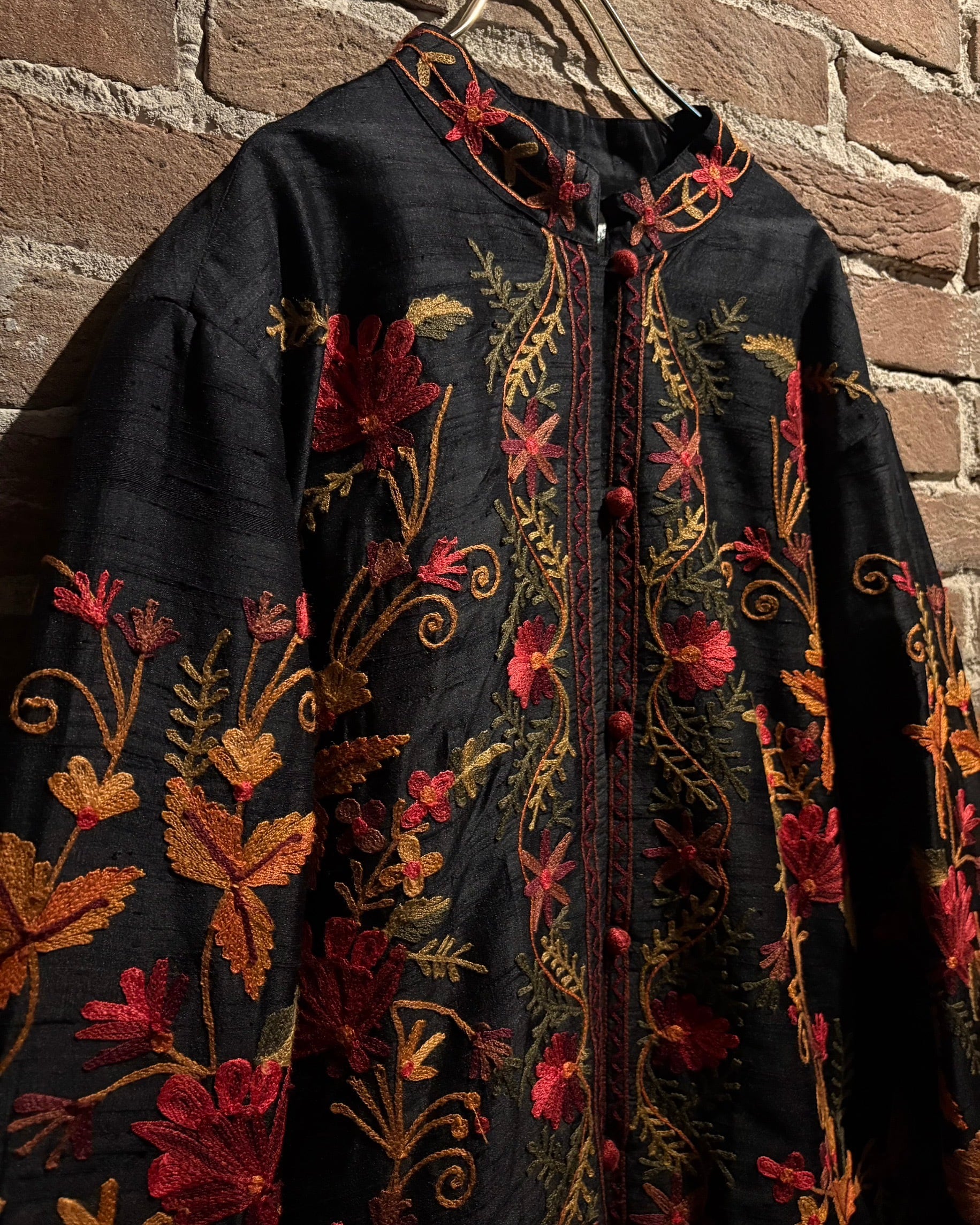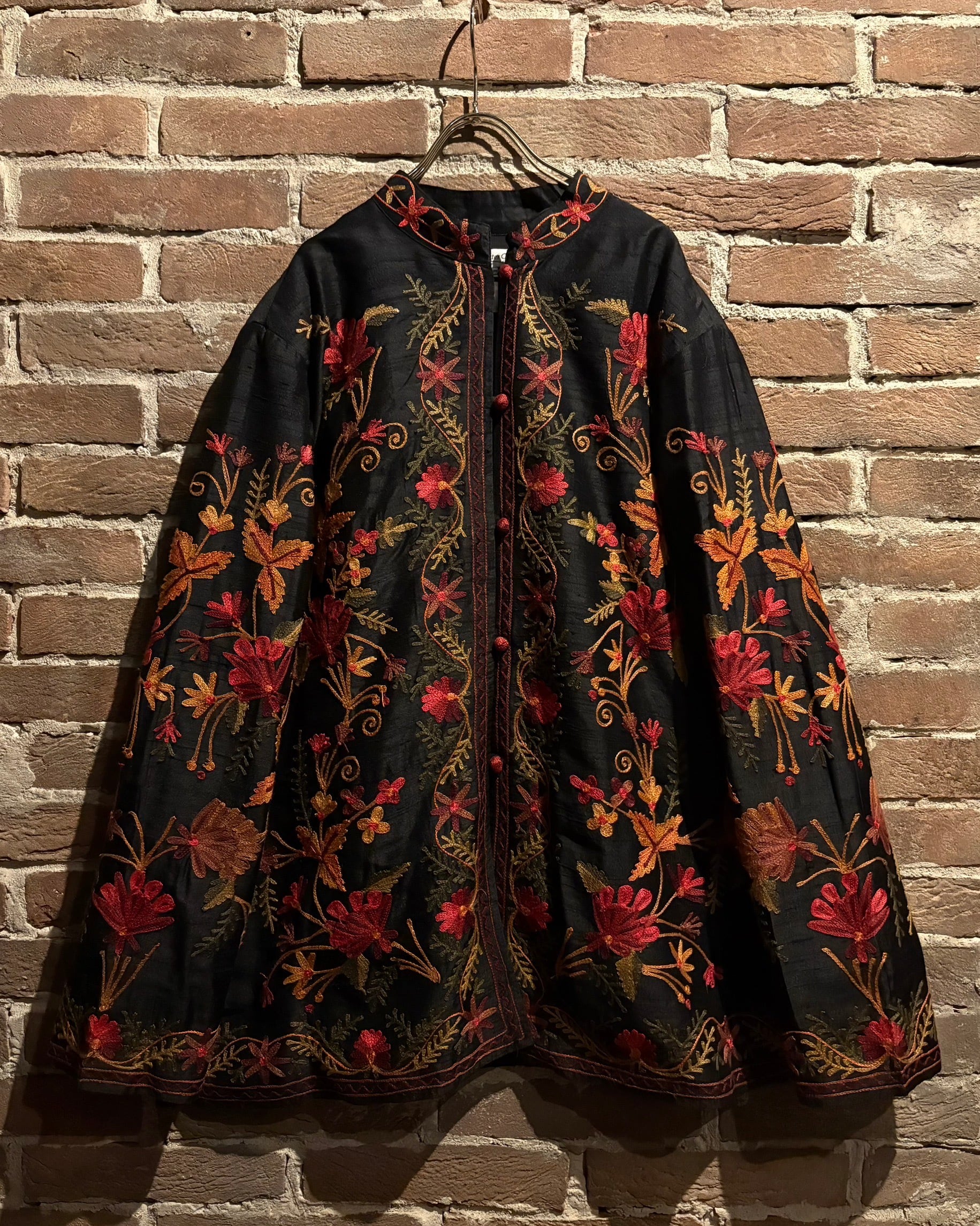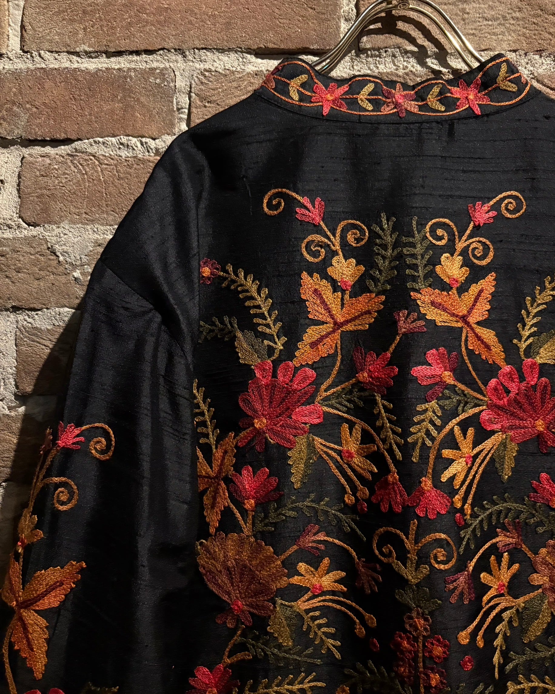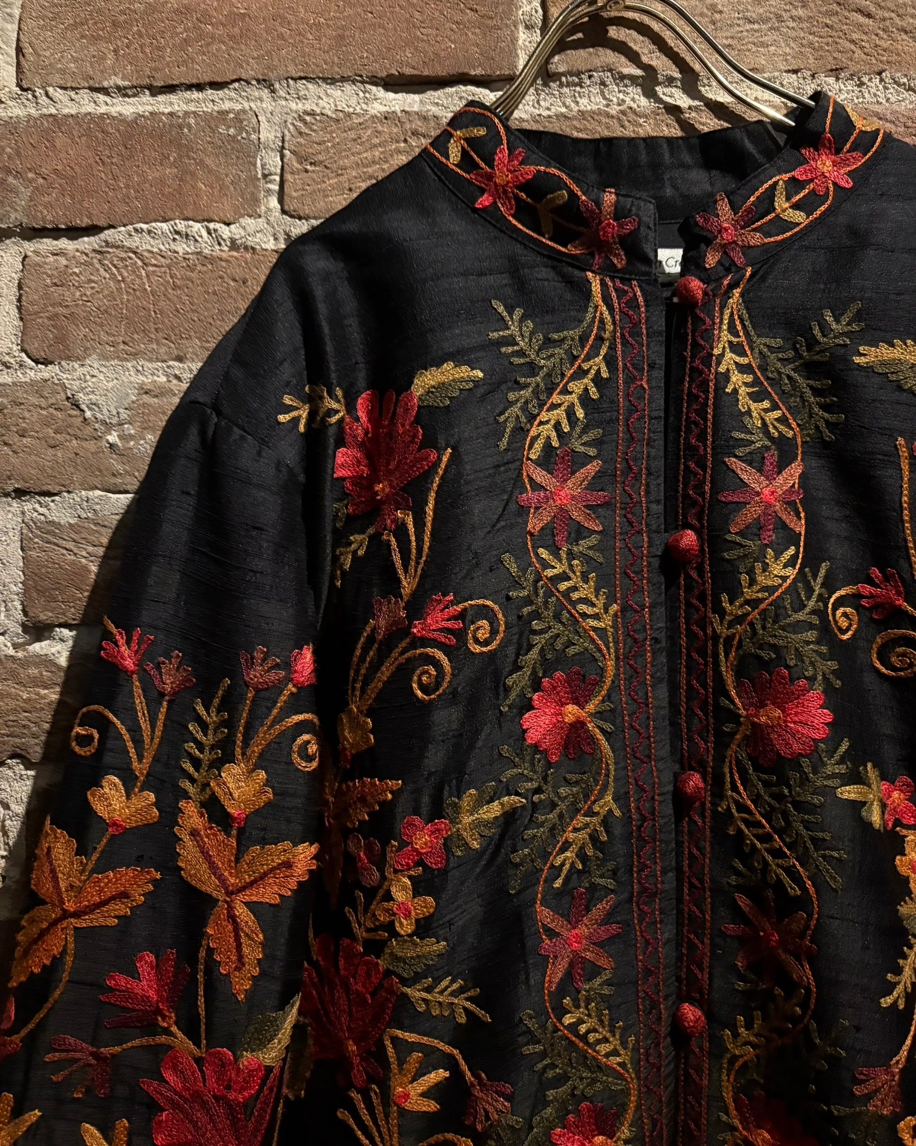 フロントから袖、バックに至るまで贅沢に施された刺繍は、ハンドクラフトさながらの立体感と密度。ネック周りや前立て、裾のトリム刺繍まで抜かりなく、羽織った際の完成度は非常に高い仕上がりです。ループボタンのアクセントも◎
