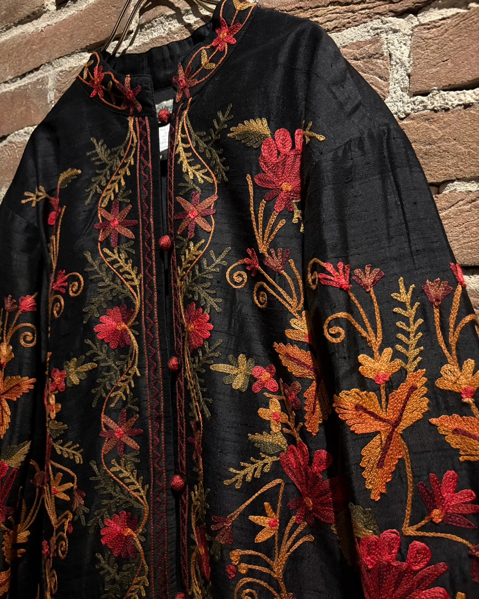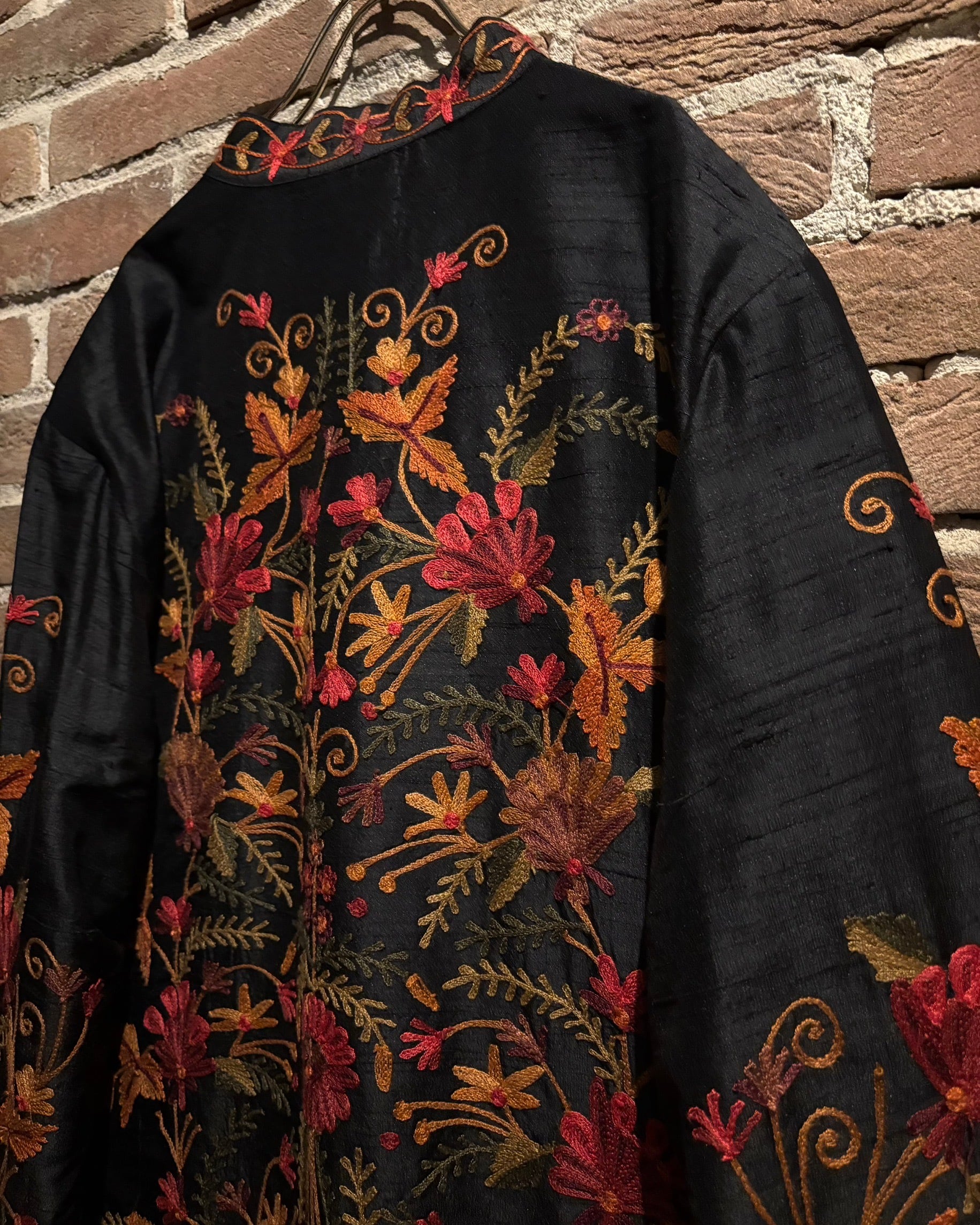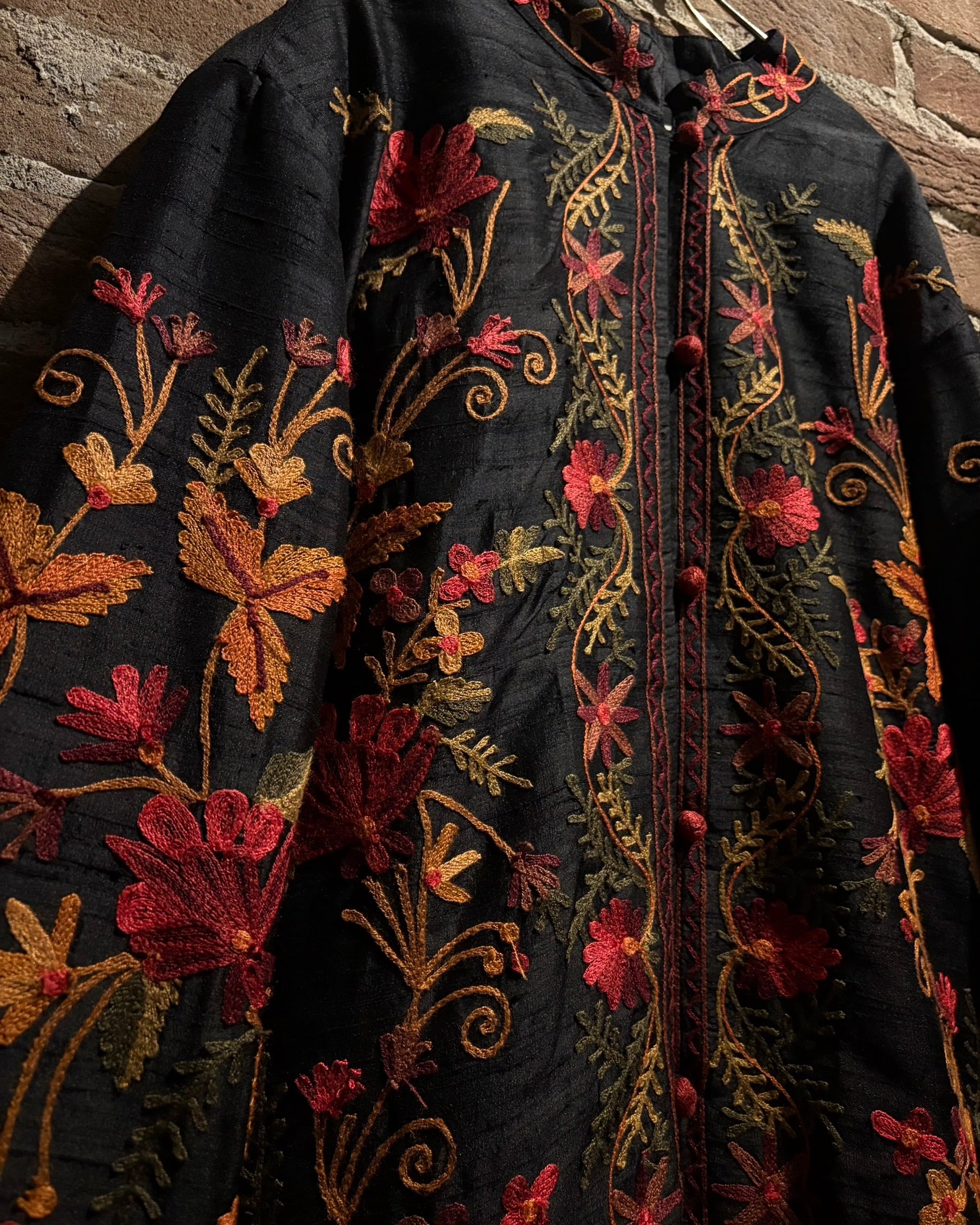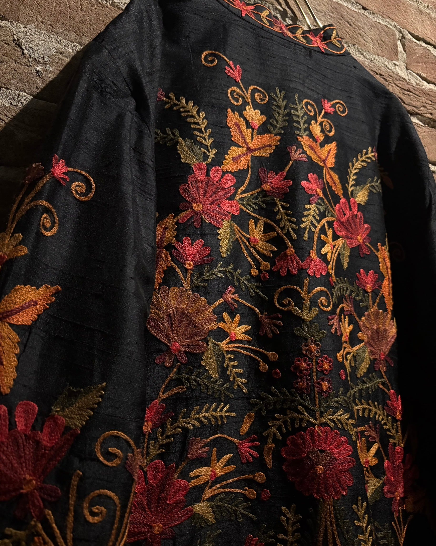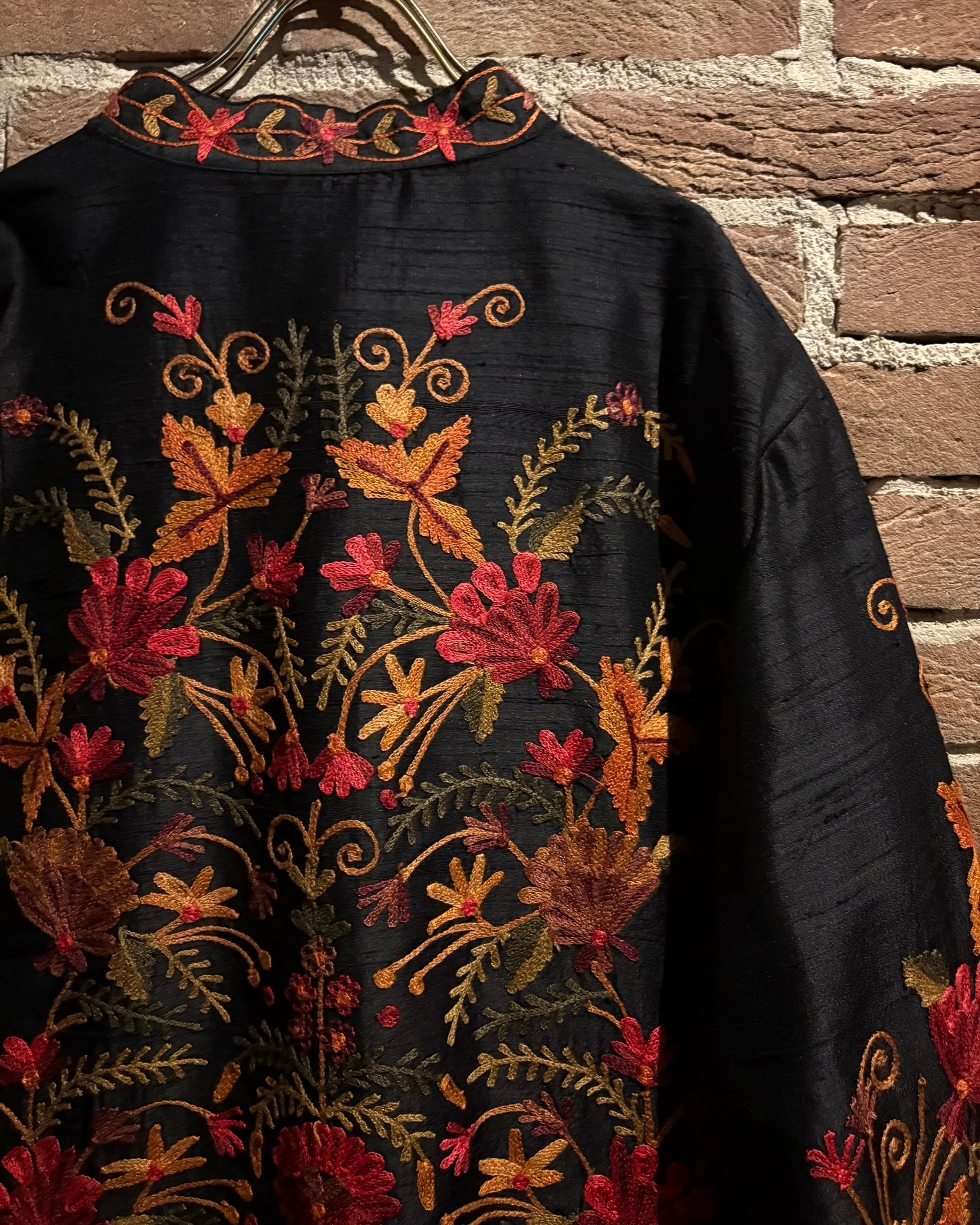 フロントから袖、バックに至るまで贅沢に施された刺繍は、ハンドクラフトさながらの立体感と密度。ネック周りや前立て、裾のトリム刺繍まで抜かりなく、羽織った際の完成度は非常に高い仕上がりです。ループボタンのアクセントも◎