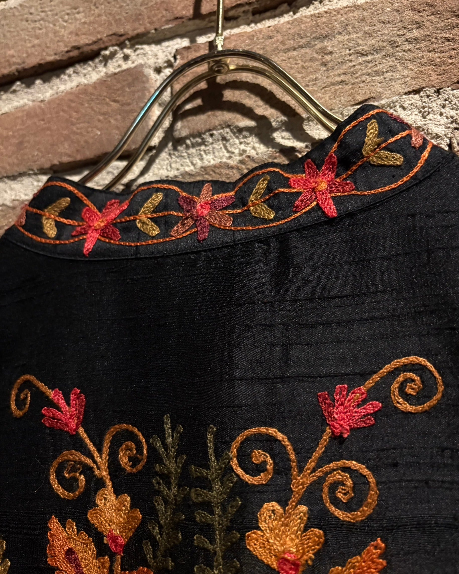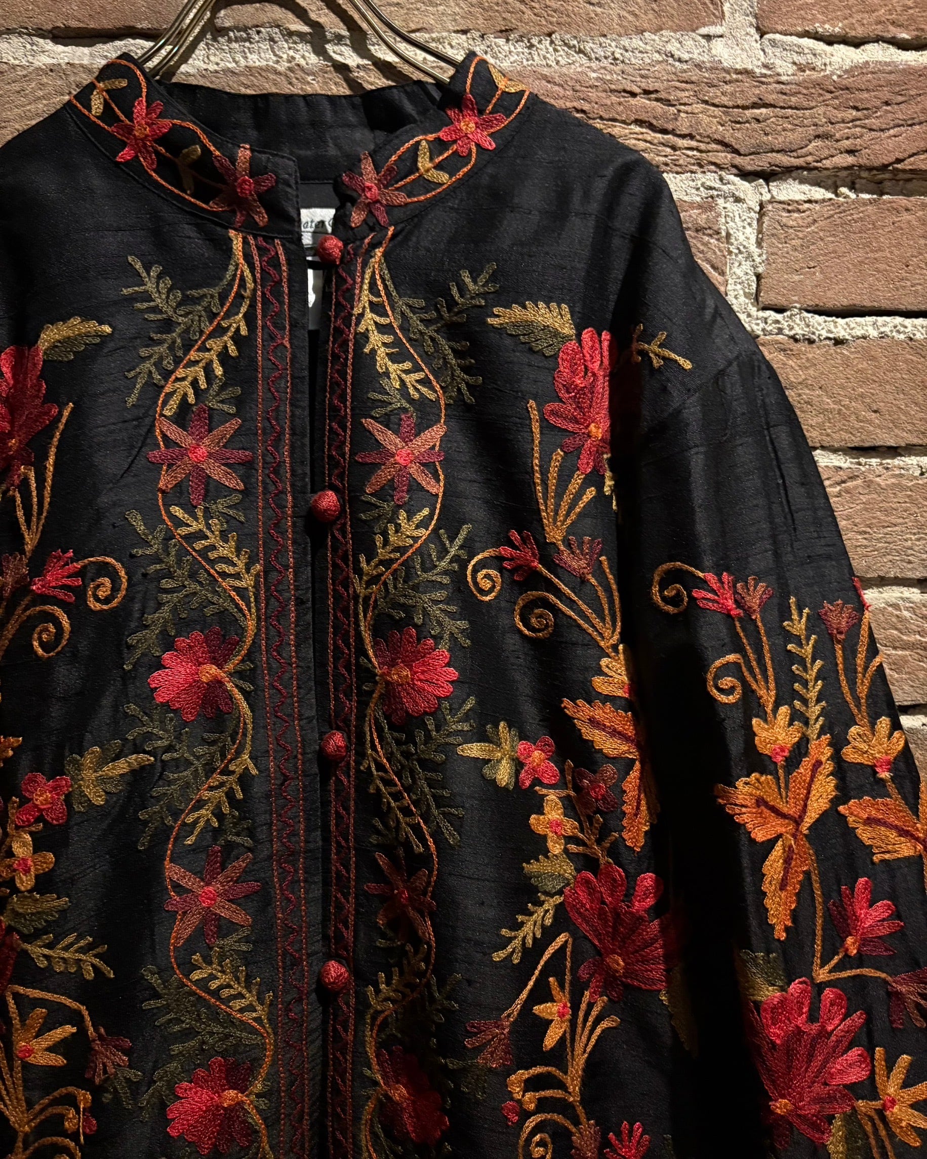 大胆かつ緻密な刺繍が圧倒的な存在感を放つ、スペシャルなヴィンテージシルクシャツジャケット。