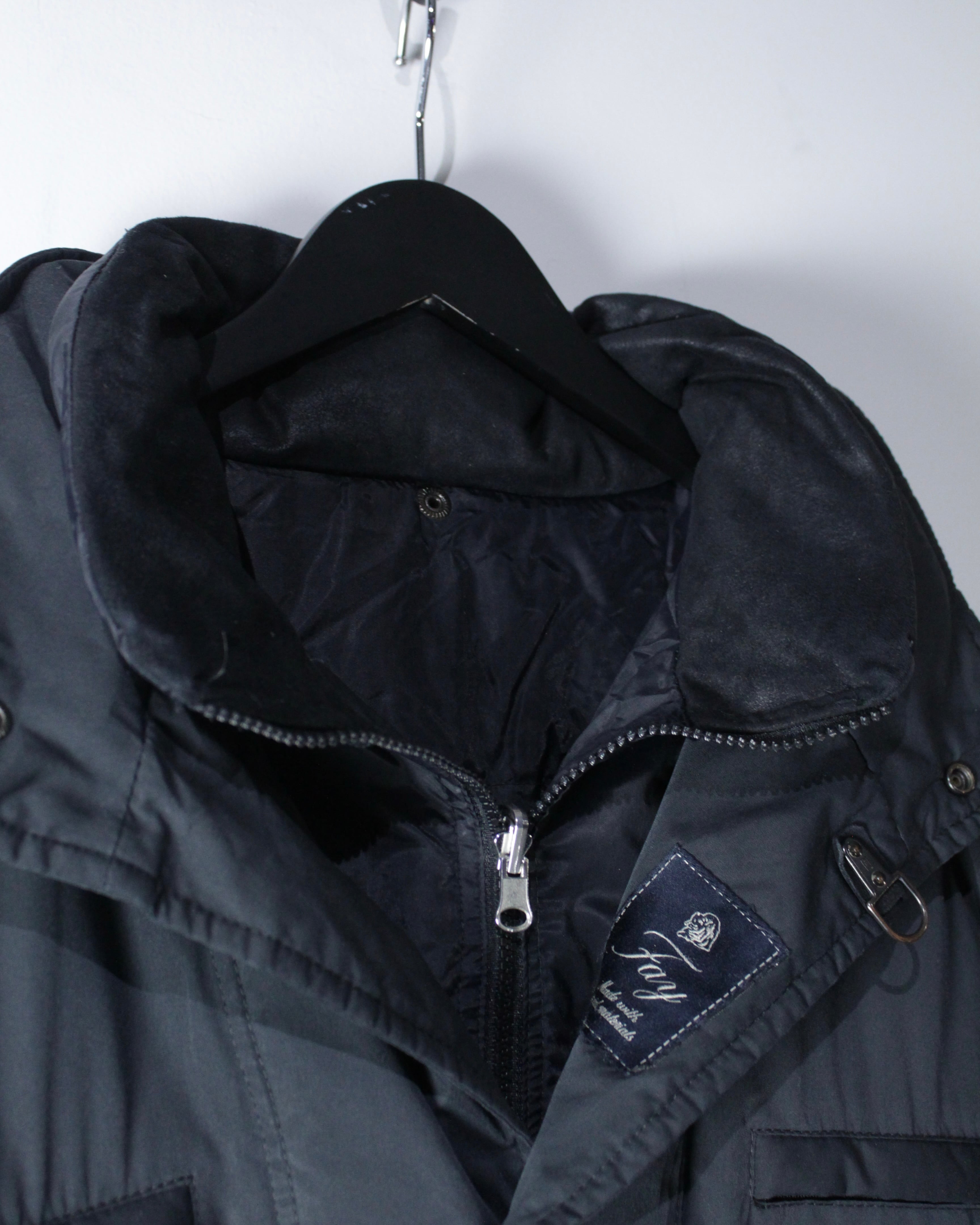 中にジップアップジャケットを着込んだかのようなレイヤード風のギミックが光る逸品。フロント内側にはジップアップ仕様を模した構造が組み込まれており、1着でレイヤードスタイルが完成する、非常にFayらしい遊び心と完成度を感じさせる仕上がりです。