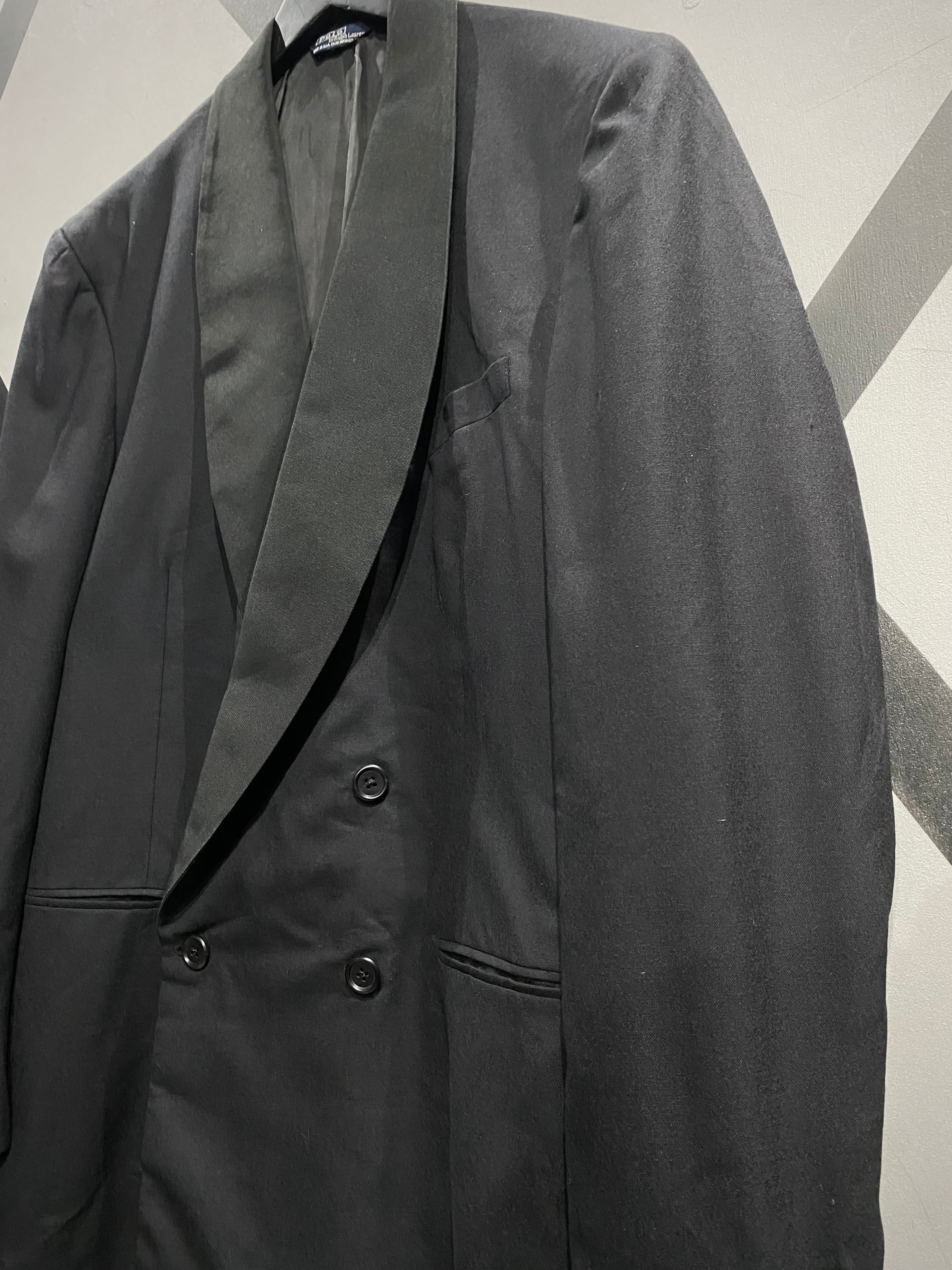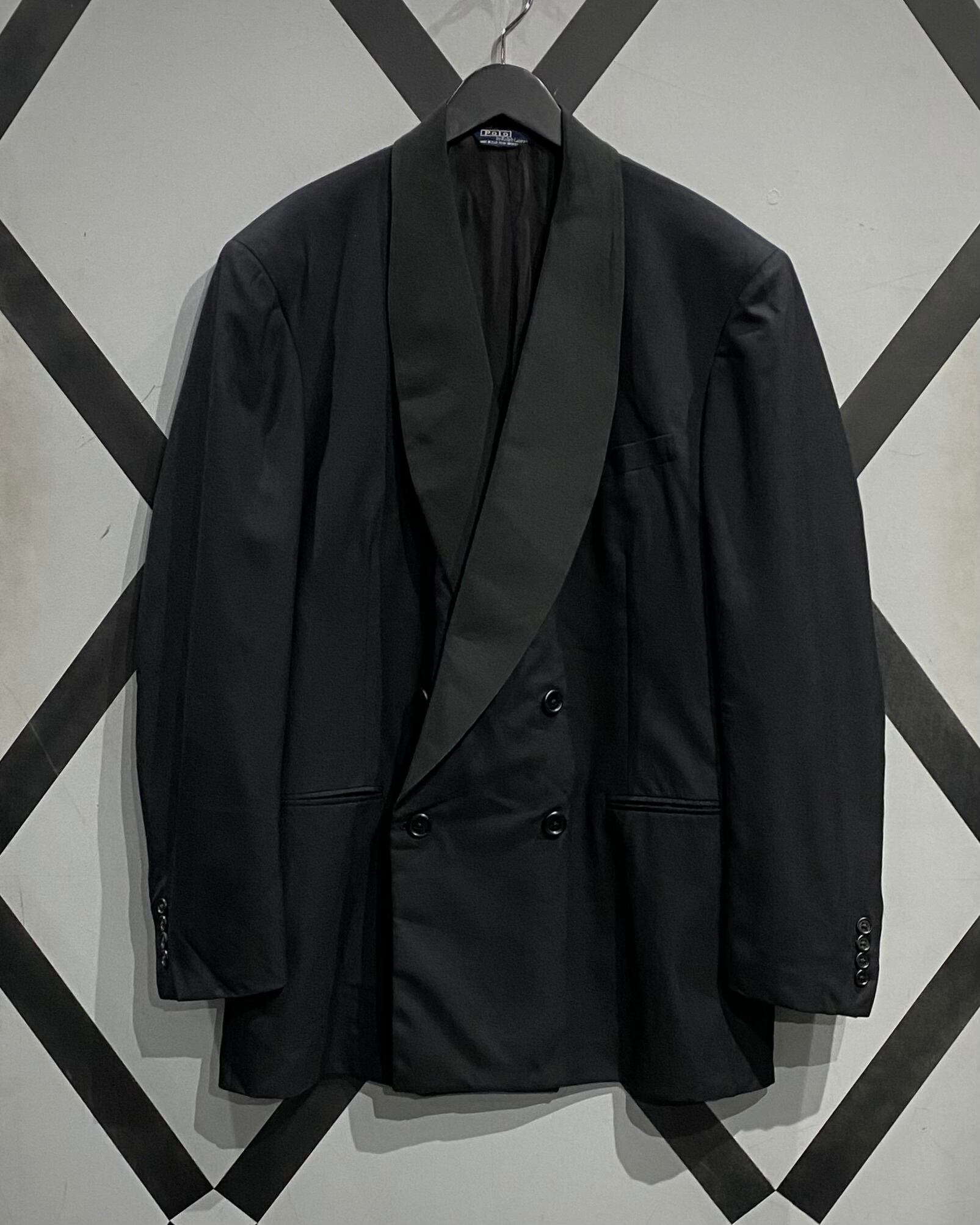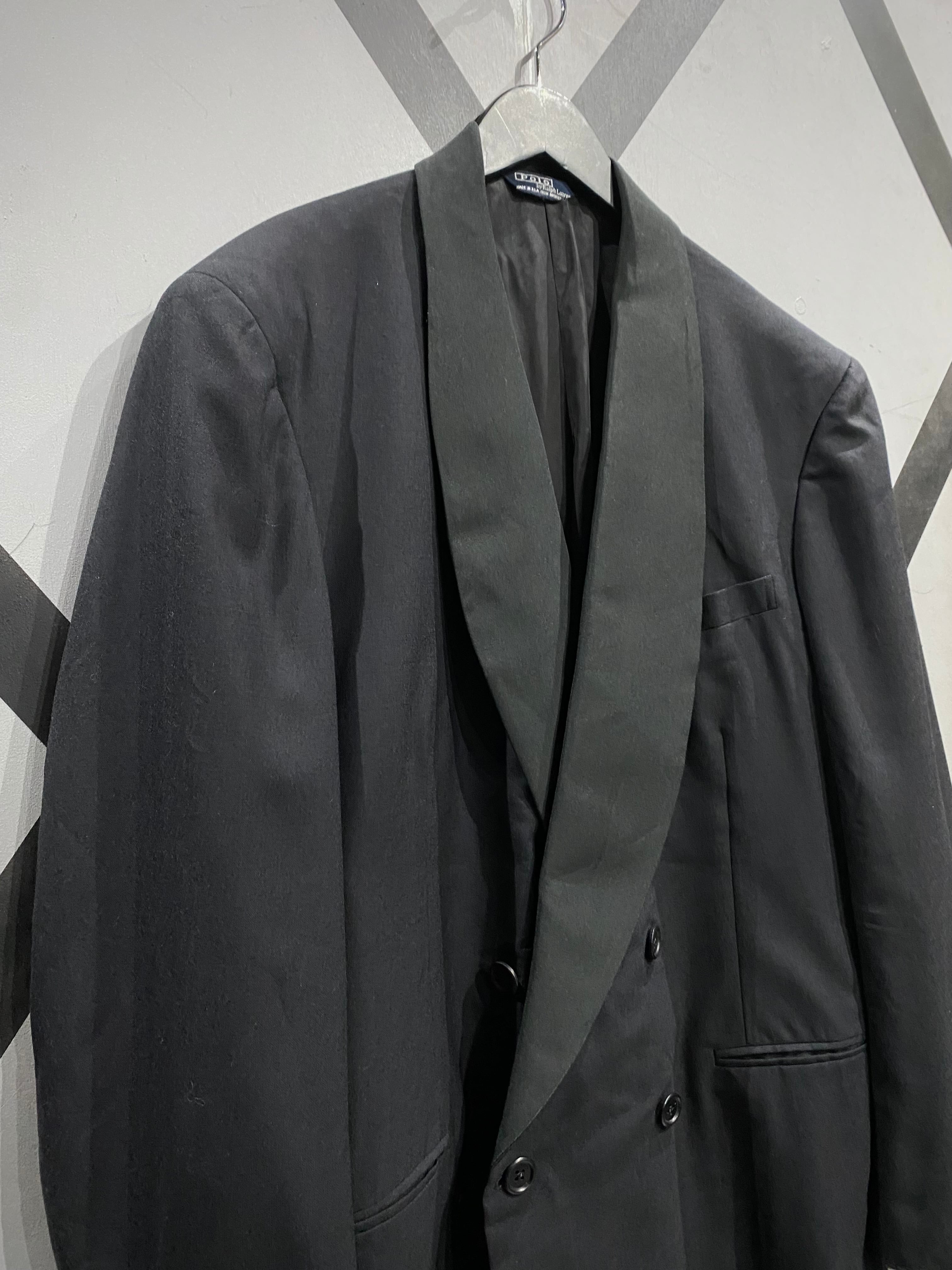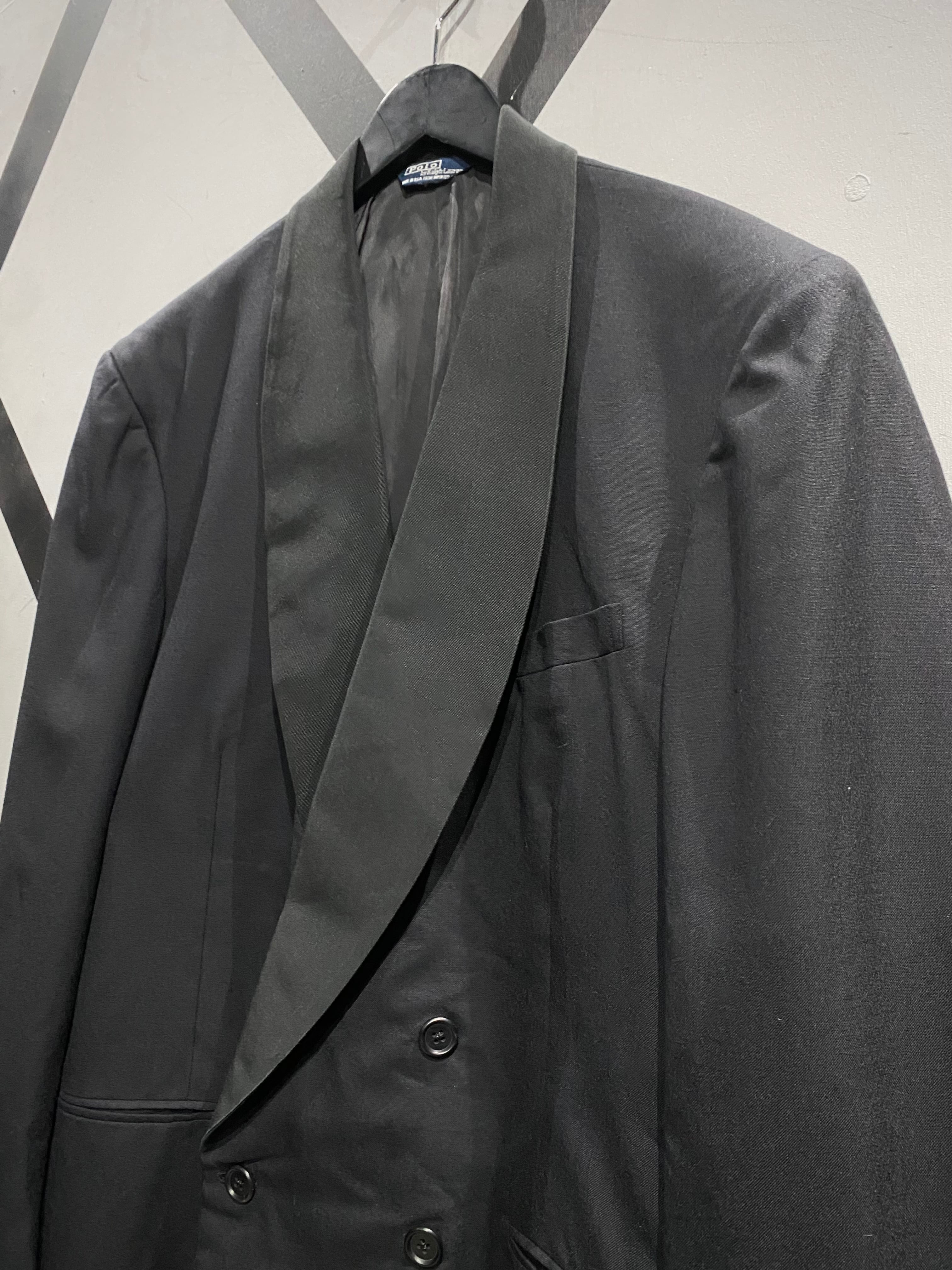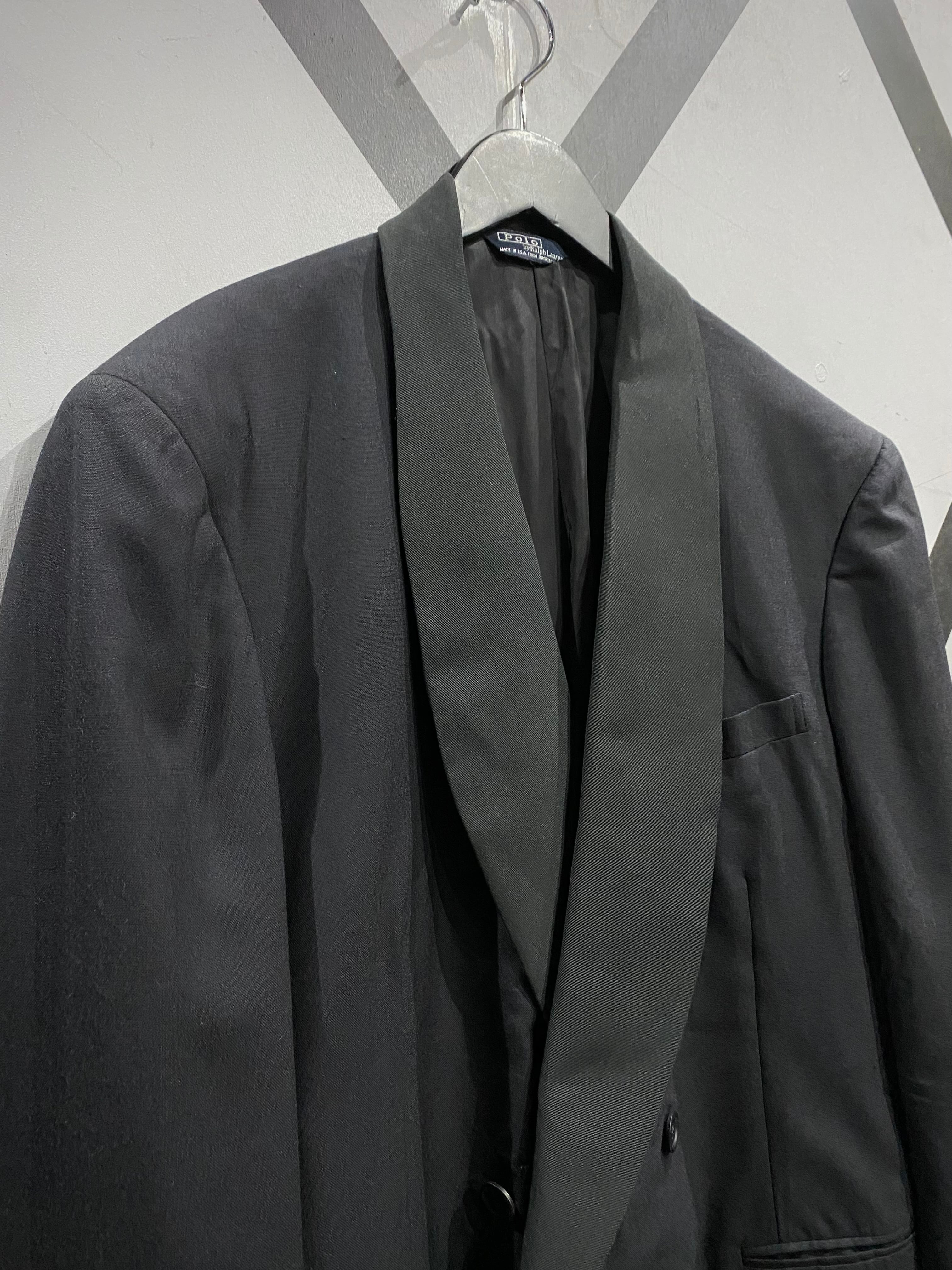 ブラックで統一されたソリッドな佇まいに、タキシード特有のショールカラーを採用。ラペルには程よい光沢感の切り替えが施され、フォーマルな品格とラルフローレンらしいクラシックさが融合しています。