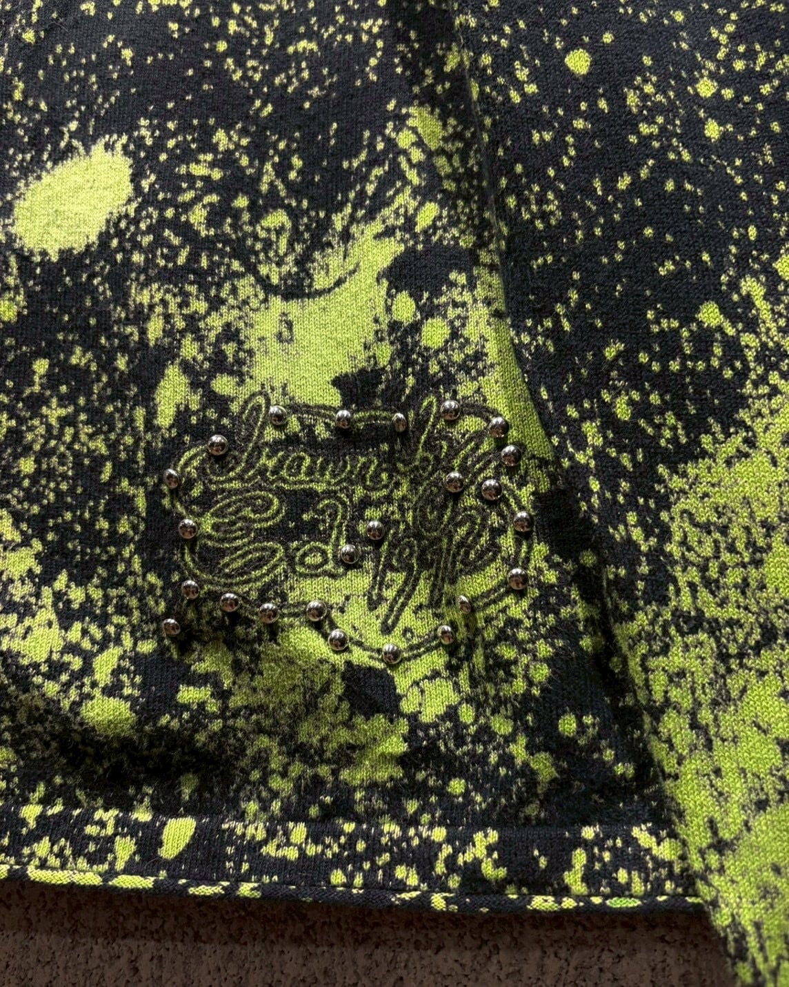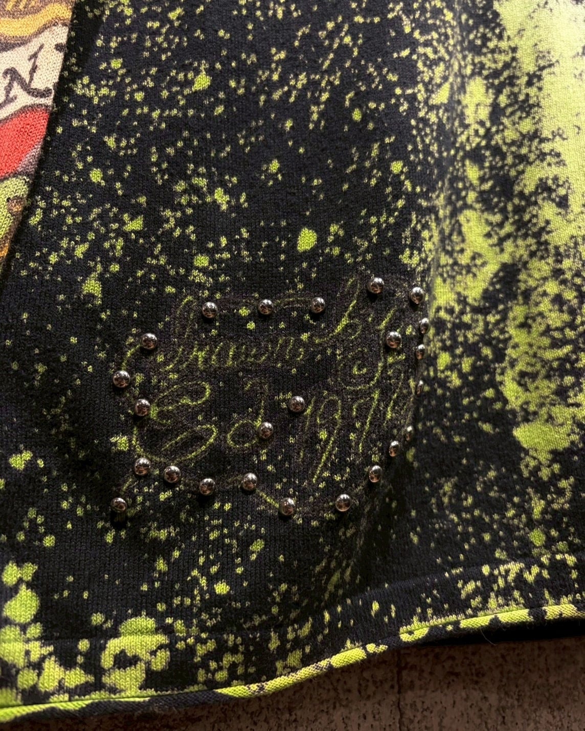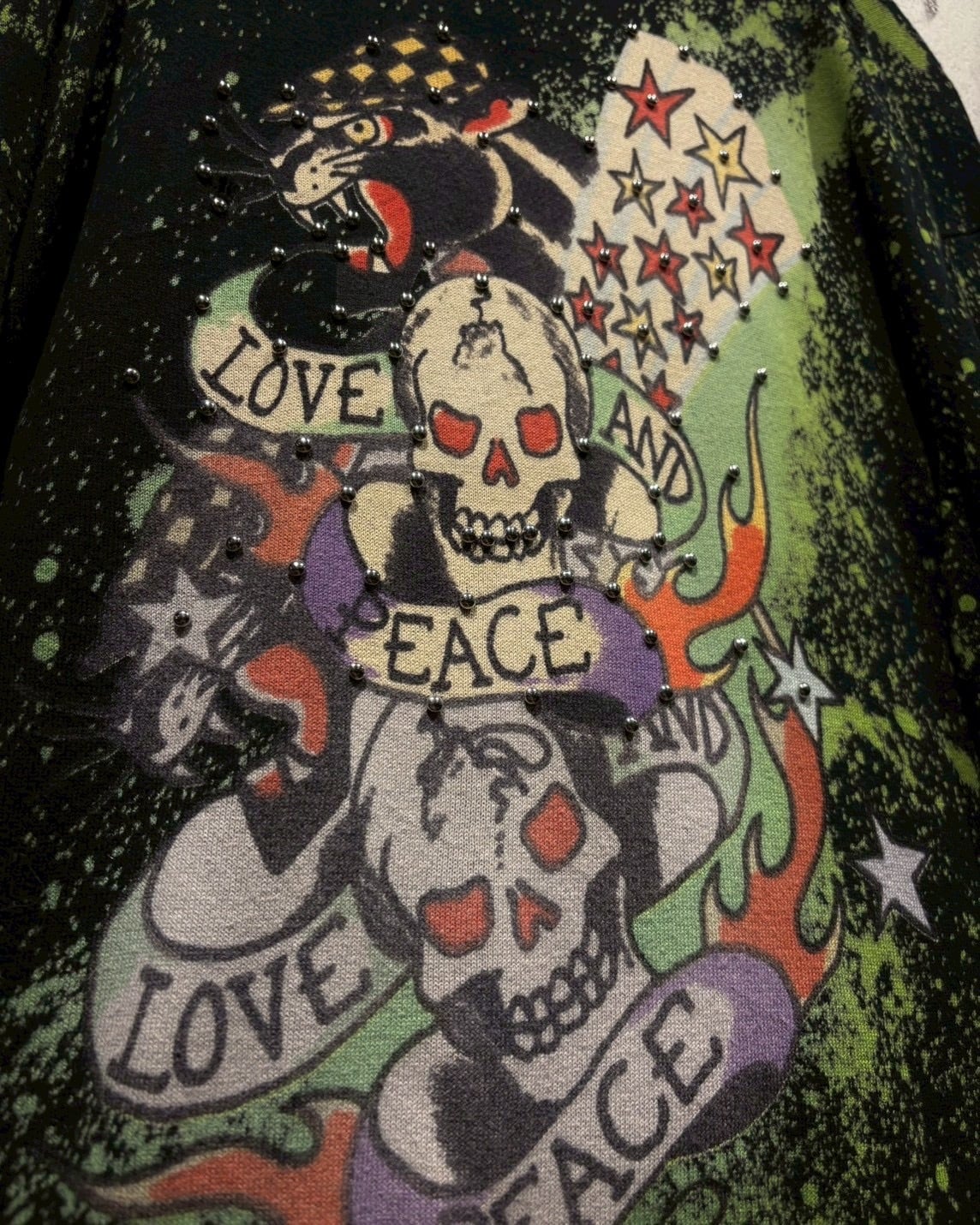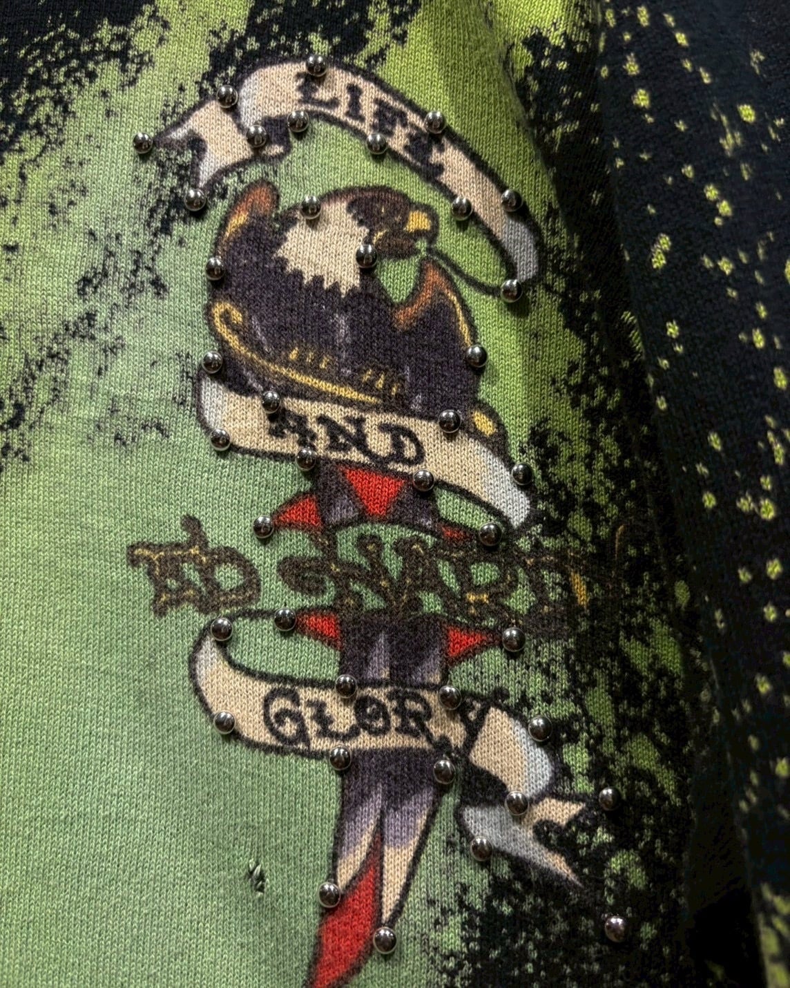 ブラックをベースに、グリーンを効かせたスプラッシュ調の配色。フロントとアームにはイーグルとダガー、背面には虎、フレイムにスカル、Ed Hardyらしいタトゥーモチーフを大胆に配置し、随所に施されたスタッズ使いも、立体感とラグジュアリーさをプラス。