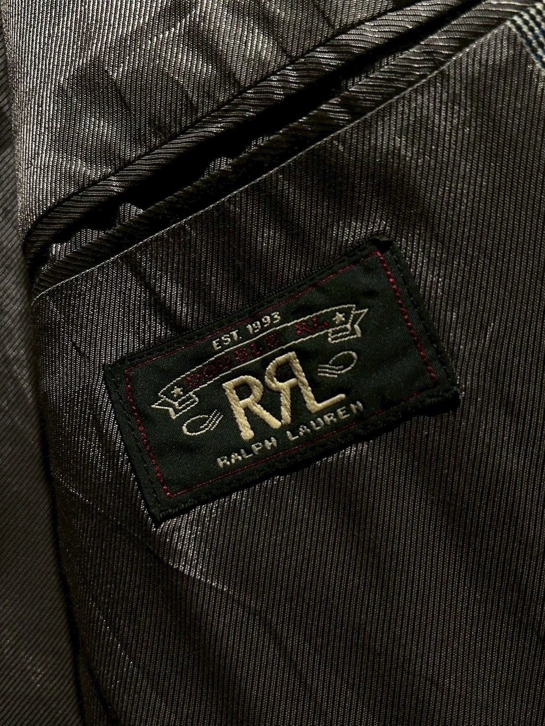 フロントはダブルブレスト仕様、襟元には存在感のあるピークドラペルを配し、クラシックで力強い印象を演出。フラップポケットや袖口のボタン配置など、テーラードとしての基本を押さえつつ、RRLらしい品の良さを感じられますね。