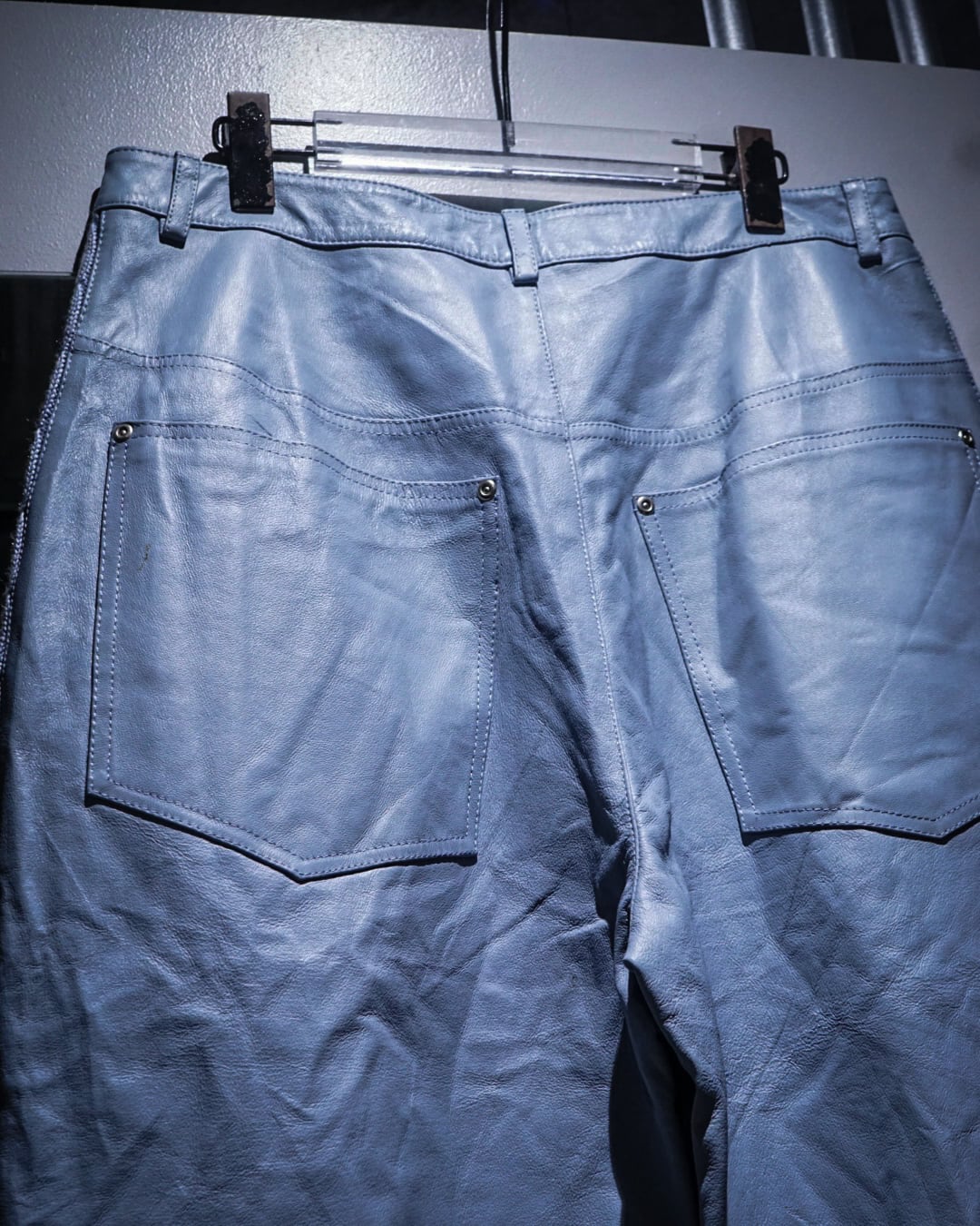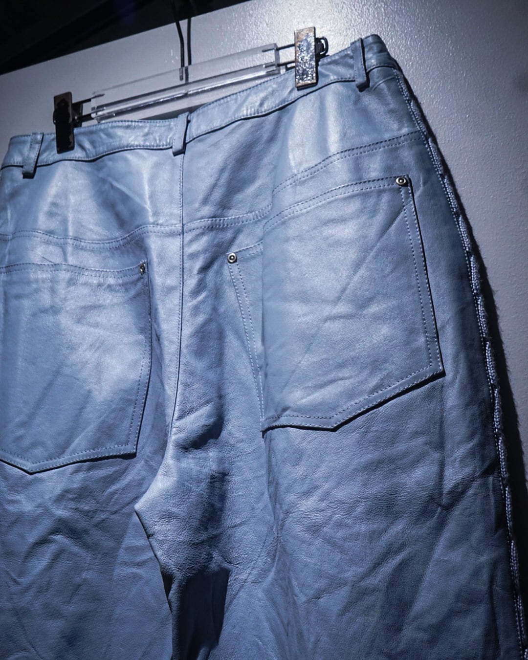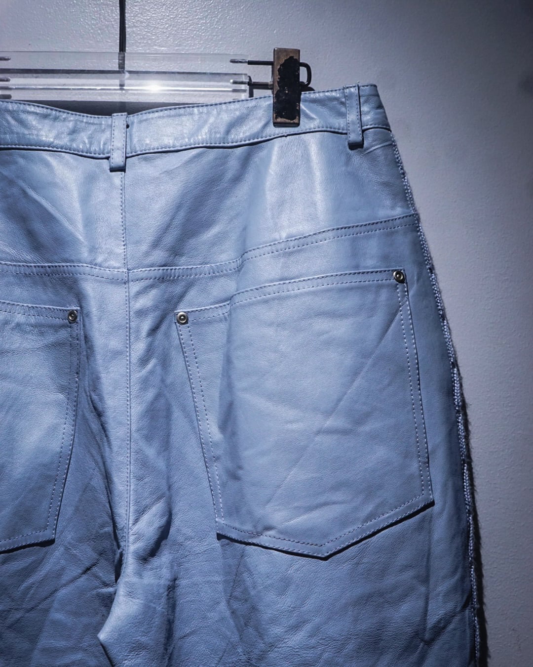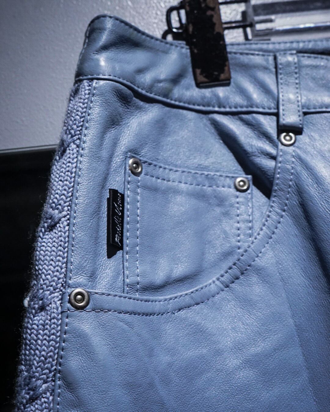 ボディにはしなやかで柔らかさのあるレザーを使用。淡いブルートーンの色味も相まって、レザーパンツながら重くなりすぎない印象に仕上がっています。