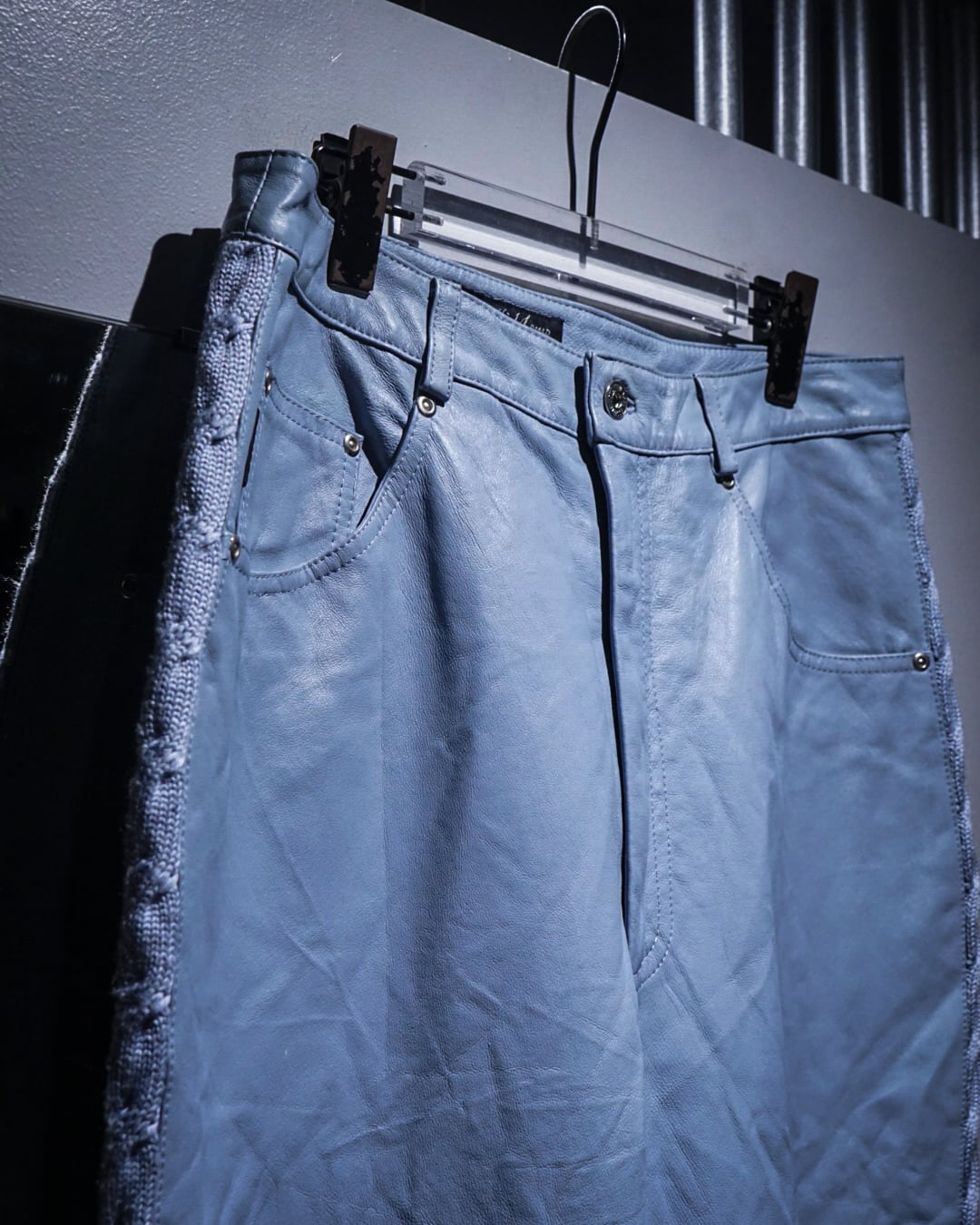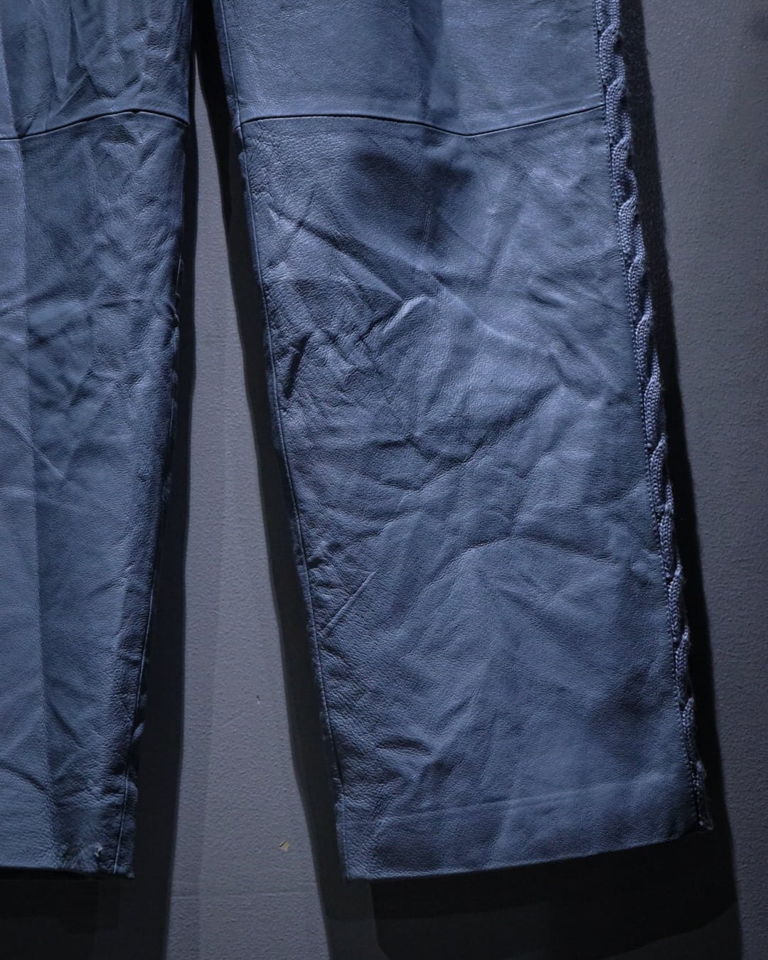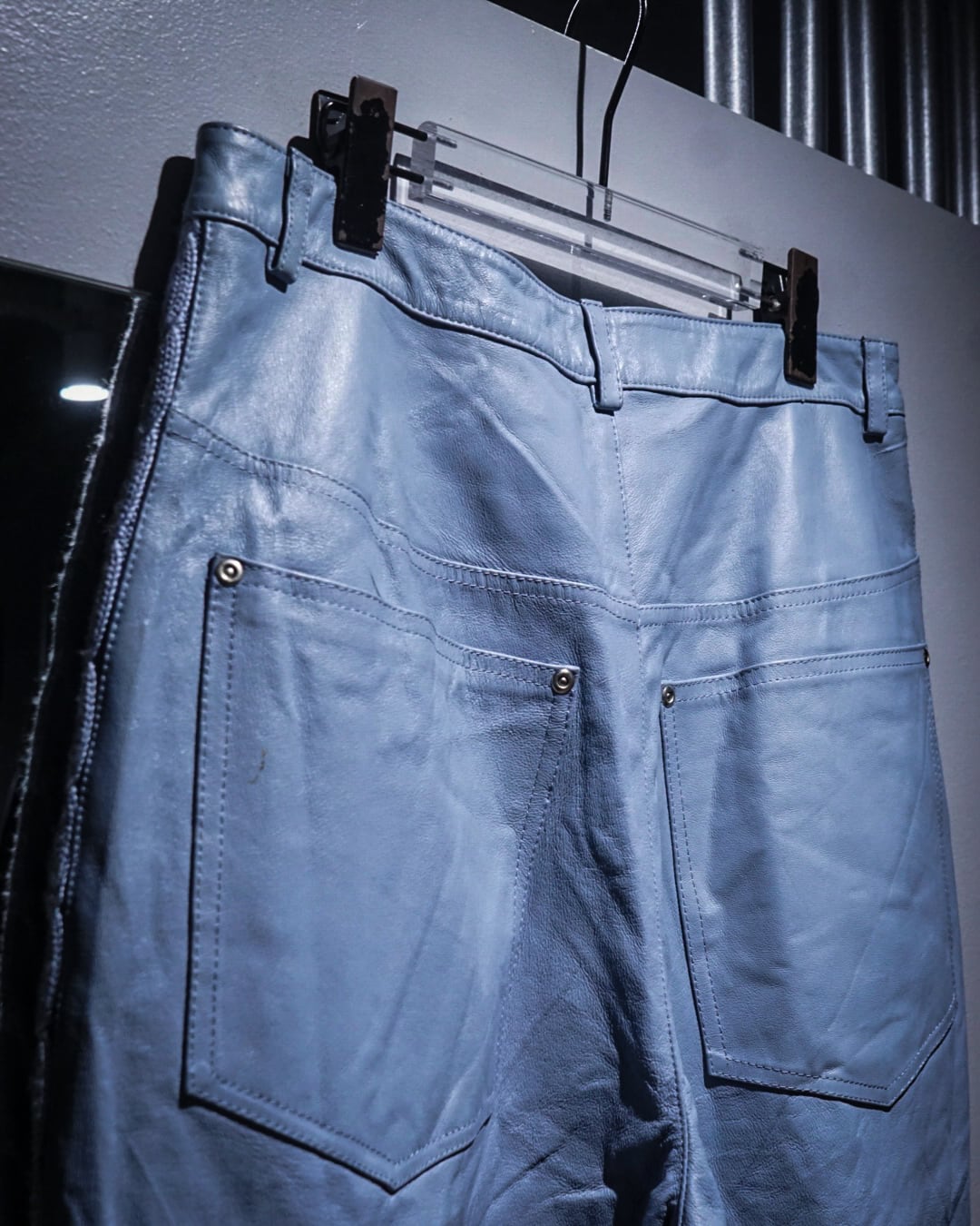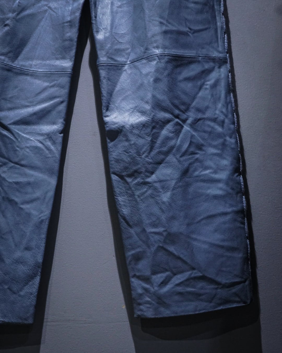 ボディにはしなやかで柔らかさのあるレザーを使用。淡いブルートーンの色味も相まって、レザーパンツながら重くなりすぎない印象に仕上がっています。