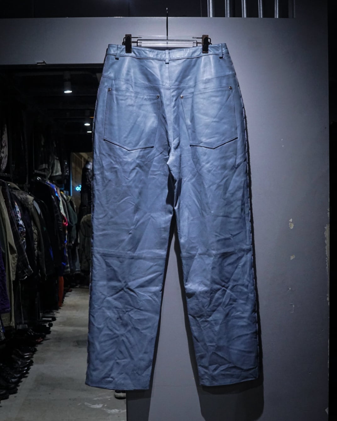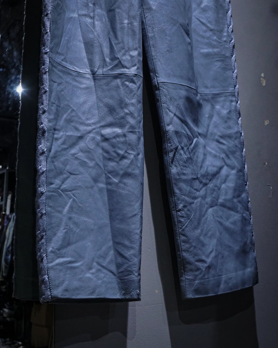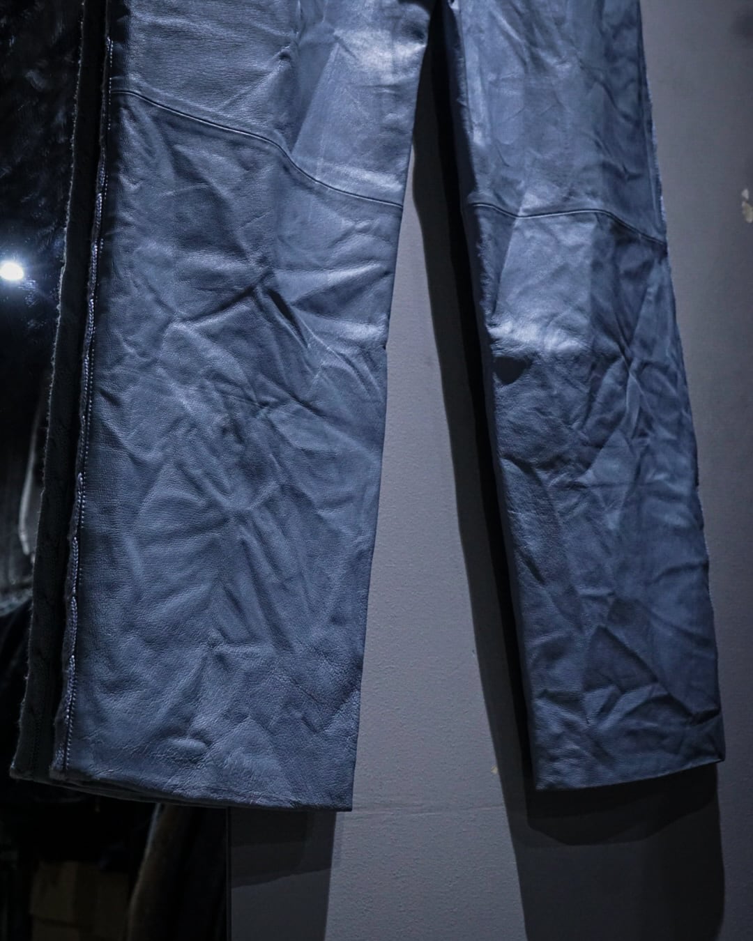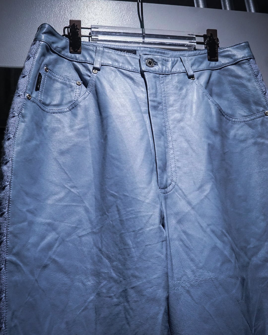 ボディにはしなやかで柔らかさのあるレザーを使用。淡いブルートーンの色味も相まって、レザーパンツながら重くなりすぎない印象に仕上がっています。
