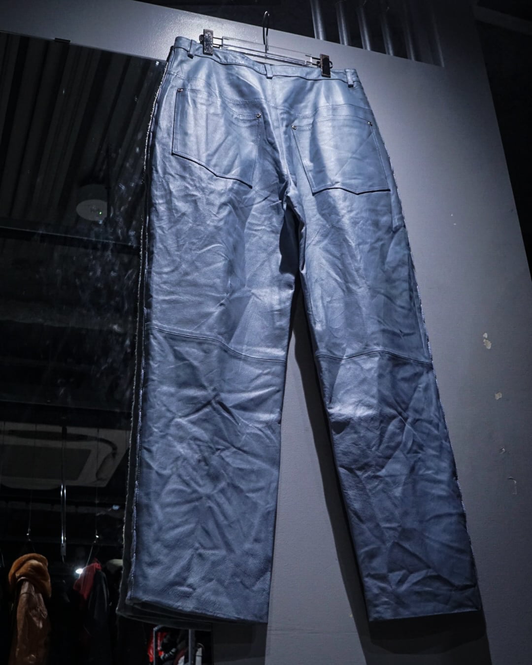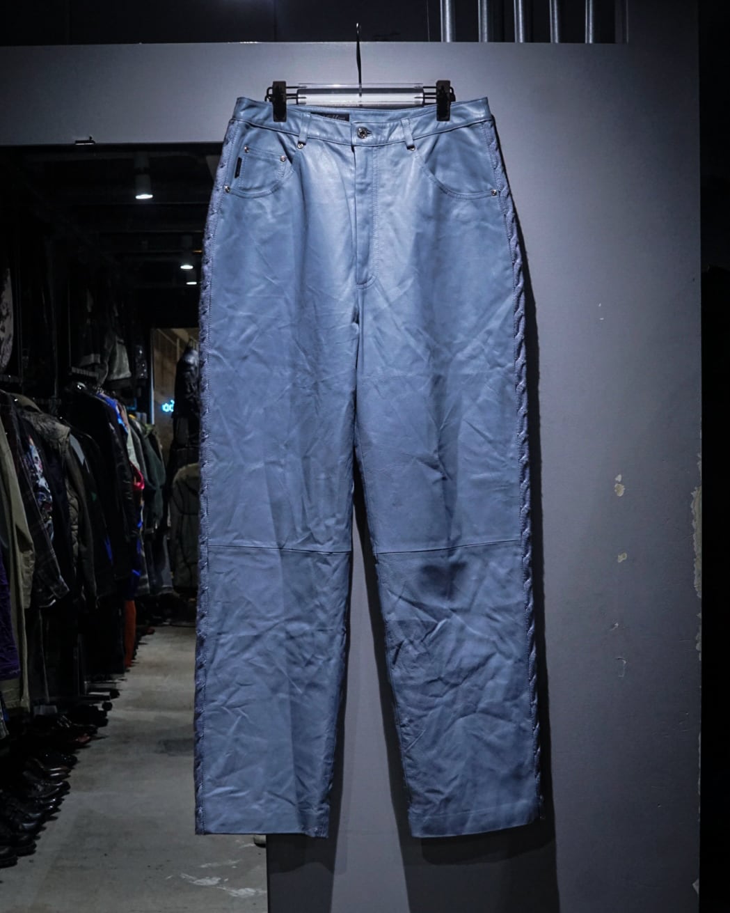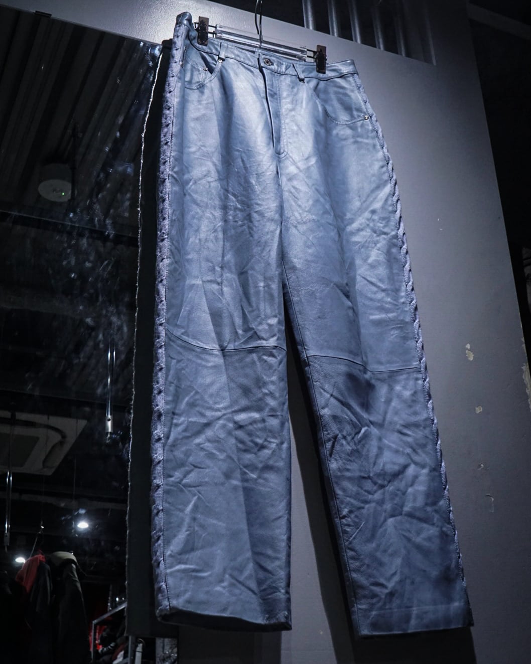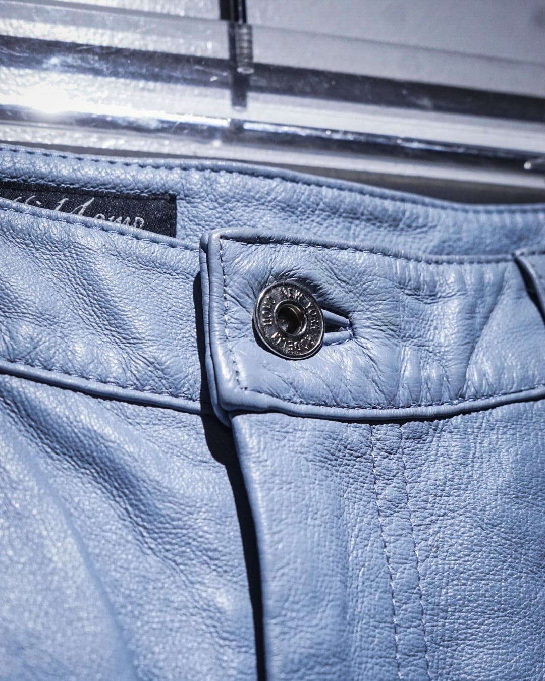 ボディにはしなやかで柔らかさのあるレザーを使用。淡いブルートーンの色味も相まって、レザーパンツながら重くなりすぎない印象に仕上がっています。