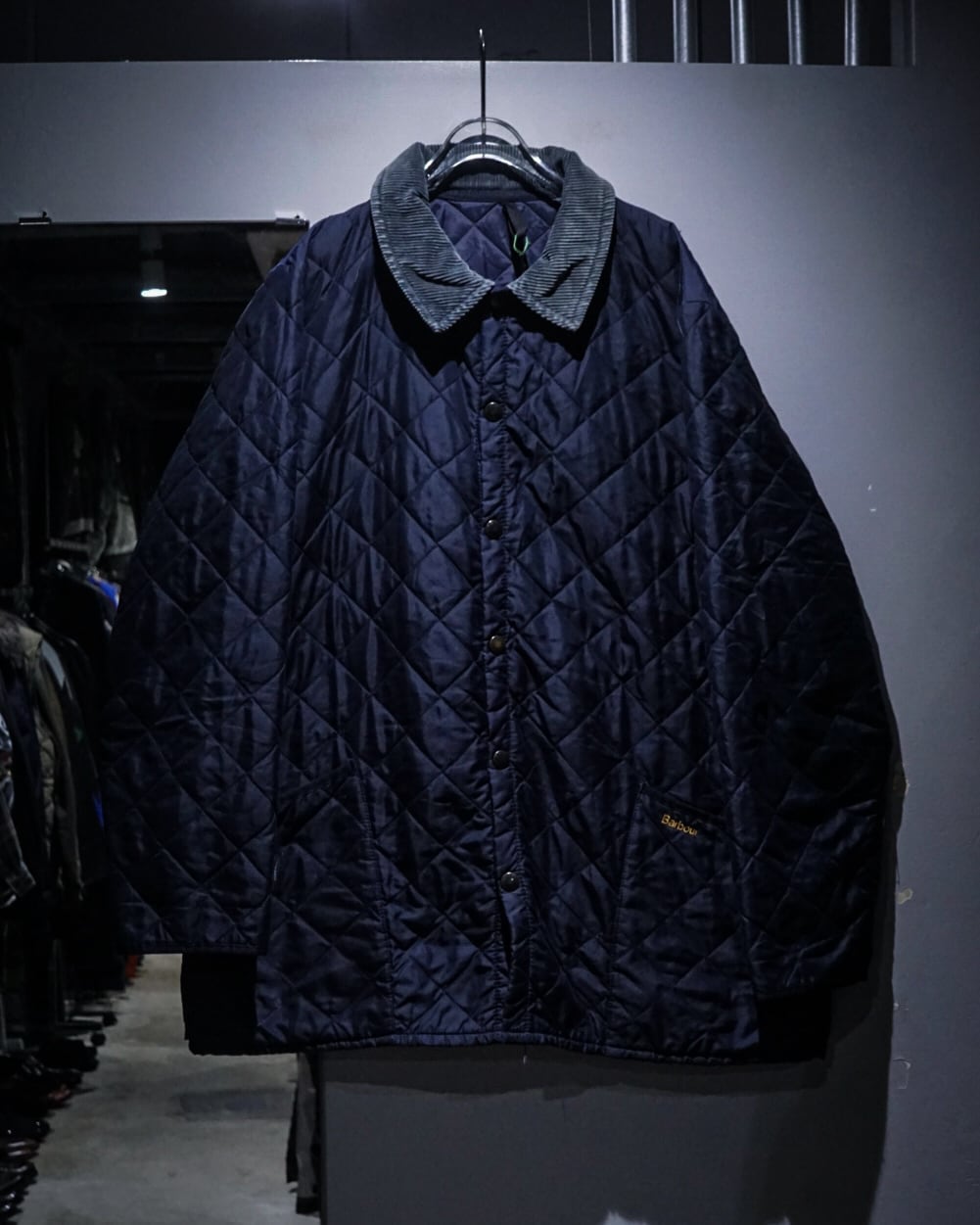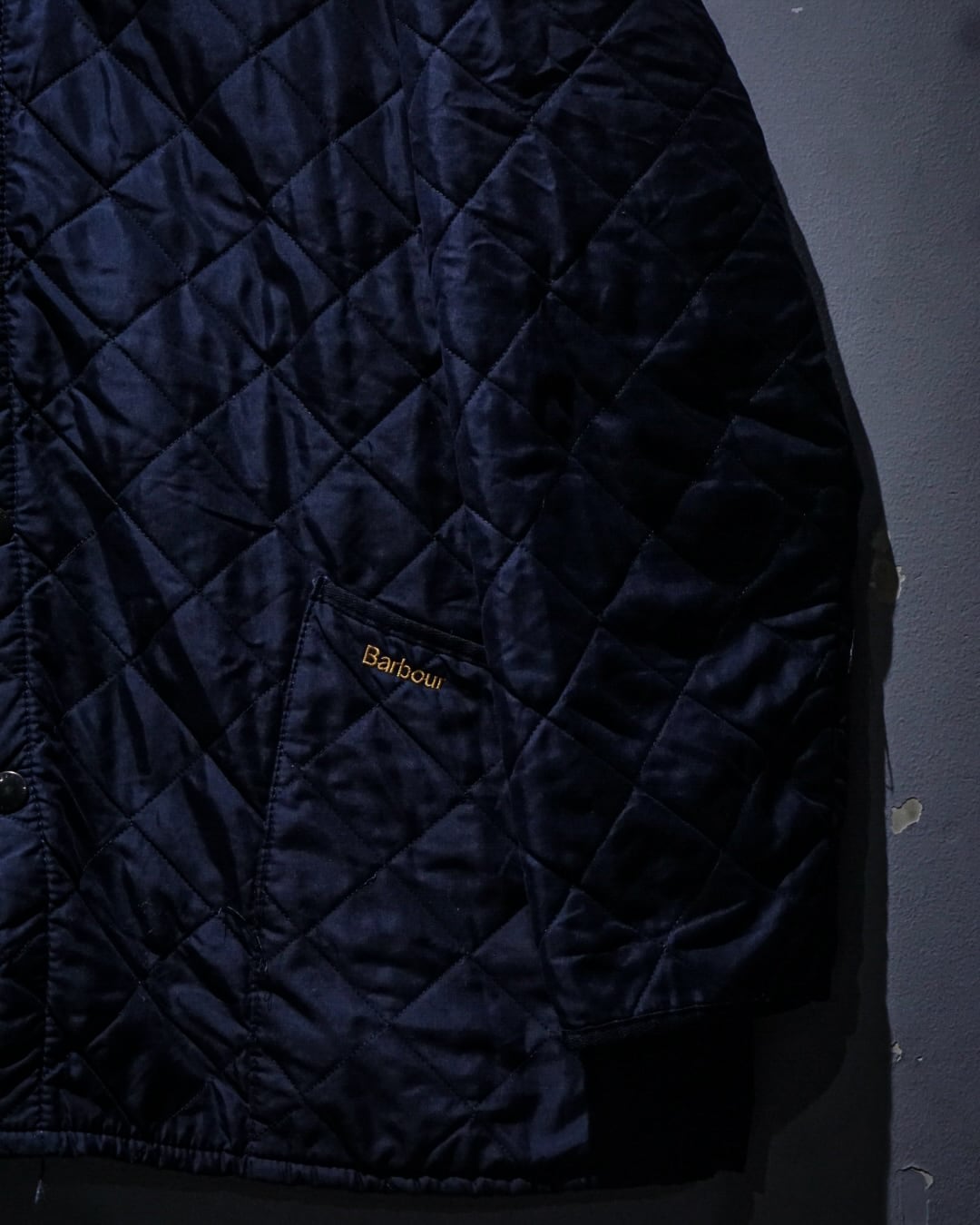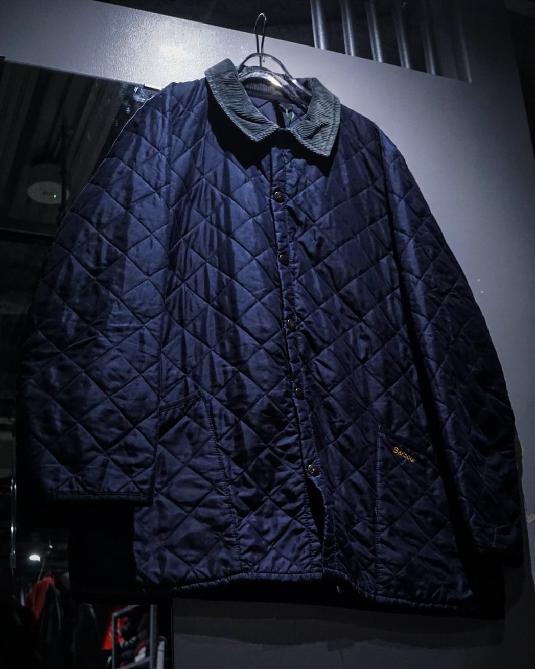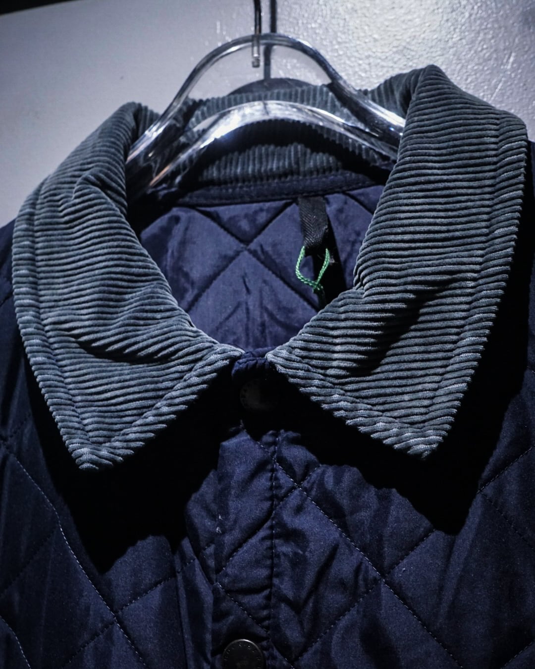 襟元には畝の立ったコーデュロイカラーを配置。シルキーな艶のあるキルティングとの素材コントラストが効き、Barbourらしい無骨さと品の良さを両立。フロントはスナップボタン仕様で着脱もスムーズ、ポケット脇には控えめにブランドロゴ刺繍が入り、さりげないアクセントに。