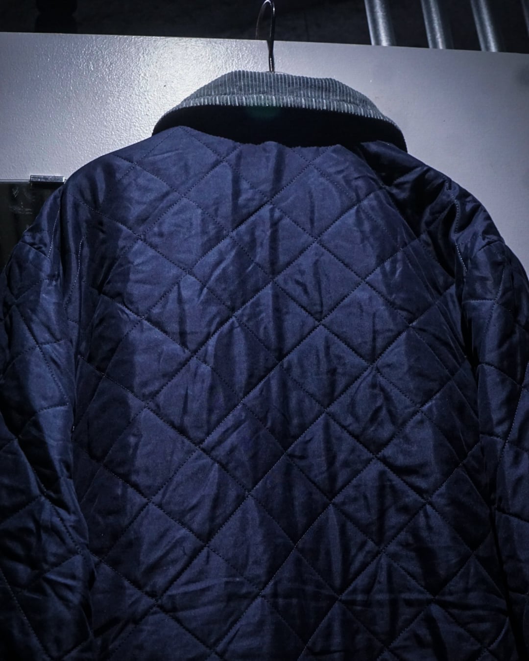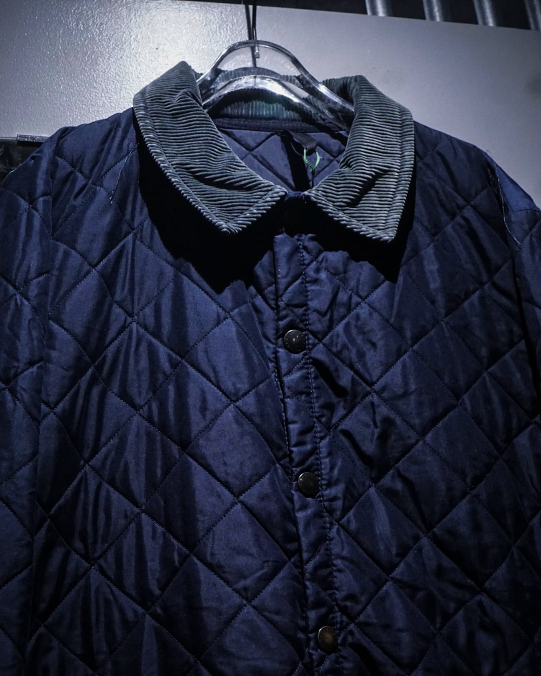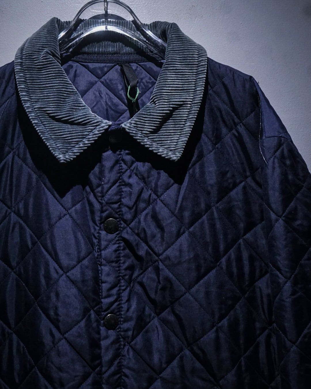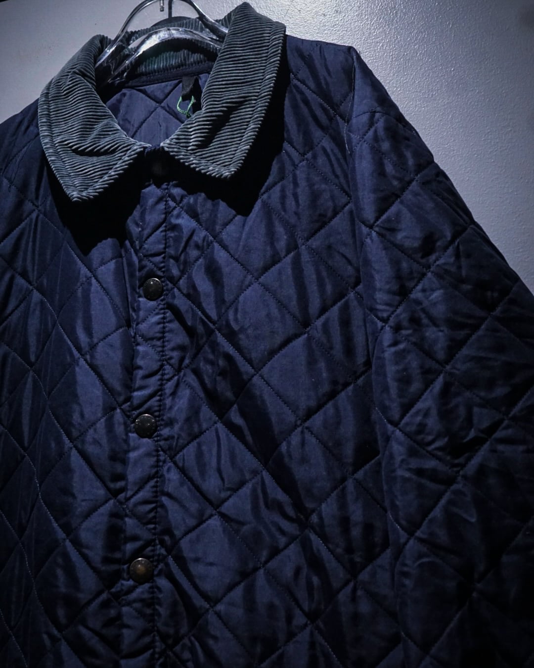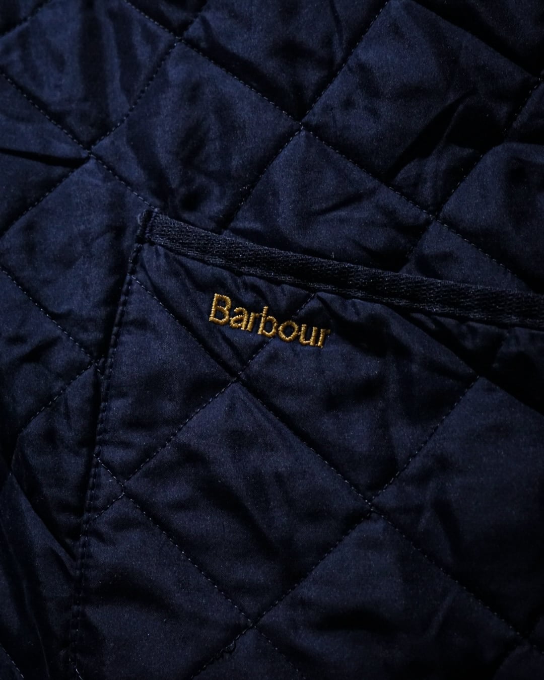 襟元には畝の立ったコーデュロイカラーを配置。シルキーな艶のあるキルティングとの素材コントラストが効き、Barbourらしい無骨さと品の良さを両立。フロントはスナップボタン仕様で着脱もスムーズ、ポケット脇には控えめにブランドロゴ刺繍が入り、さりげないアクセントに。