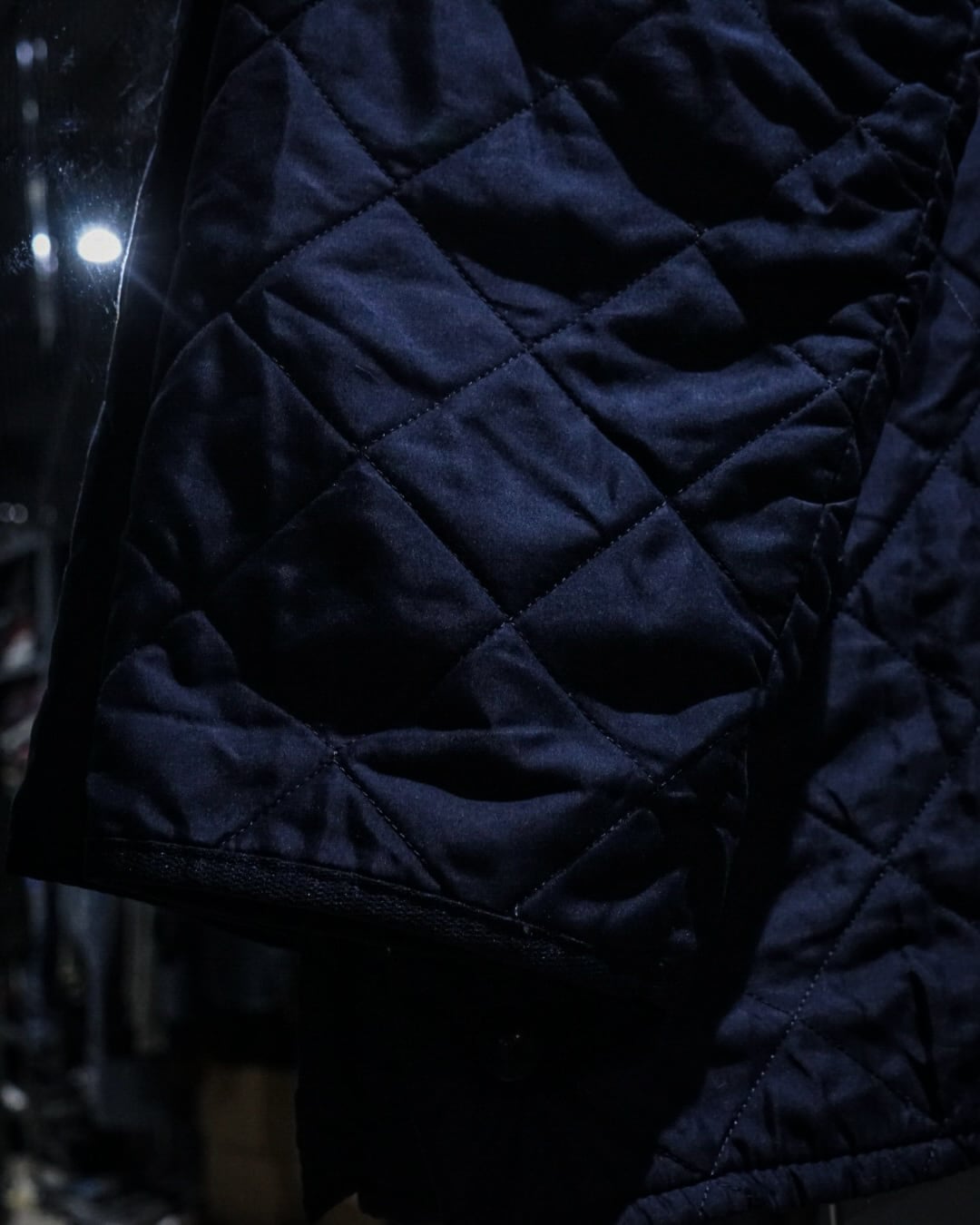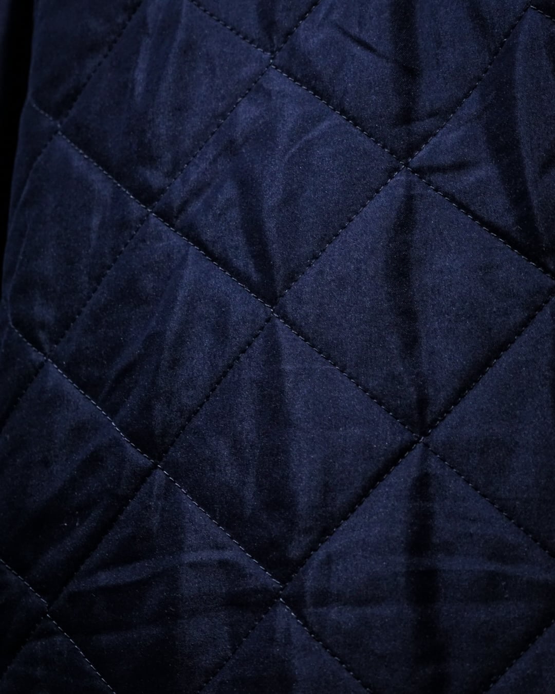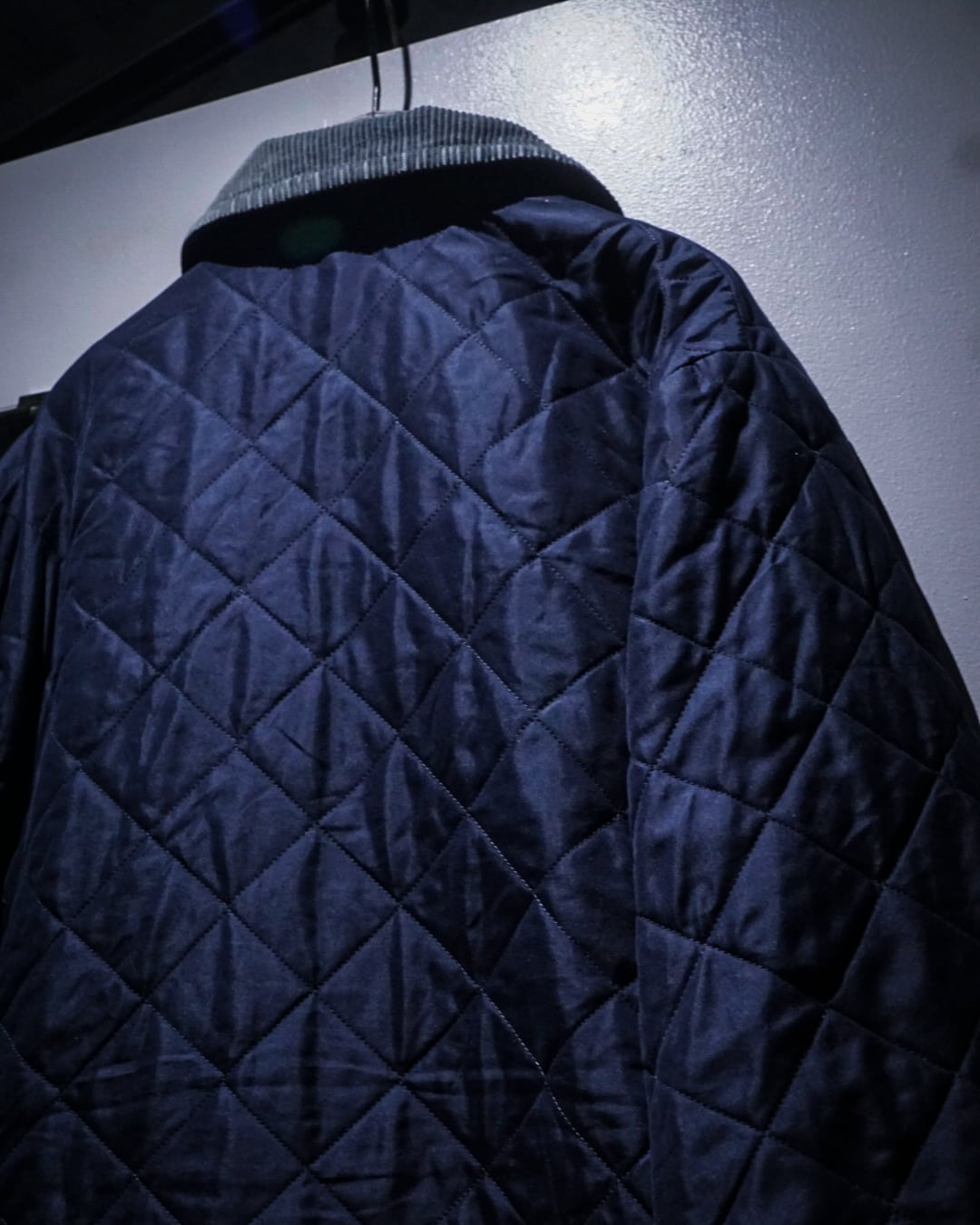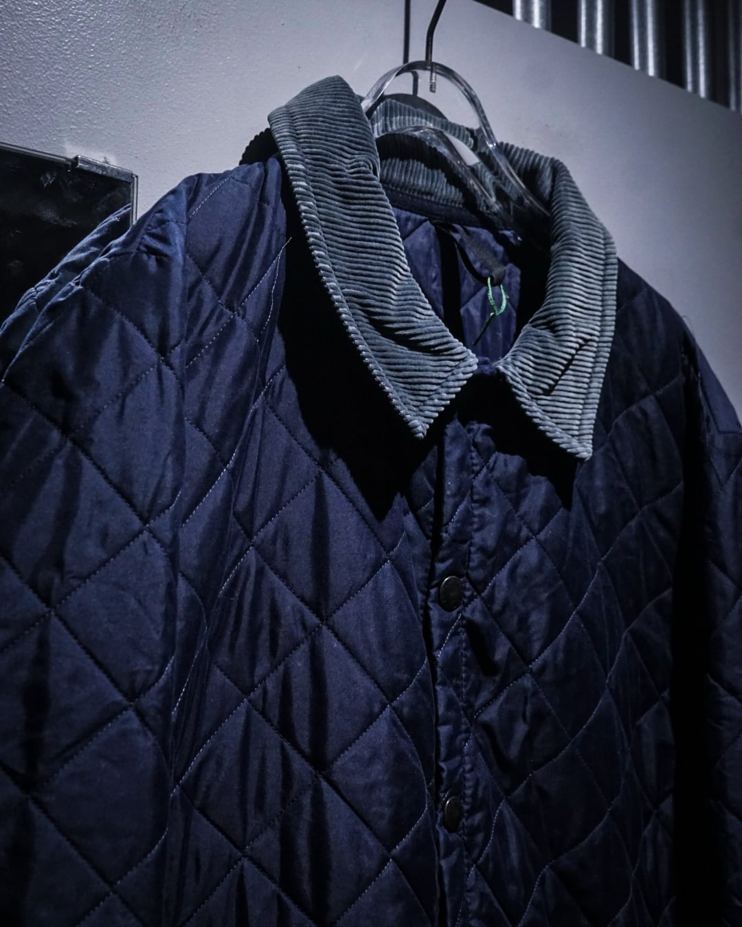 襟元には畝の立ったコーデュロイカラーを配置。シルキーな艶のあるキルティングとの素材コントラストが効き、Barbourらしい無骨さと品の良さを両立。フロントはスナップボタン仕様で着脱もスムーズ、ポケット脇には控えめにブランドロゴ刺繍が入り、さりげないアクセントに。