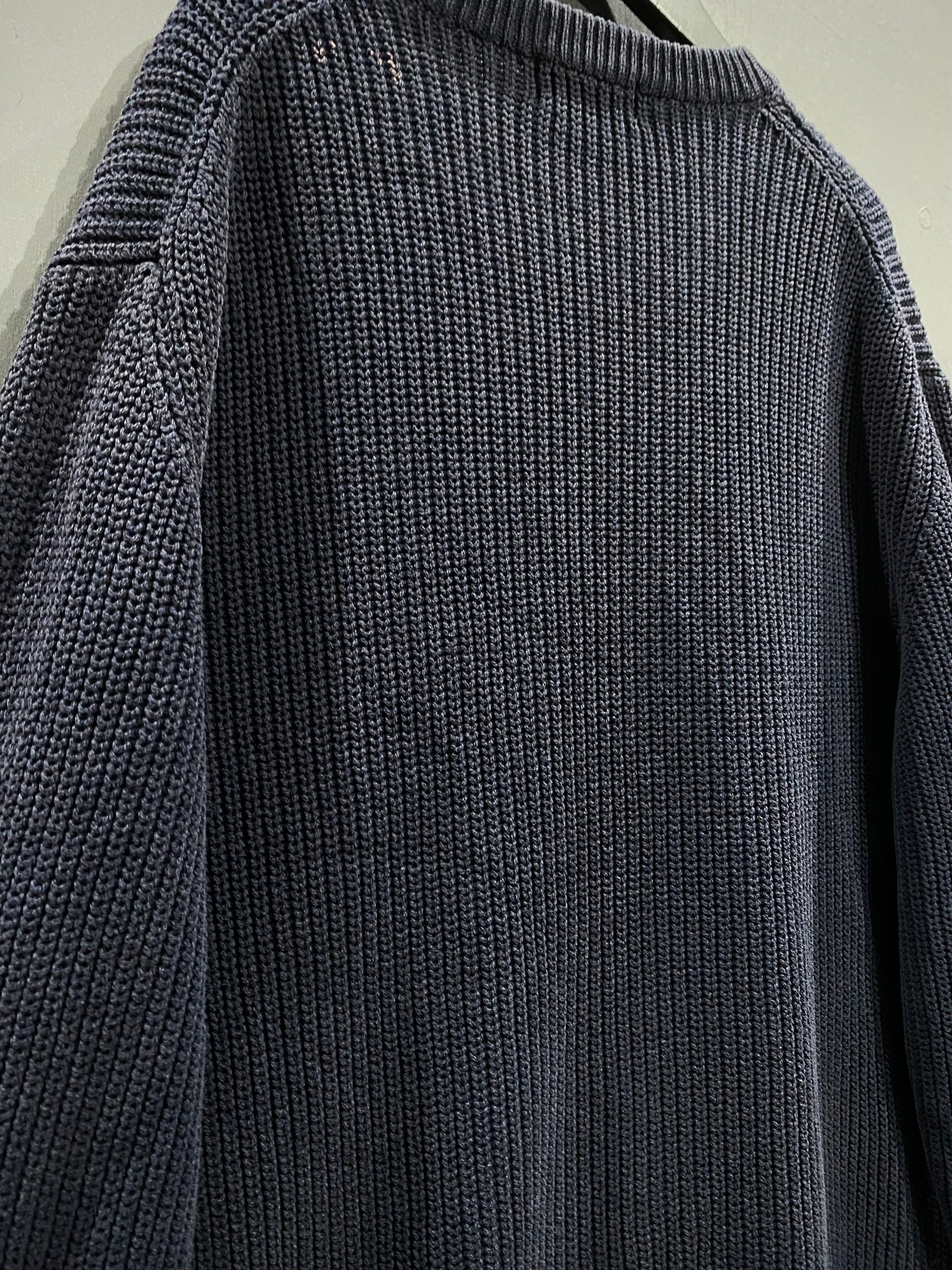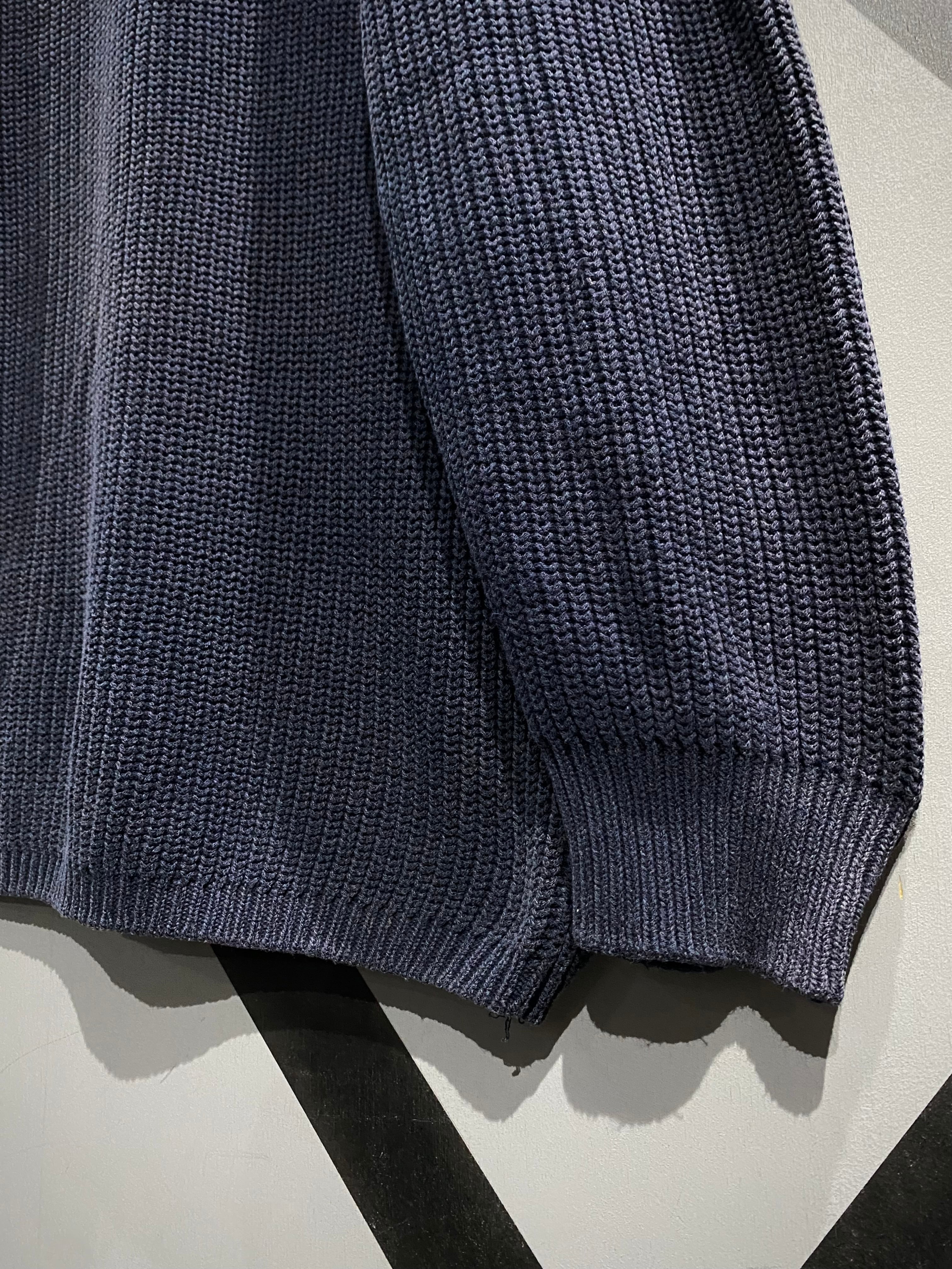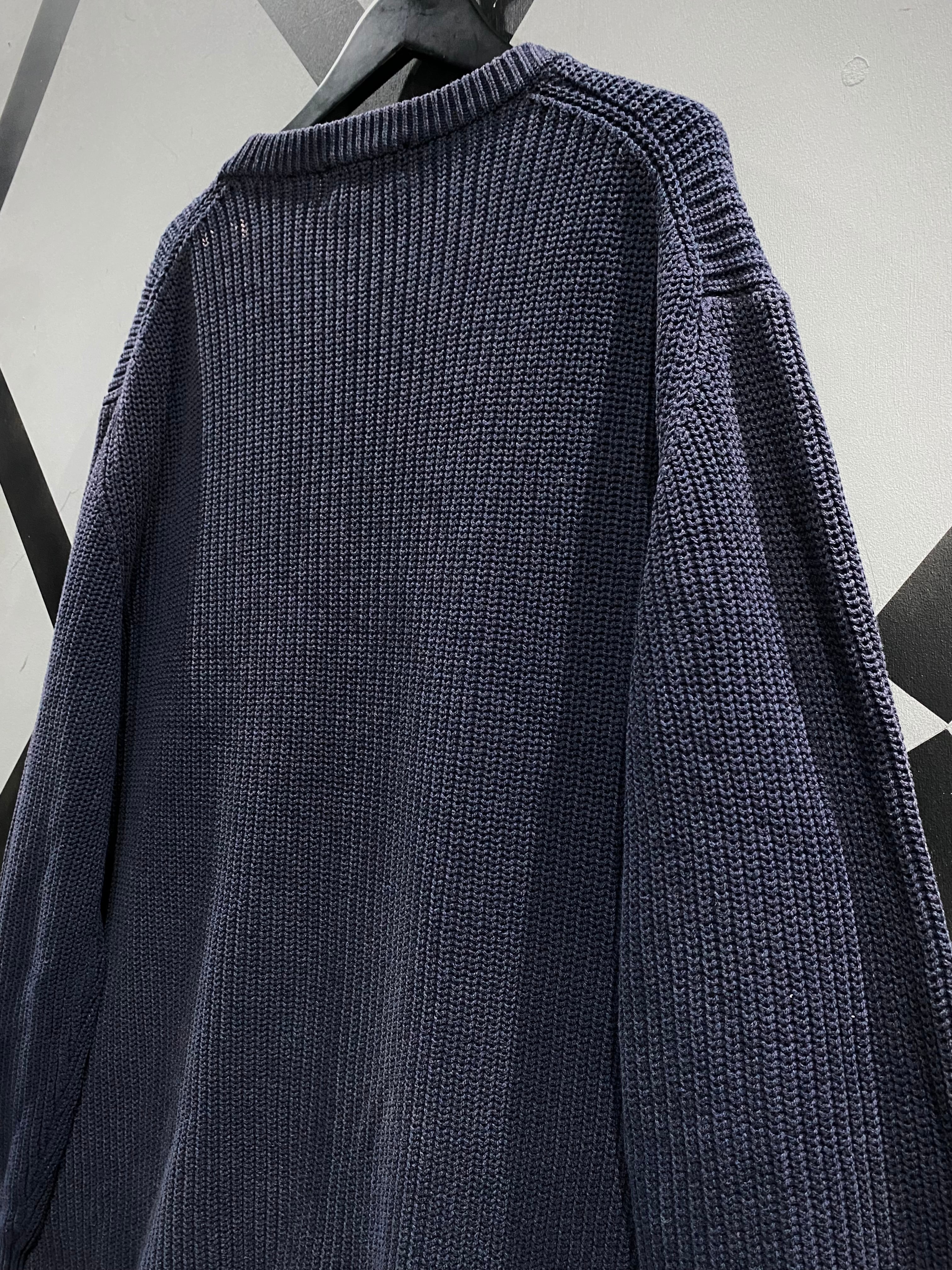 ベースはミドルゲージのコットンニット。ネイビーを基調に、フロントには大胆な切り替えを配置し、当時のマリン、セーリングウェアらしい雰囲気をデザインにしっかりと落とし込んでいます。