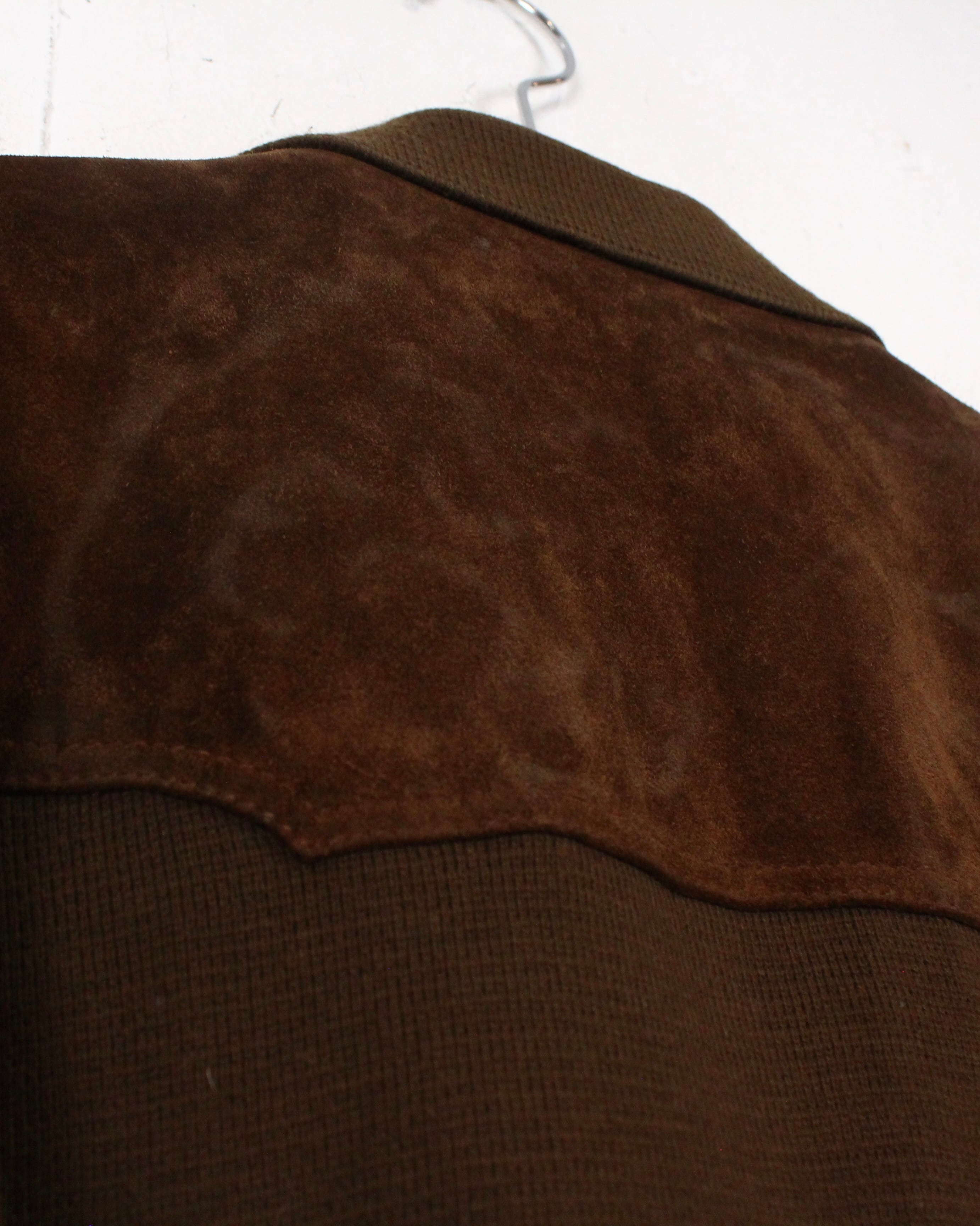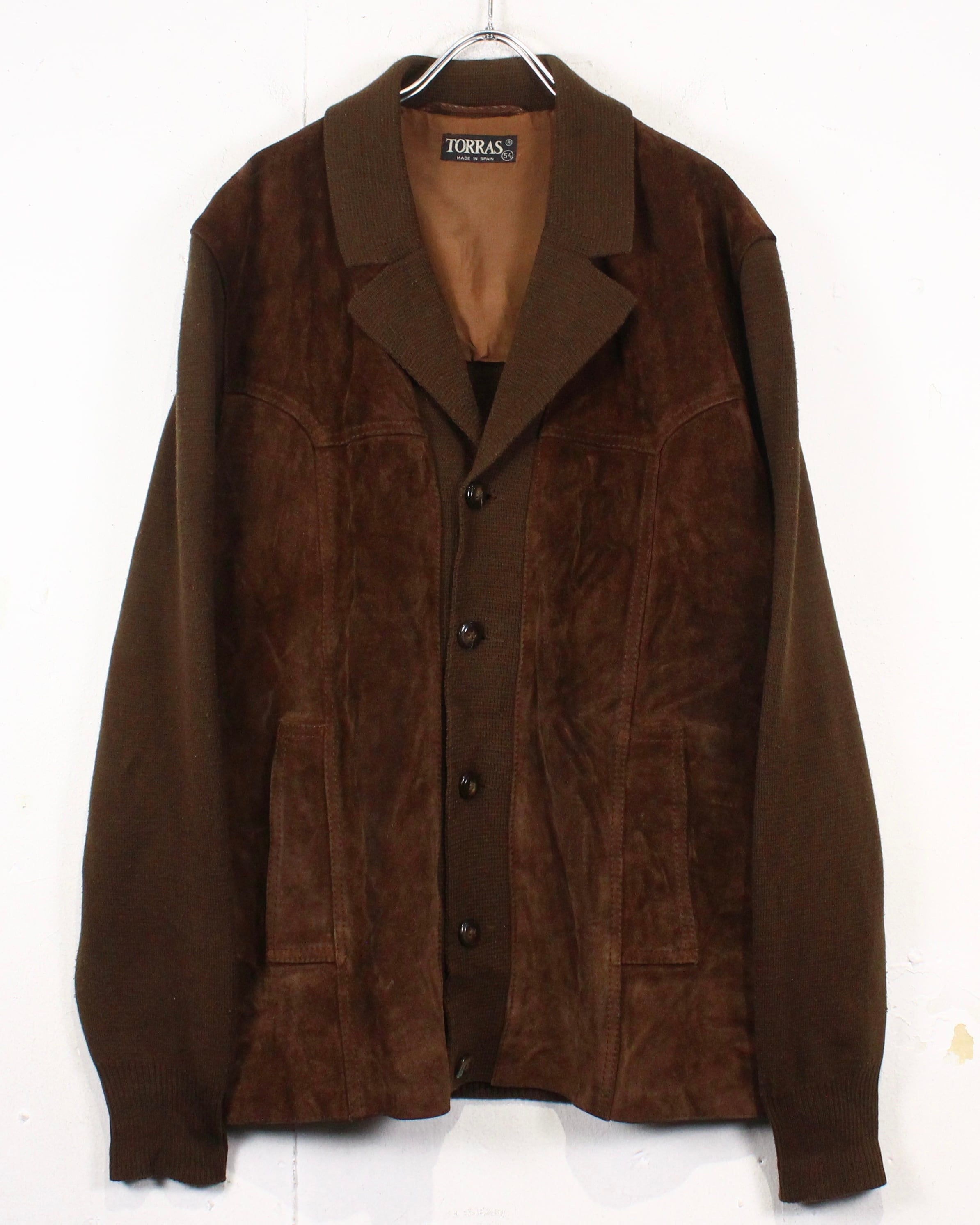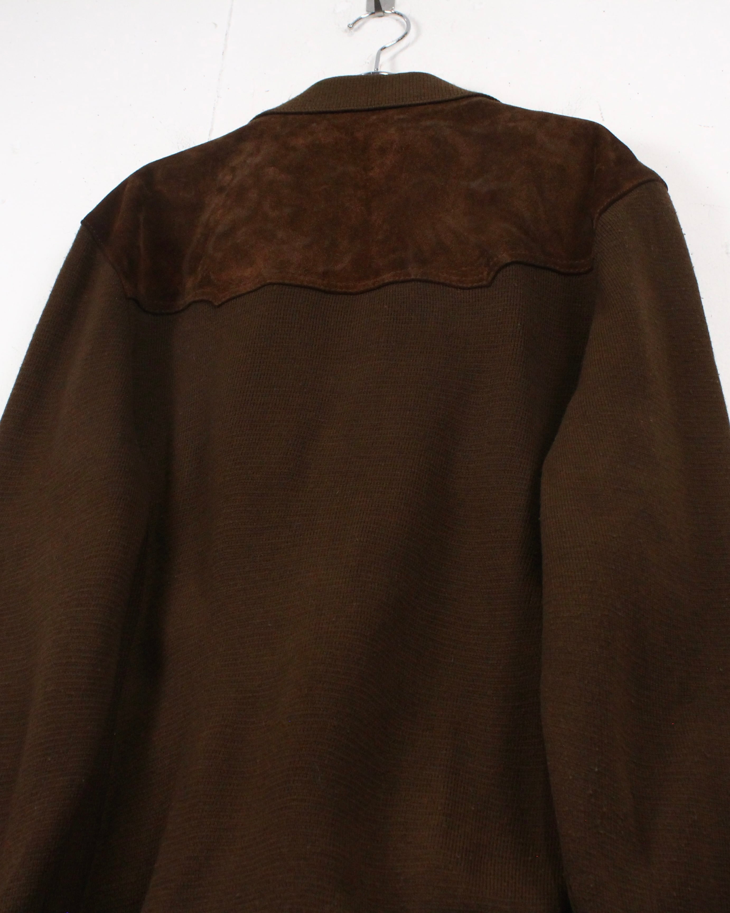 ドライな質感で肉感のあるブラウンのニットのボディに、薄手でハリのあるスエードレザーを贅沢に切り替えたニットジャケット。