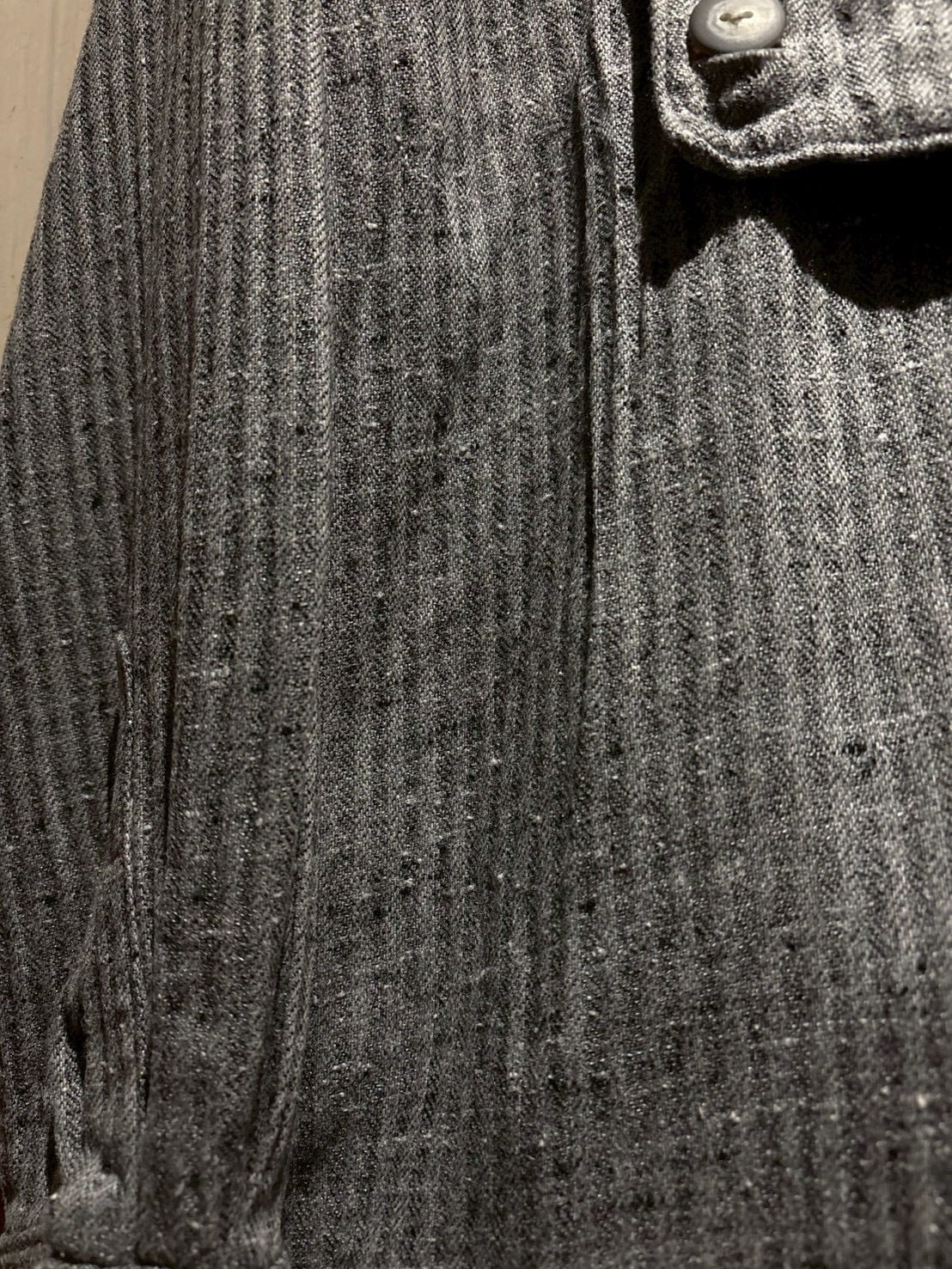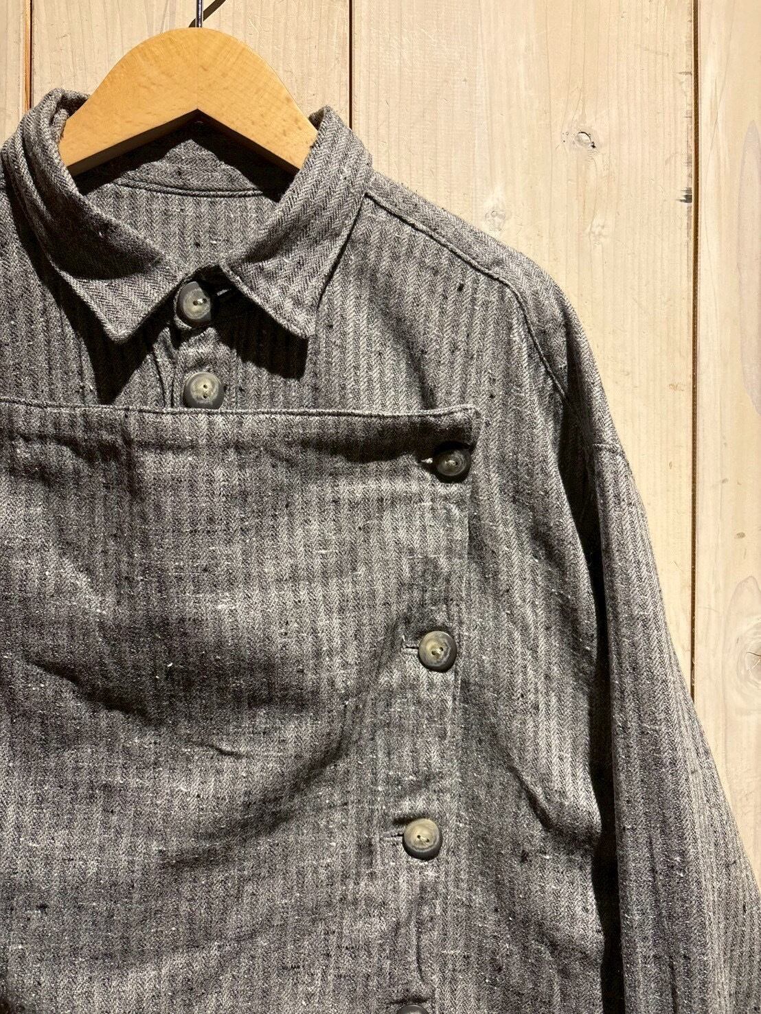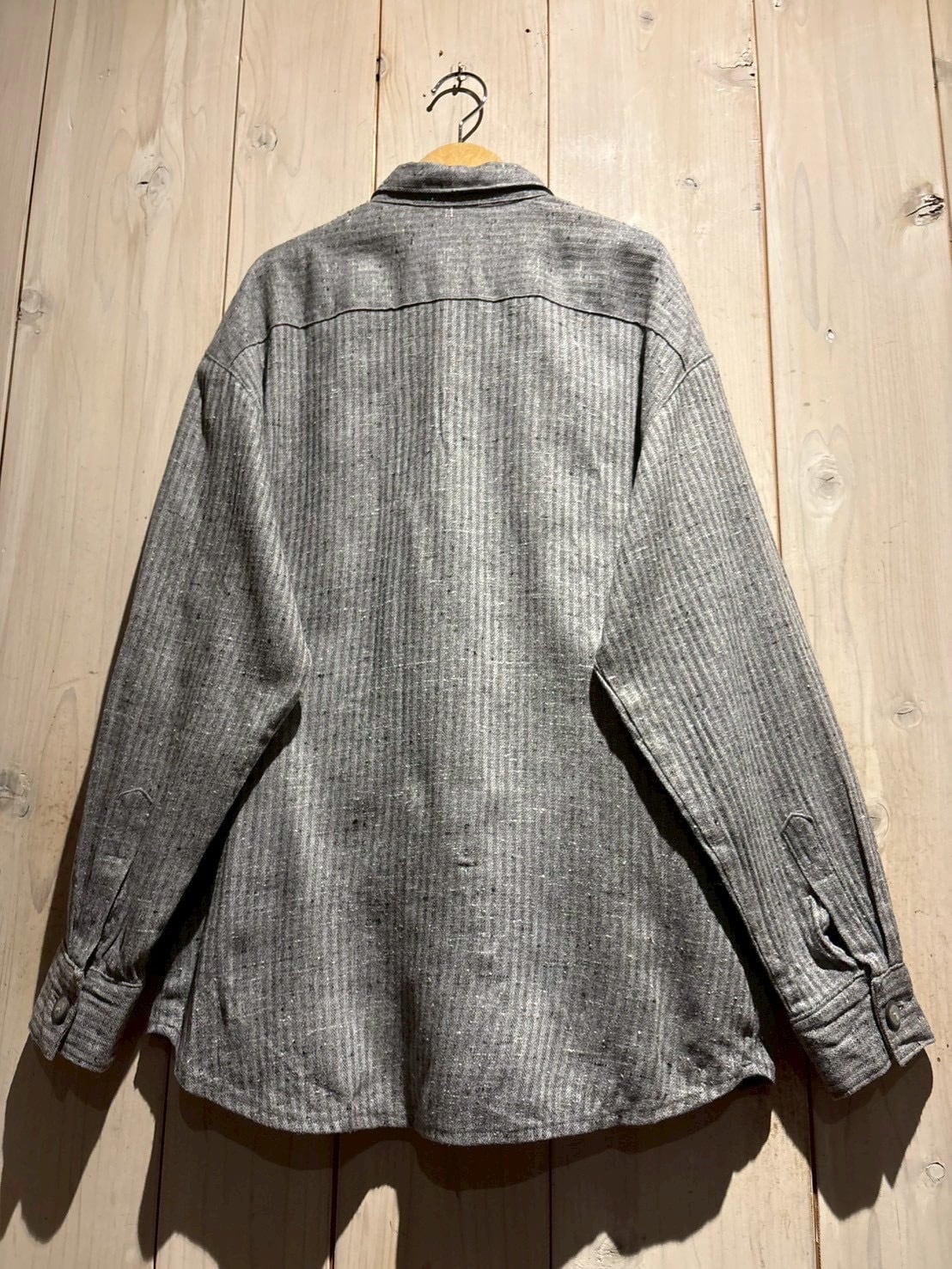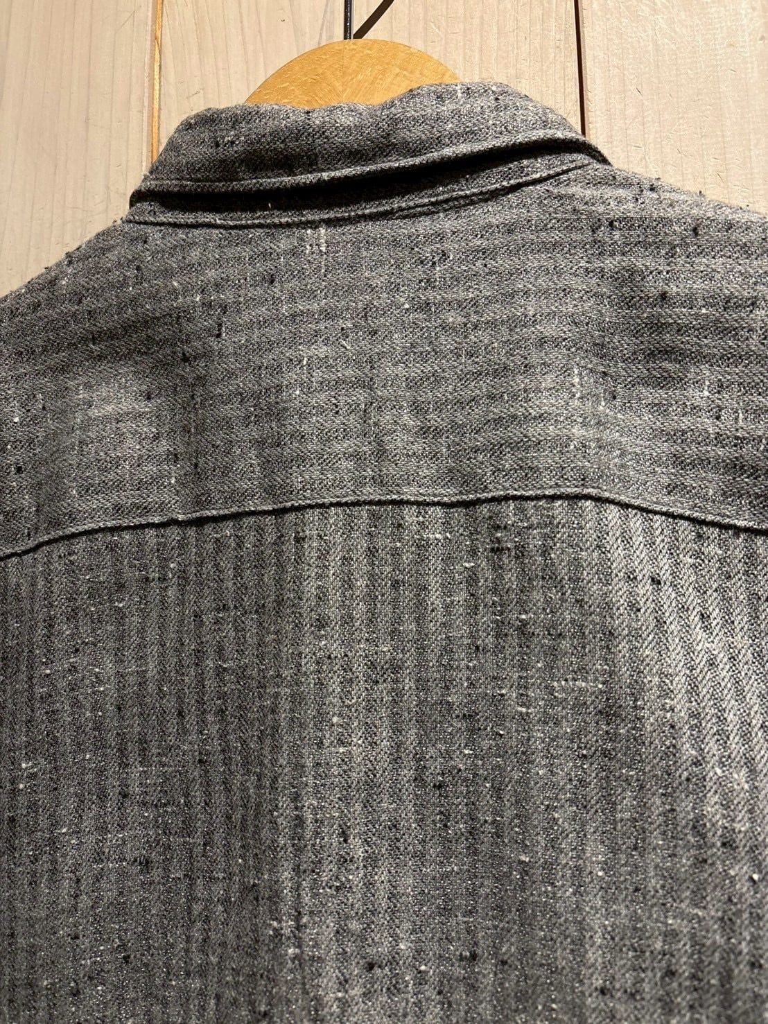 生地にはストライプ柄をベースに、ネップ感のある表情豊かなファブリックを採用。均一ではない糸のムラや節が、奥行きのある風合いを生み出し、ヴィンテージらしい空気感をしっかりと演出しています。