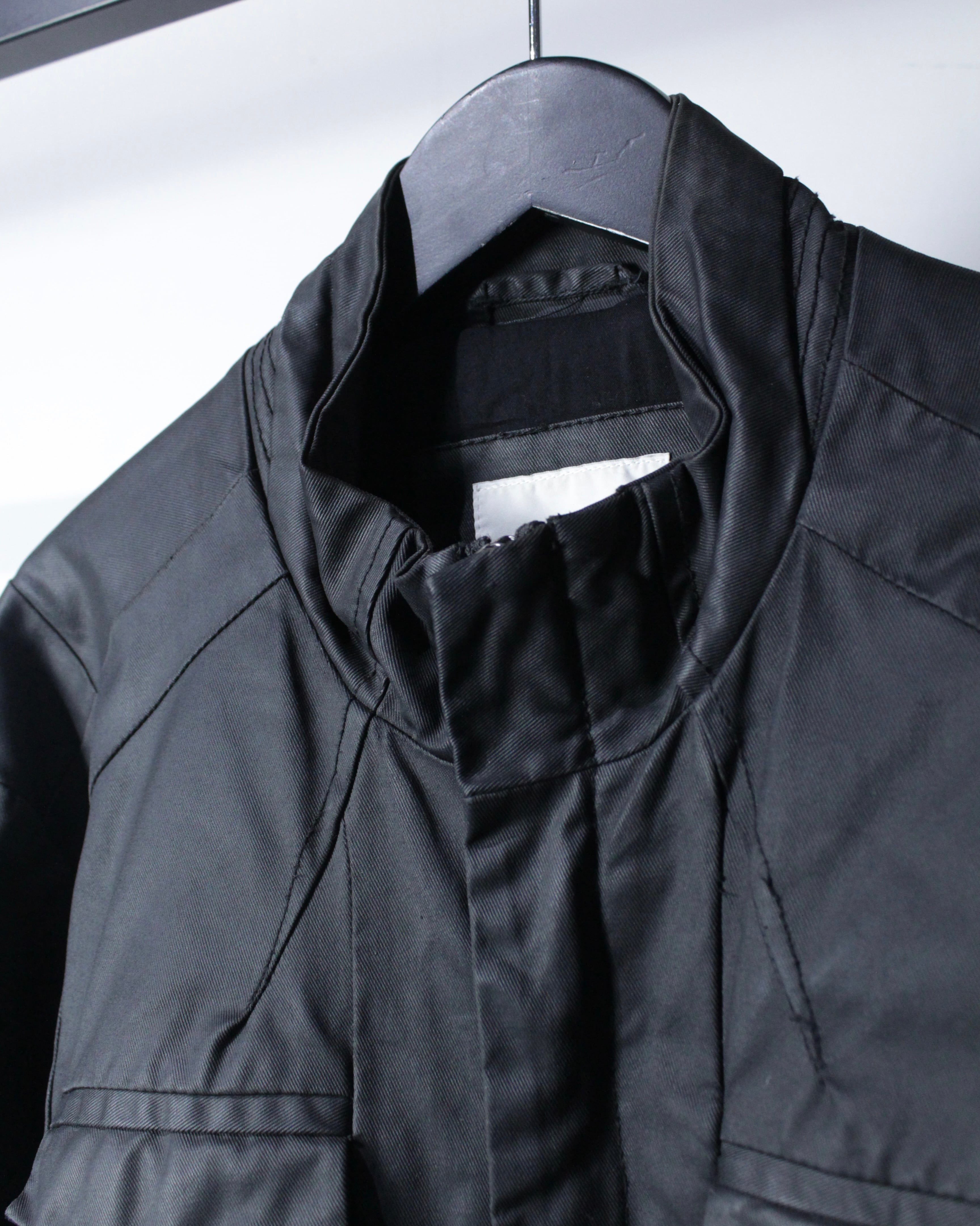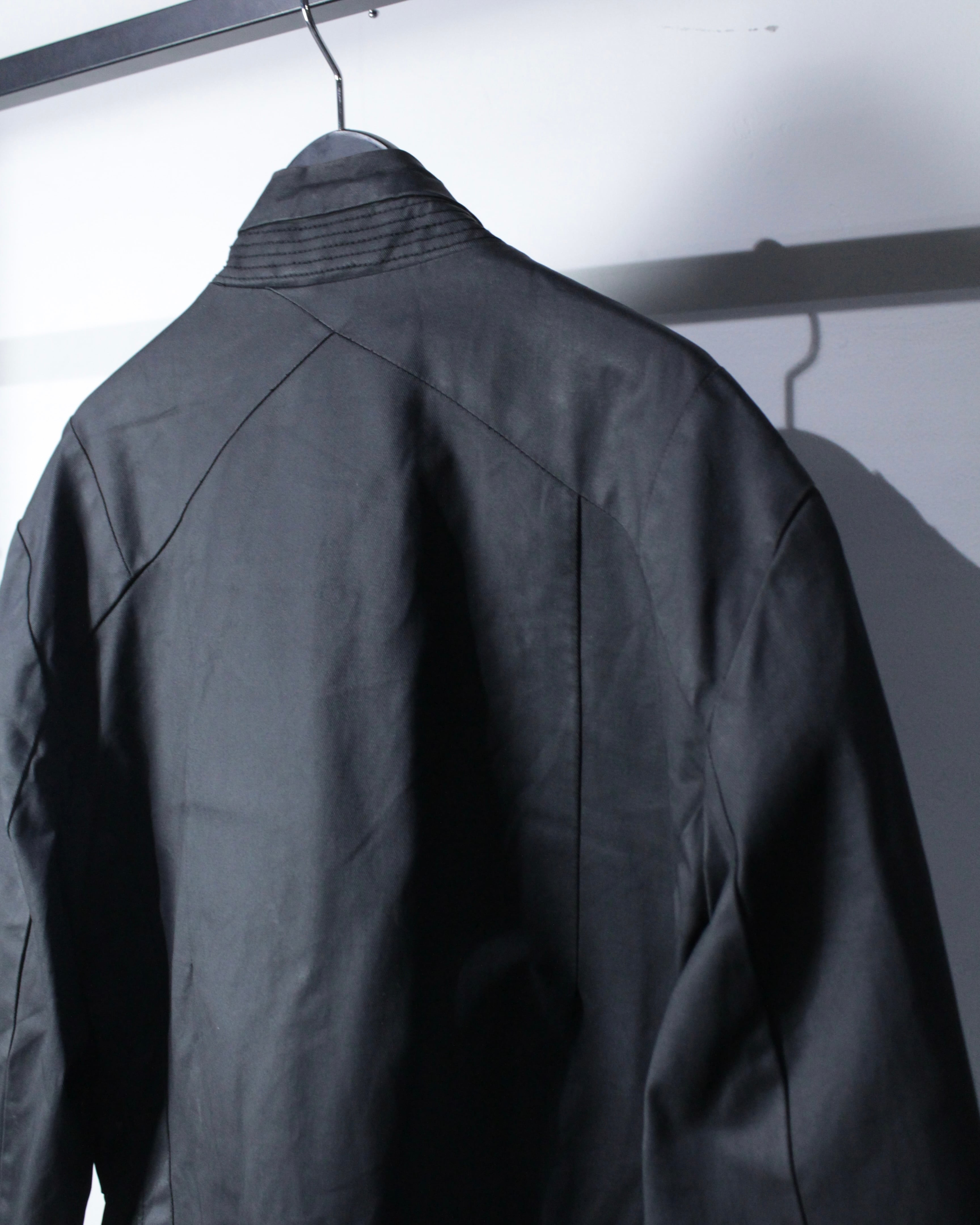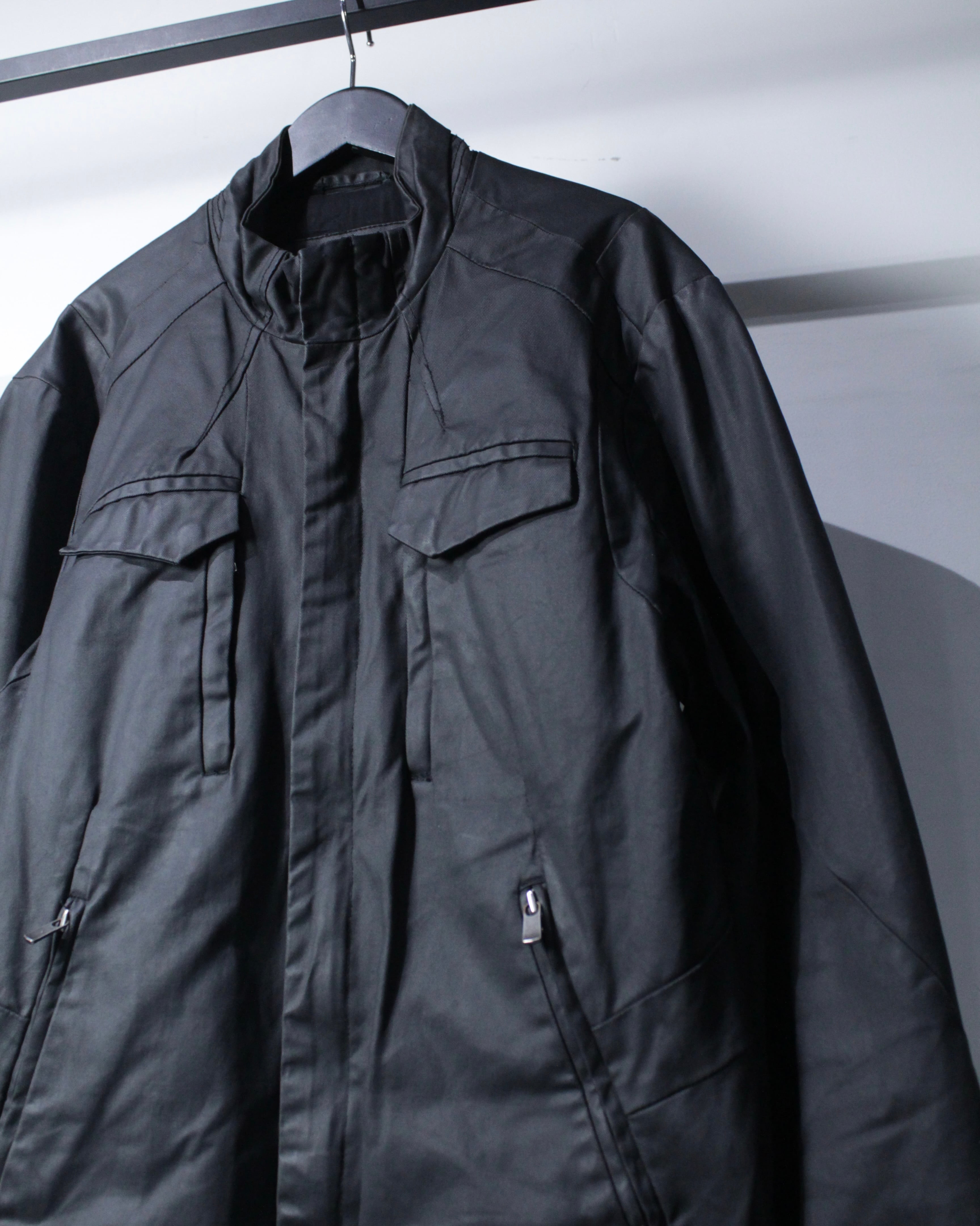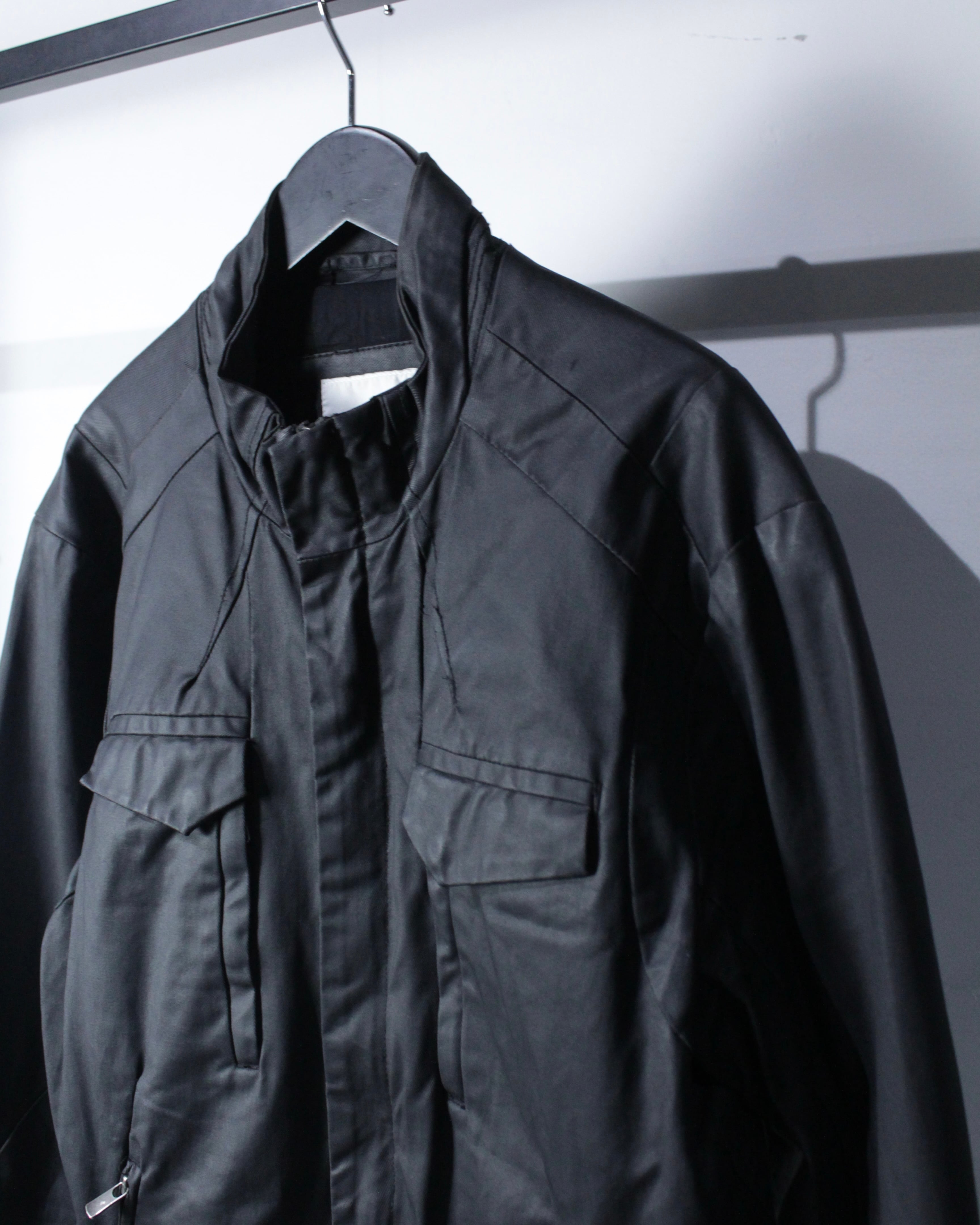 マットな質感のブラックボディにコーティング加工を施し、ナイロンとはまた異なる、しっとりとした鈍い艶感が際立つ1着。ミリタリーやワーク由来のディテールをベースにしながら、都会的でモードな表情へと昇華されています。