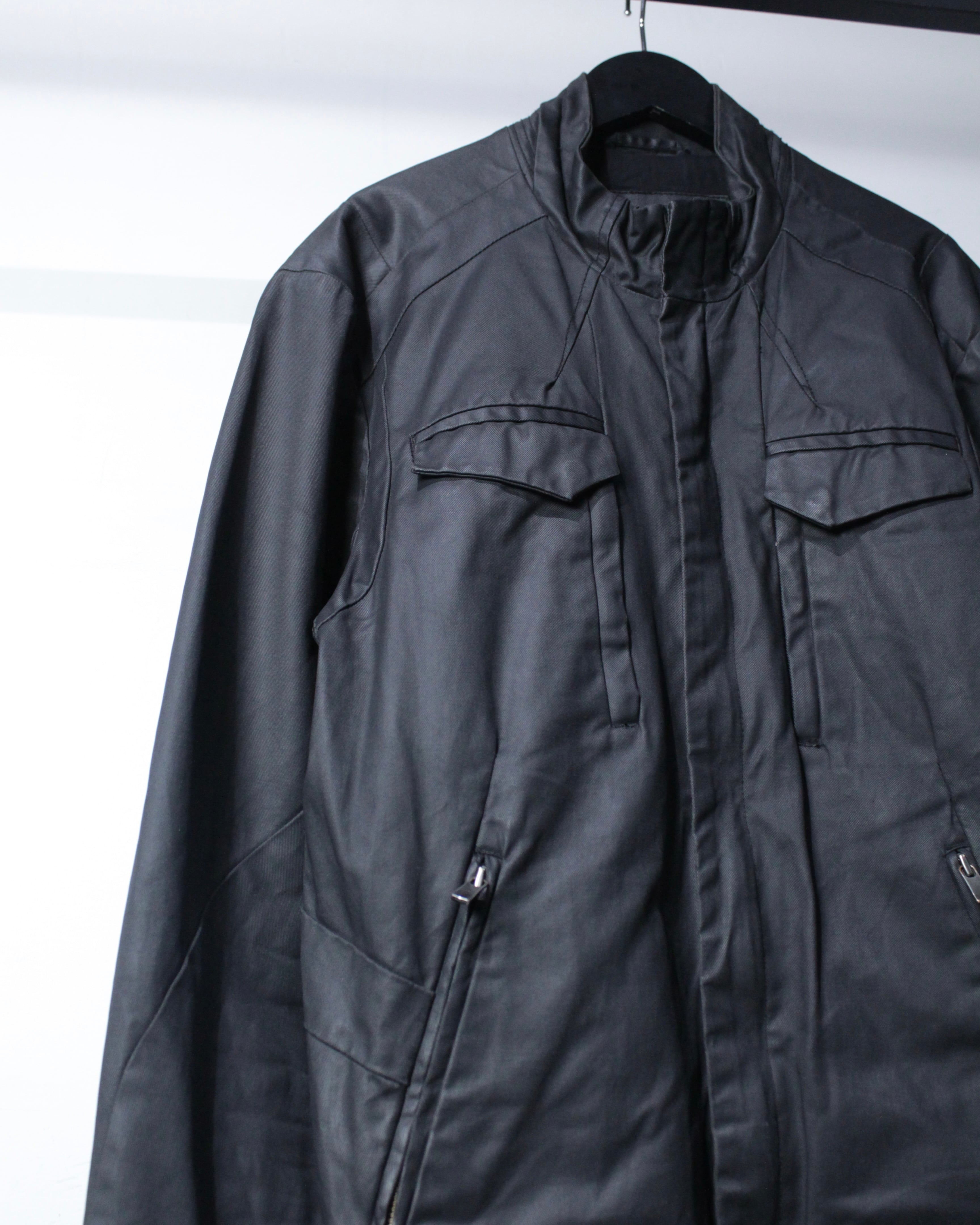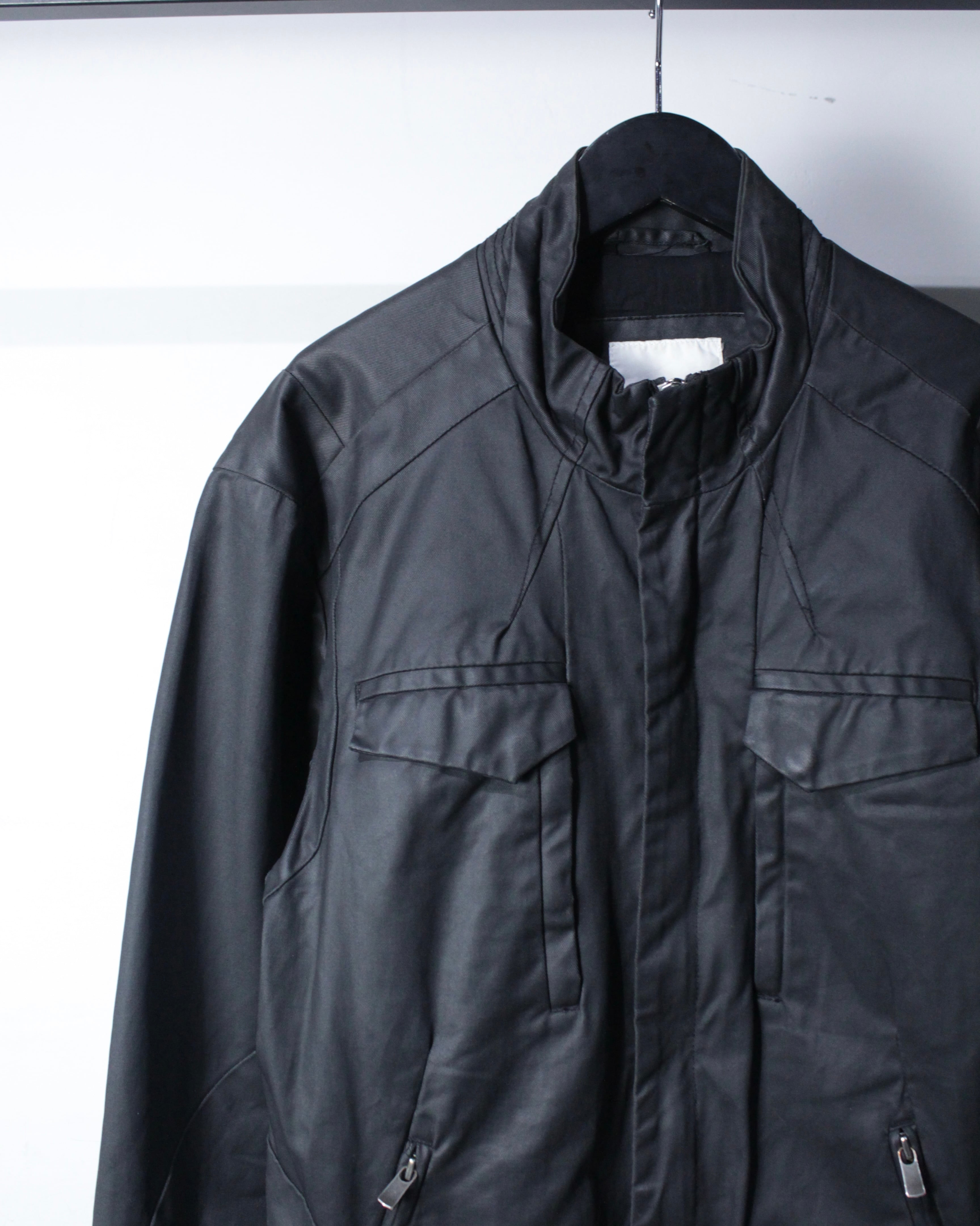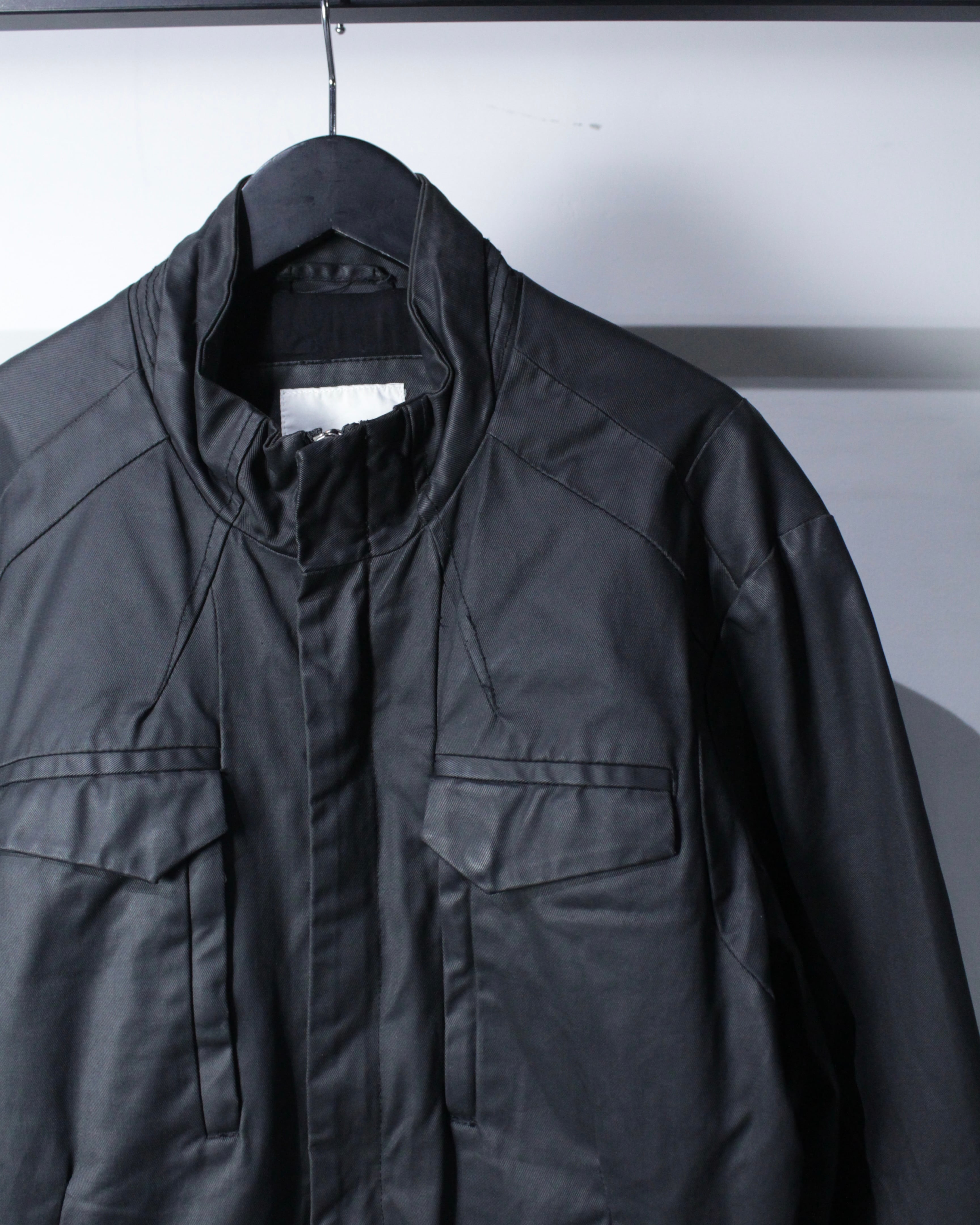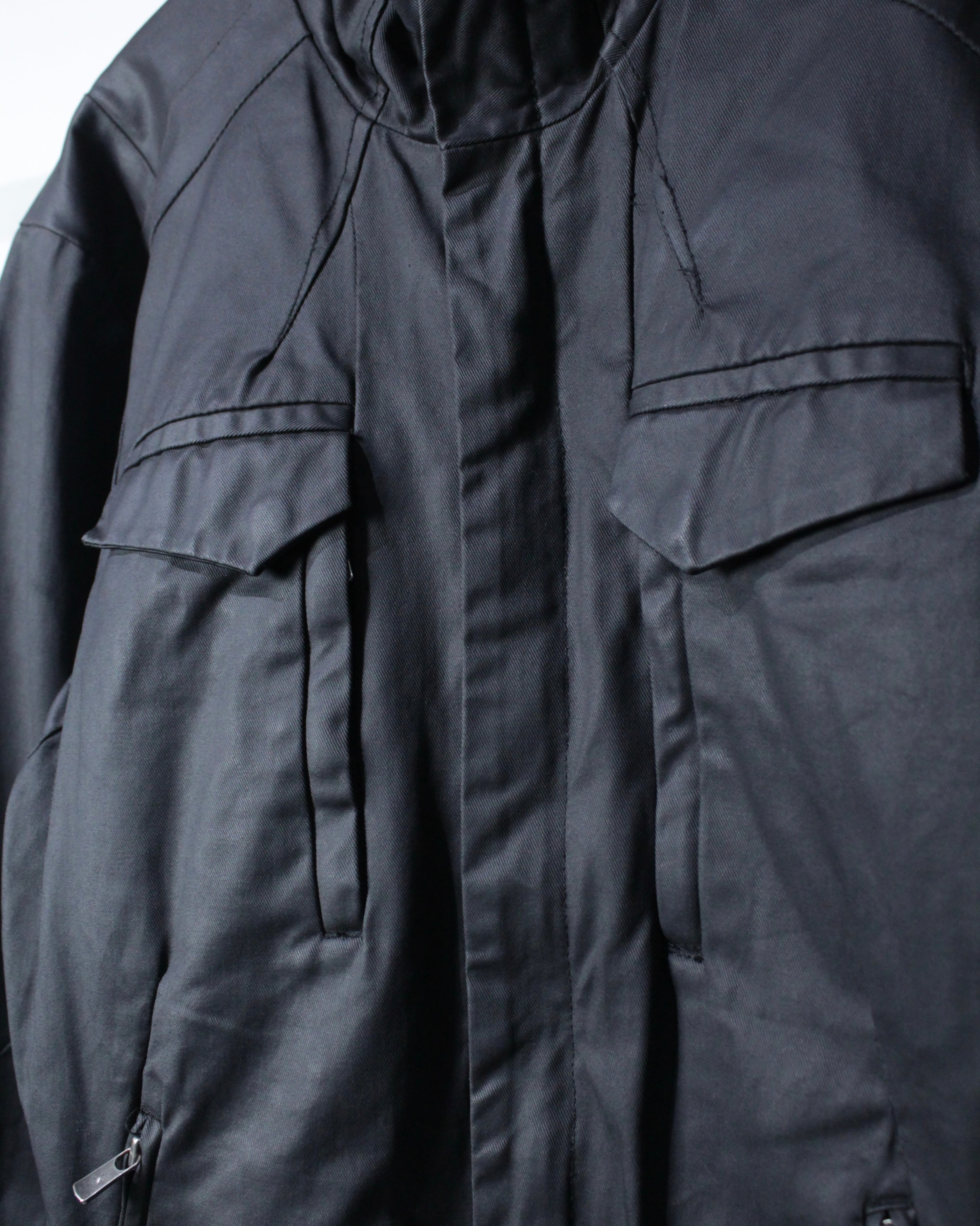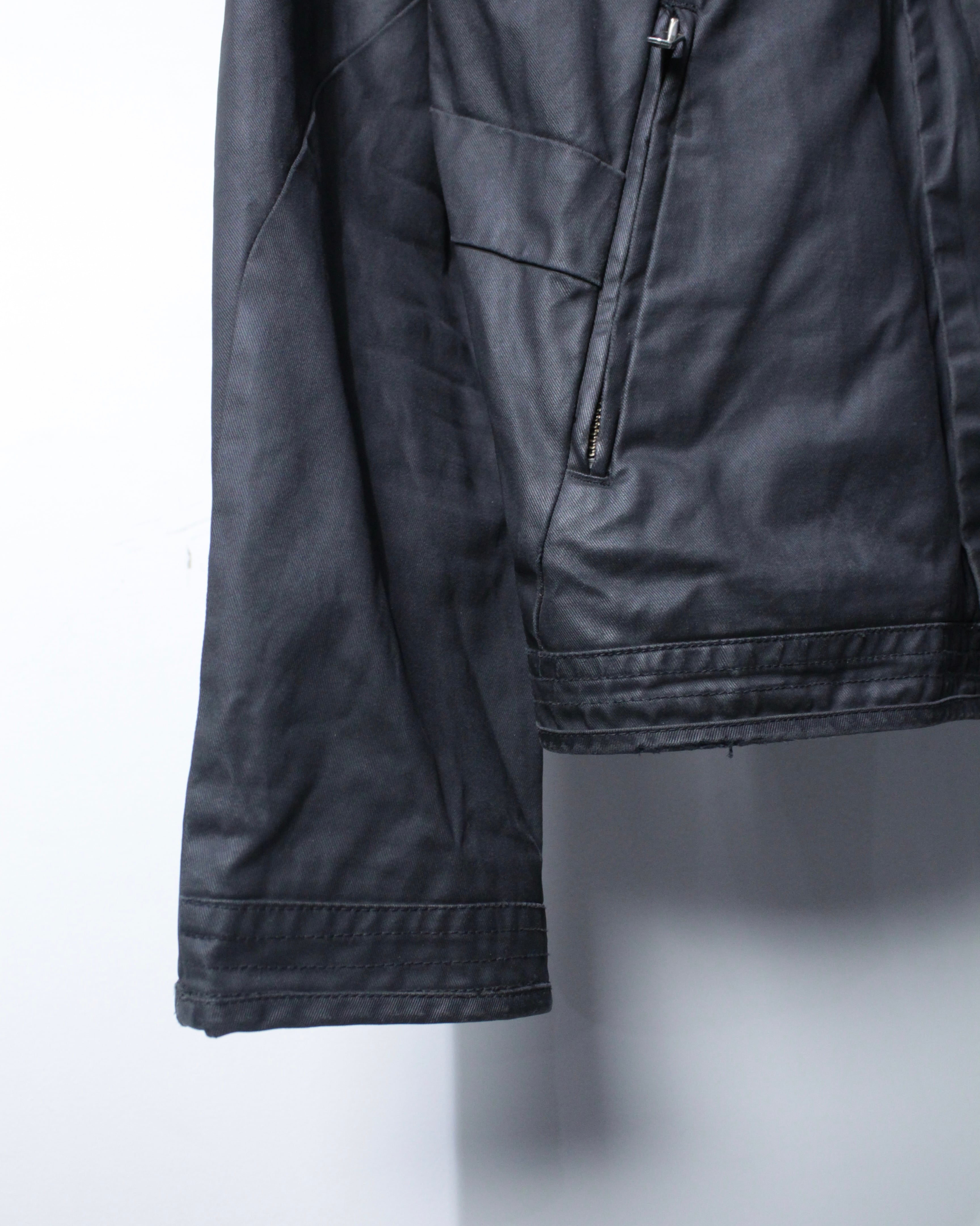 マットな質感のブラックボディにコーティング加工を施し、ナイロンとはまた異なる、しっとりとした鈍い艶感が際立つ1着。ミリタリーやワーク由来のディテールをベースにしながら、都会的でモードな表情へと昇華されています。