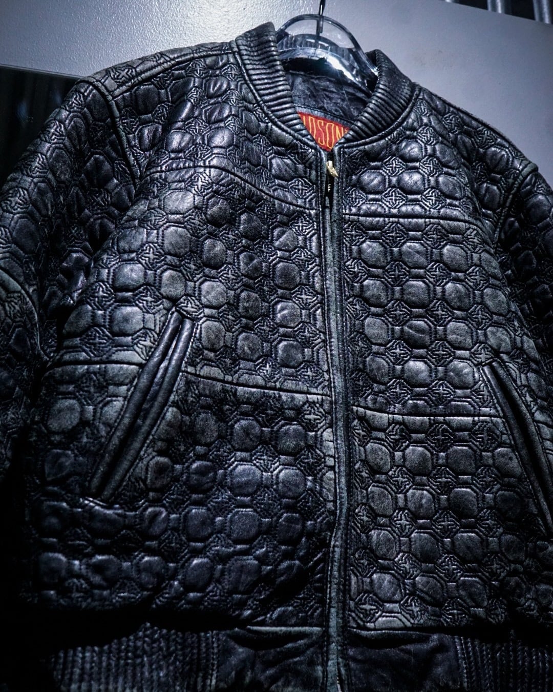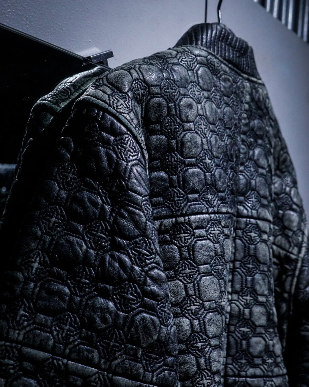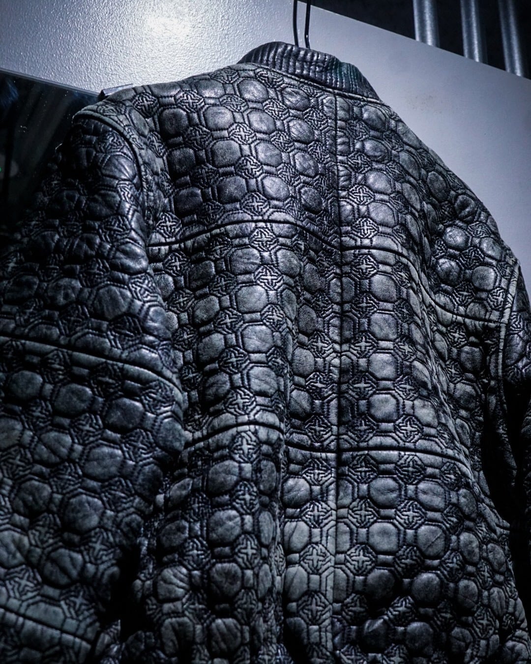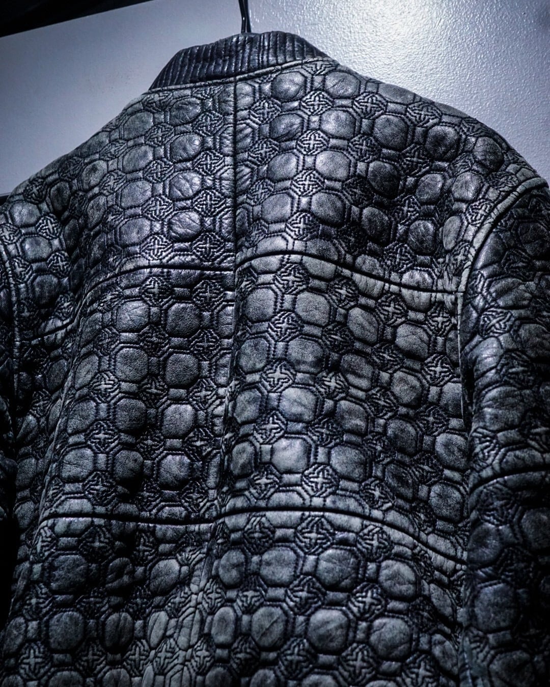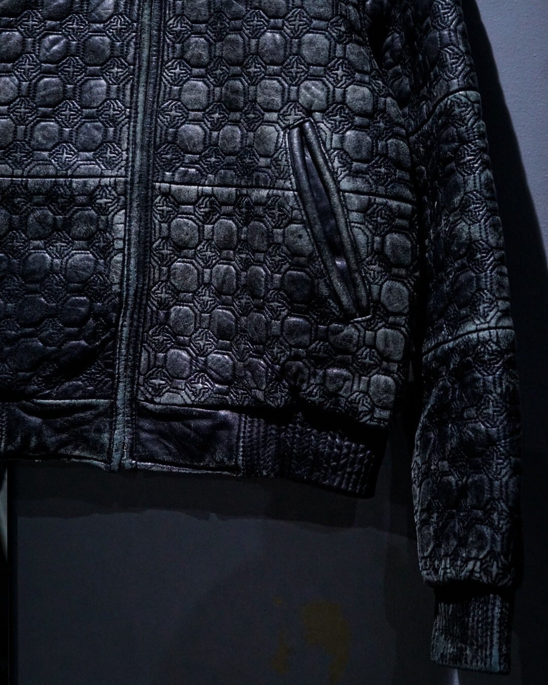ガシッとタフで肉感のあるレザーを用いたボディに、ステッチによって立体感のある幾何学的なデザインをボディに重し込んだボンバージャケット。