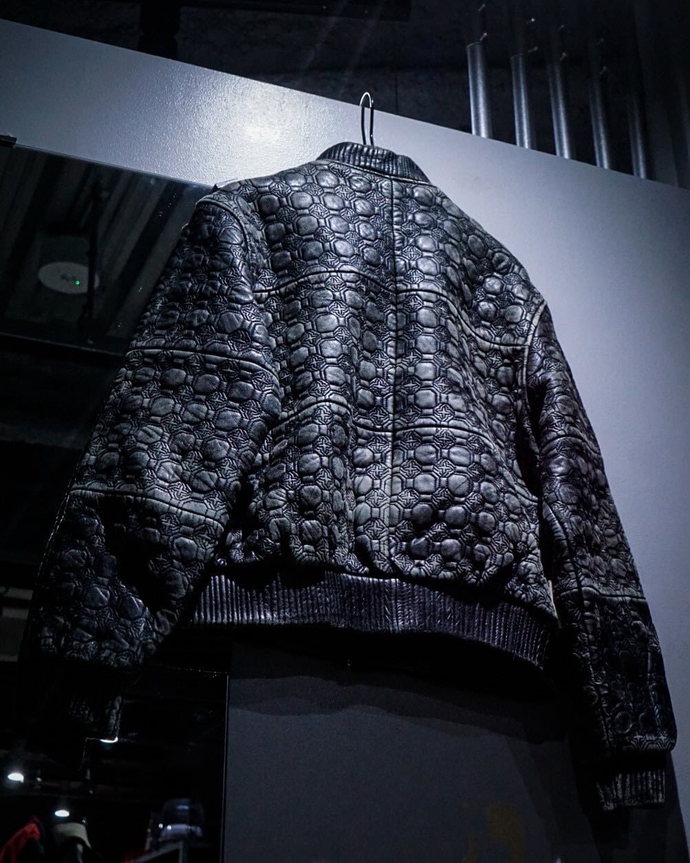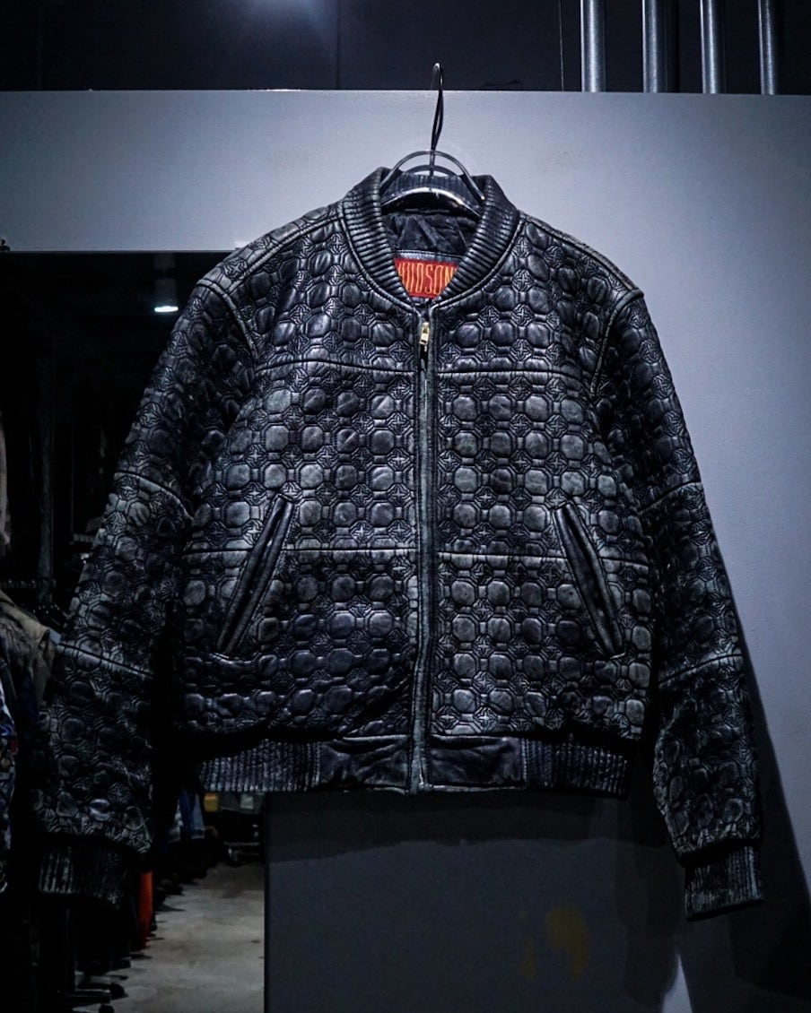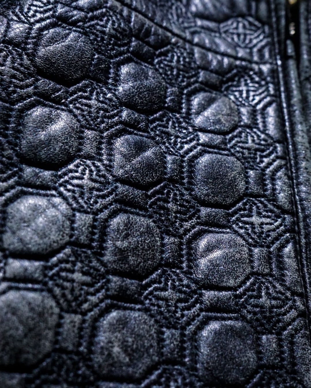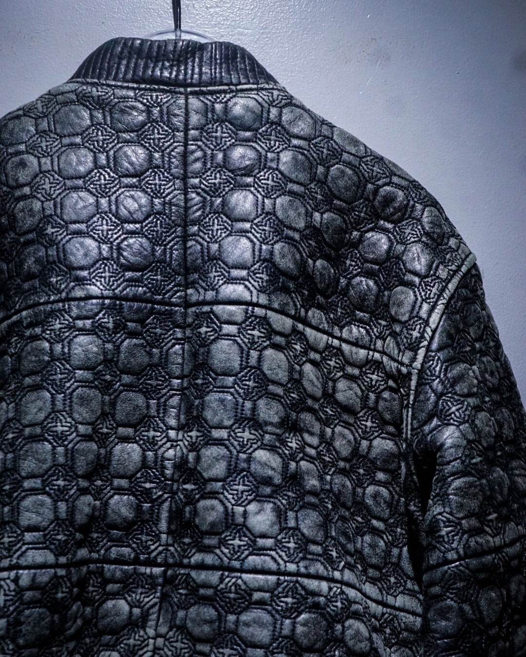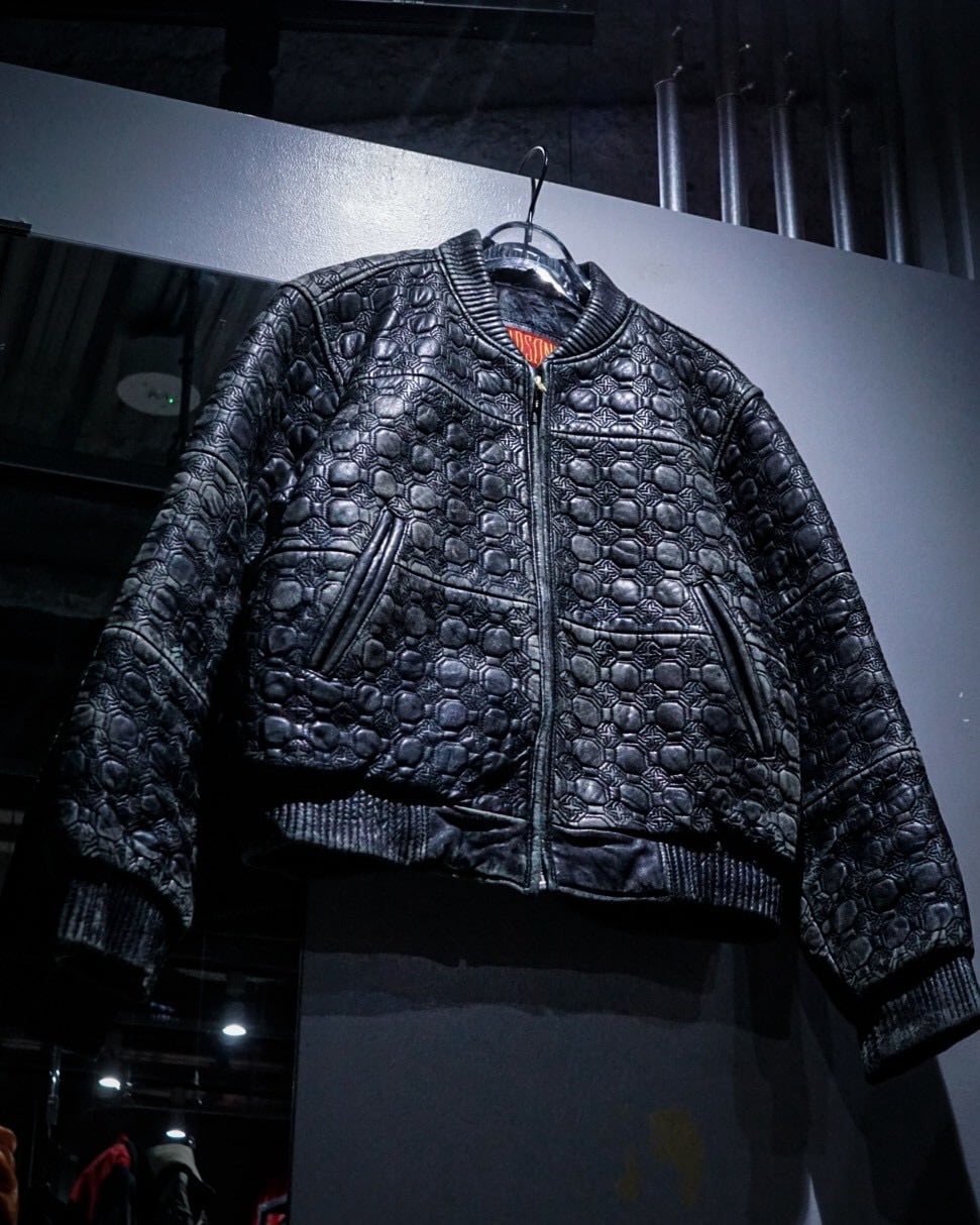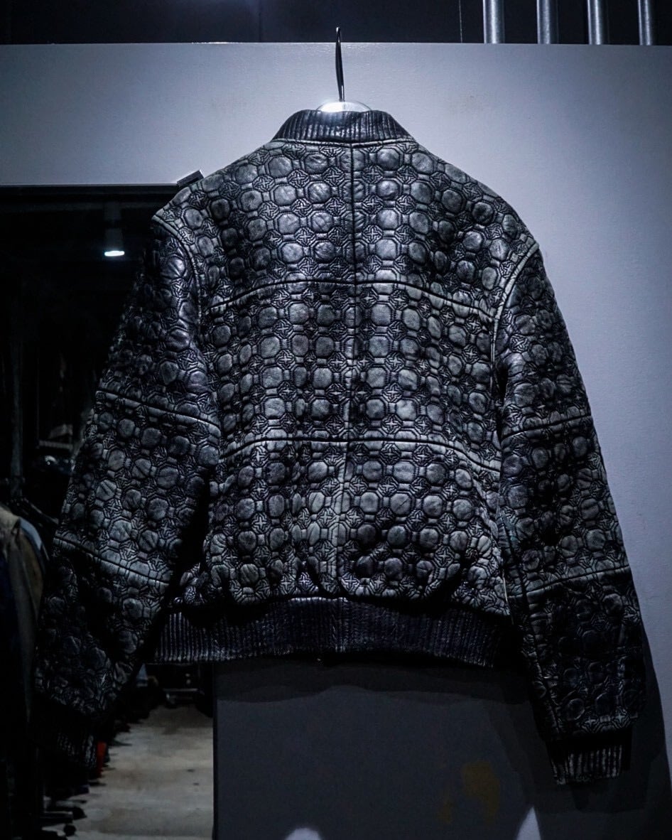 ガシッとタフで肉感のあるレザーを用いたボディに、ステッチによって立体感のある幾何学的なデザインをボディに重し込んだボンバージャケット。