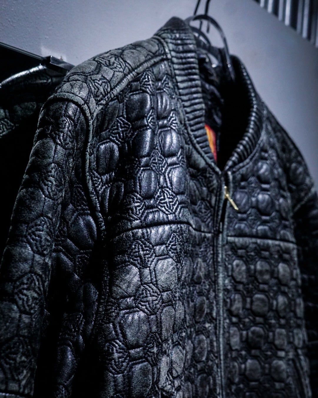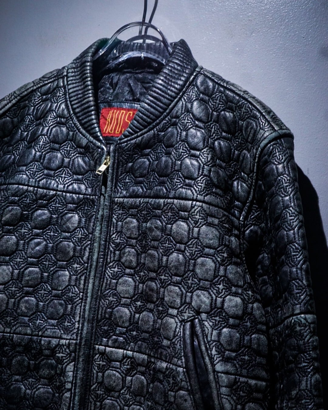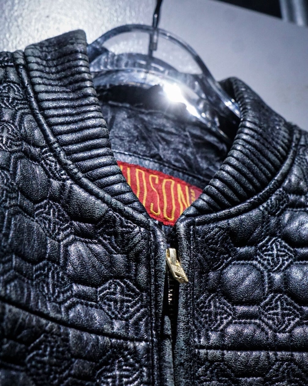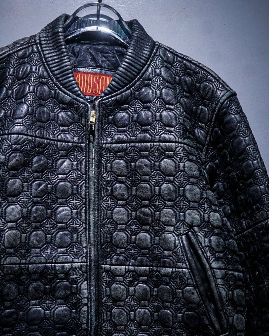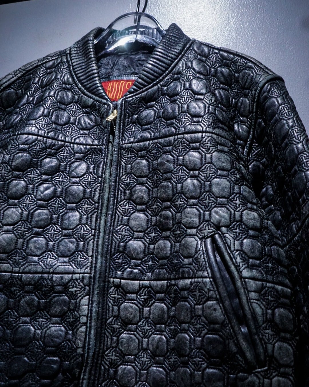 ガシッとタフで肉感のあるレザーを用いたボディに、ステッチによって立体感のある幾何学的なデザインをボディに重し込んだボンバージャケット。