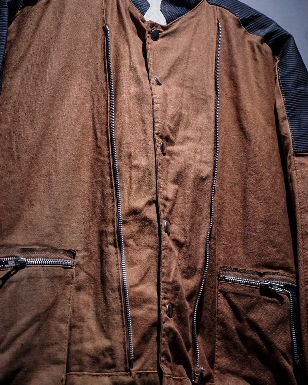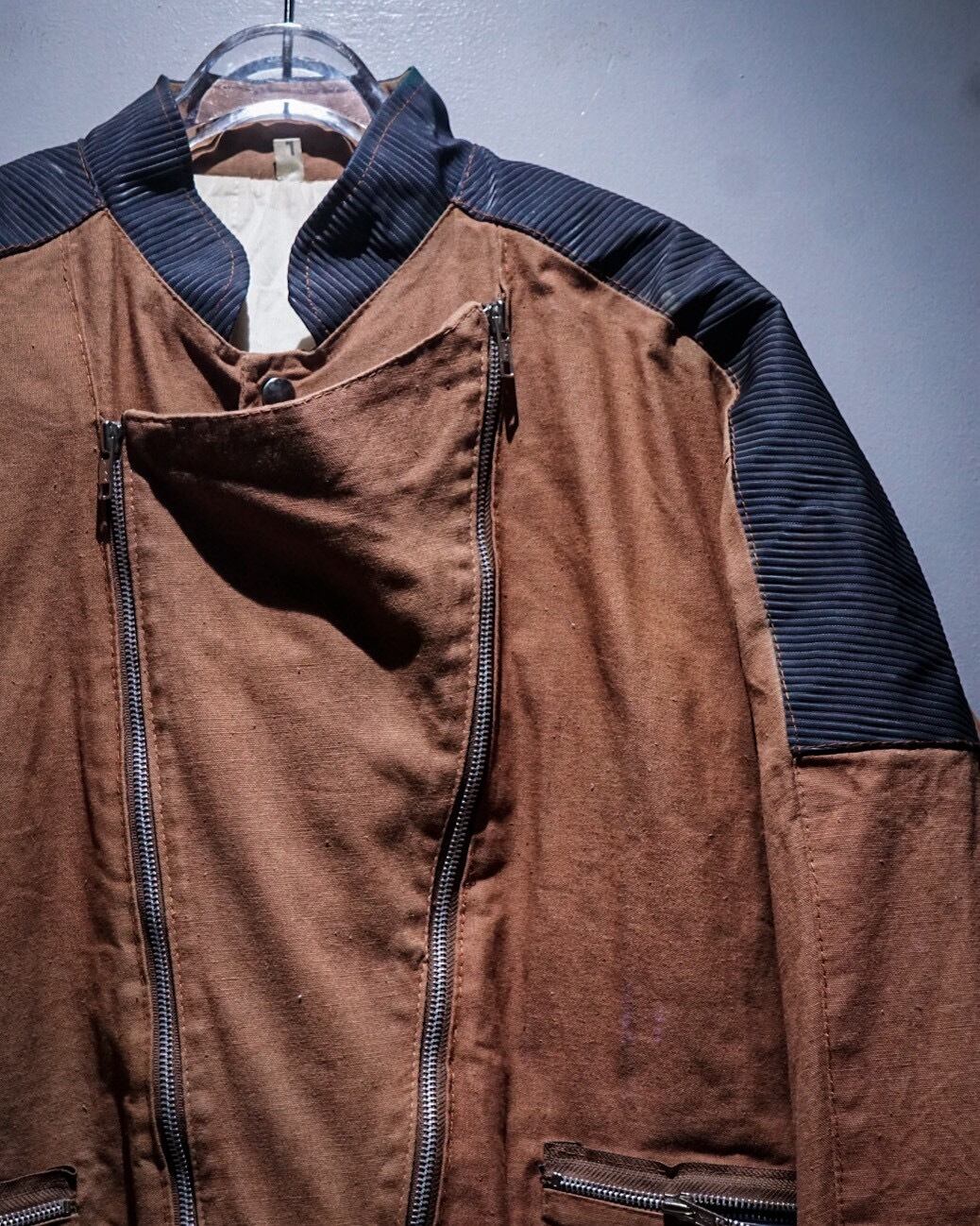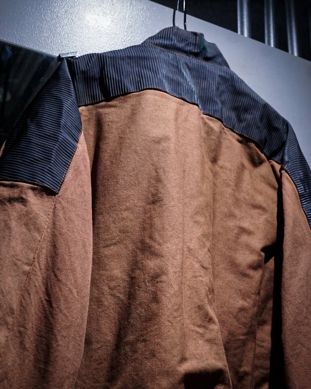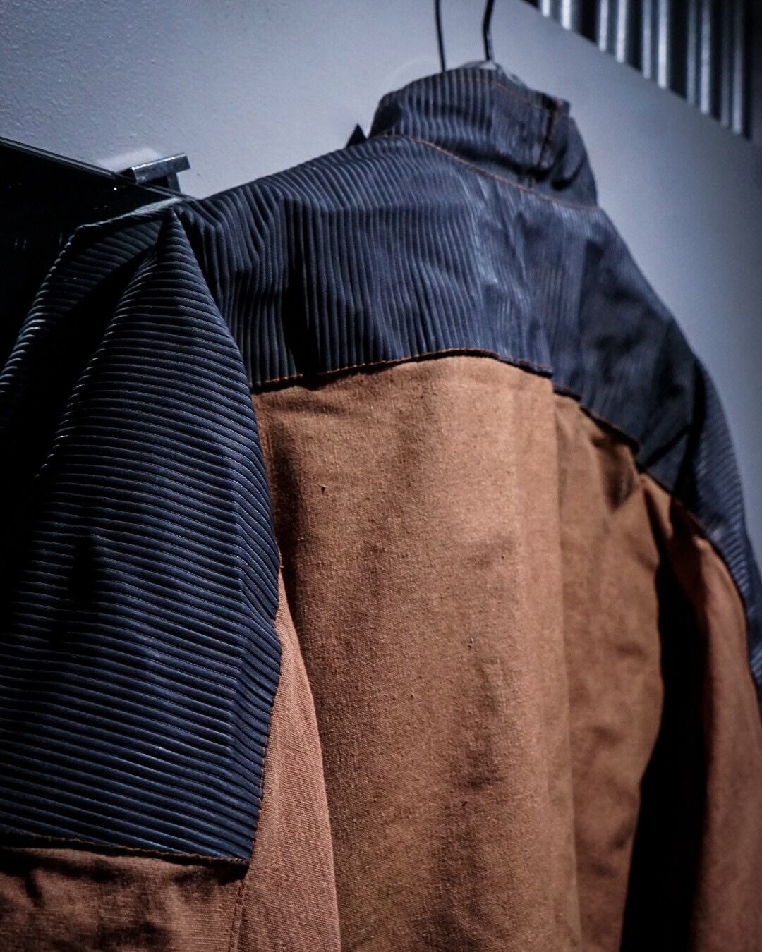 ボディにはブラウンのコットンファブリックを用い、肩から上腕、バックヨークにかけてはタフな異素材で切り替えたデザインが際立つ1着。