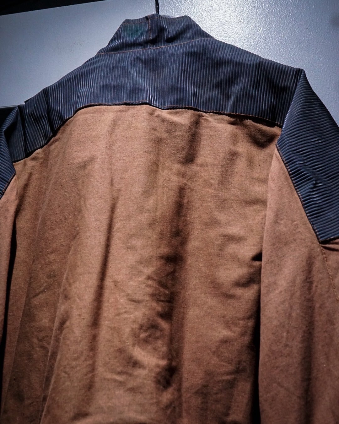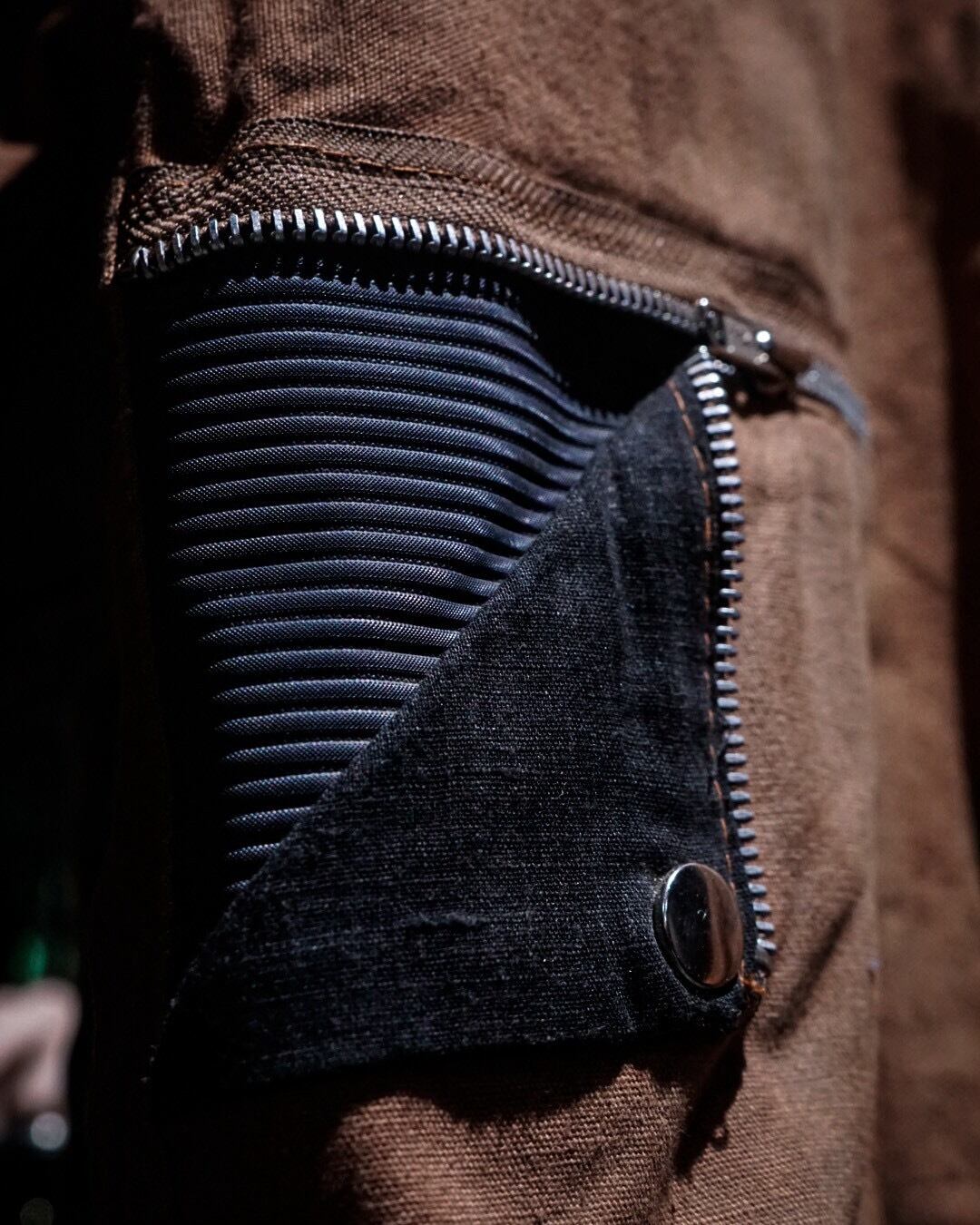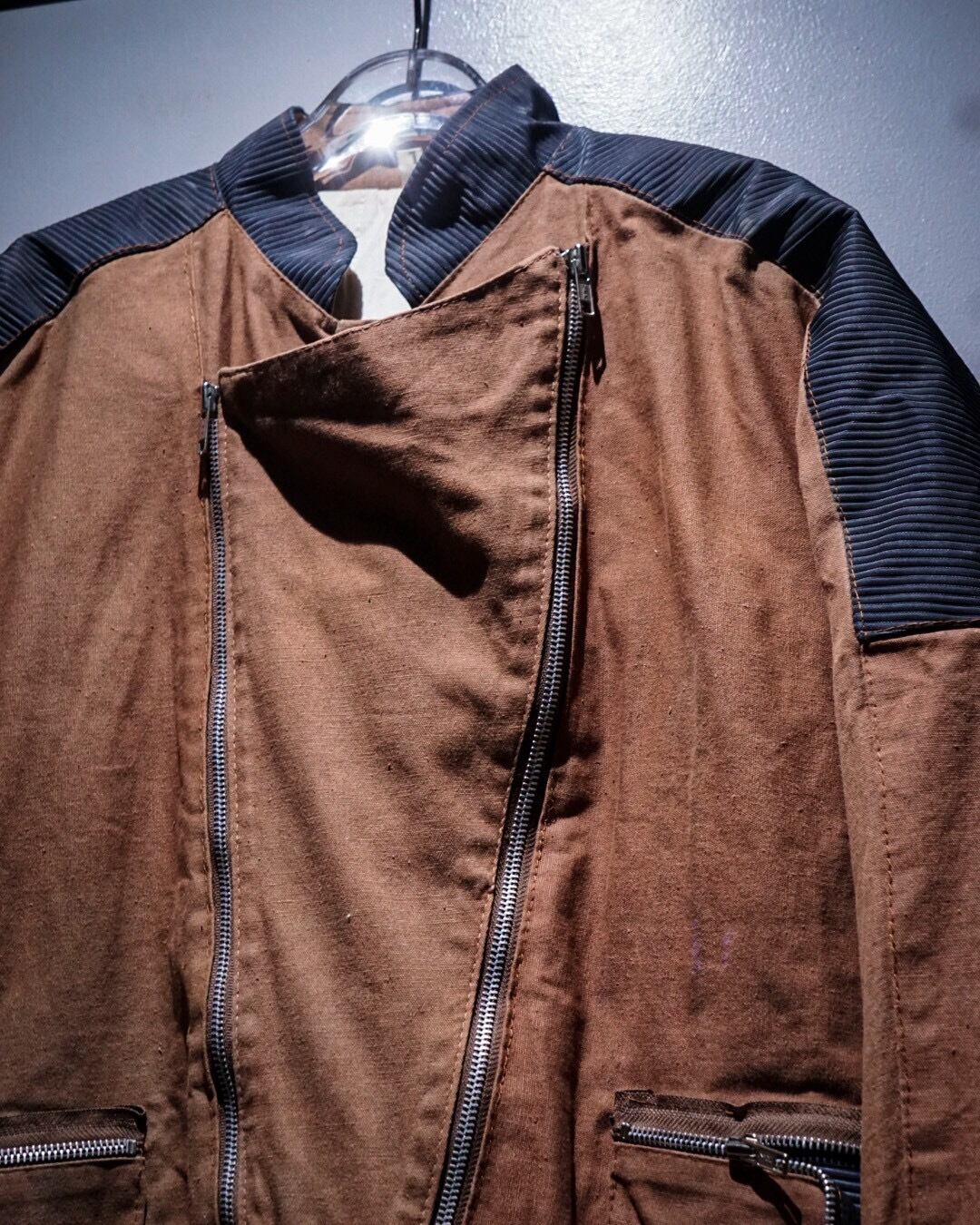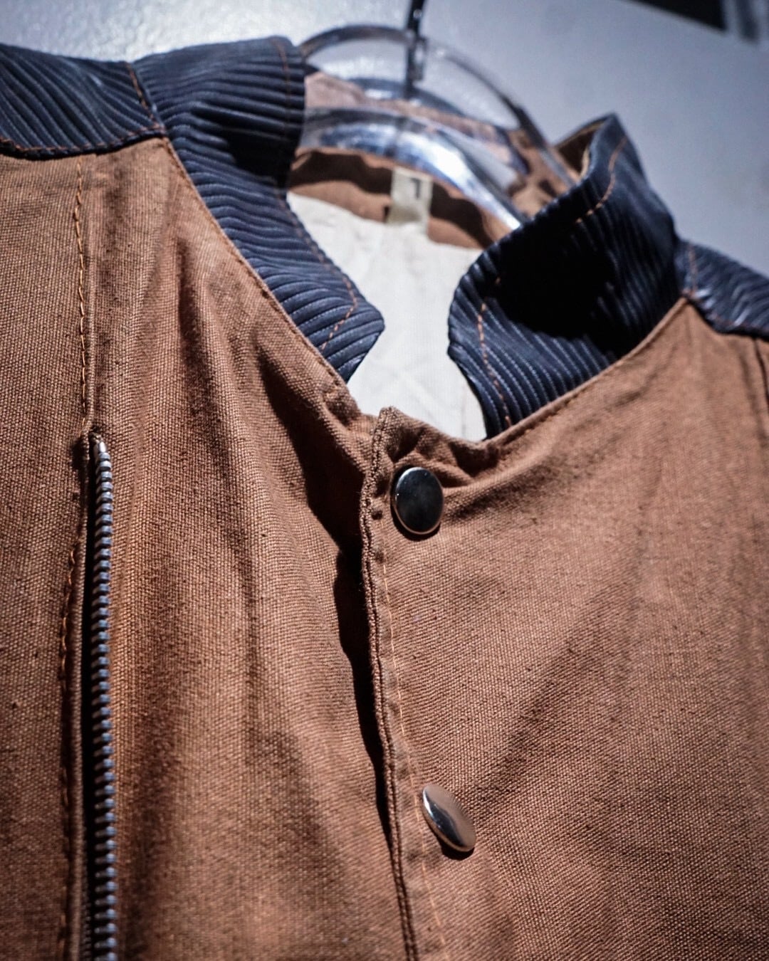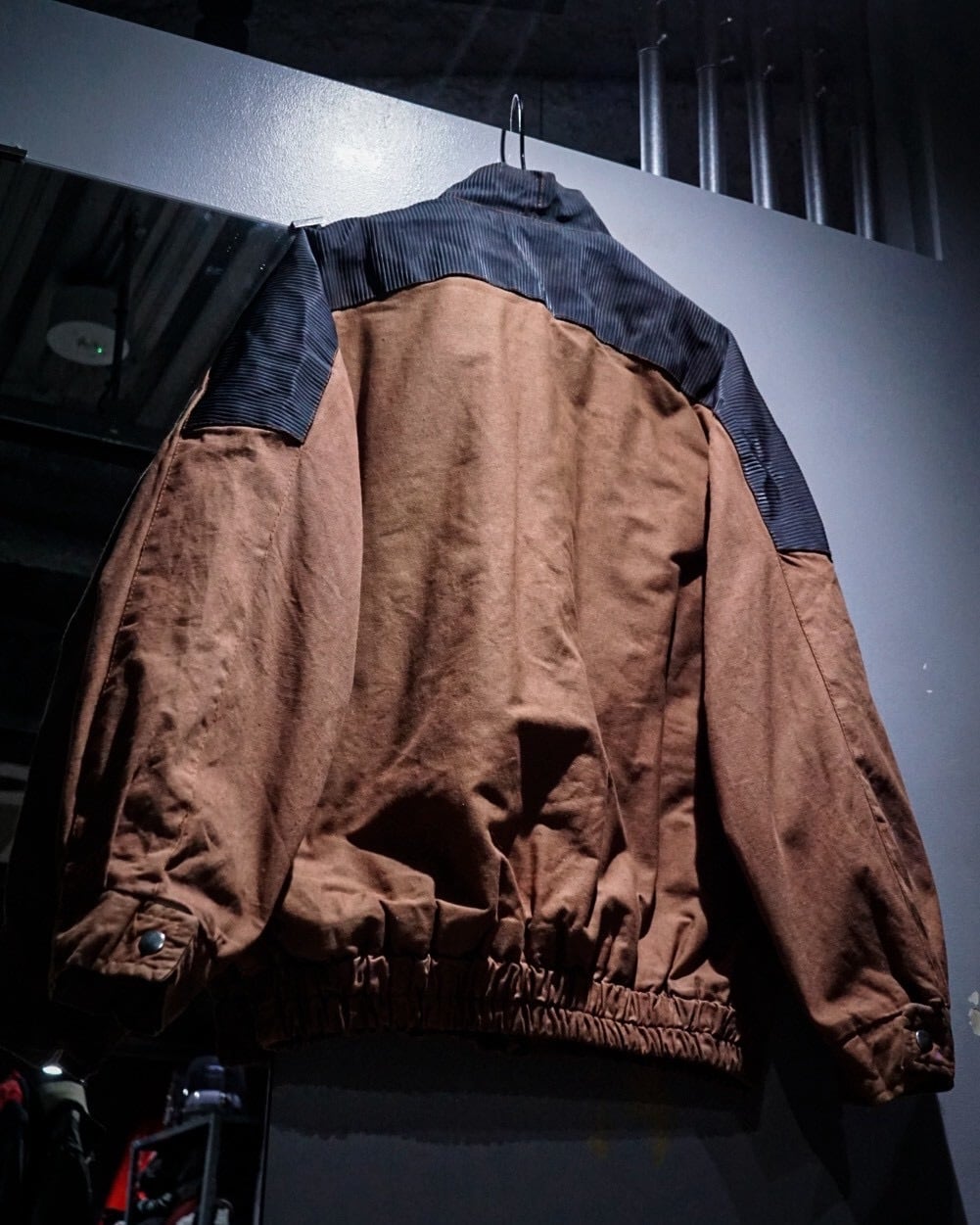 ボディにはブラウンのコットンファブリックを用い、肩から上腕、バックヨークにかけてはタフな異素材で切り替えたデザインが際立つ1着。