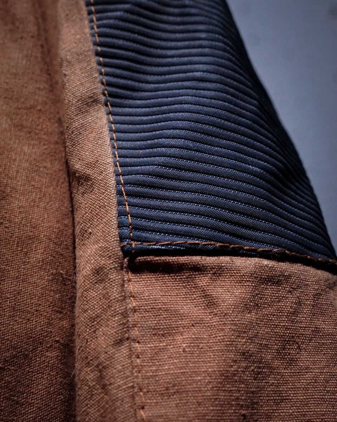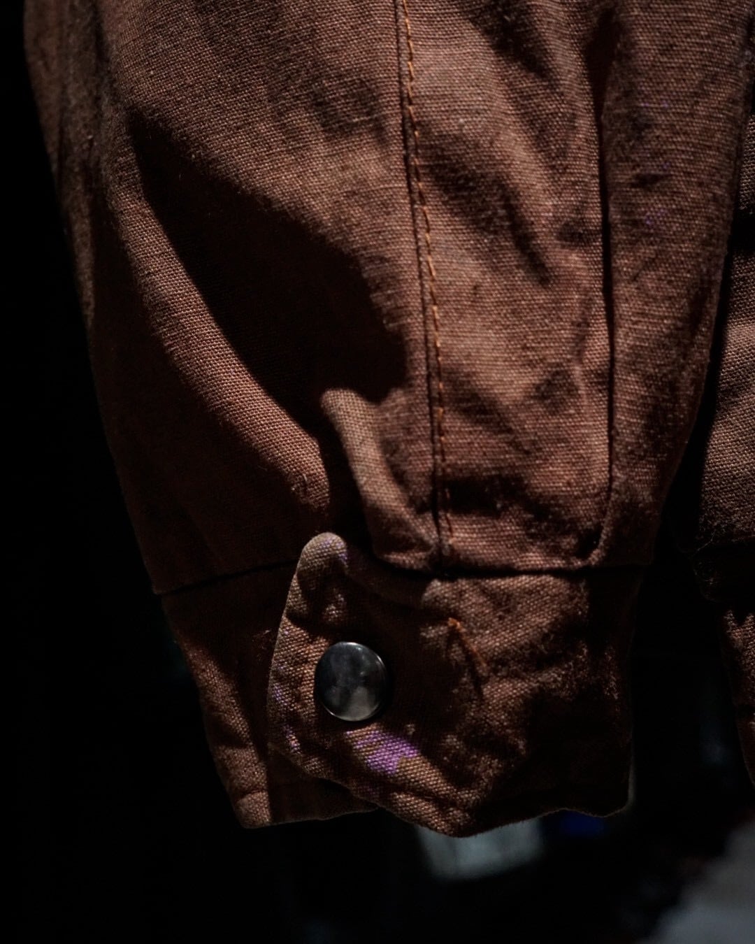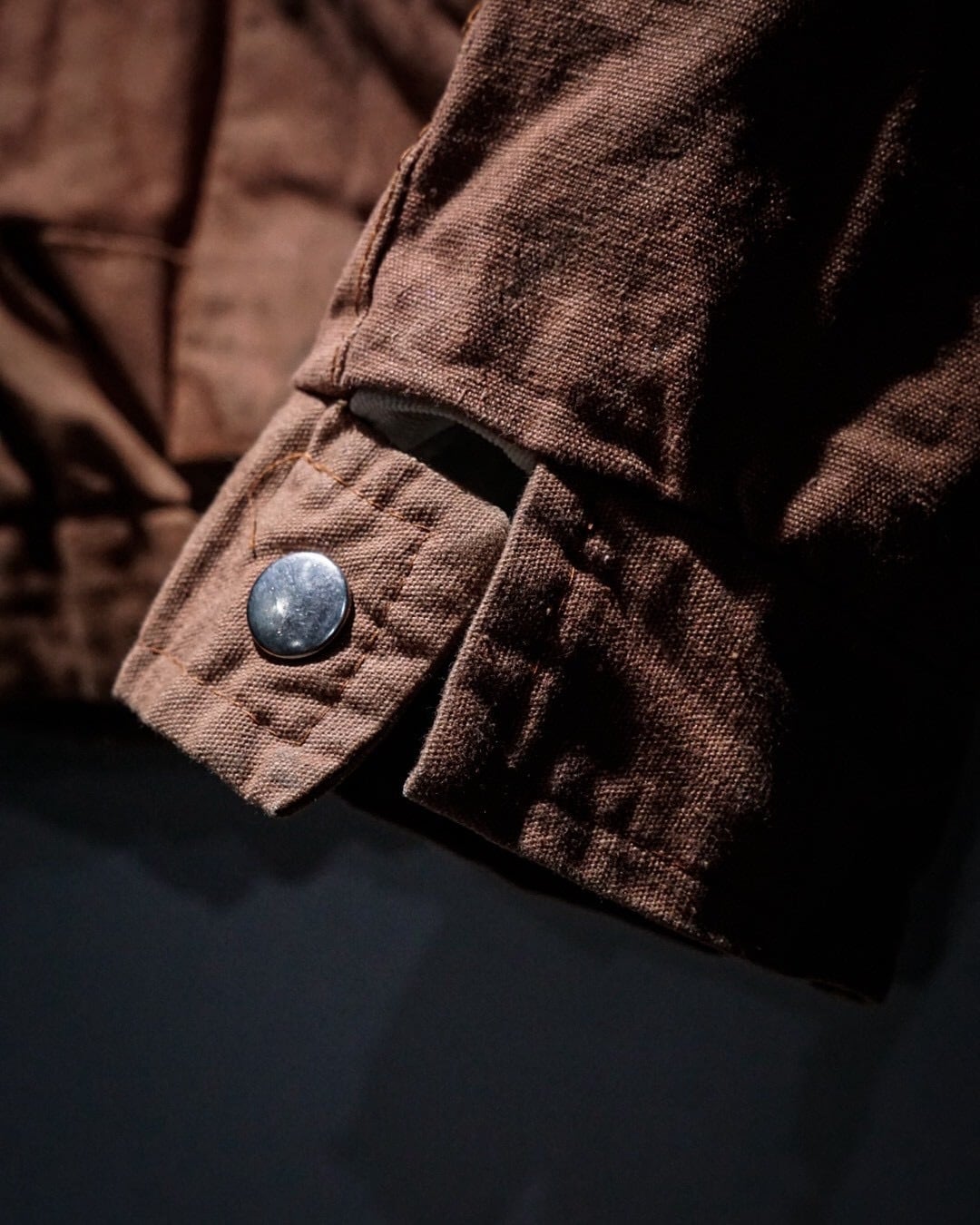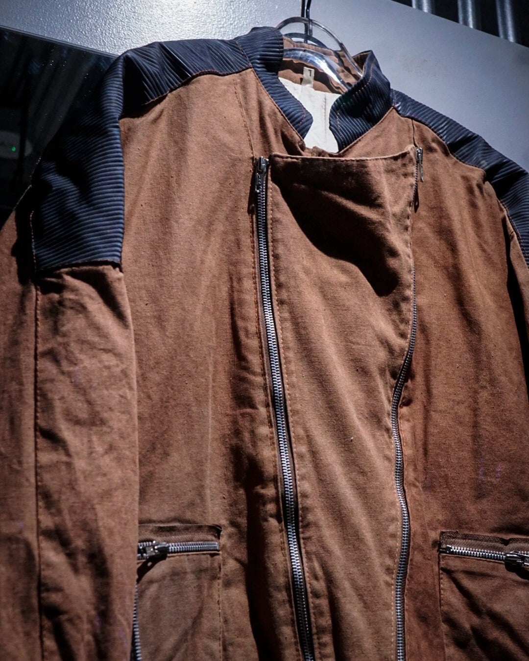 ボディにはブラウンのコットンファブリックを用い、肩から上腕、バックヨークにかけてはタフな異素材で切り替えたデザインが際立つ1着。