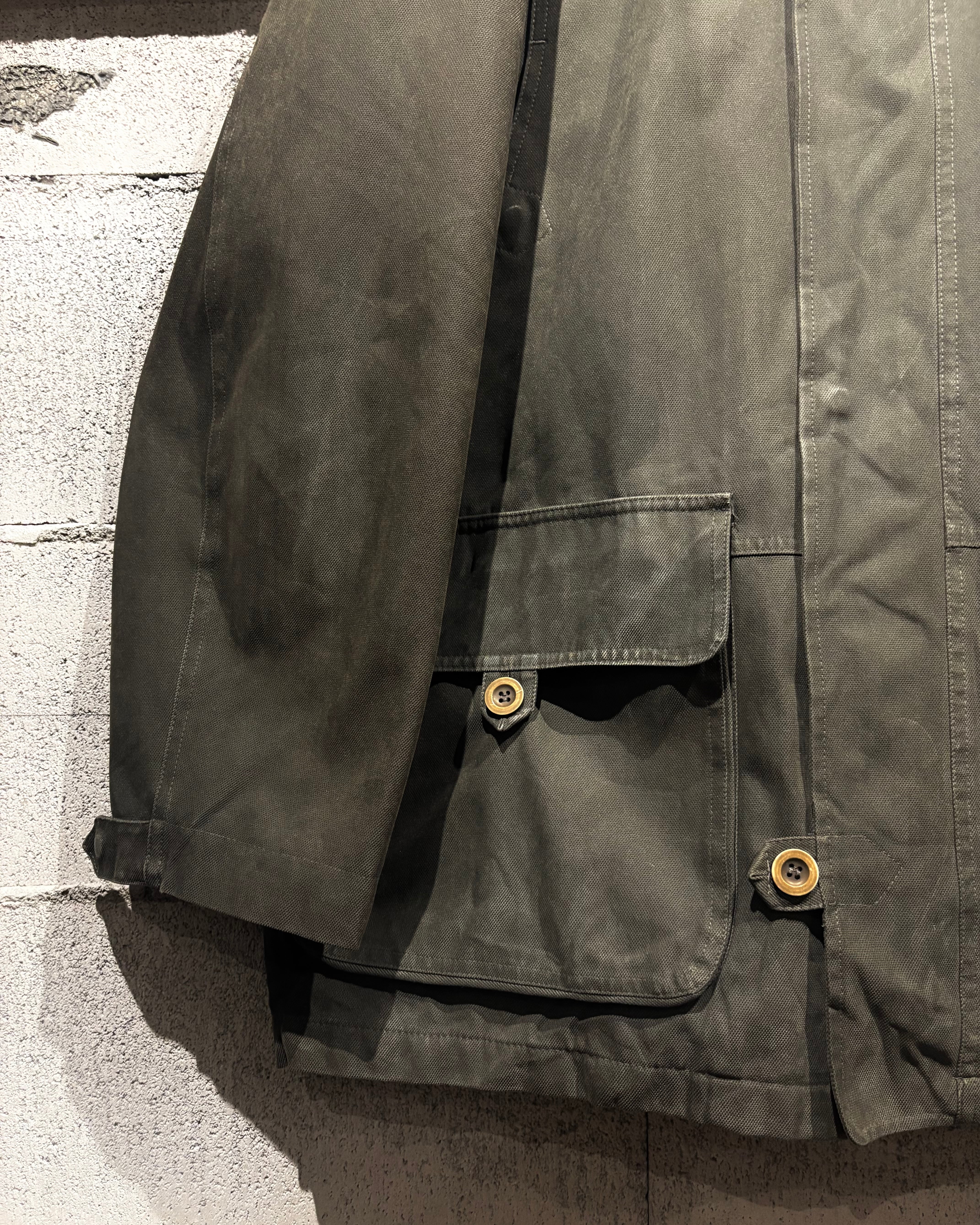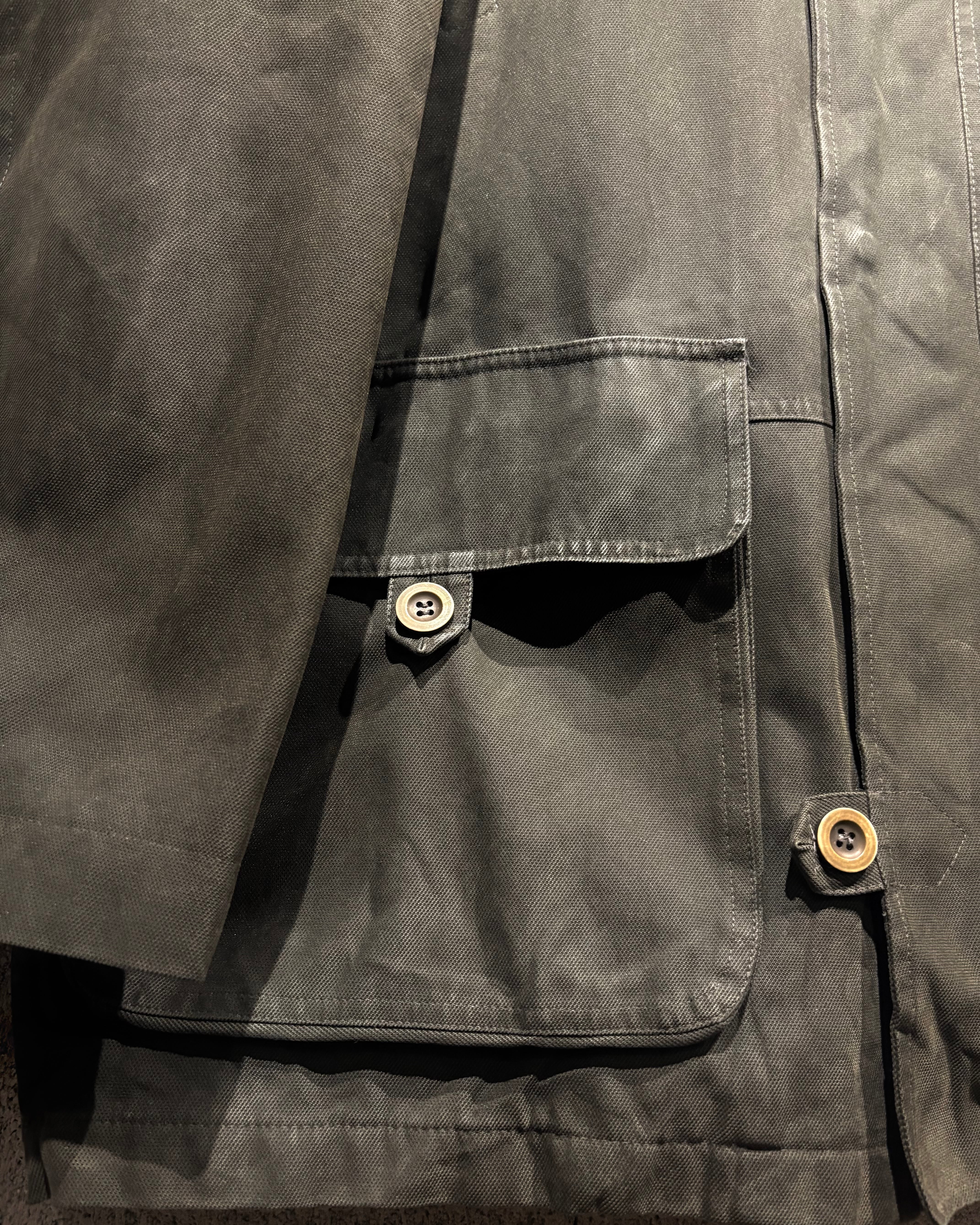 ワークウェアをルーツに持つカバーオールをベースに、落ち着いたオリーブトーンのボディ。程よくフェードした生地の表情が、長年着込まれたかのような奥行きを演出しています。