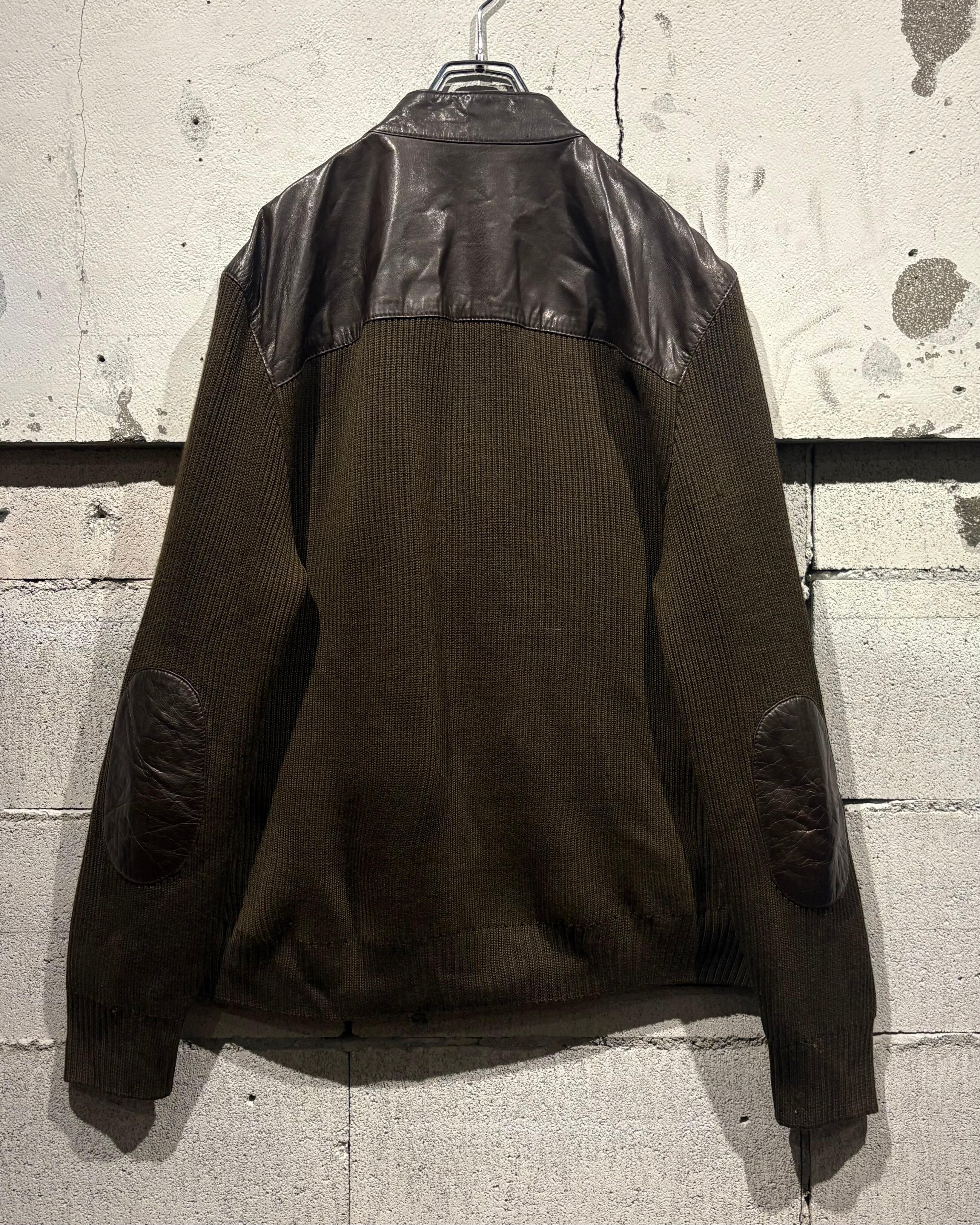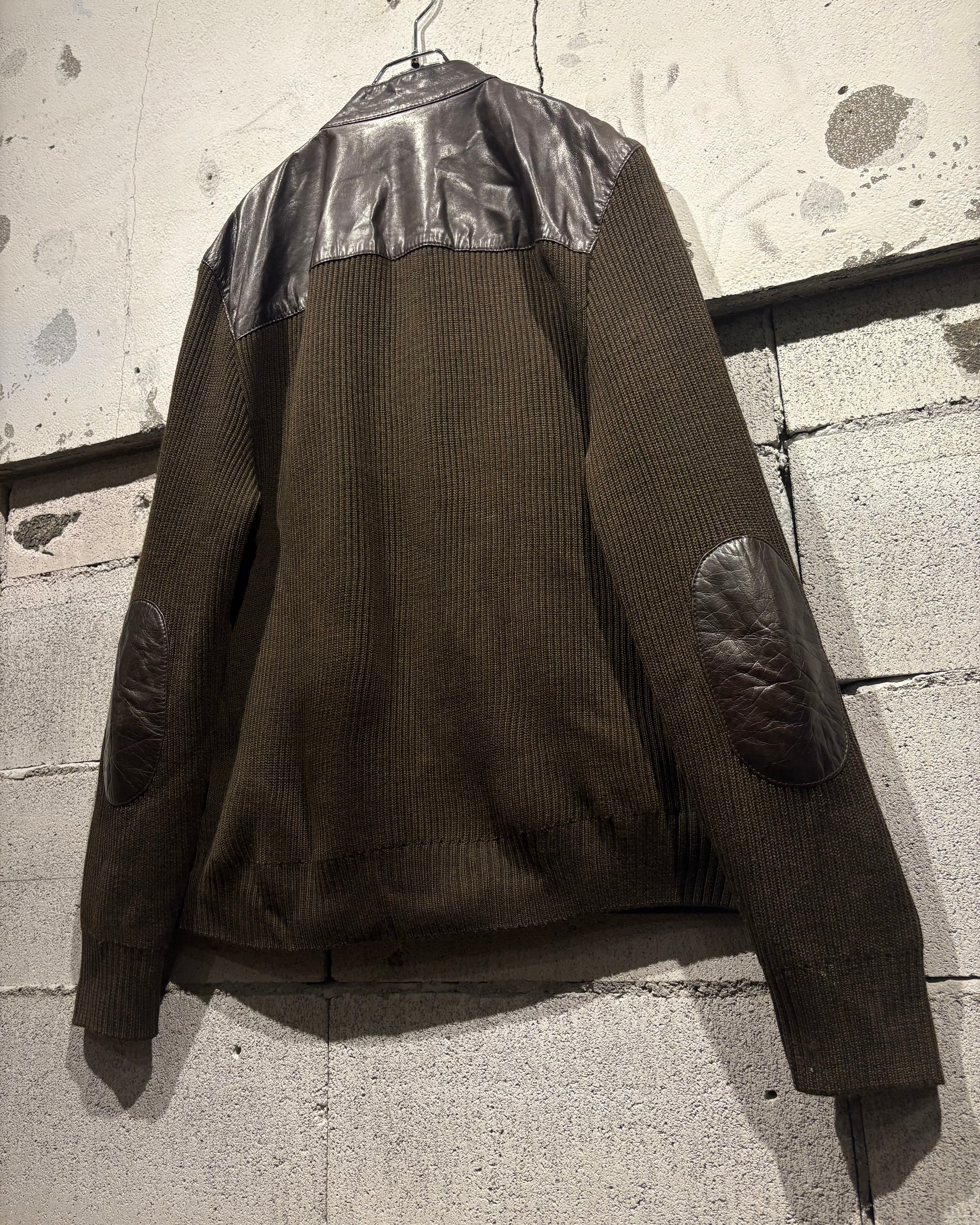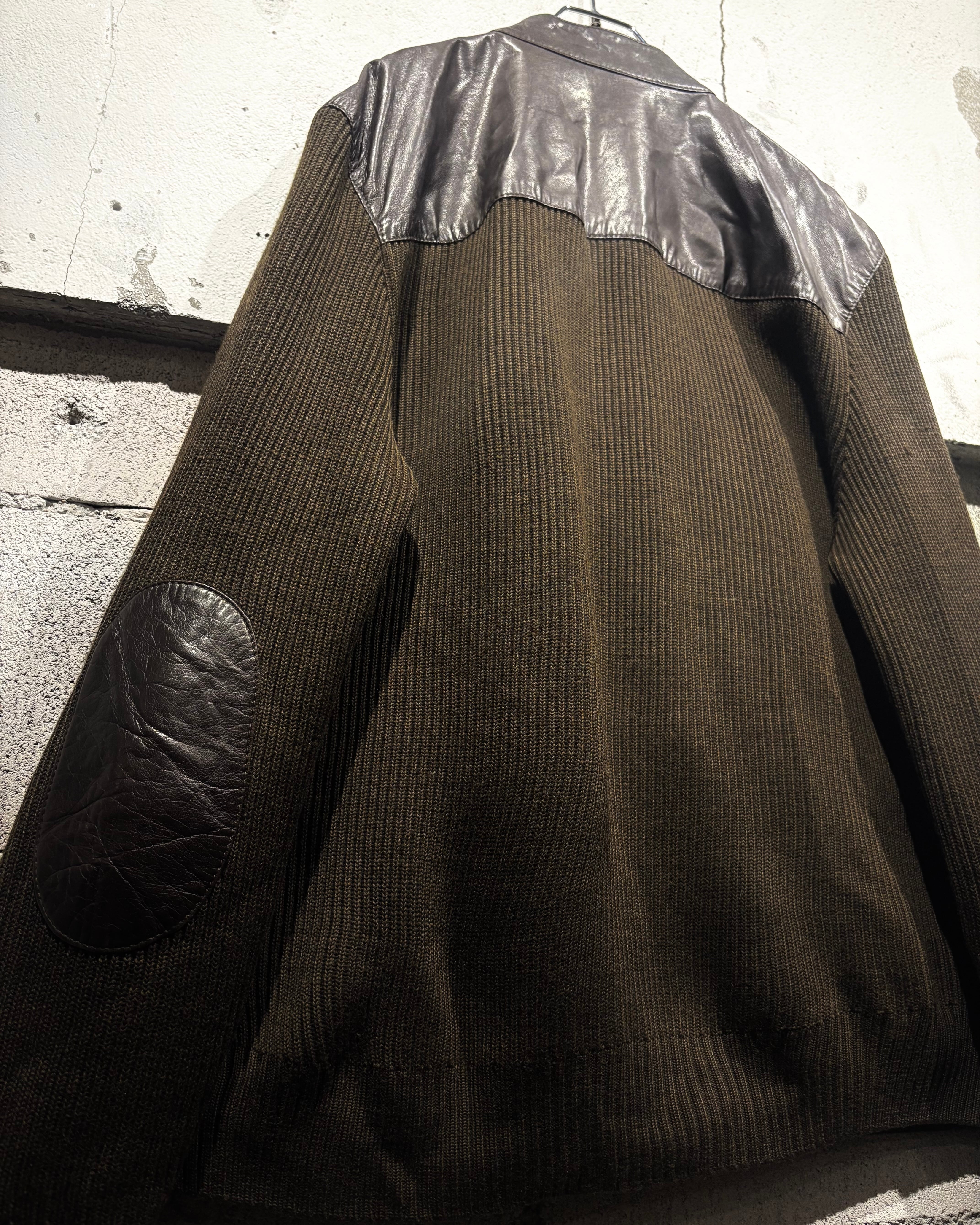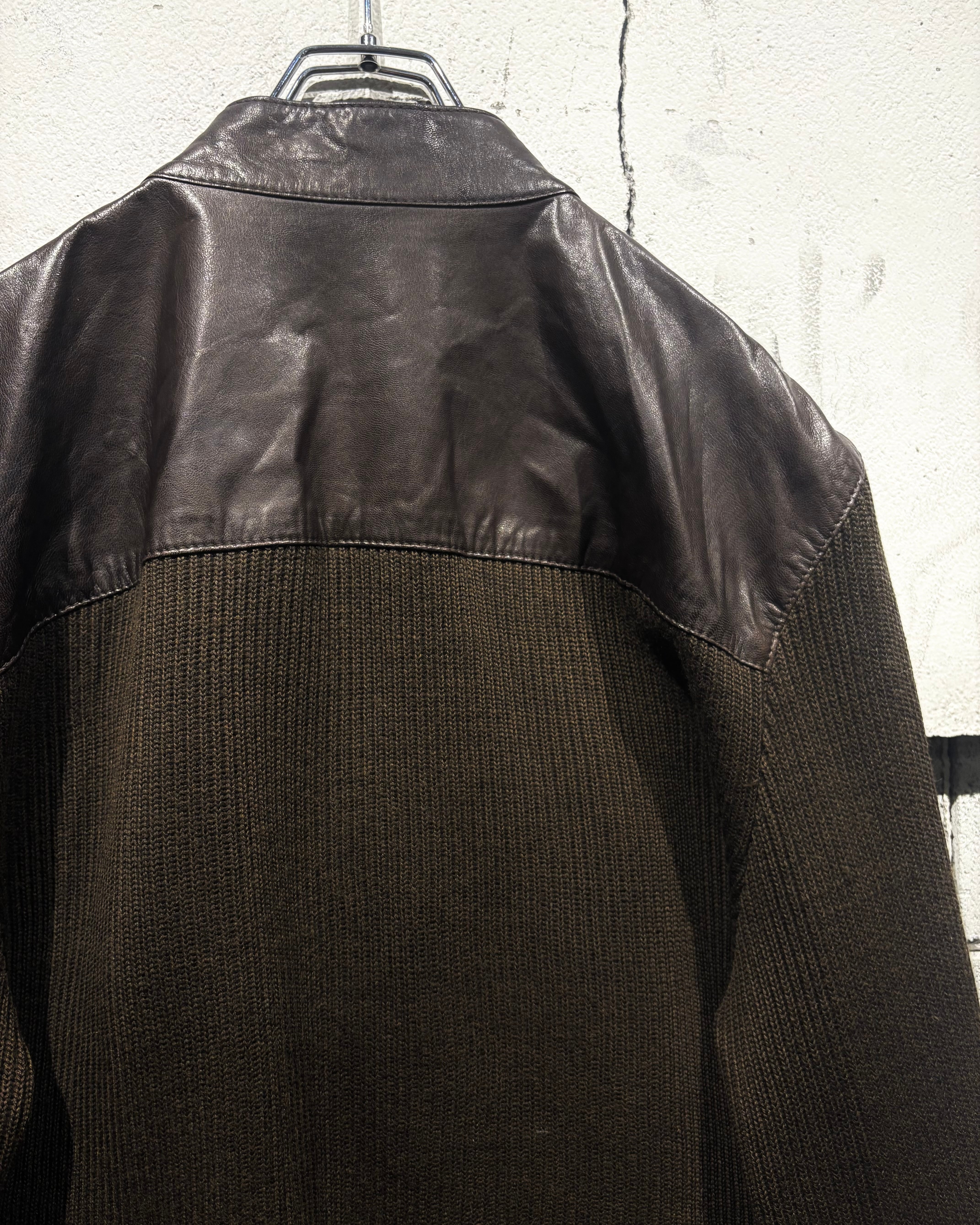 ボディには落ち着いたトーンのニット素材を採用し、フロントや肩周りに上質なレザーを切り替えで配置。レザー特有の艶と、ニットの柔らかな質感がコントラストを生み、奥行きのある表情を与えています。