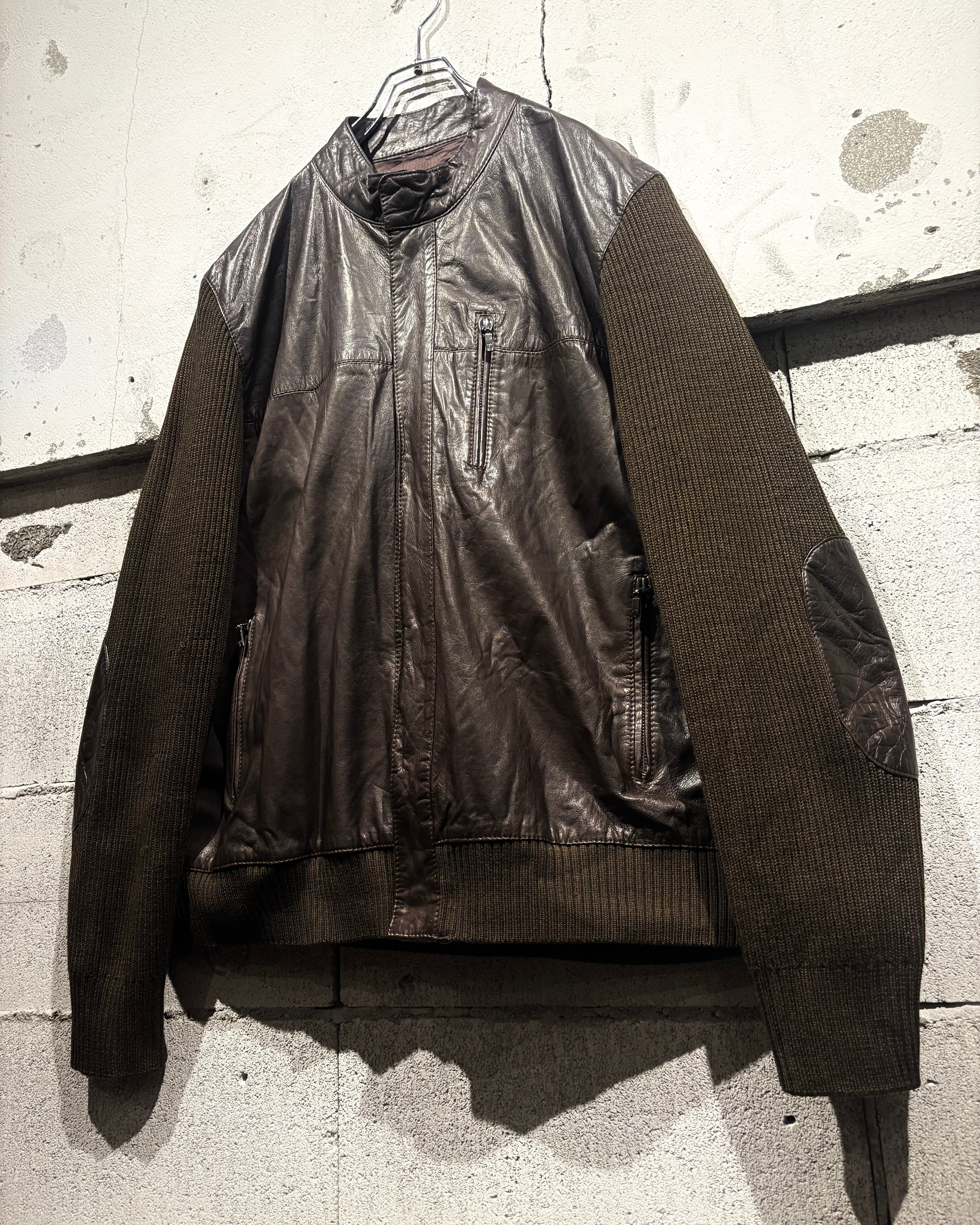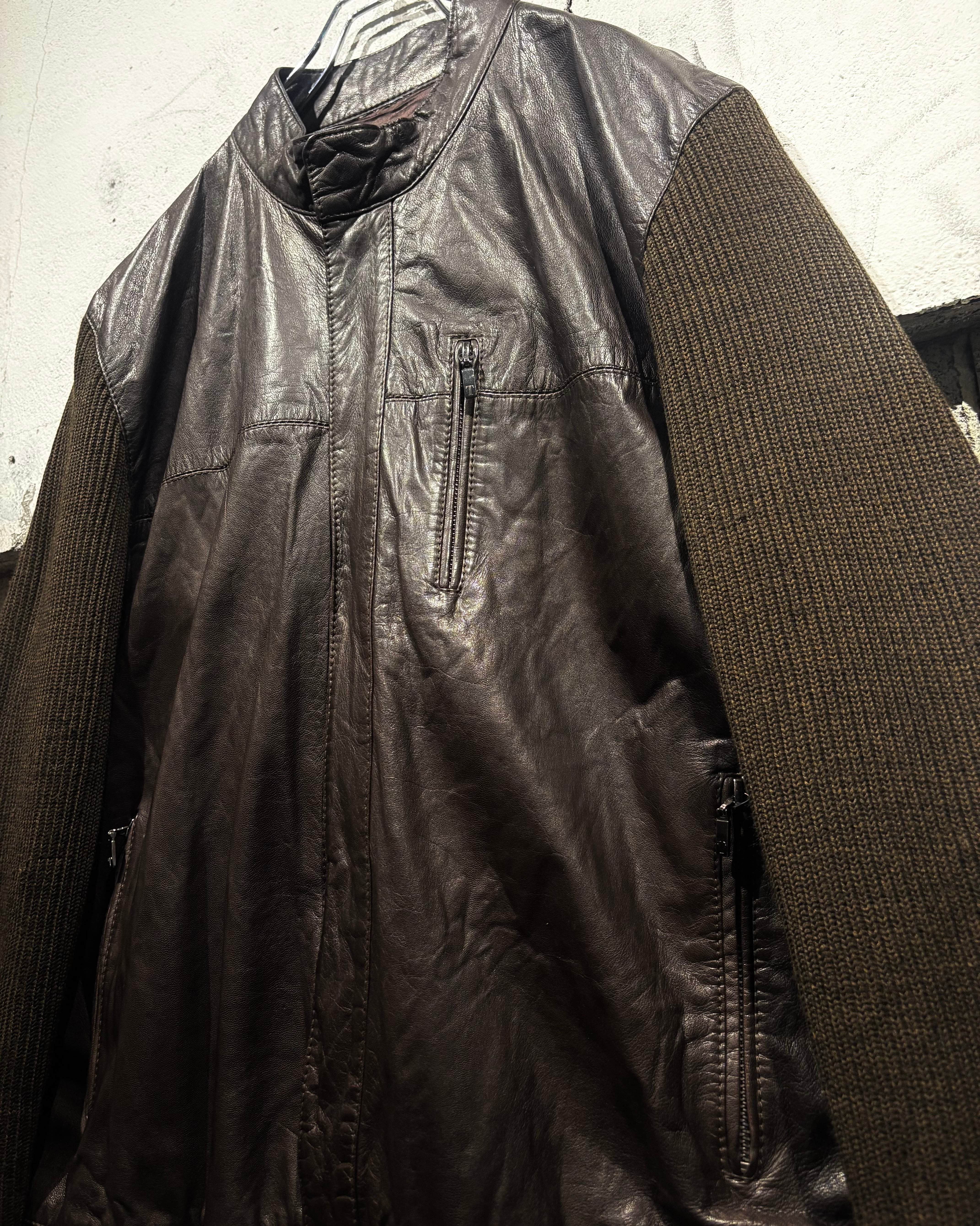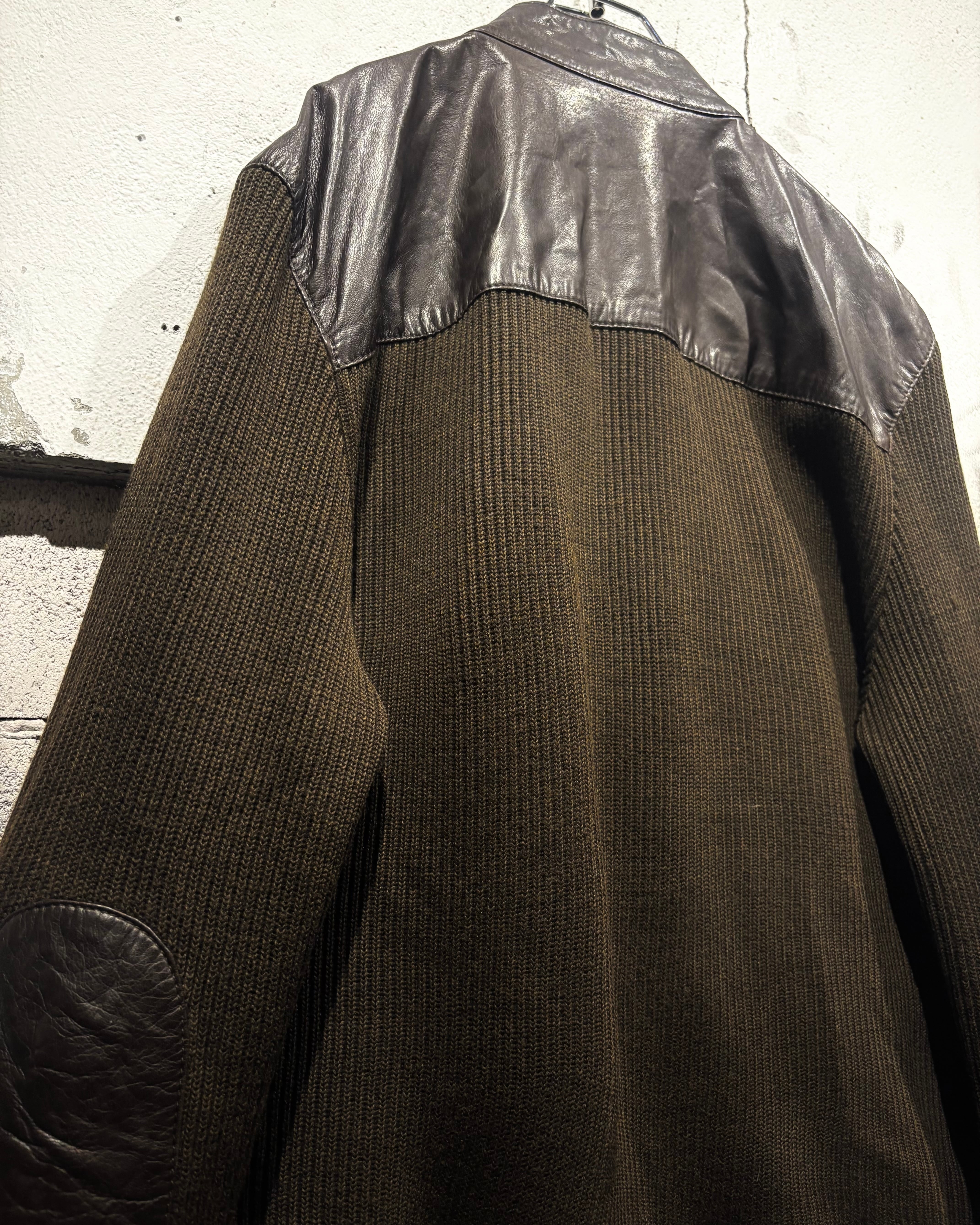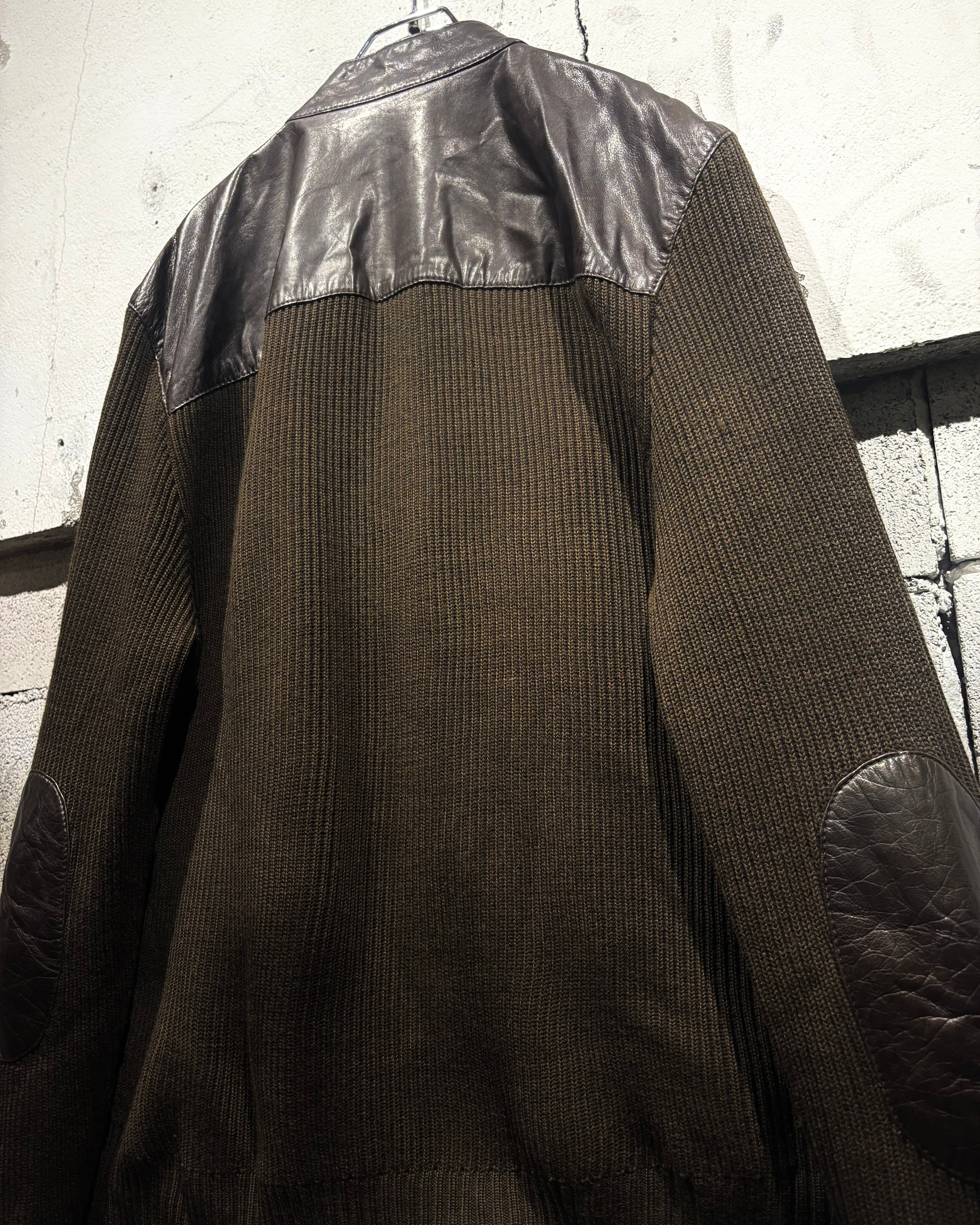 ボディには落ち着いたトーンのニット素材を採用し、フロントや肩周りに上質なレザーを切り替えで配置。レザー特有の艶と、ニットの柔らかな質感がコントラストを生み、奥行きのある表情を与えています。