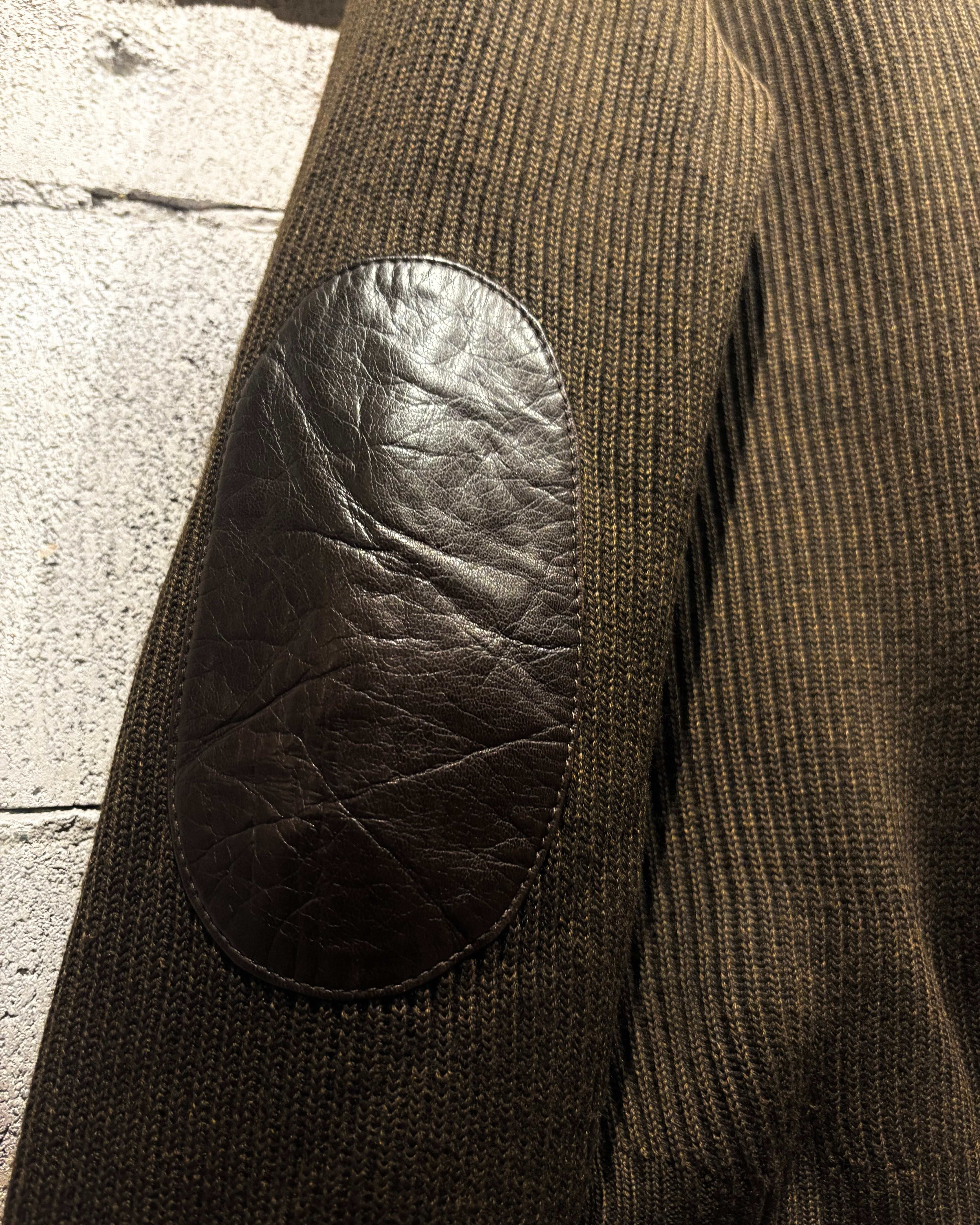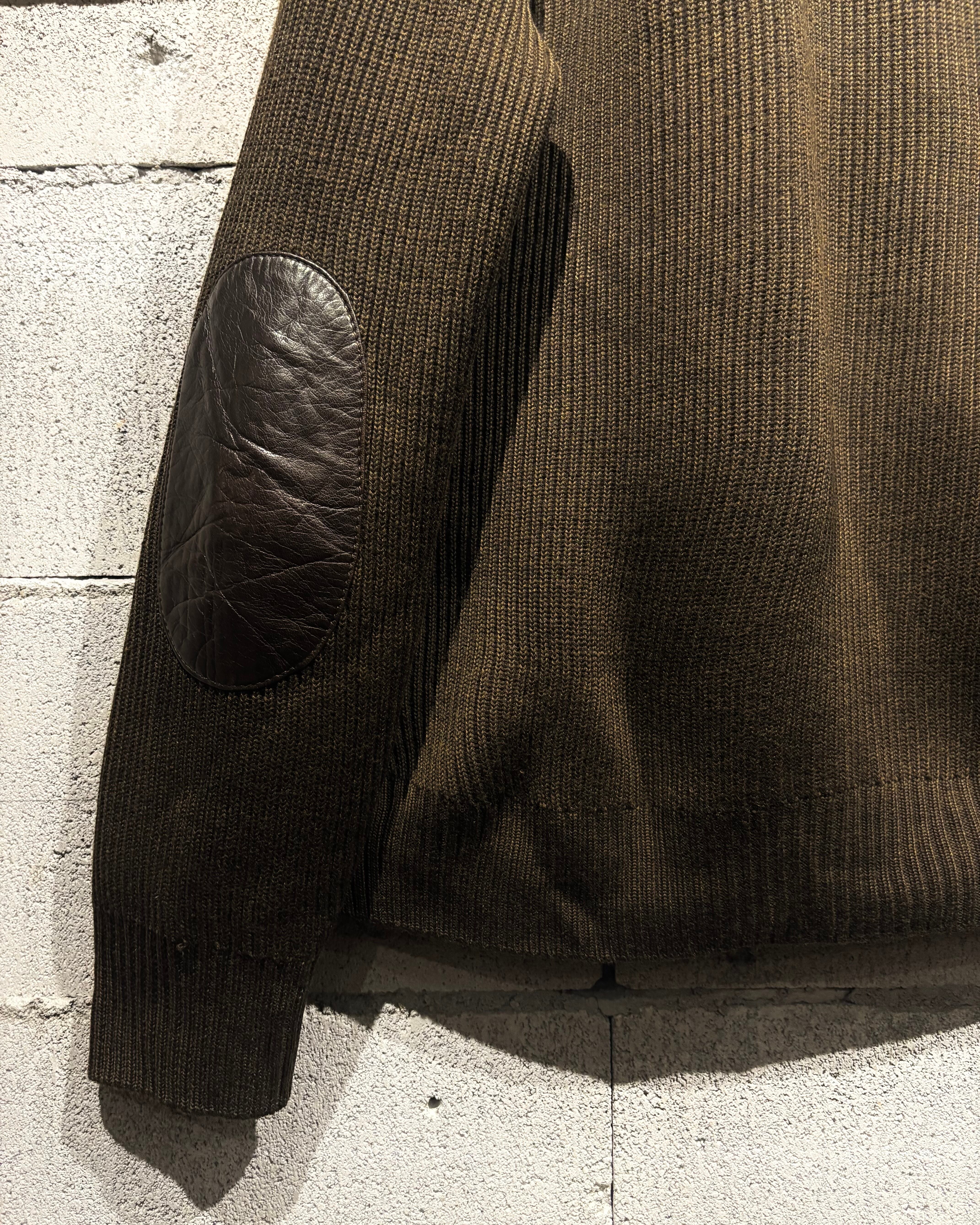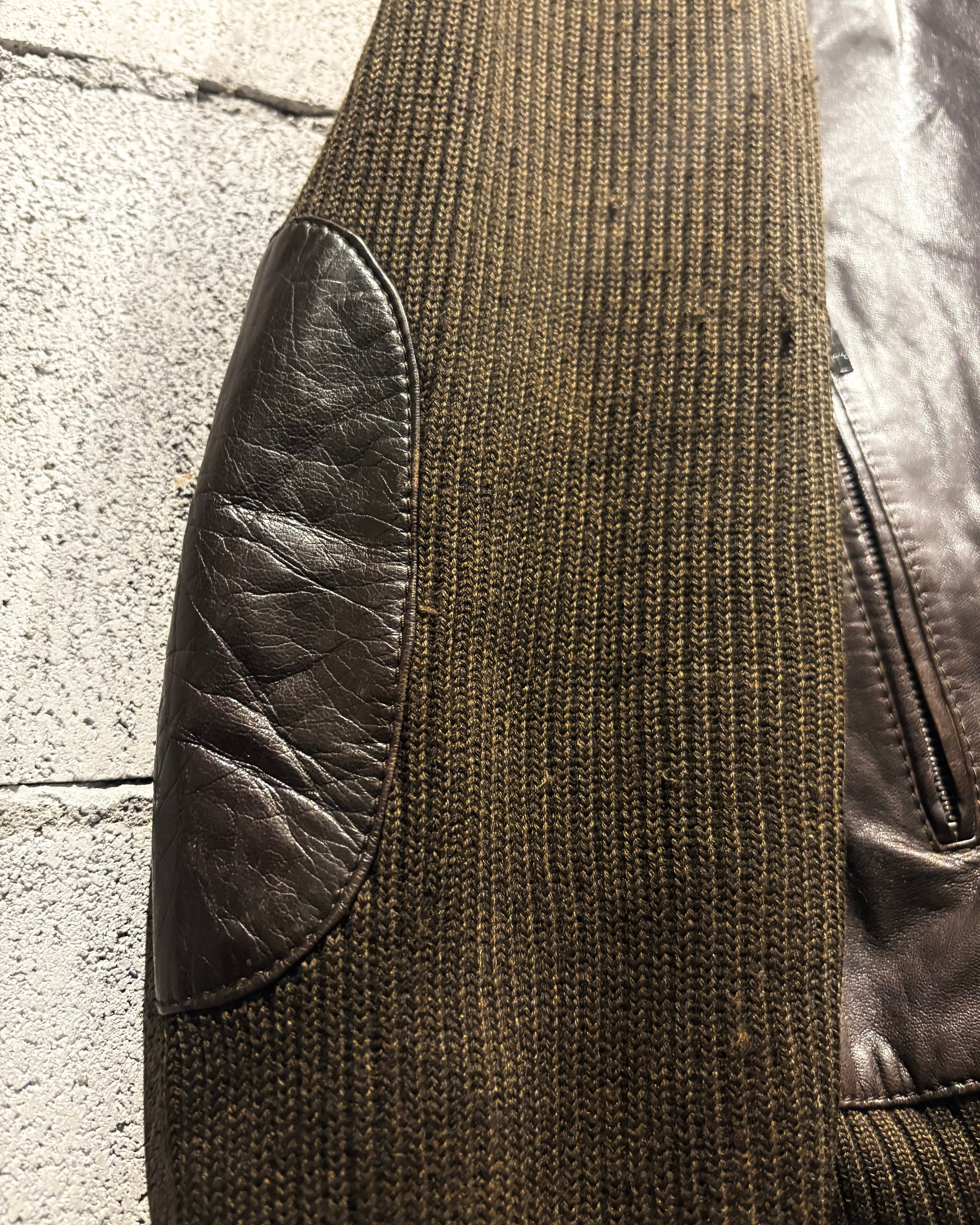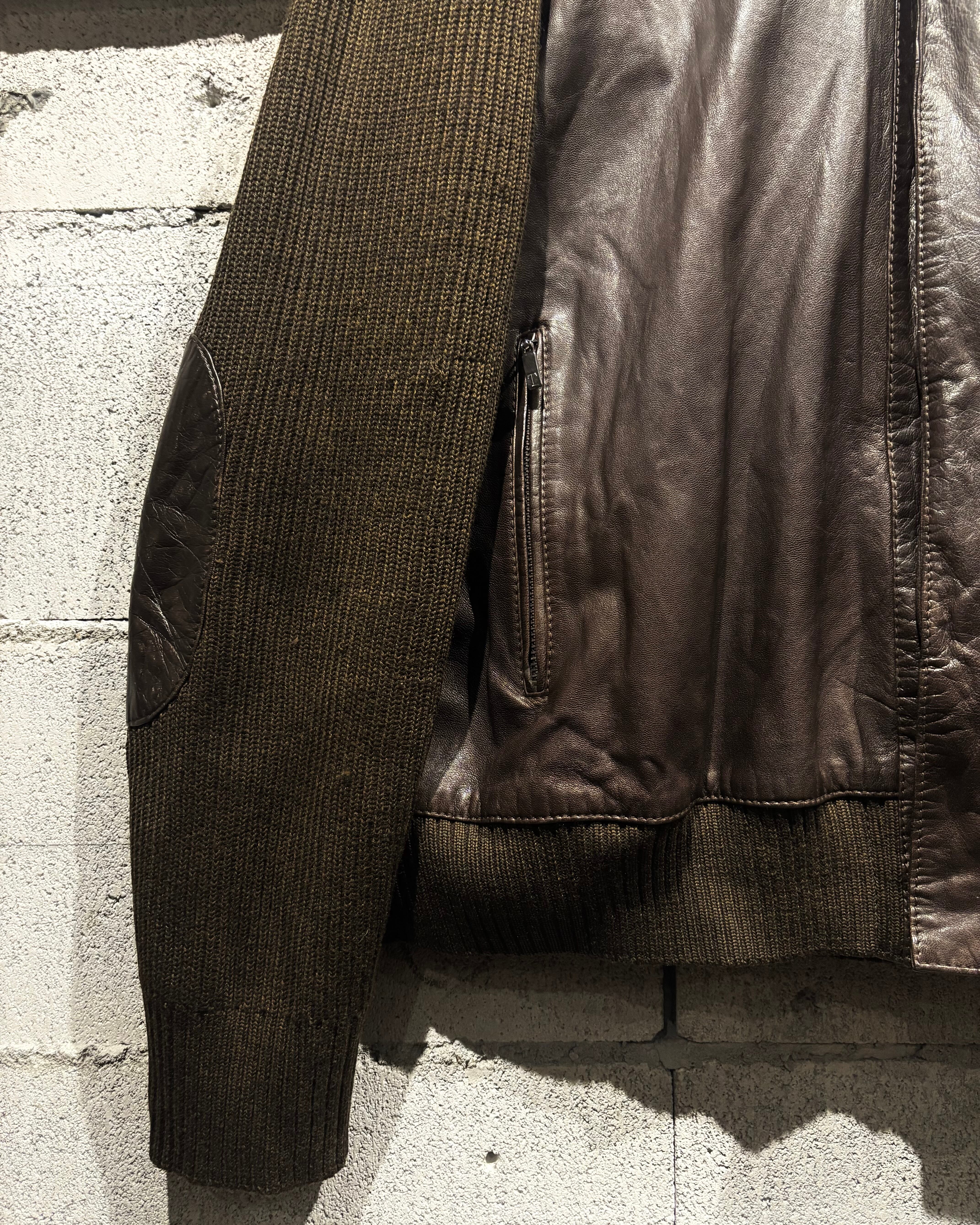 ボディには落ち着いたトーンのニット素材を採用し、フロントや肩周りに上質なレザーを切り替えで配置。レザー特有の艶と、ニットの柔らかな質感がコントラストを生み、奥行きのある表情を与えています。