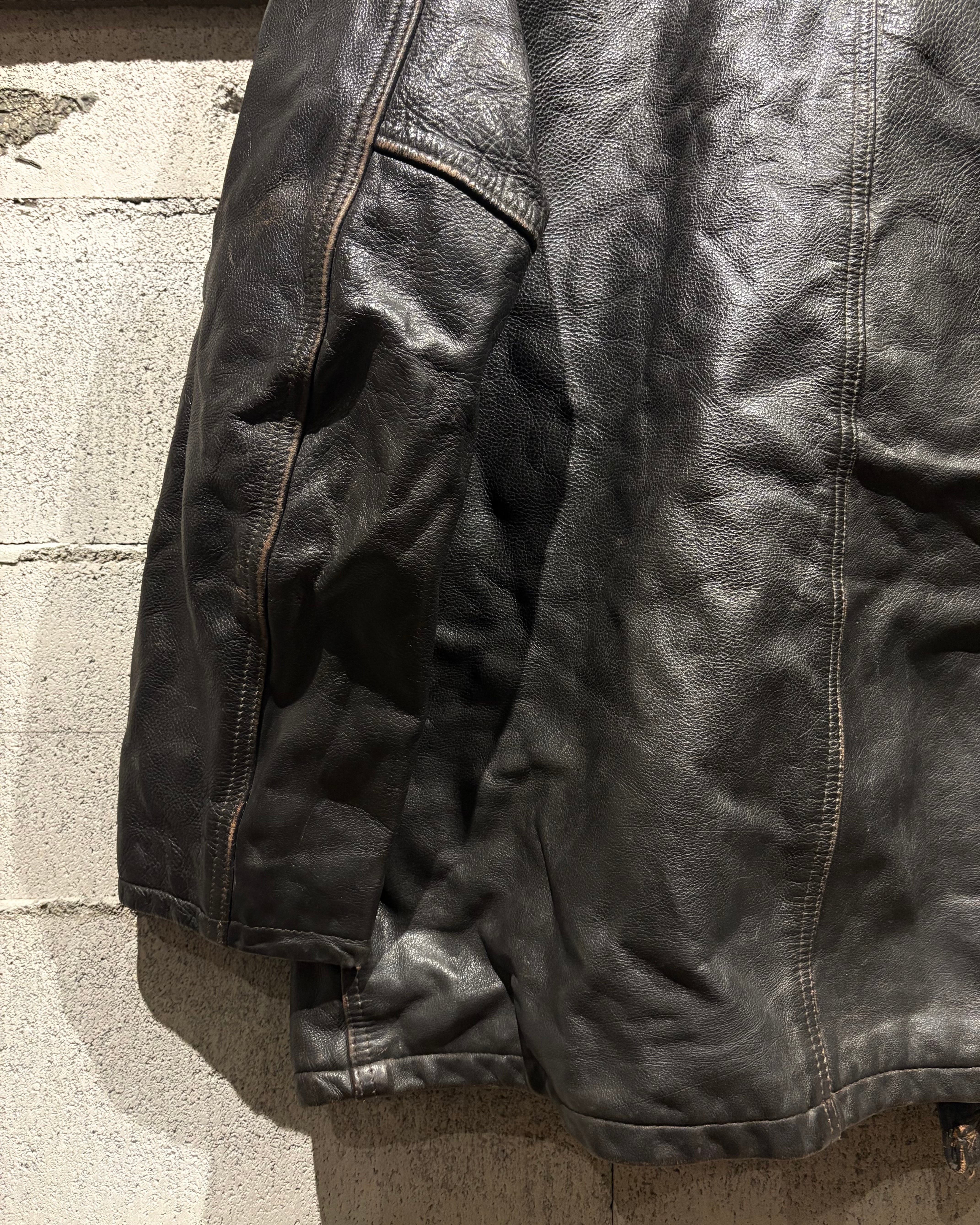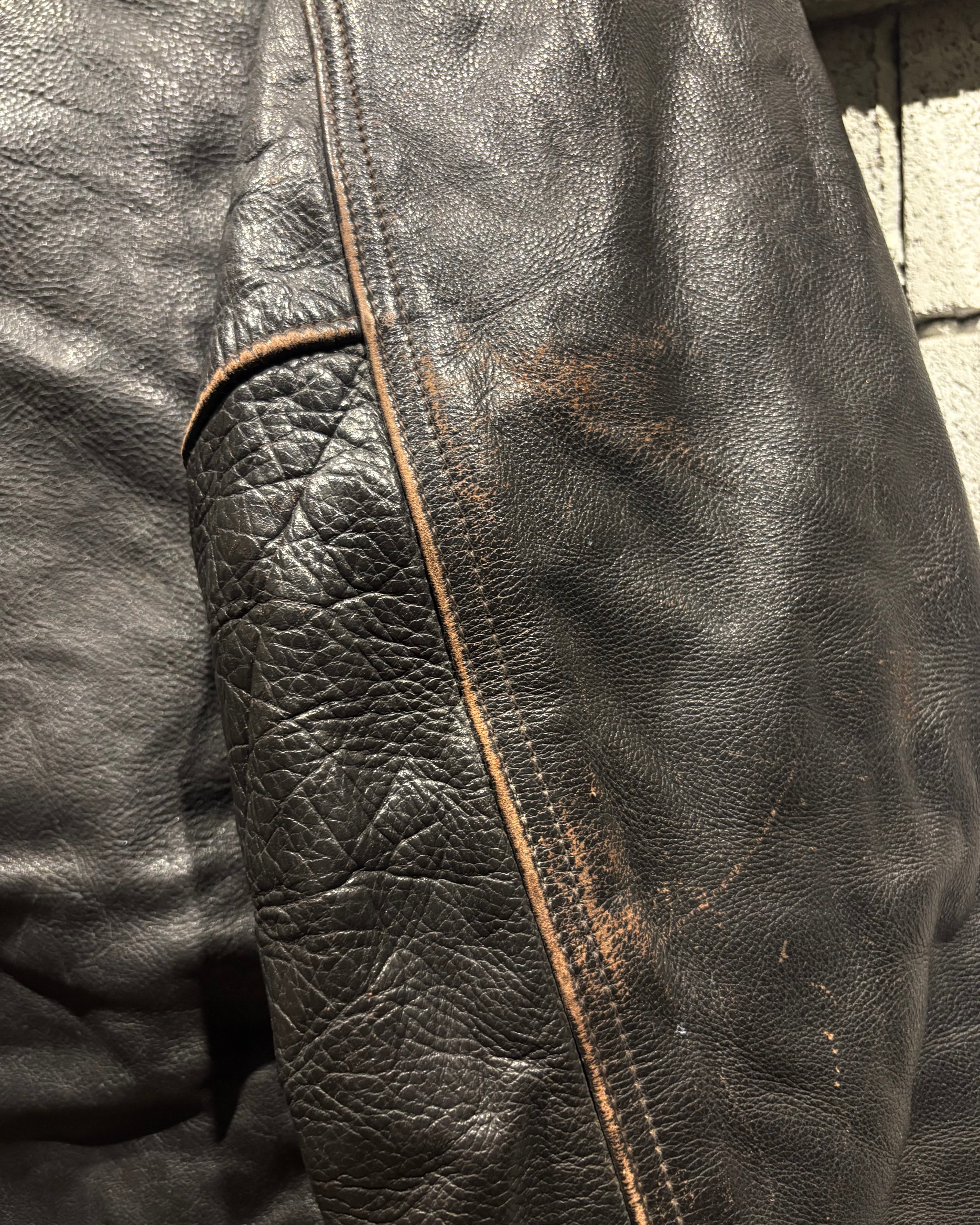 しっかりとした厚みを持つブラウンレザーを贅沢に使用したボディは長年の着用によって生まれたシワや艶が随所に現れ、深みある表情に。