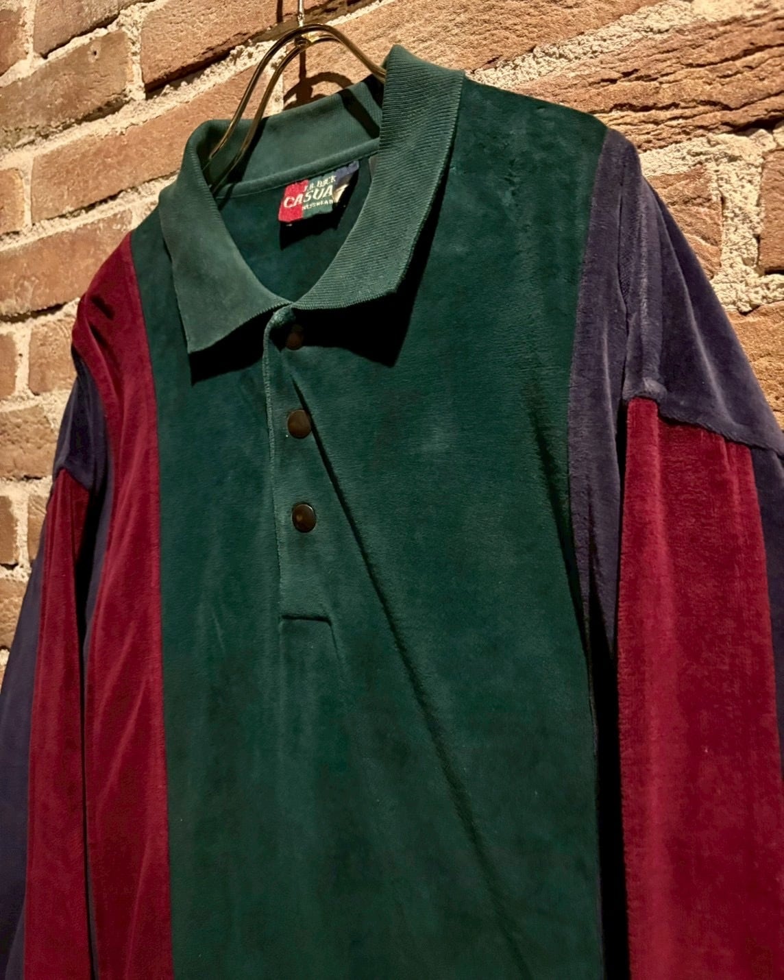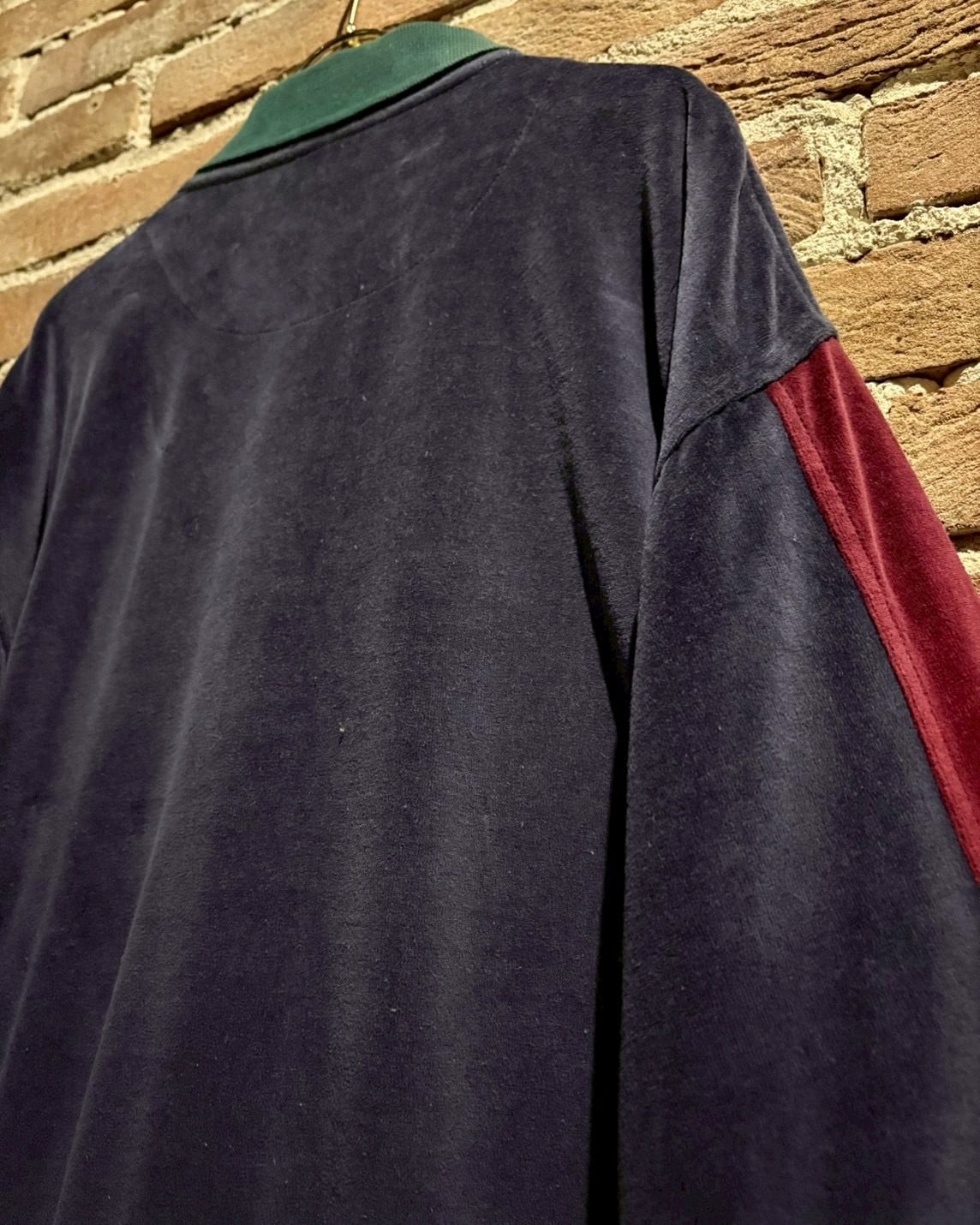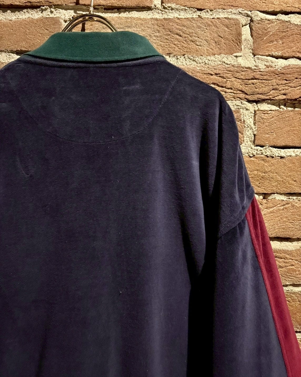 ボディにはしっとりとした質感のベロアファブリックを採用。深みのあるグリーン、ボルドーとネイビーを縦に切り替えた配色が印象的。光の当たり方で表情を変えるベロア特有の艶感が、シンプルなポロシャツ型ながら確かな存在感を演出します。
