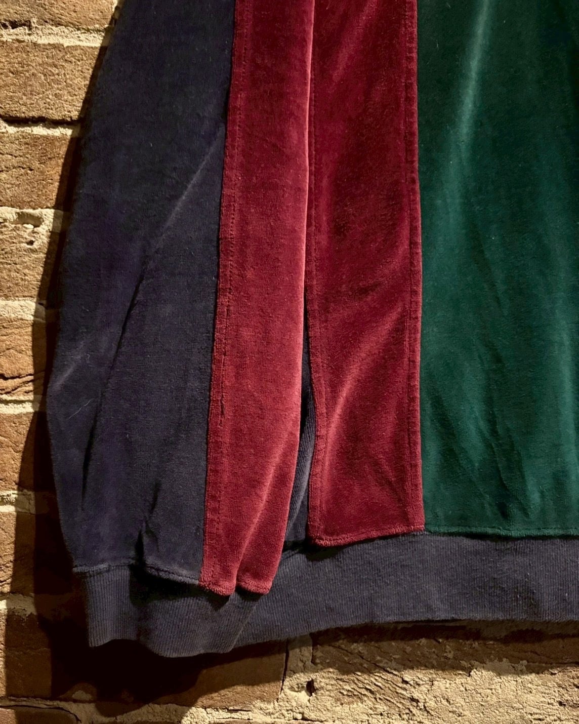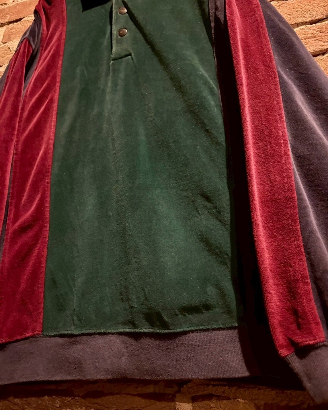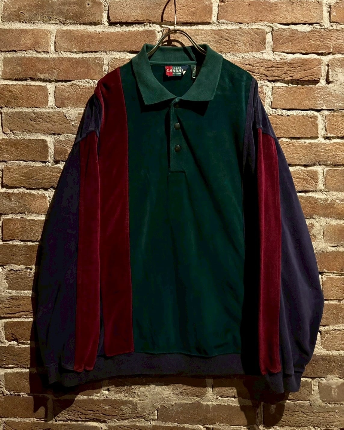 ボディにはしっとりとした質感のベロアファブリックを採用。深みのあるグリーン、ボルドーとネイビーを縦に切り替えた配色が印象的。光の当たり方で表情を変えるベロア特有の艶感が、シンプルなポロシャツ型ながら確かな存在感を演出します。