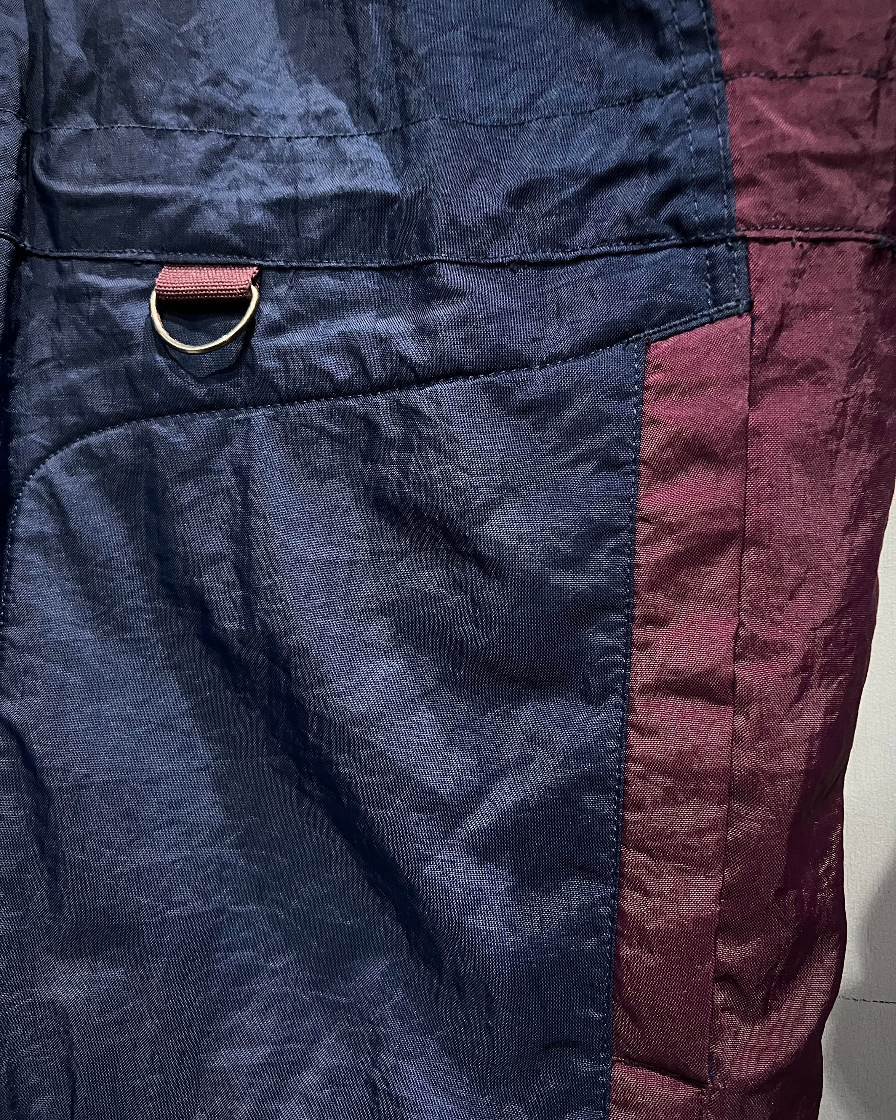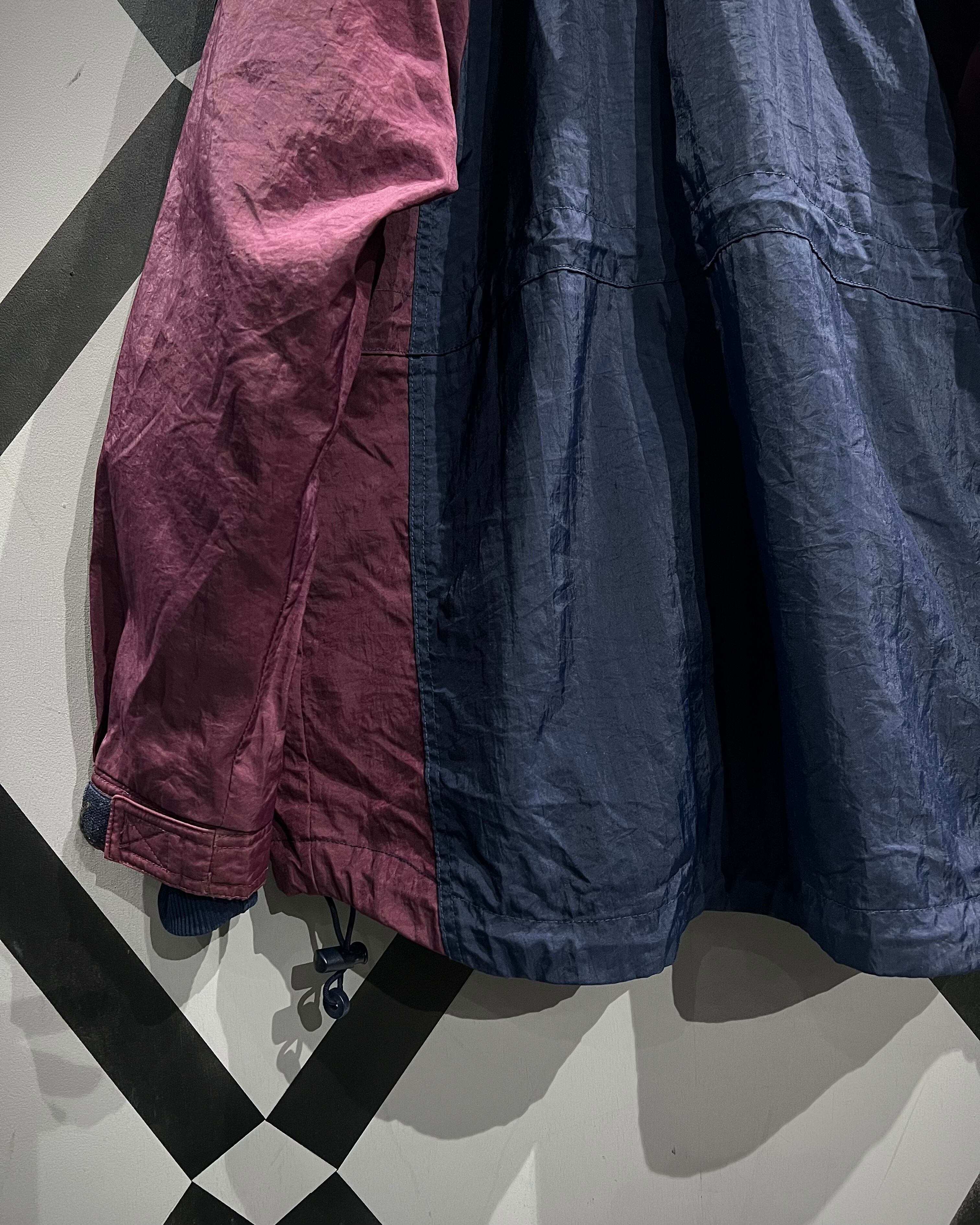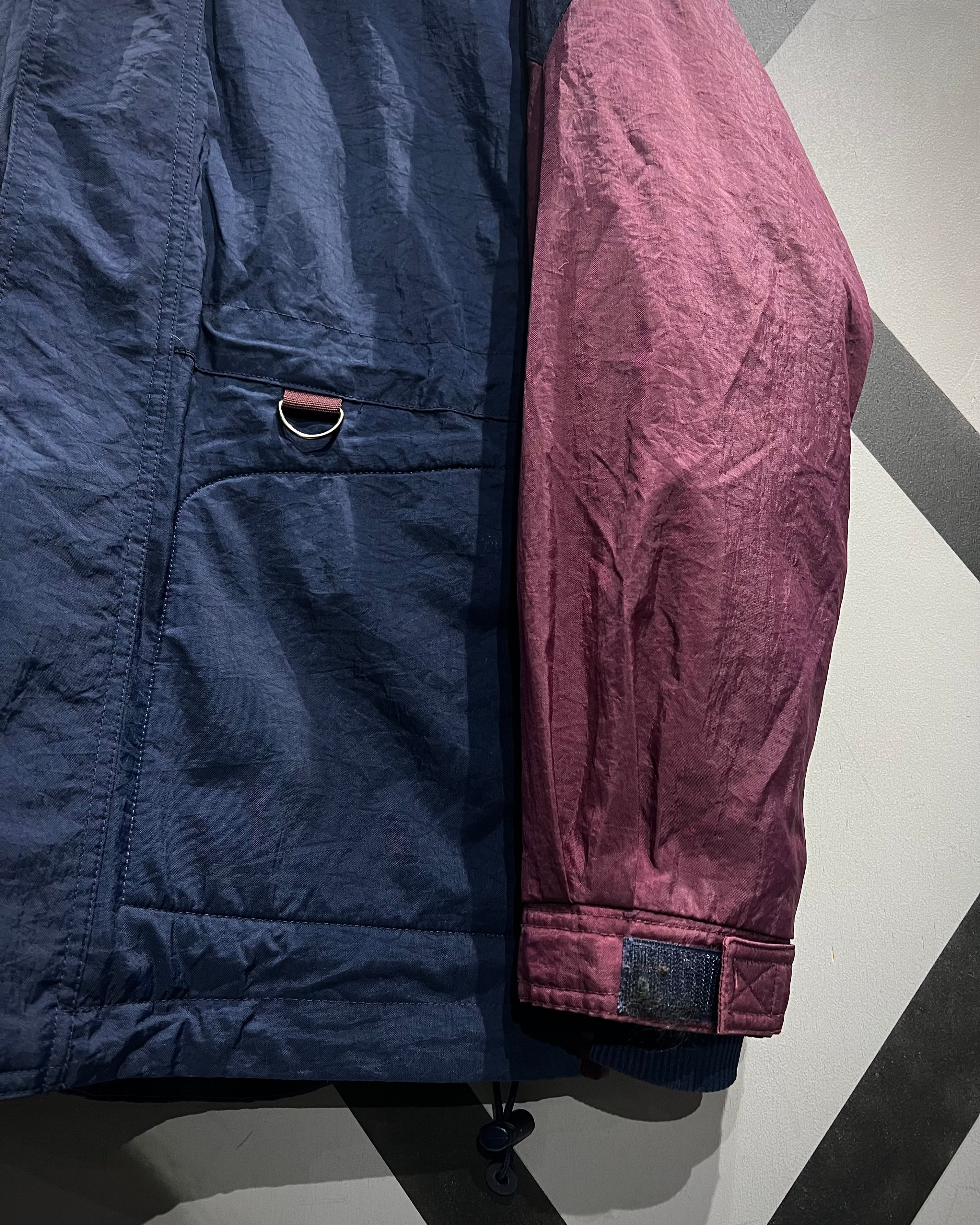 シャリ感のあるナイロン素材をボルドー×ネイビーで切り替え、無数のギミックを載せたハーフジャケット。